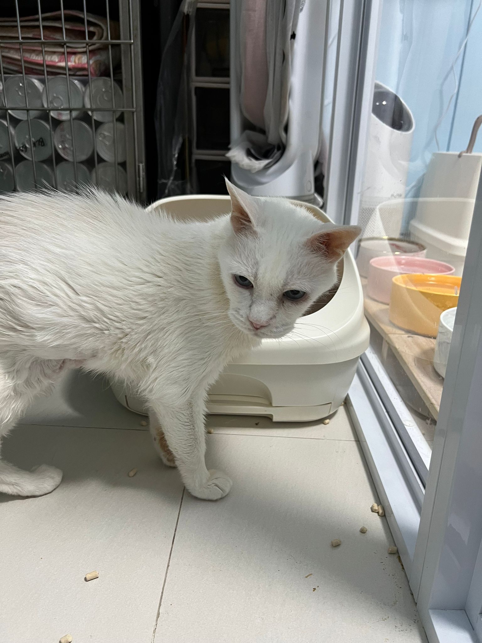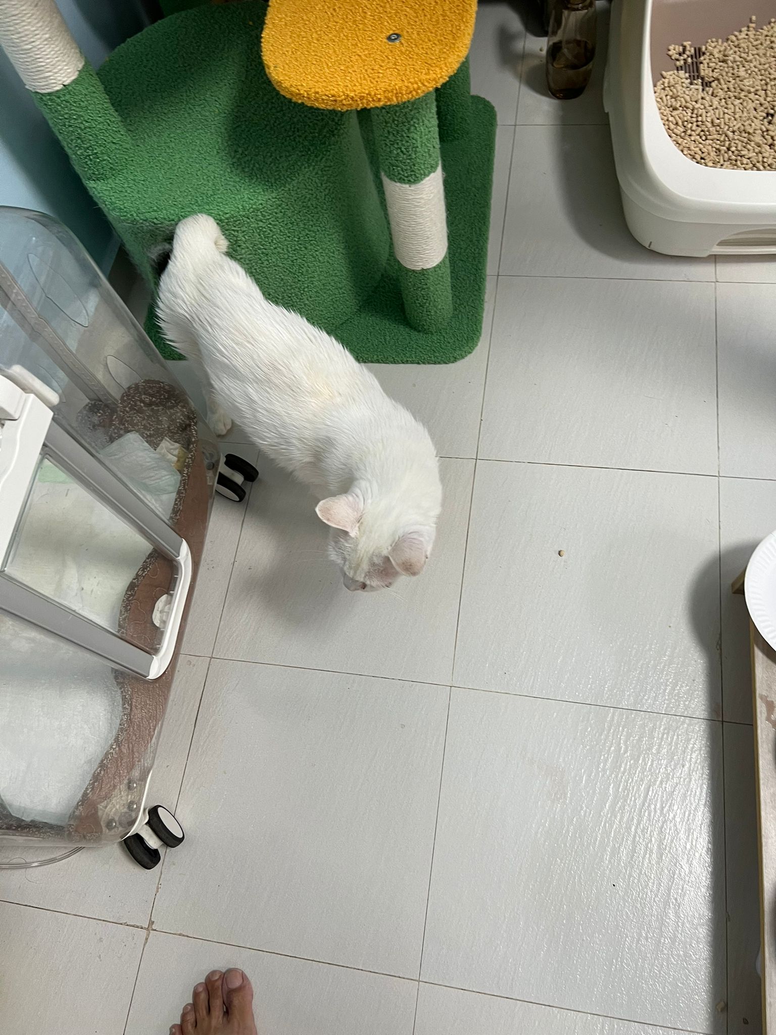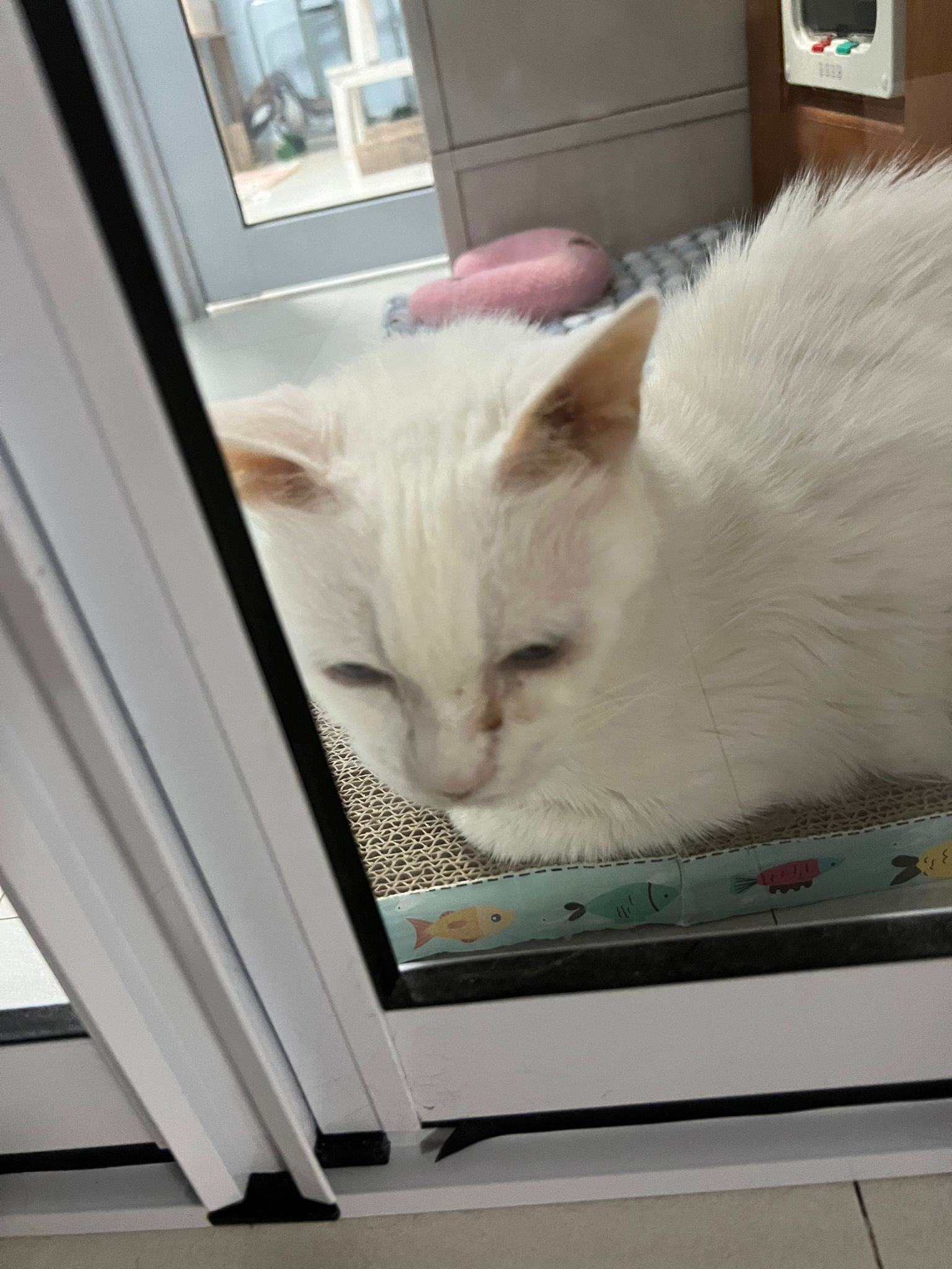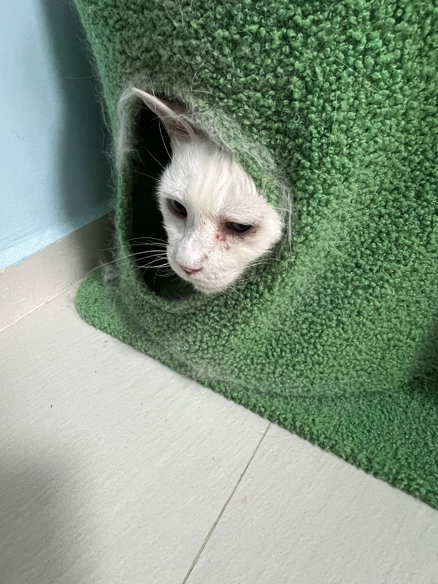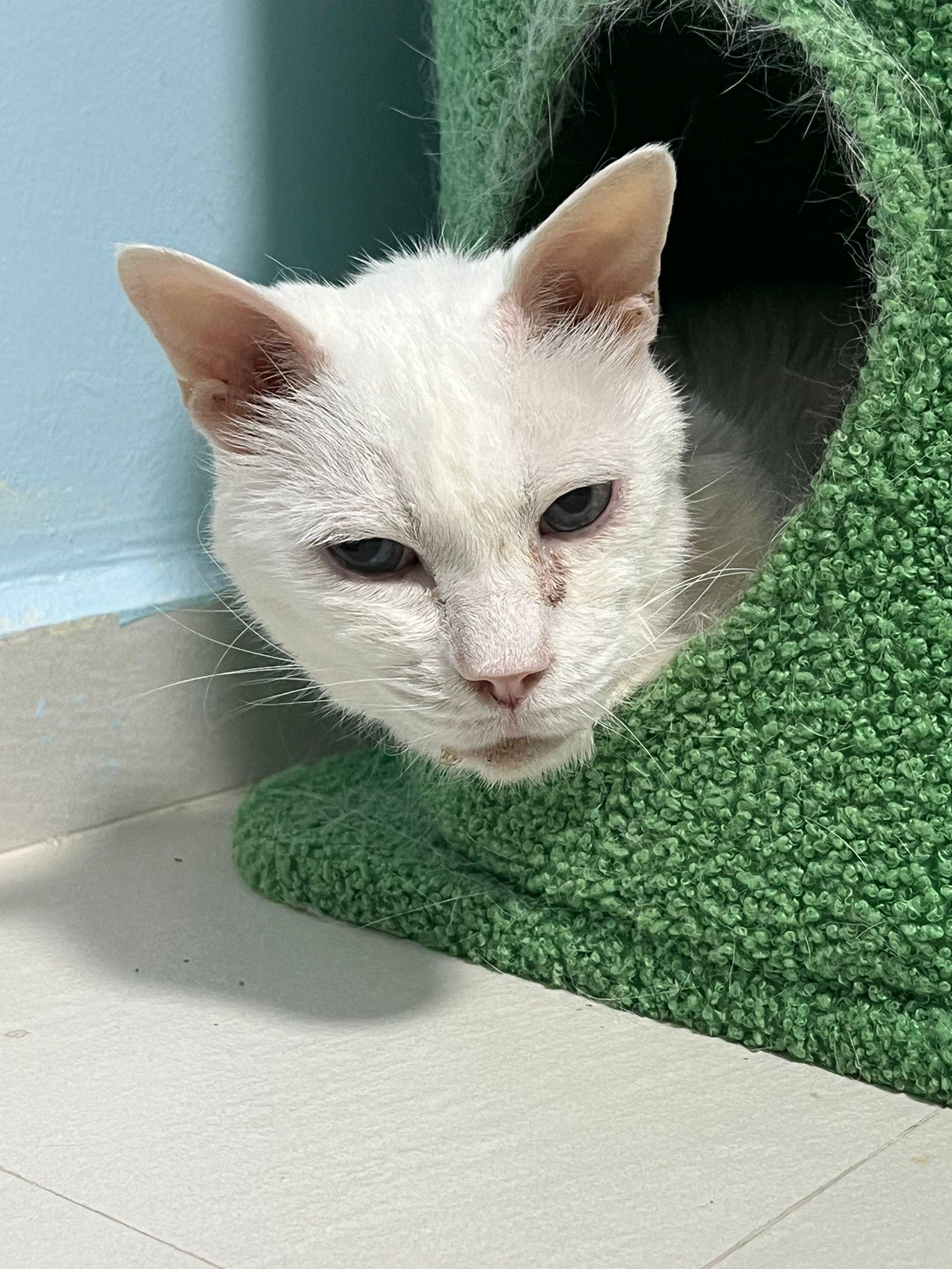 She sit in bin, like scratches and nose discharge still frequent. Clean for her.