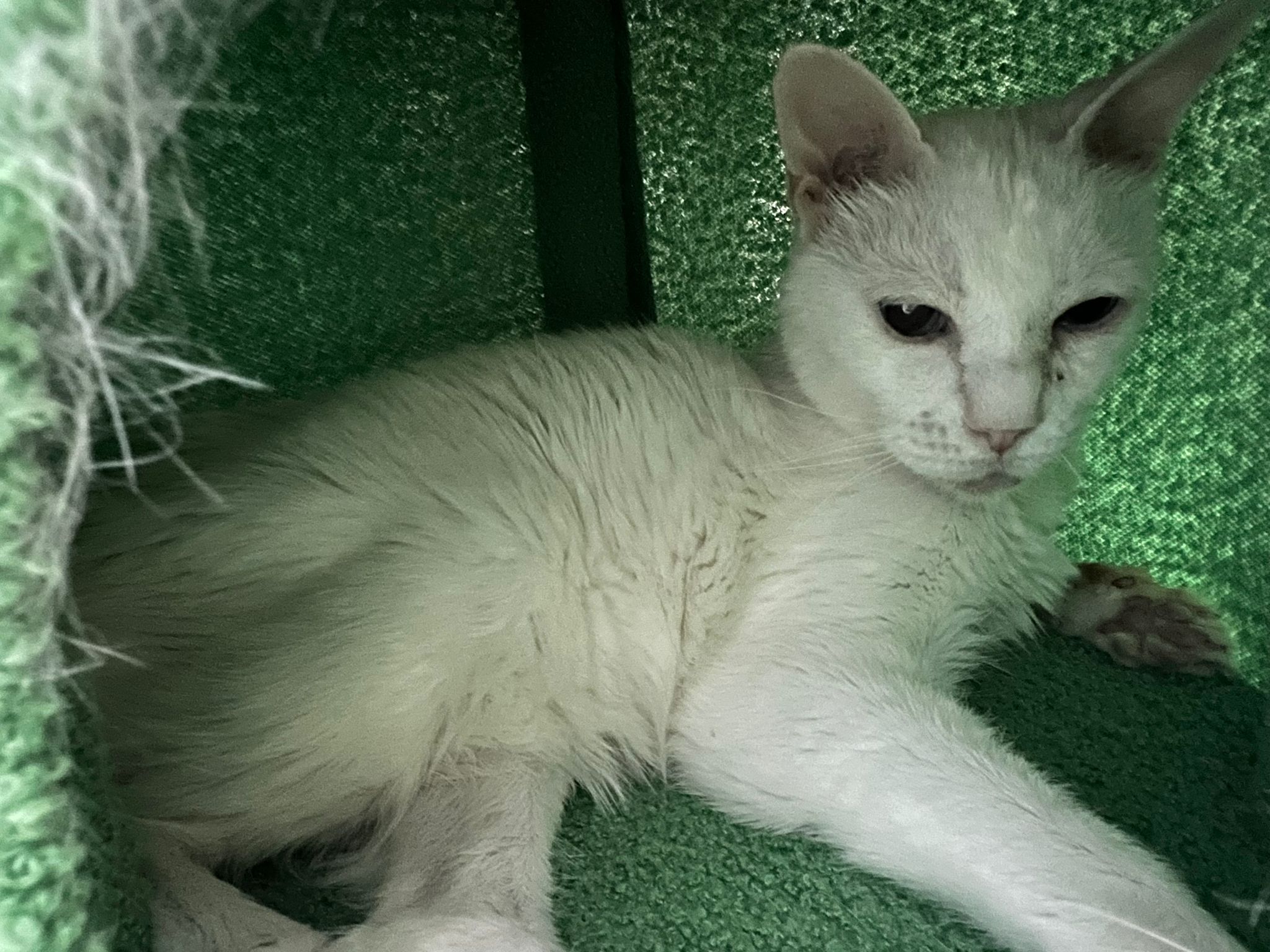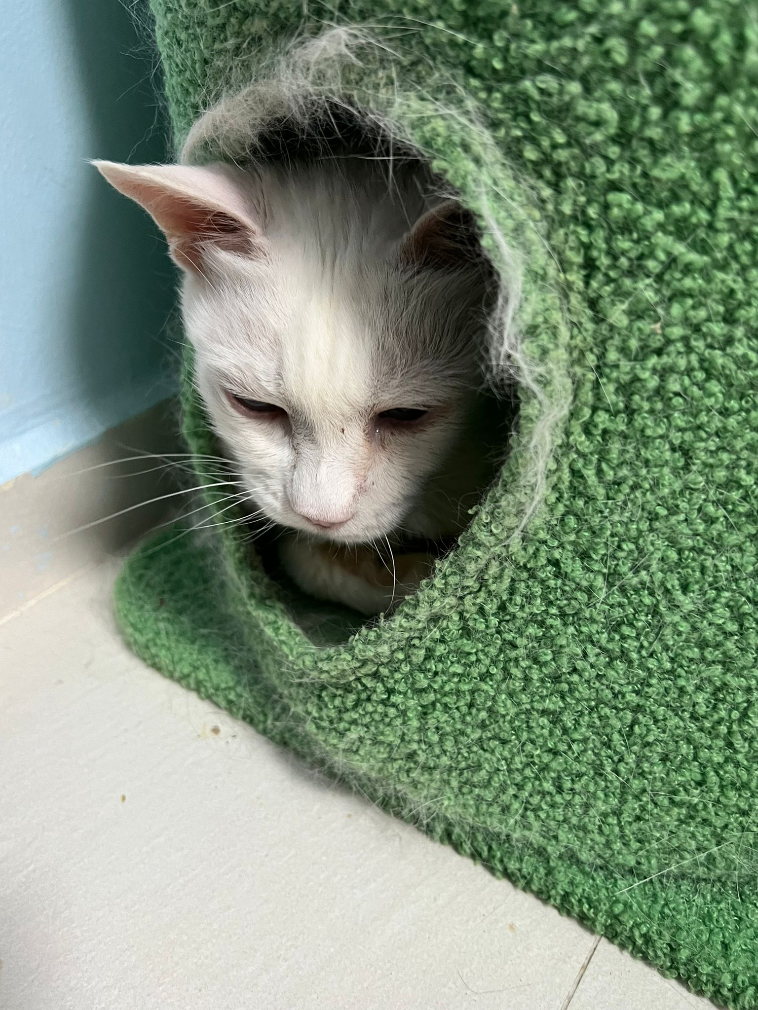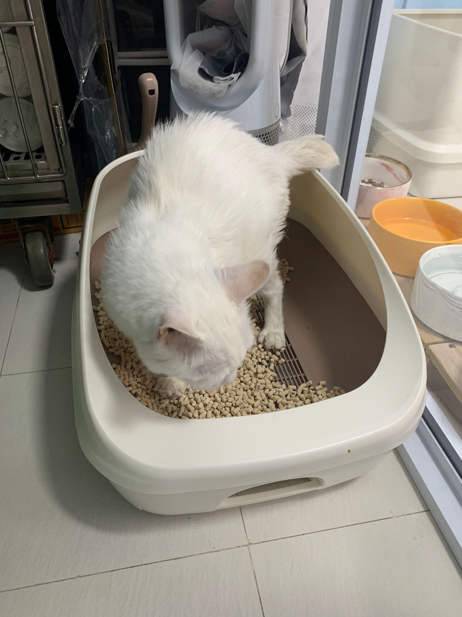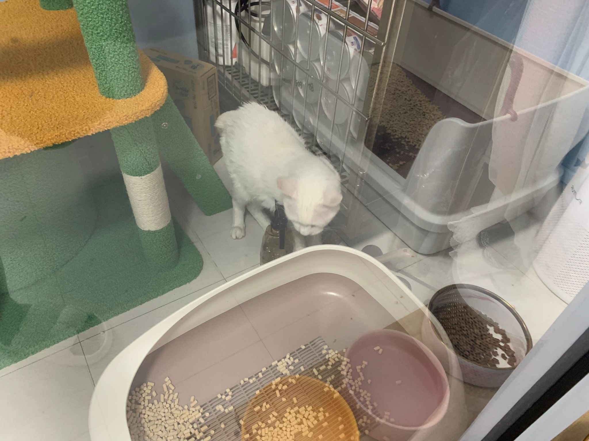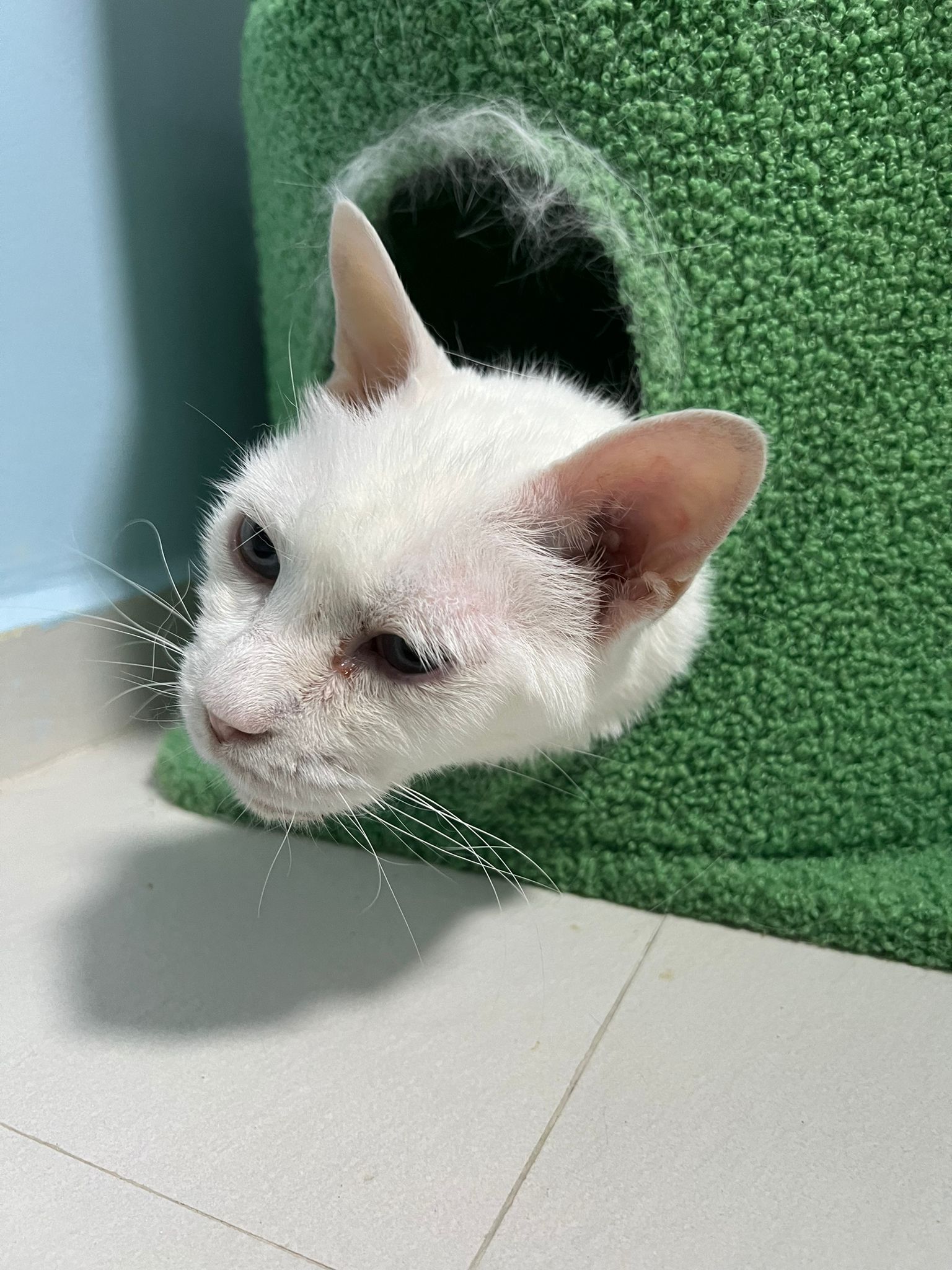 She sit in bin, like scratches and nose discharge still frequent. Clean for her.