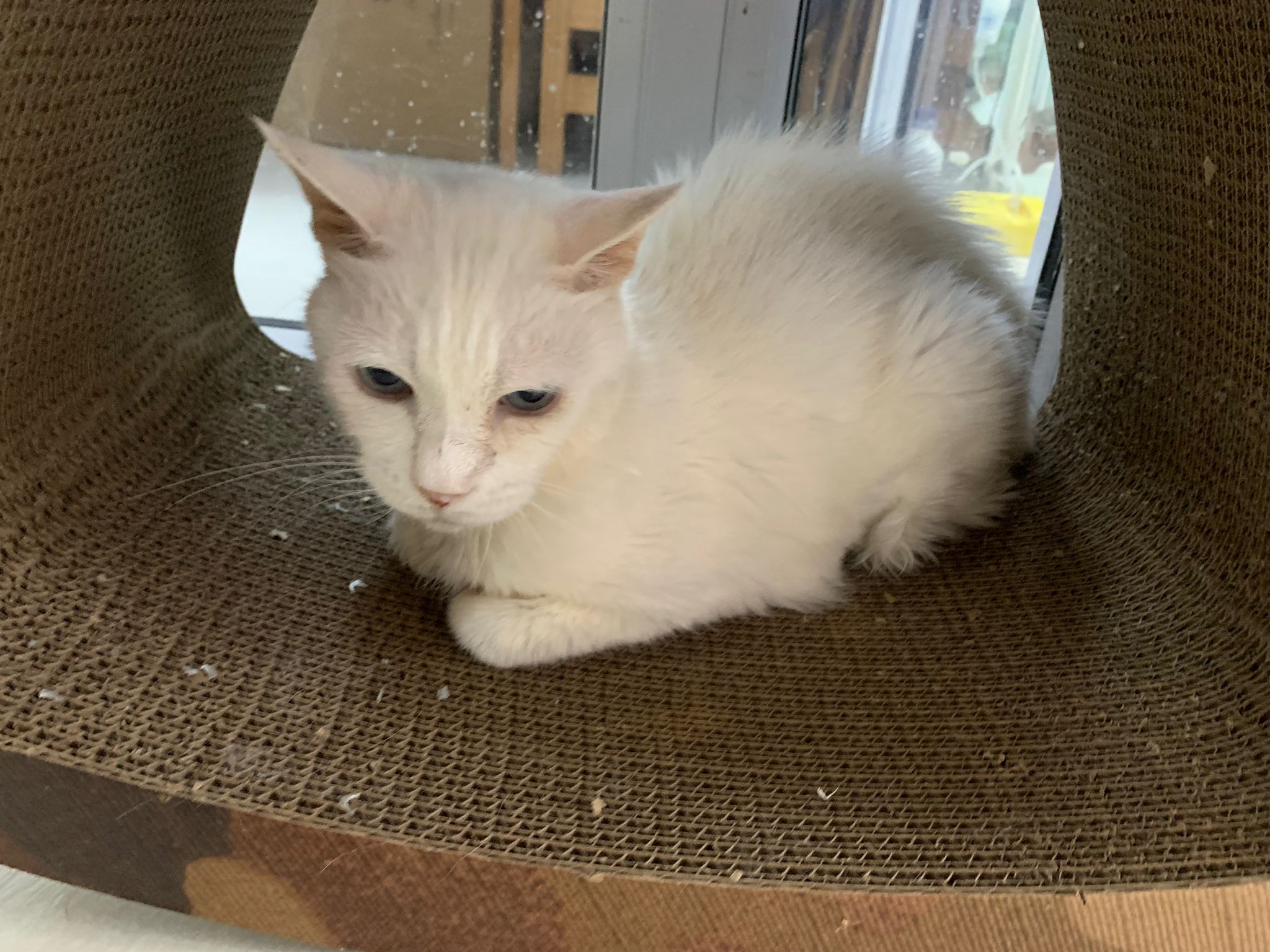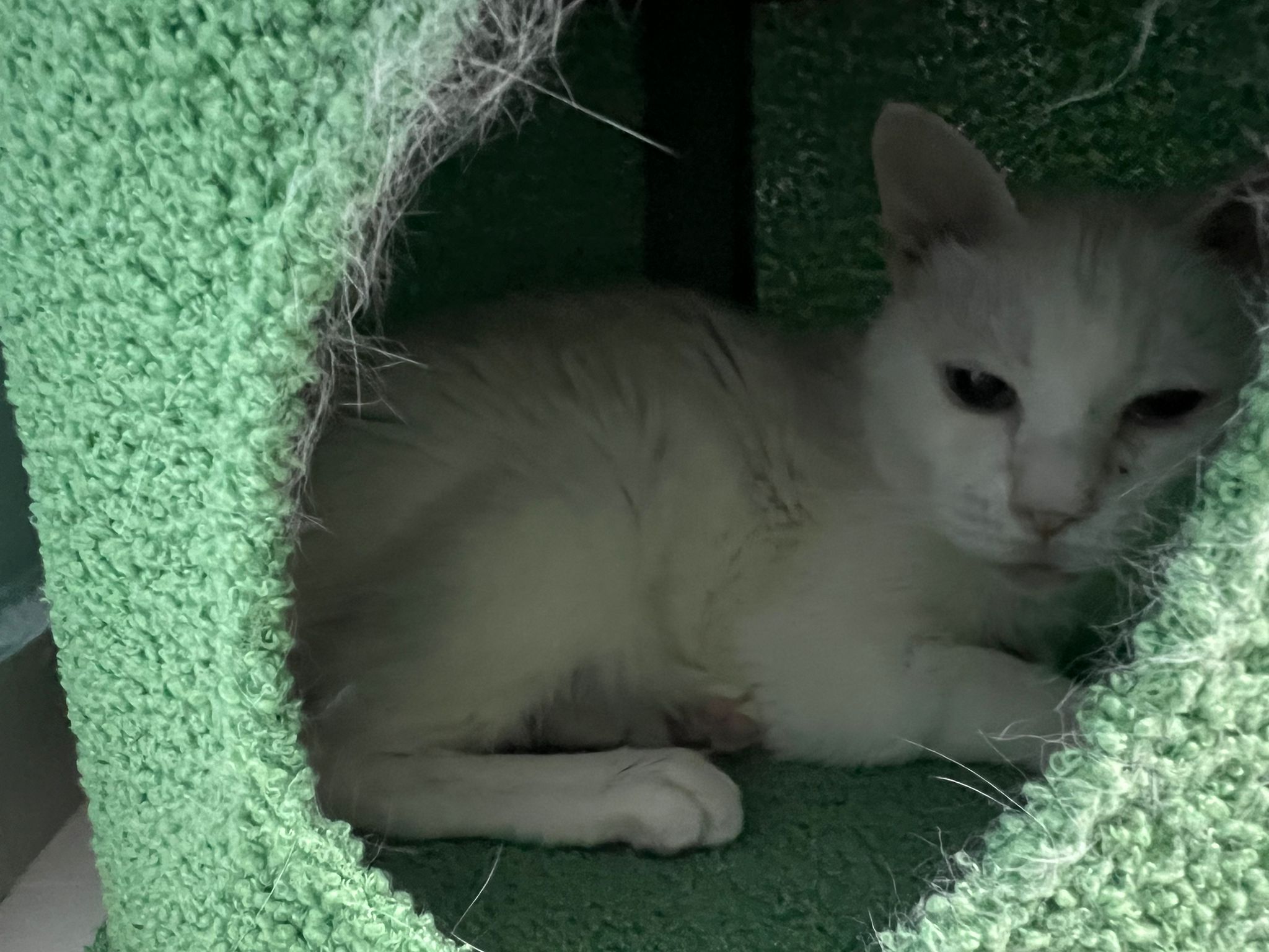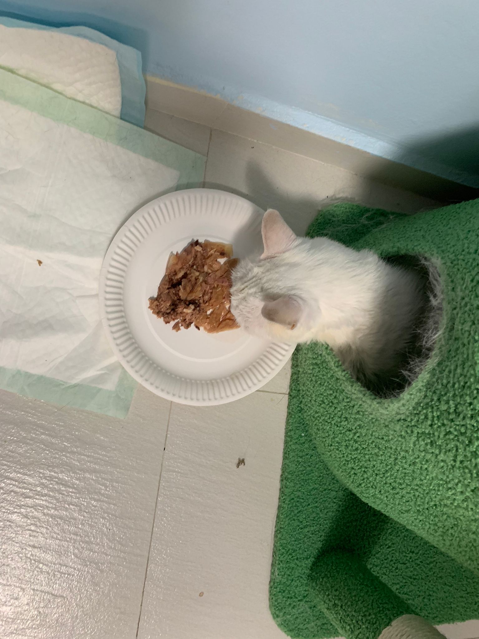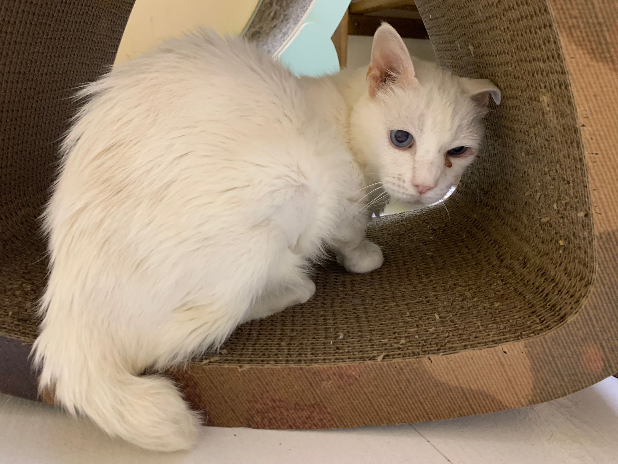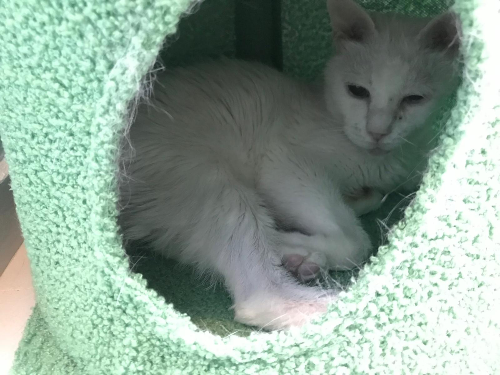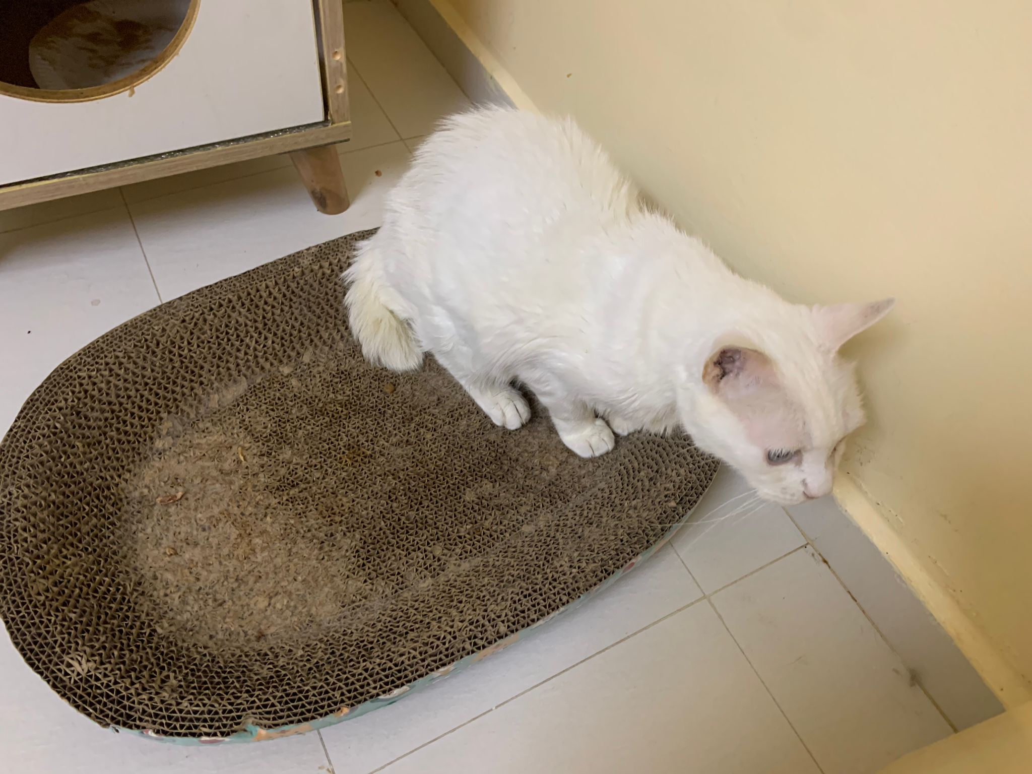 She sit in bin, like scratches and nose discharge still frequent. Clean for her.