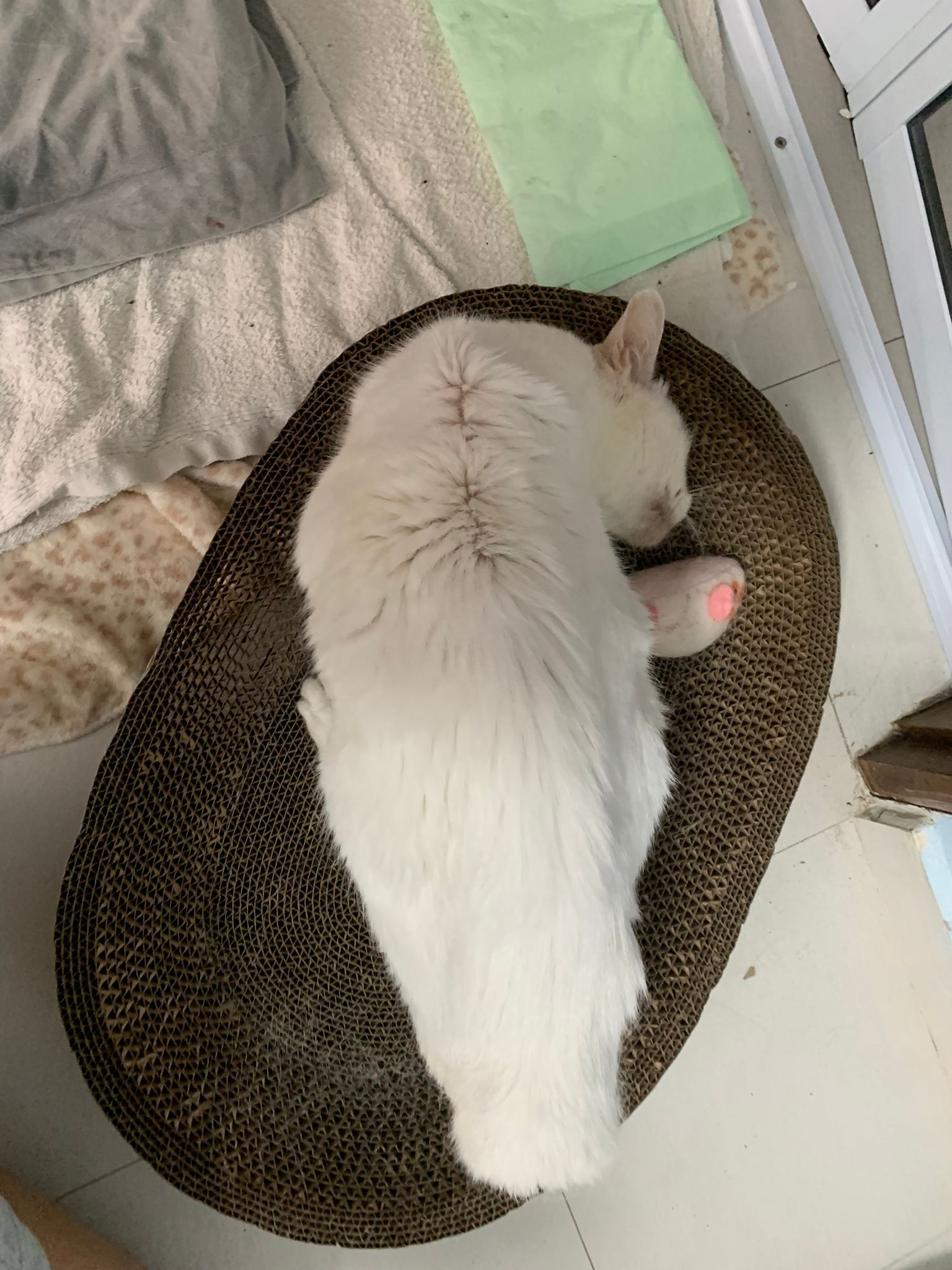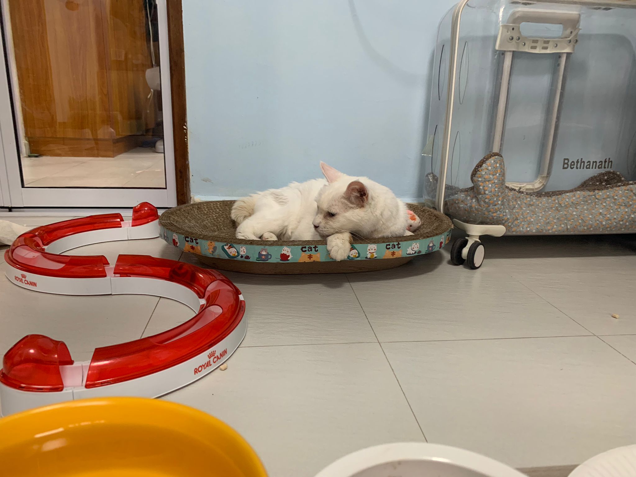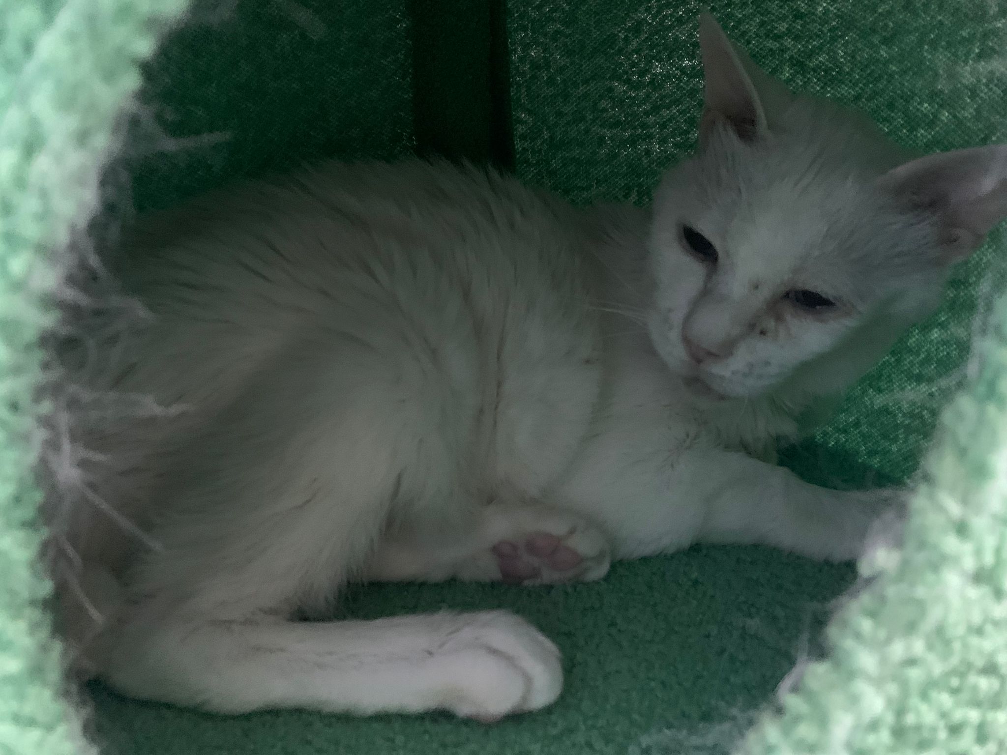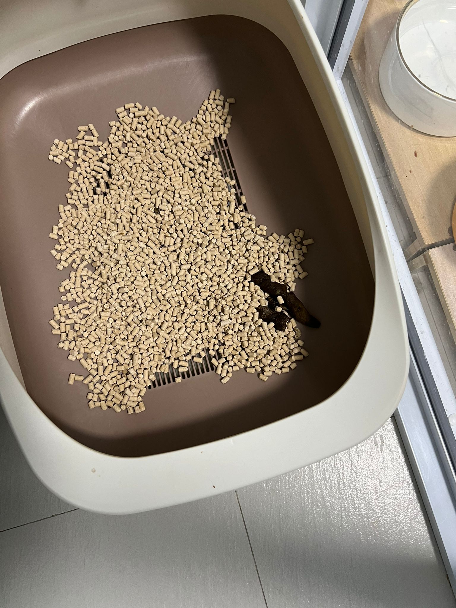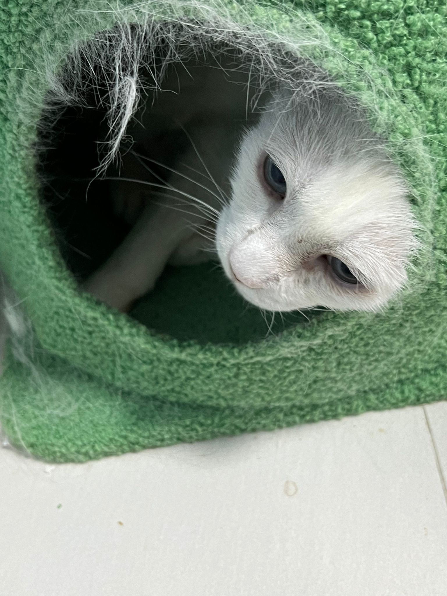She sit in bin, like scratches and nose discharge still frequent. Clean for her.