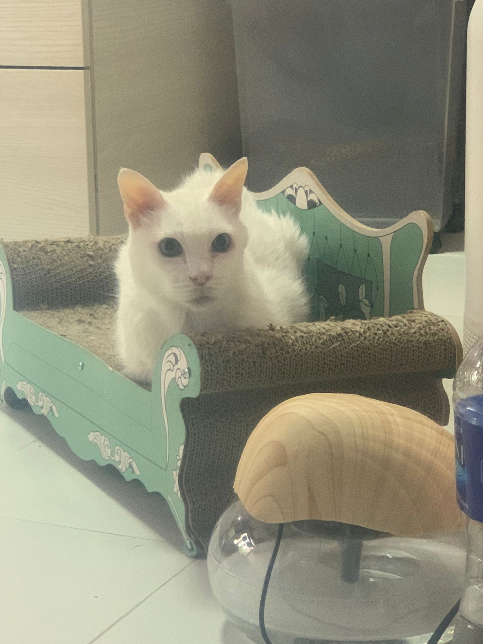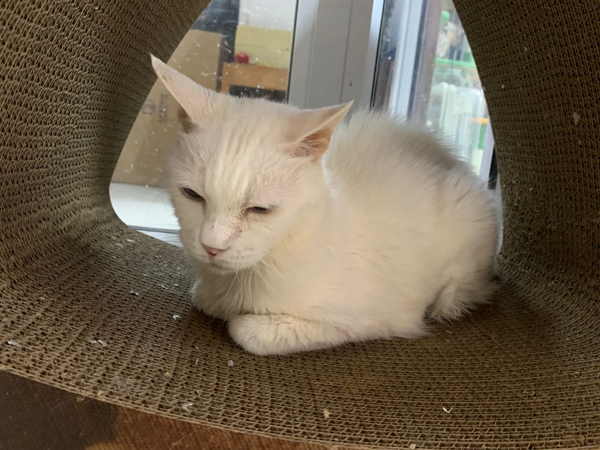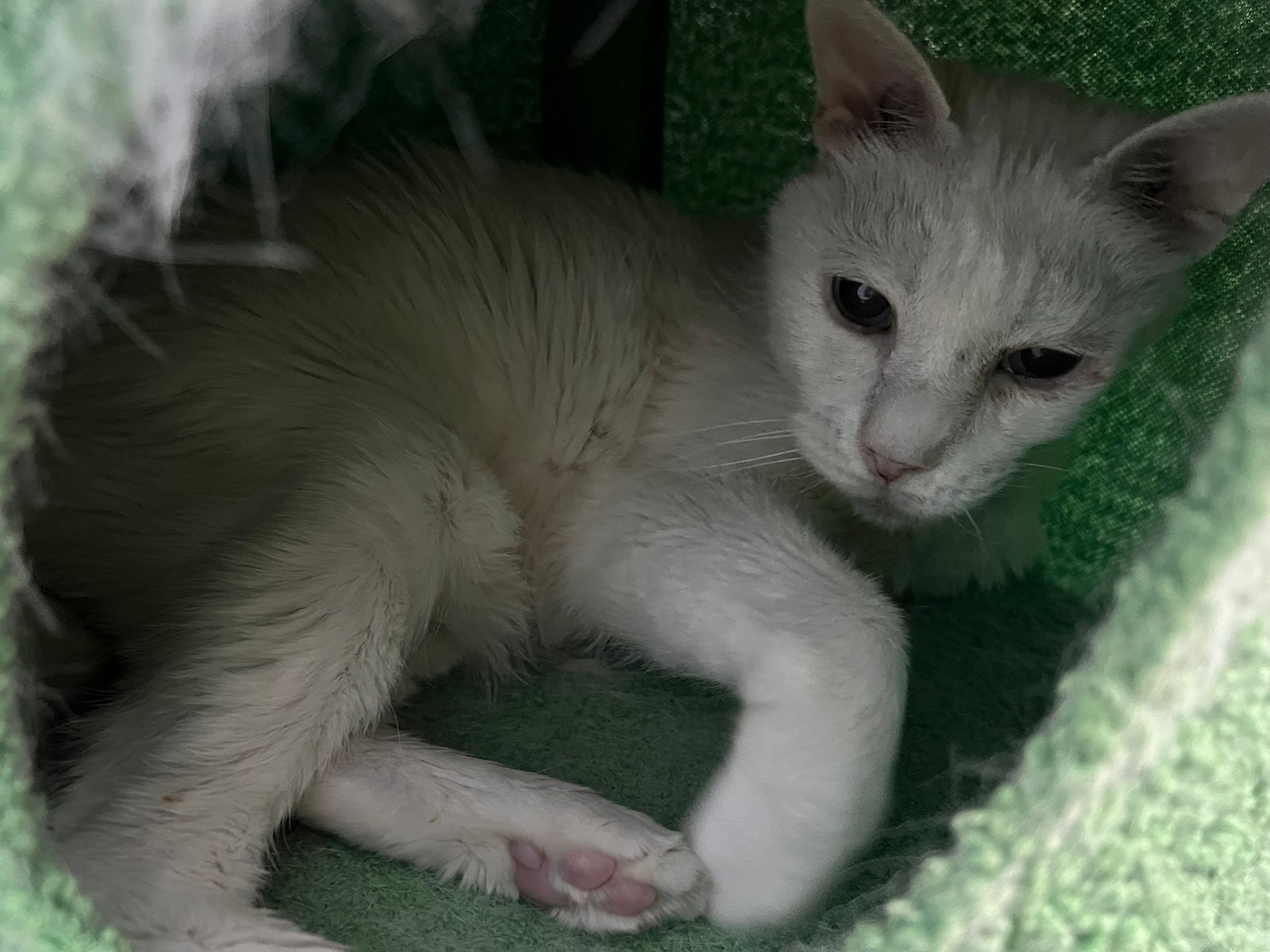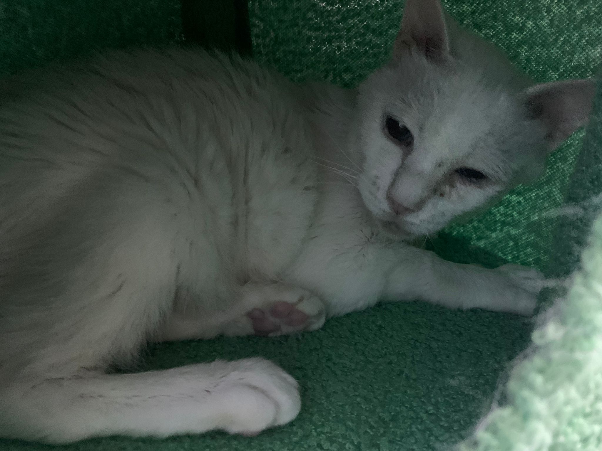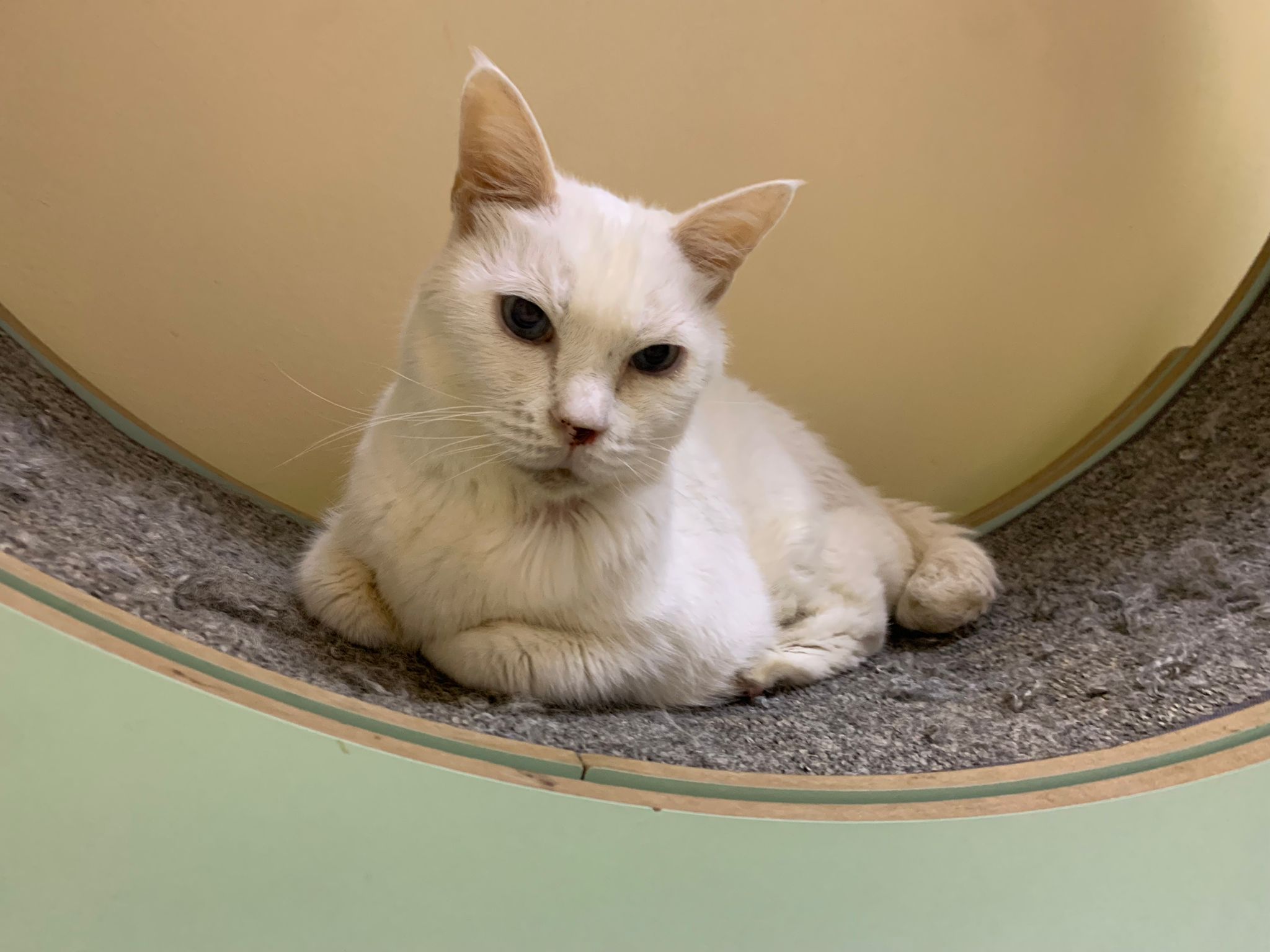 She sit in bin, like scratches and nose discharge still frequent. Clean for her.