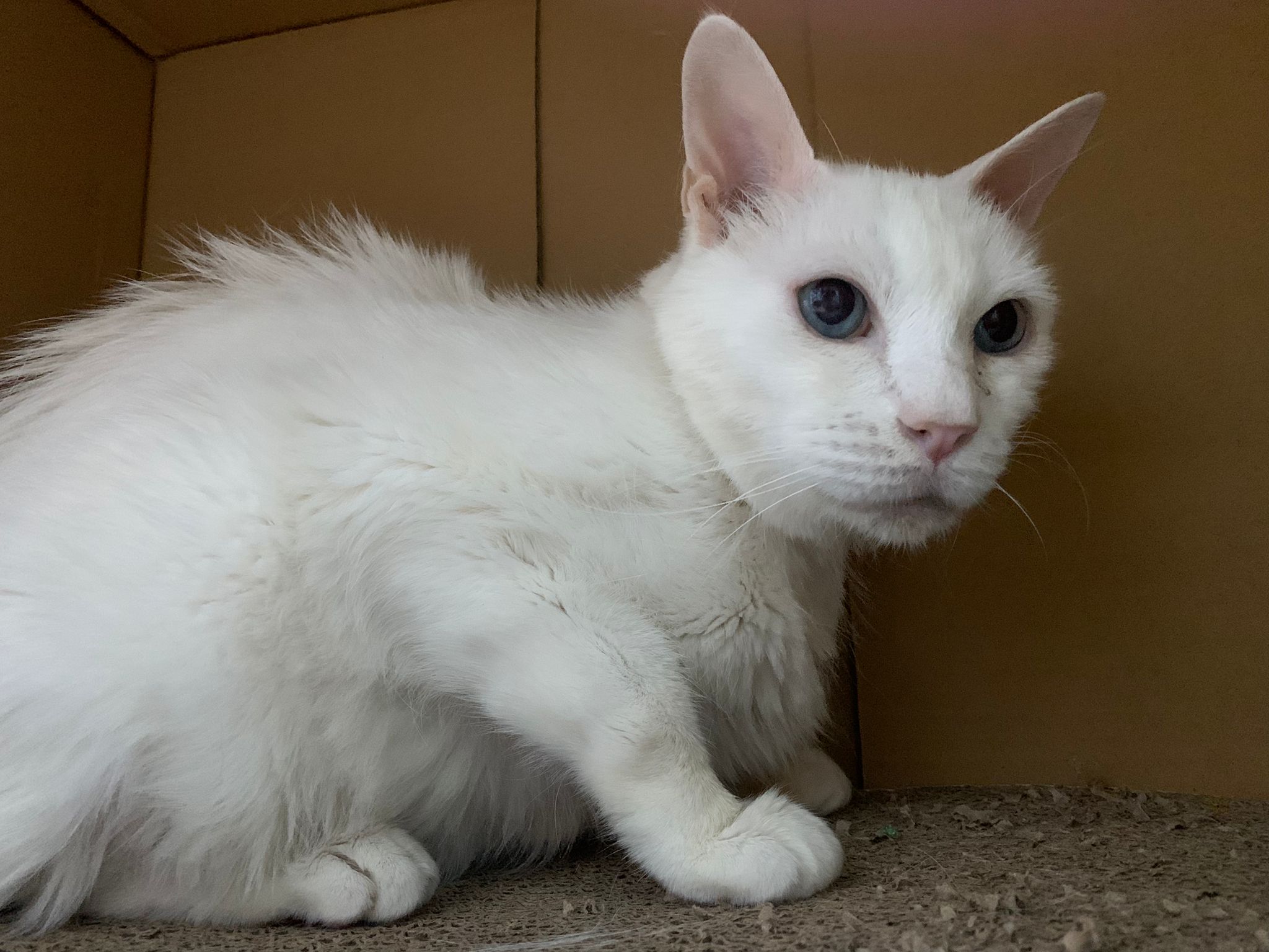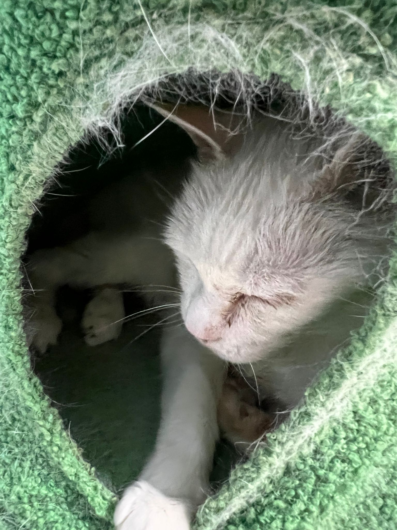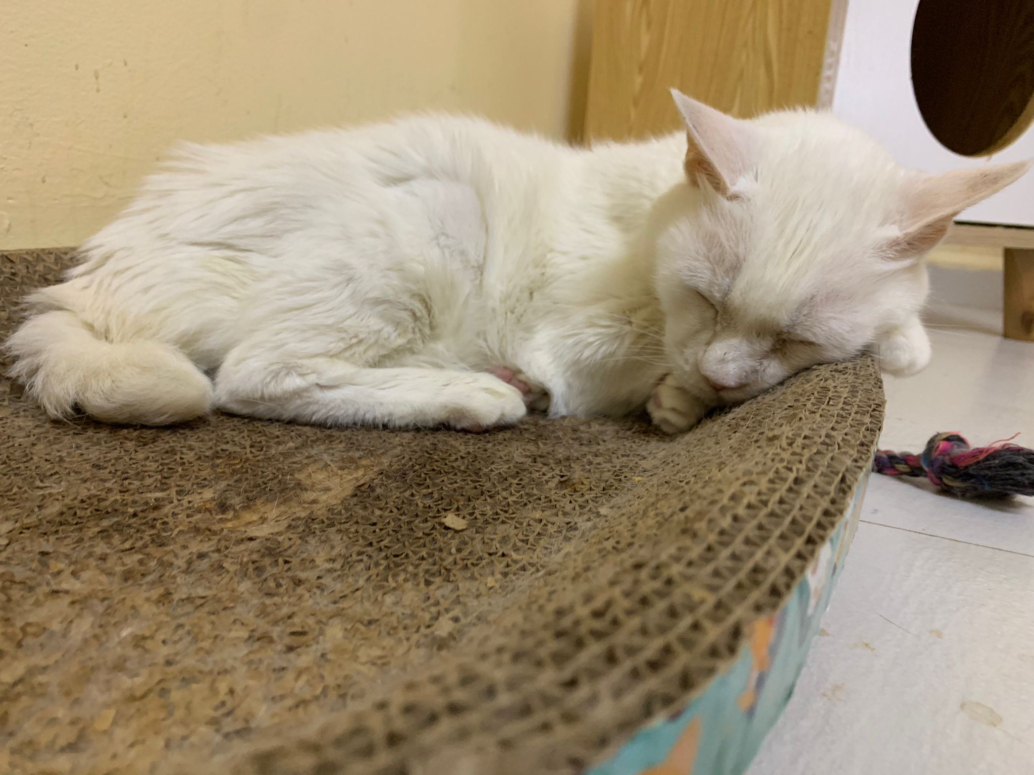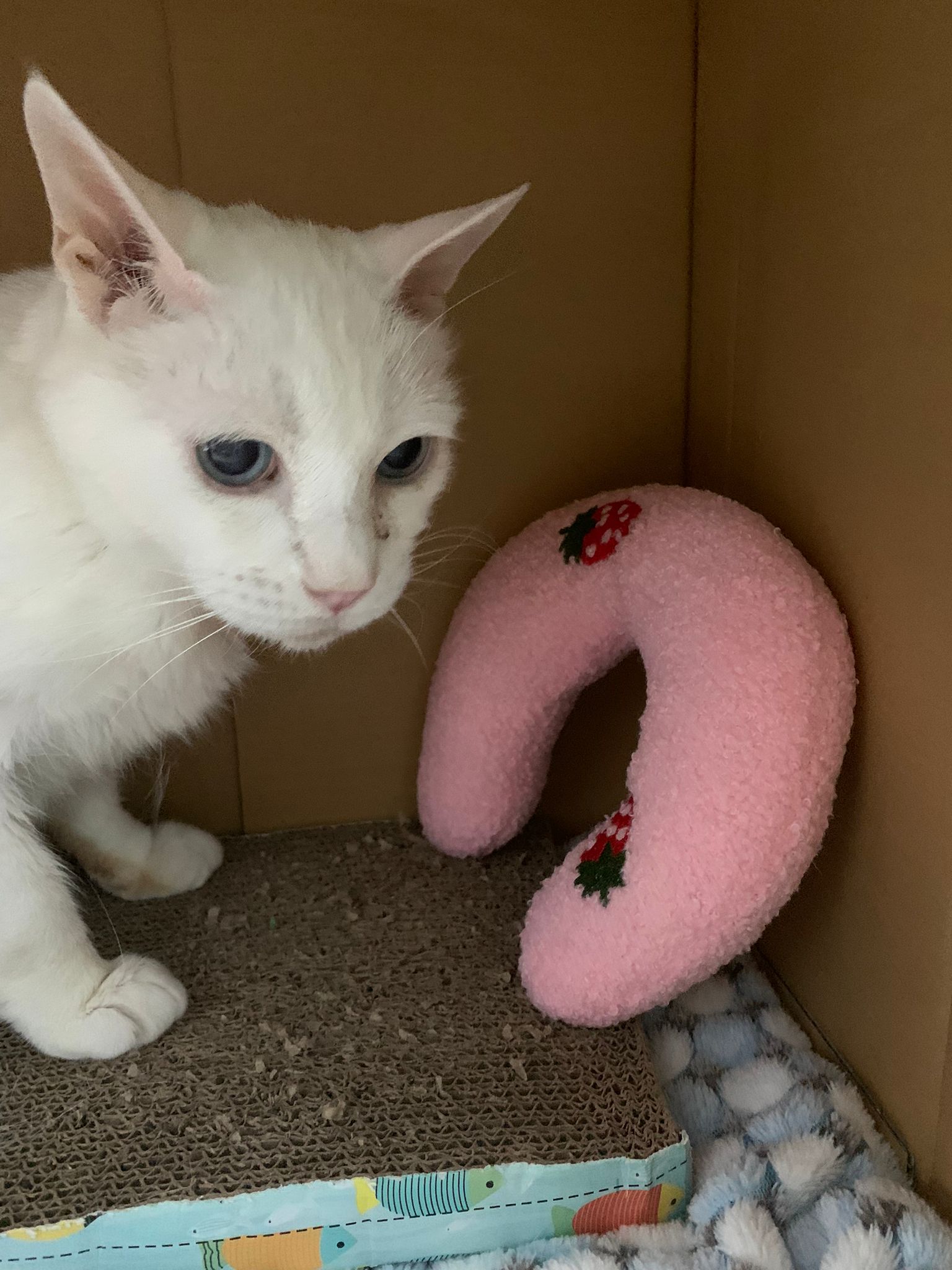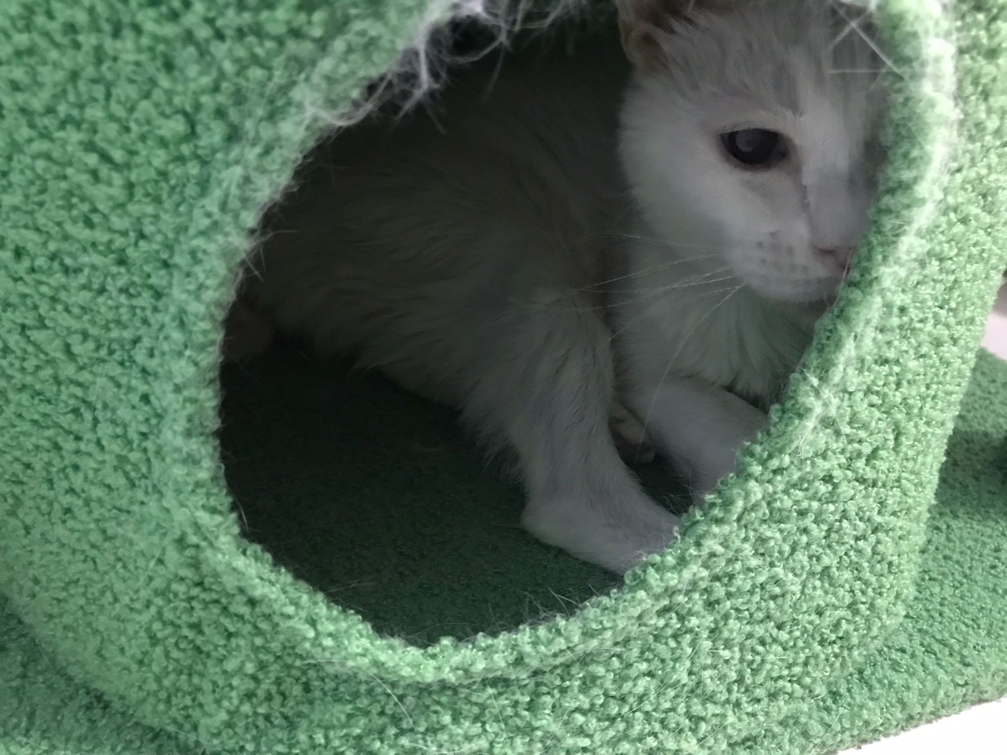 She sit in bin, like scratches and nose discharge still frequent. Clean for her.