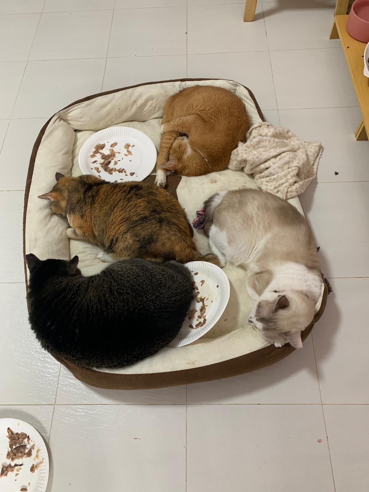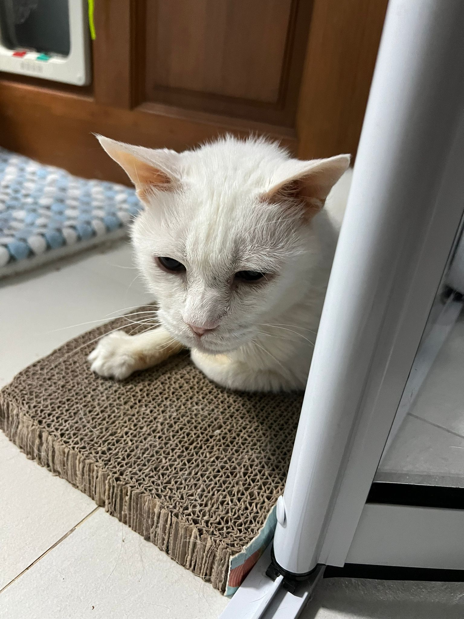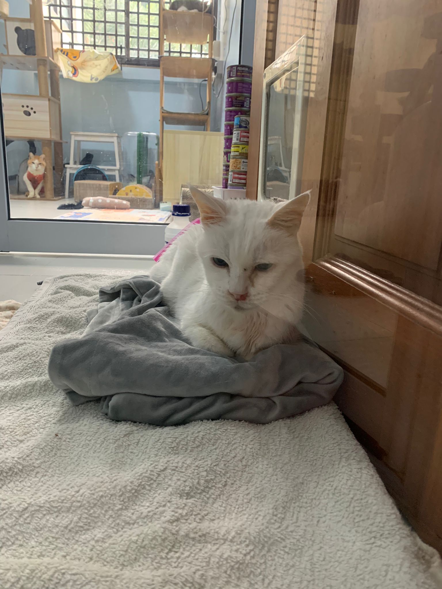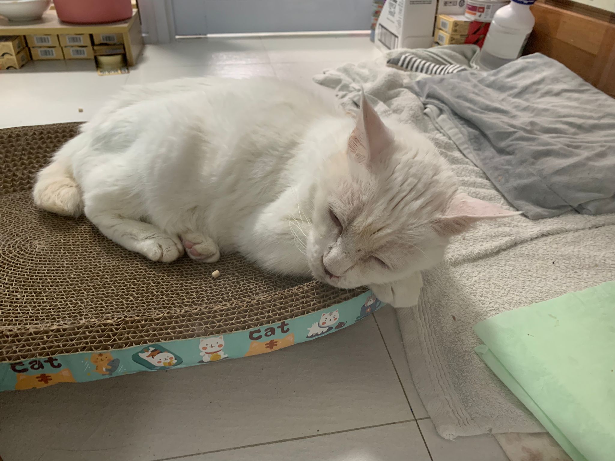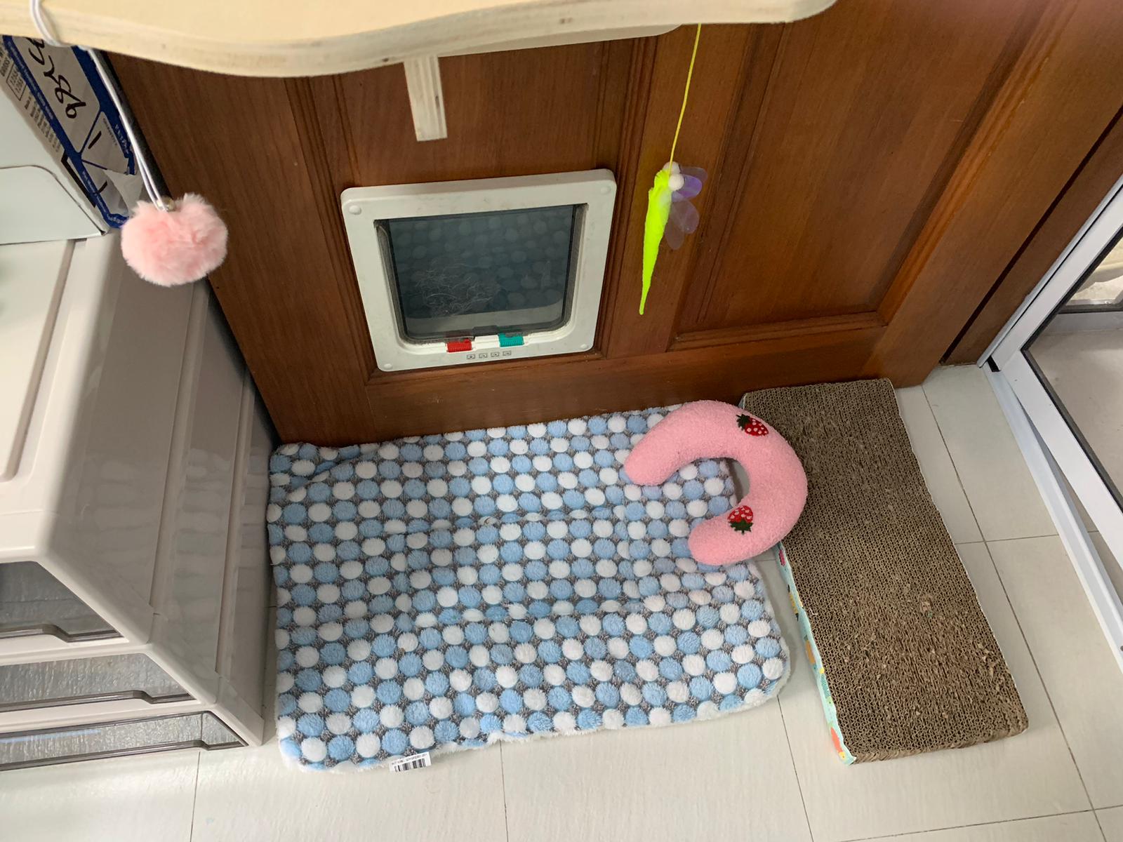 12.45pm. Go back room first time eat her salmon n indoor – oh 猫房 inside I give chicken kibble not to her liking. But I carry her to big bed she also down want. She like the old grey one that i had thrown?