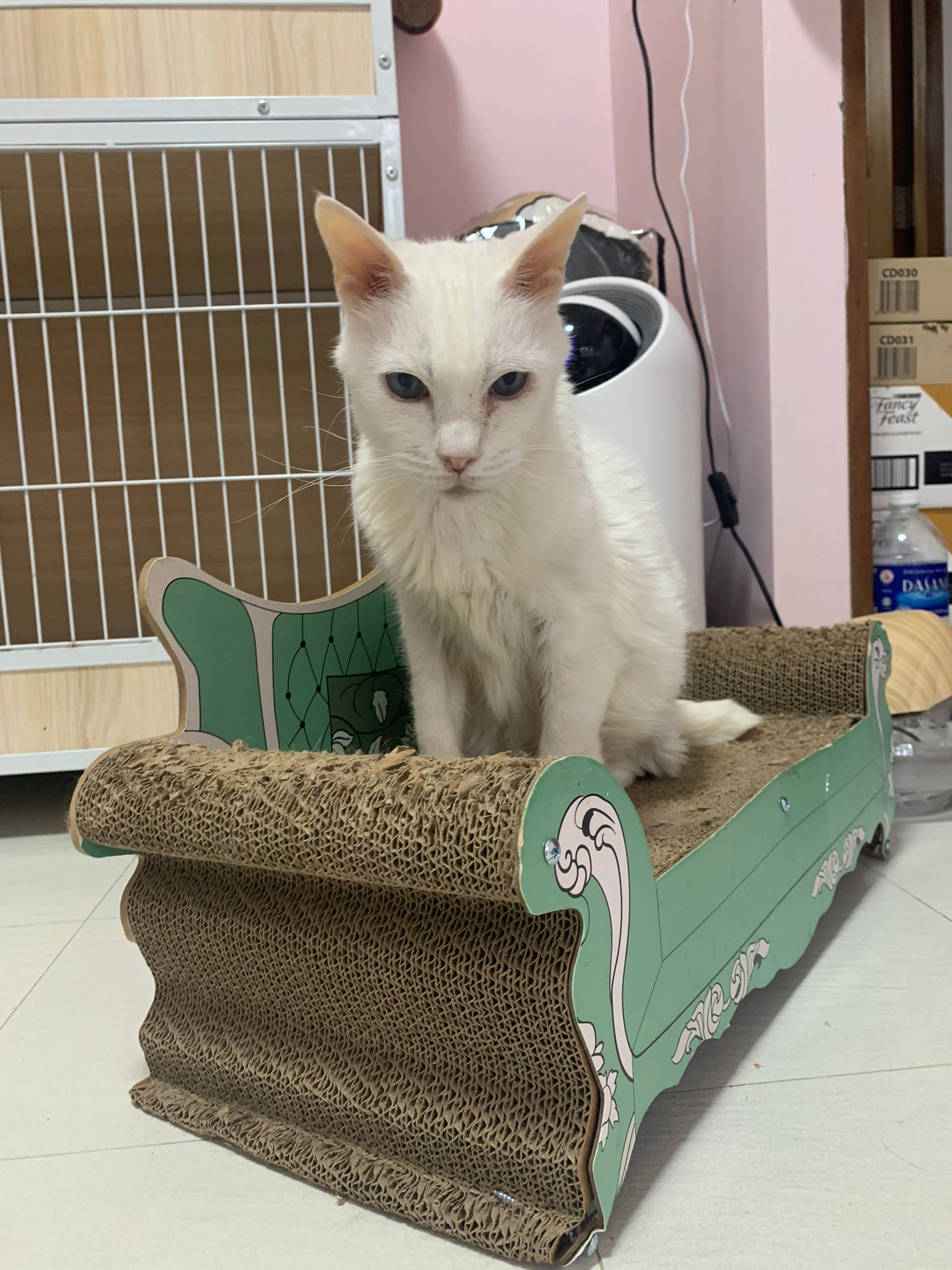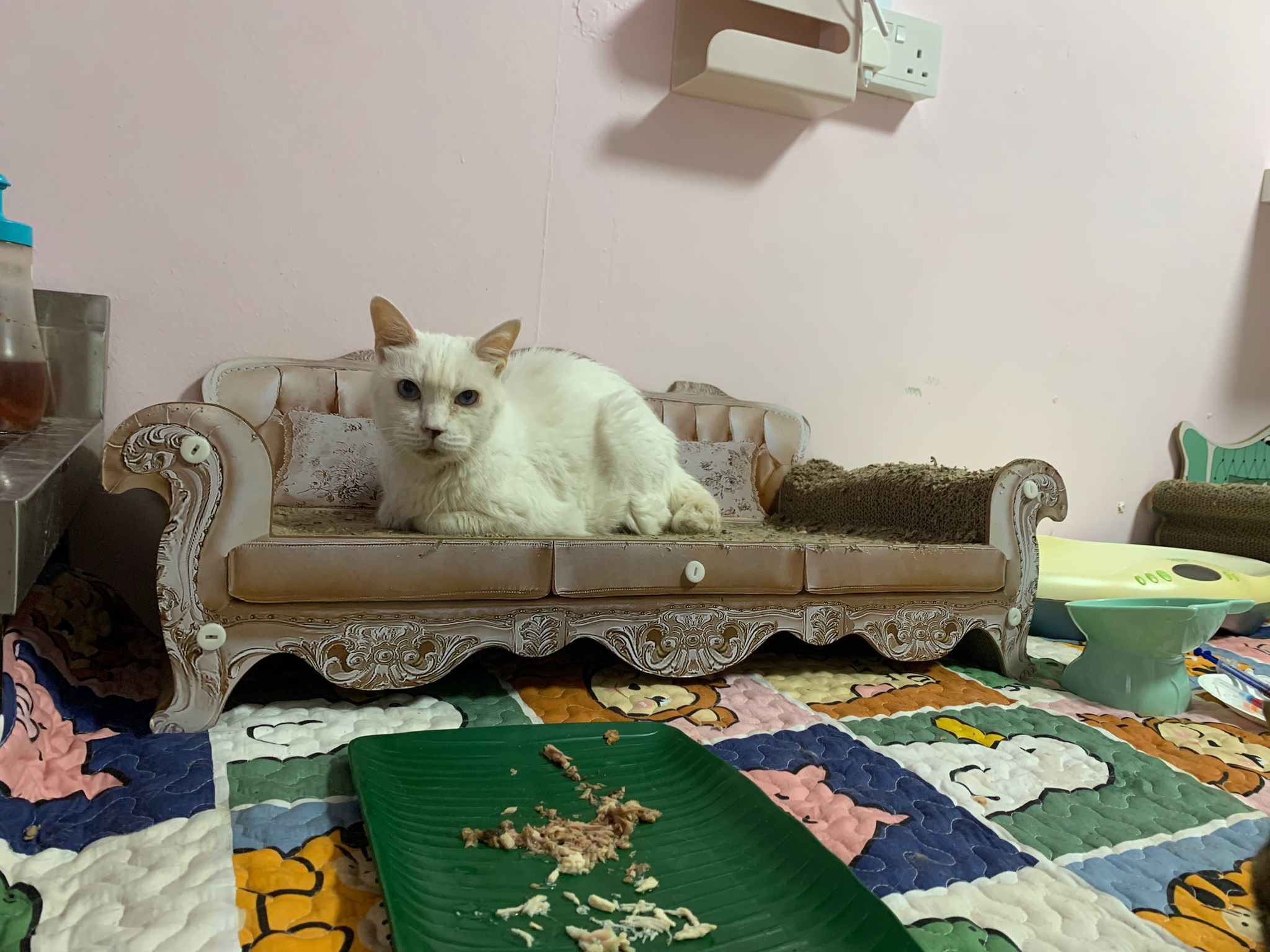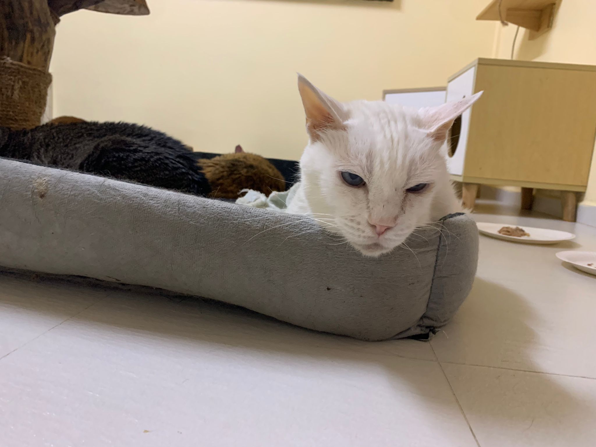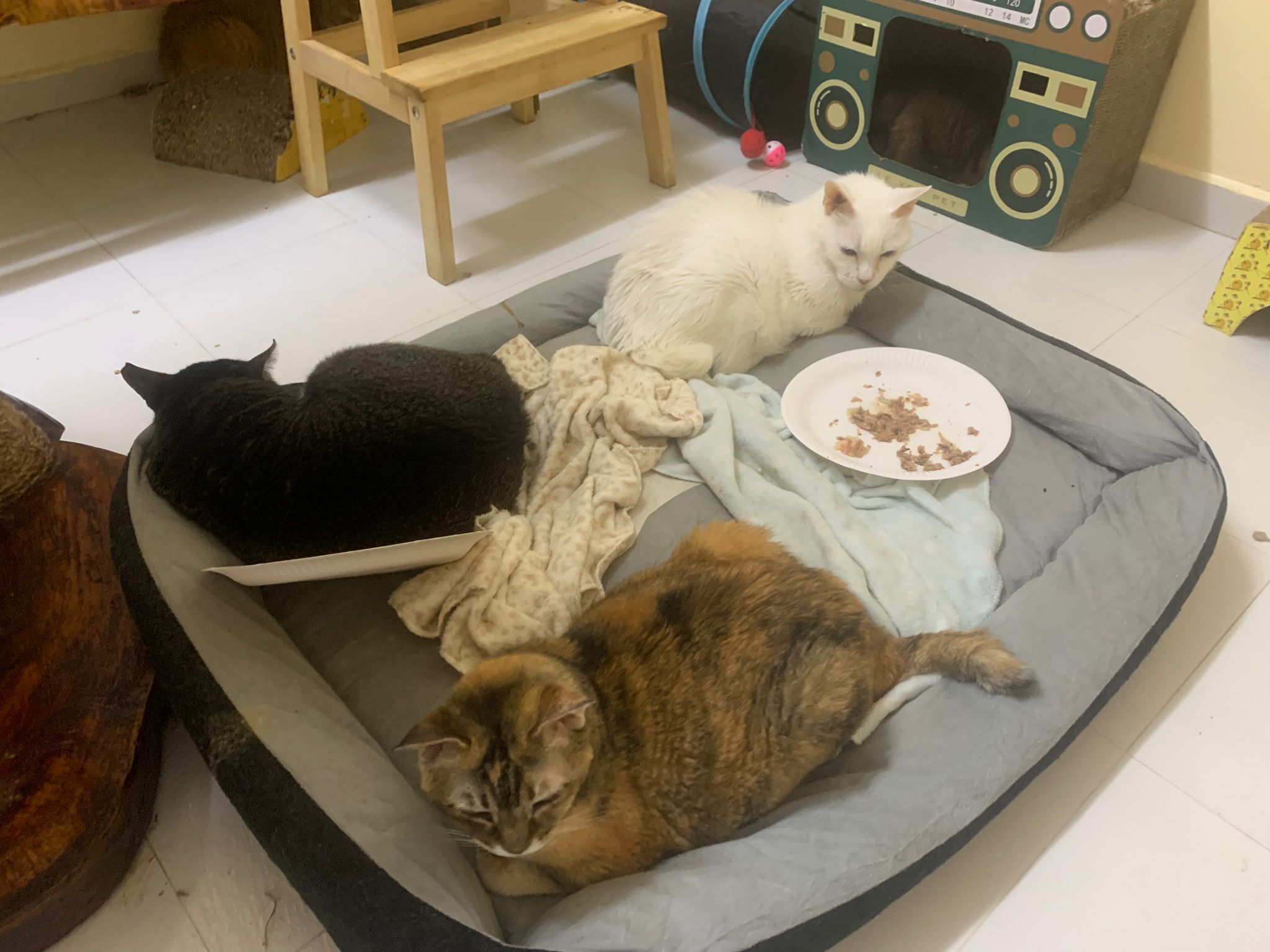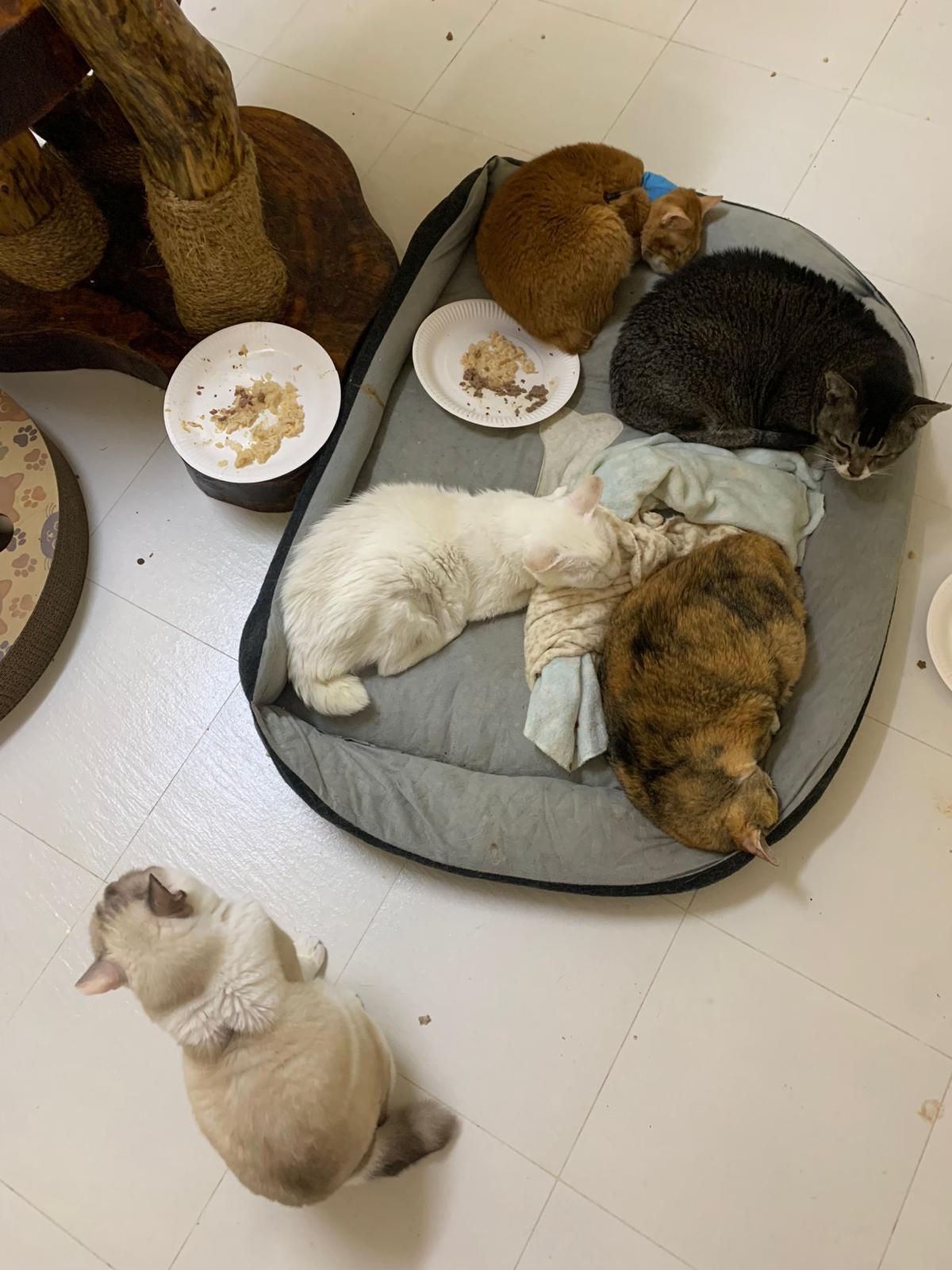 12.45pm. Go back room first time eat her salmon n indoor – oh 猫房 inside I give chicken kibble not to her liking. But I carry her to big bed she also down want. She like the old grey one that i had thrown?
