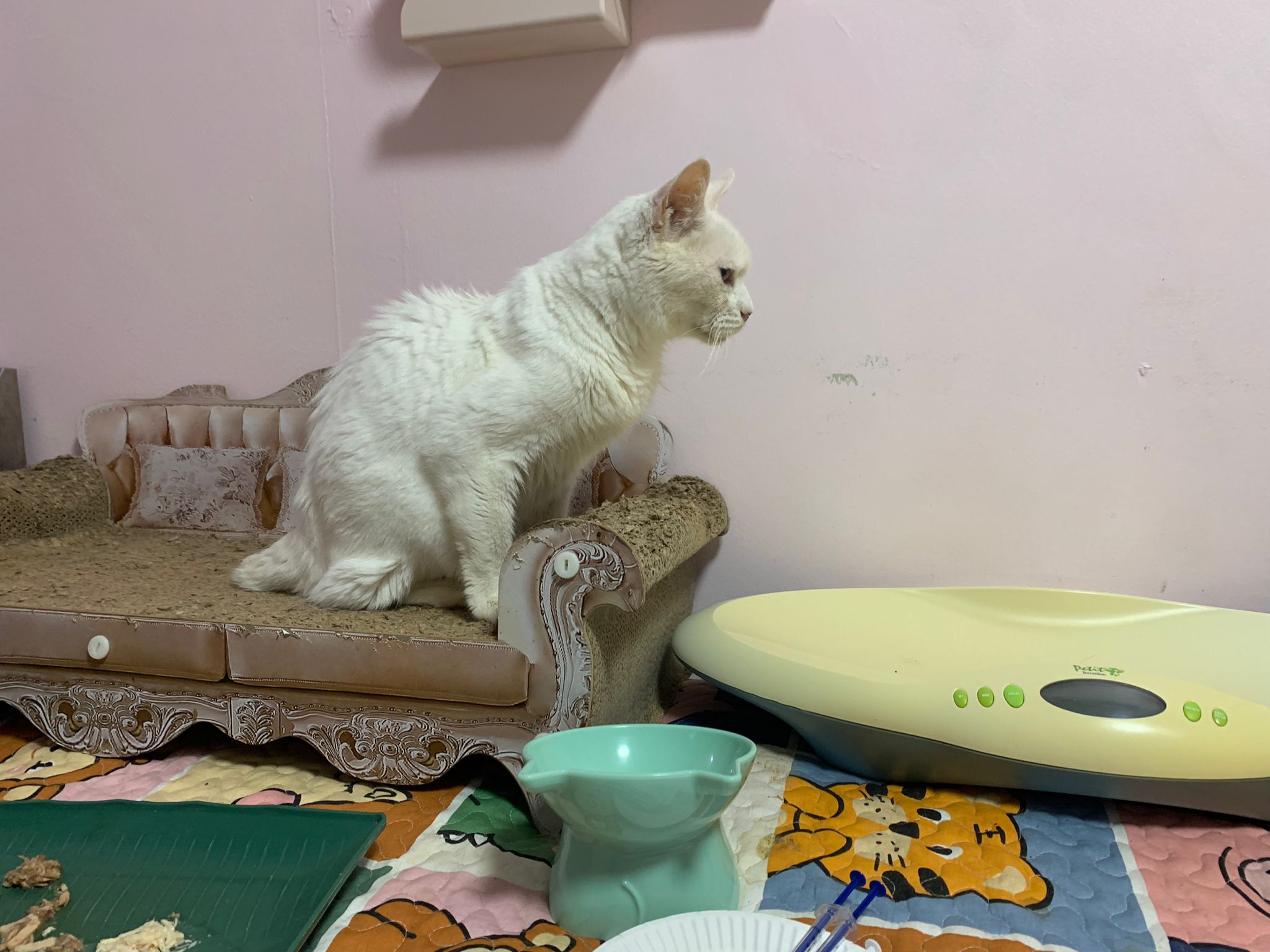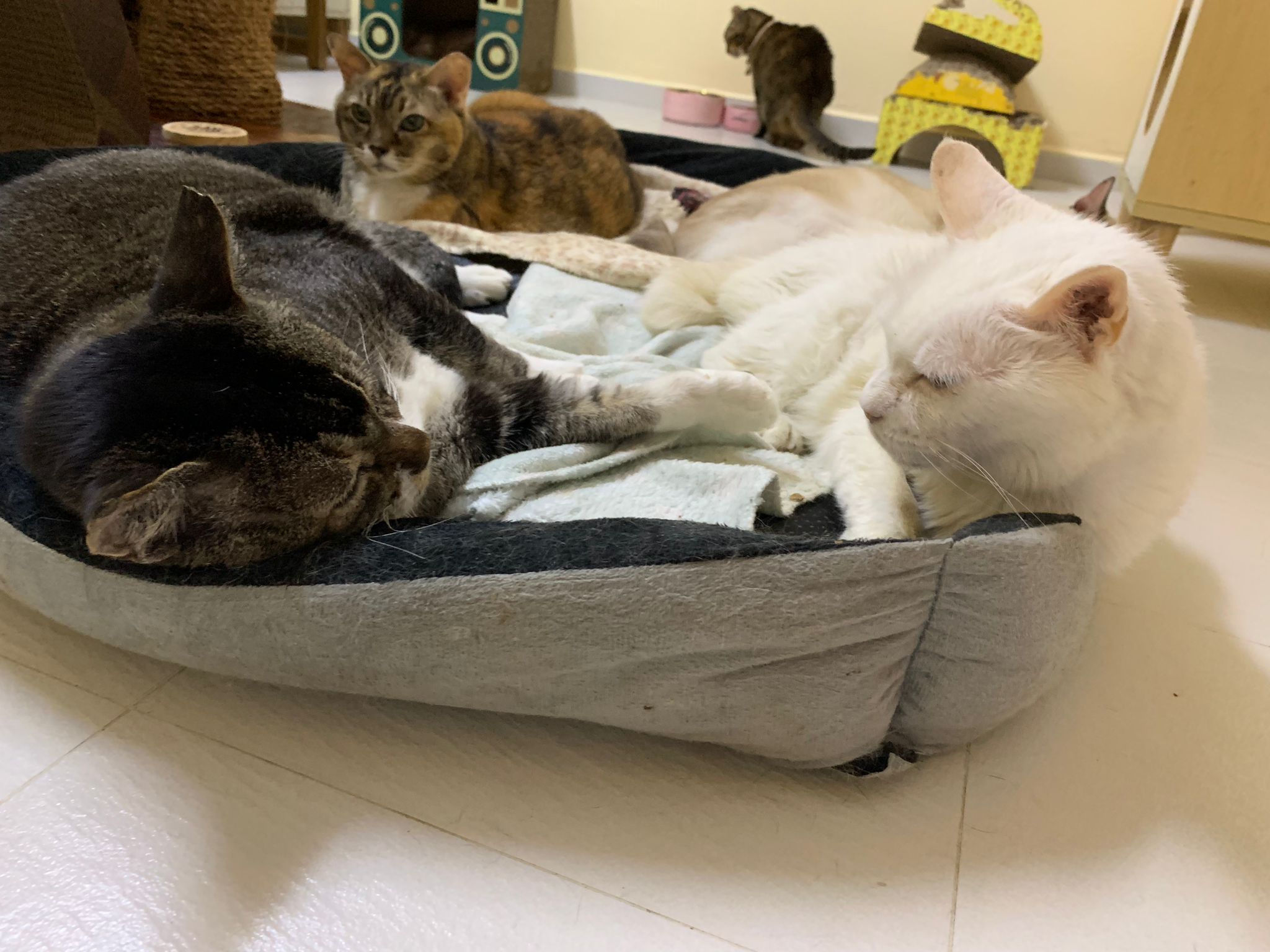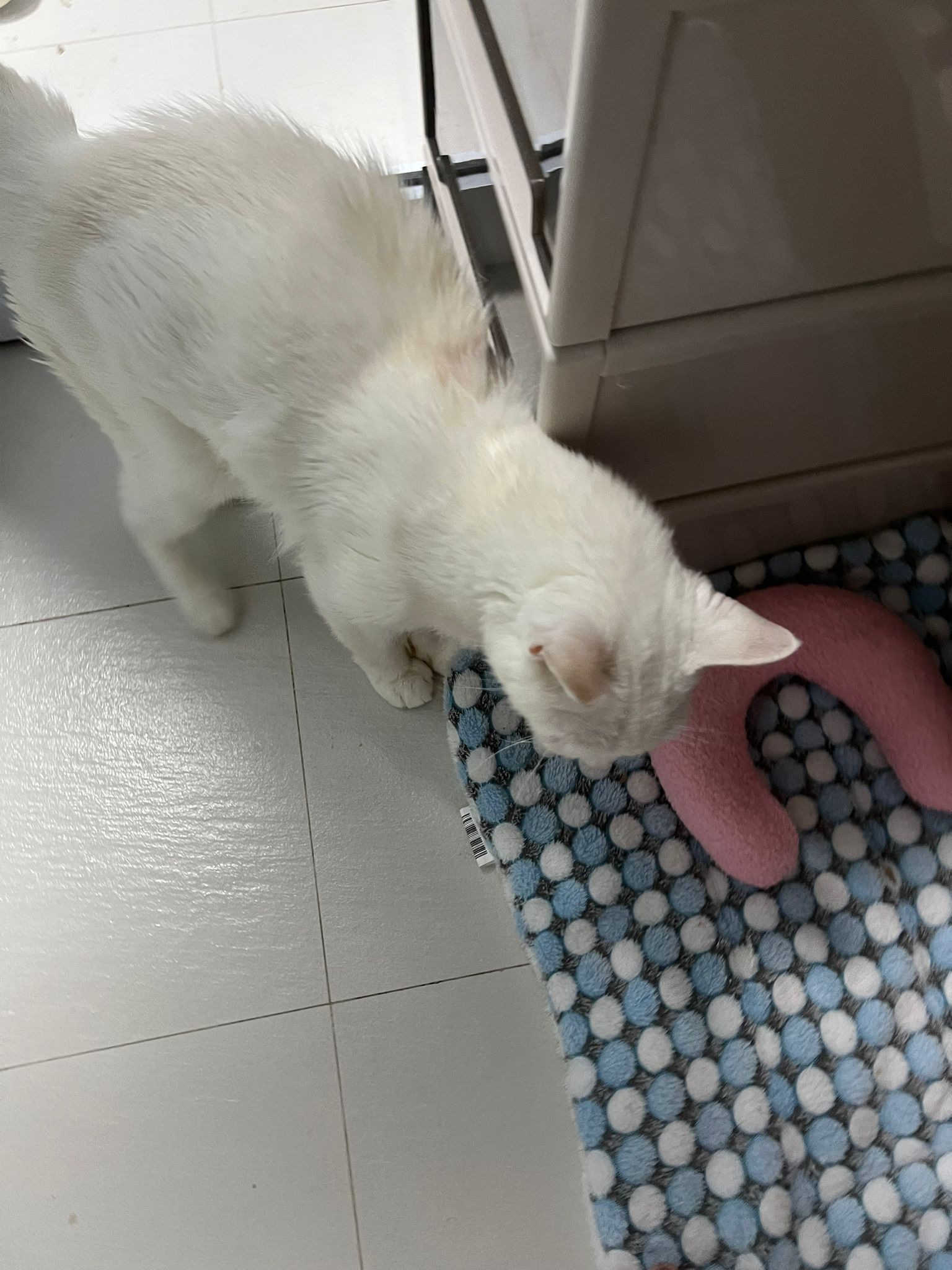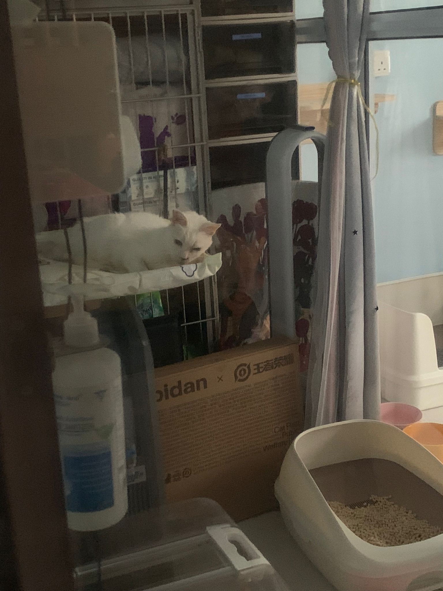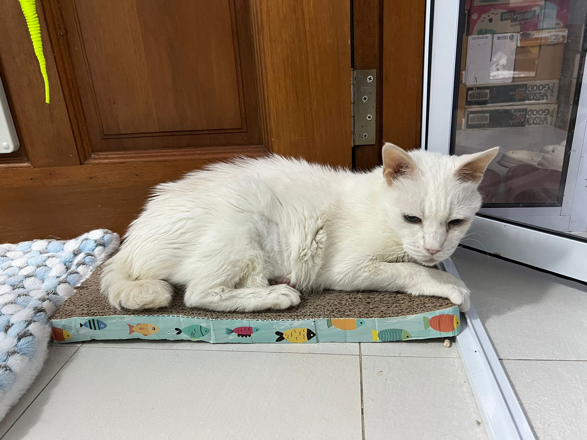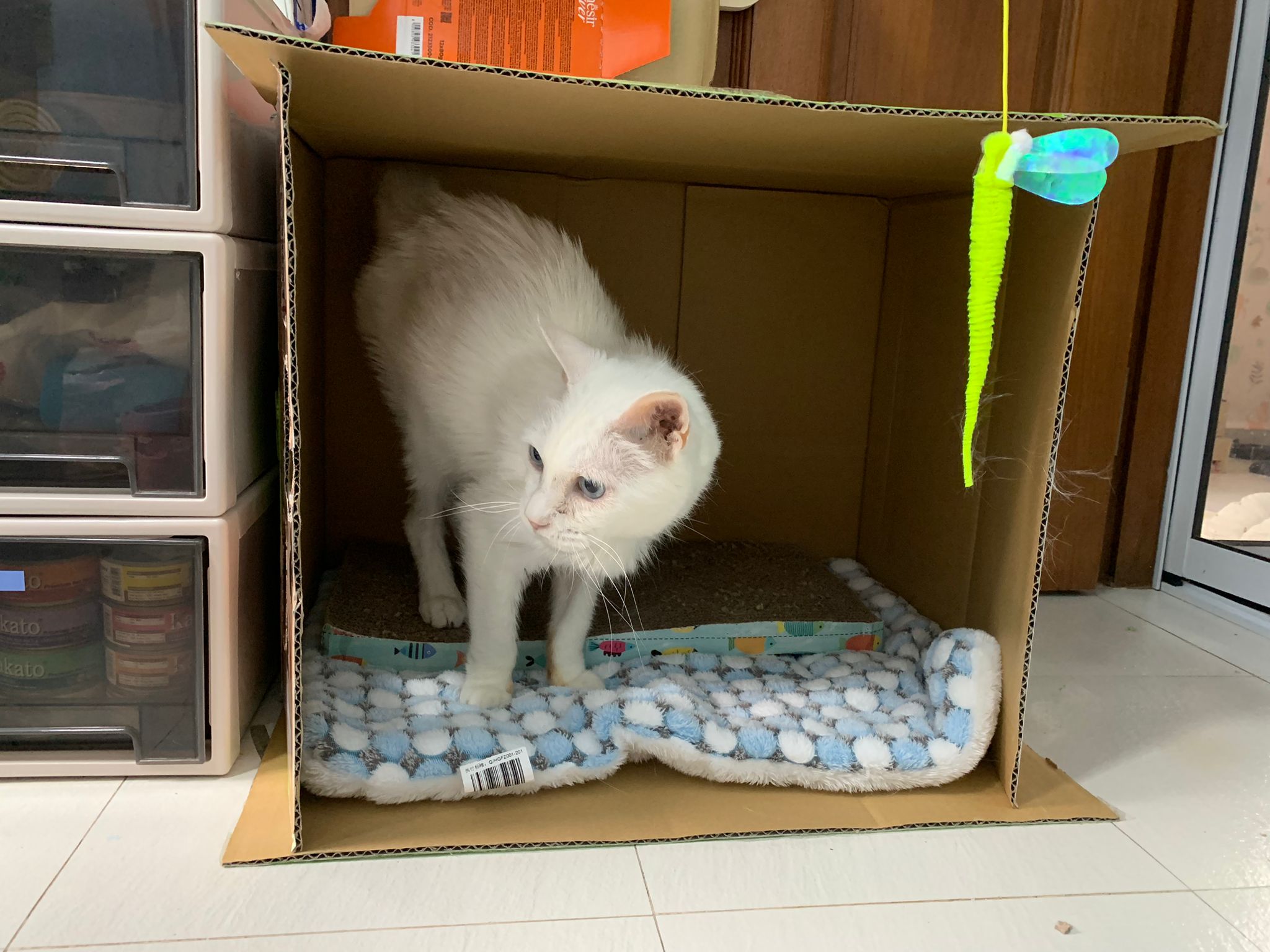 12.45pm. Go back room first time eat her salmon n indoor – oh 猫房 inside I give chicken kibble not to her liking. But I carry her to big bed she also down want. She like the old grey one that i had thrown?