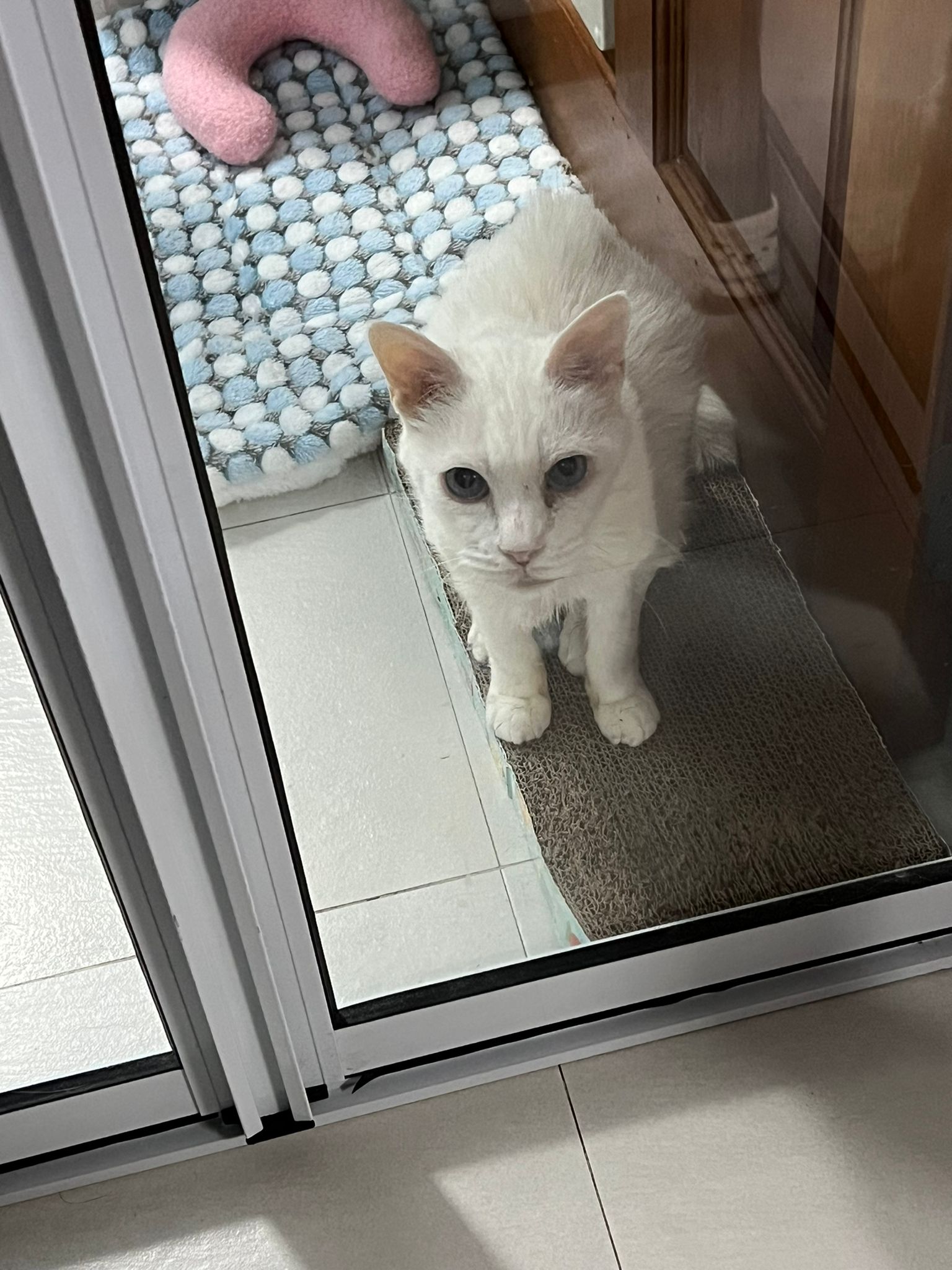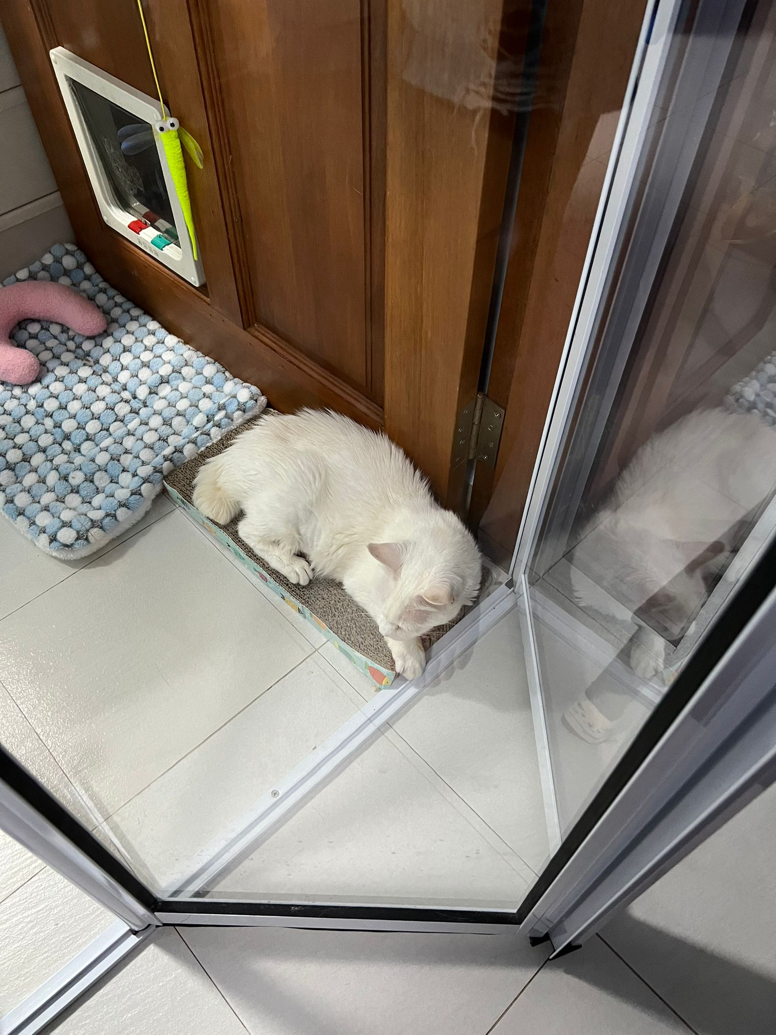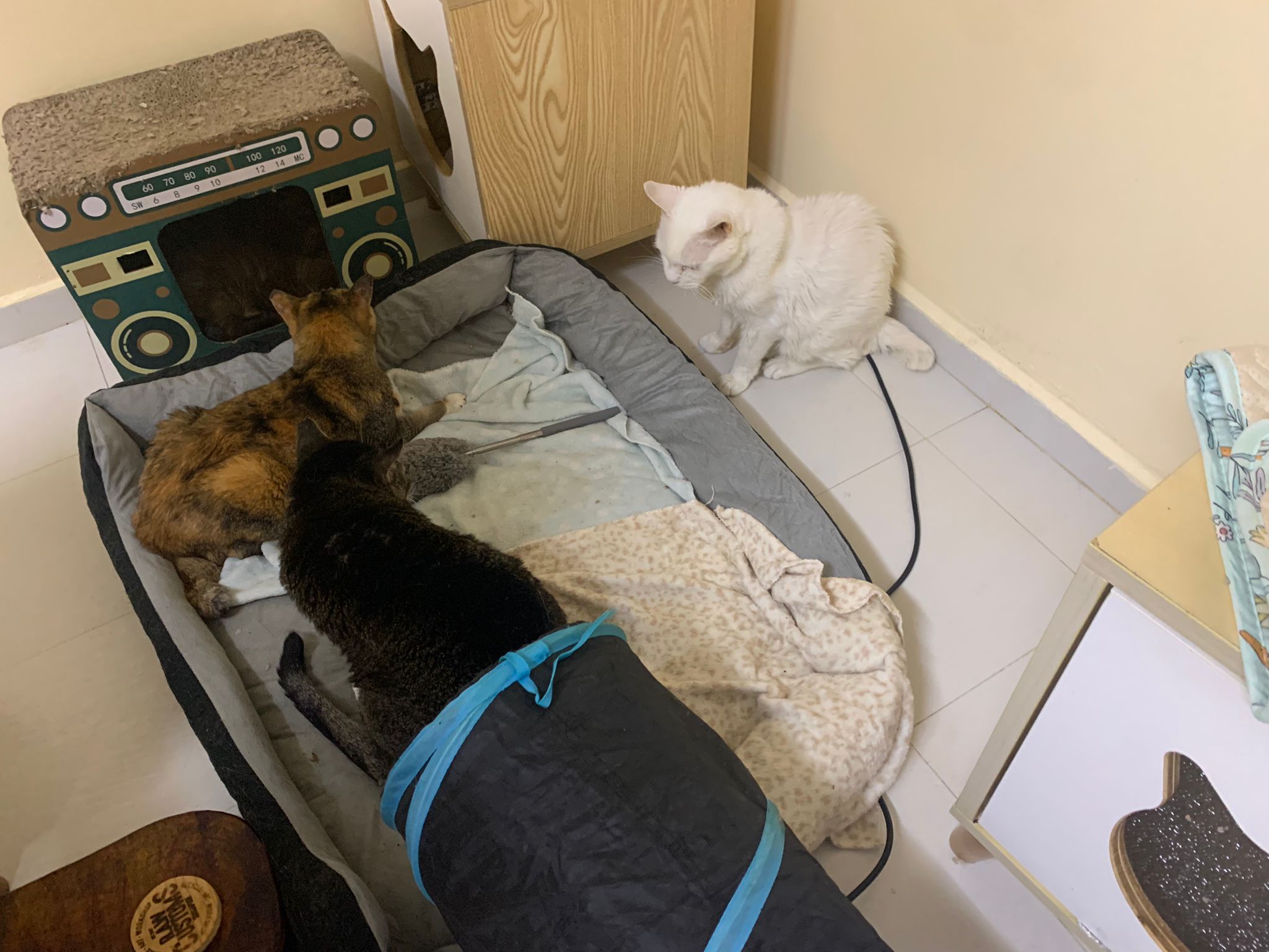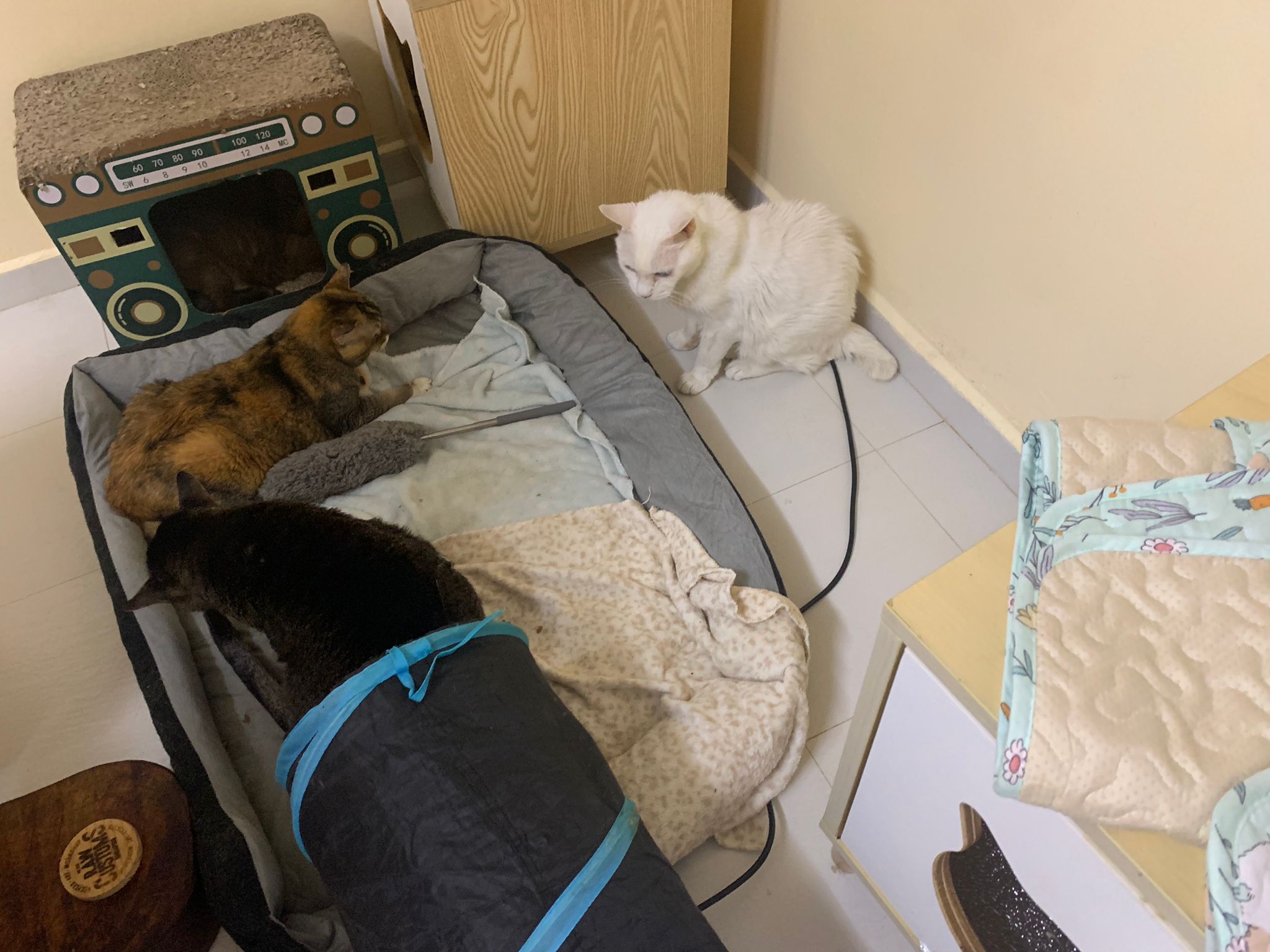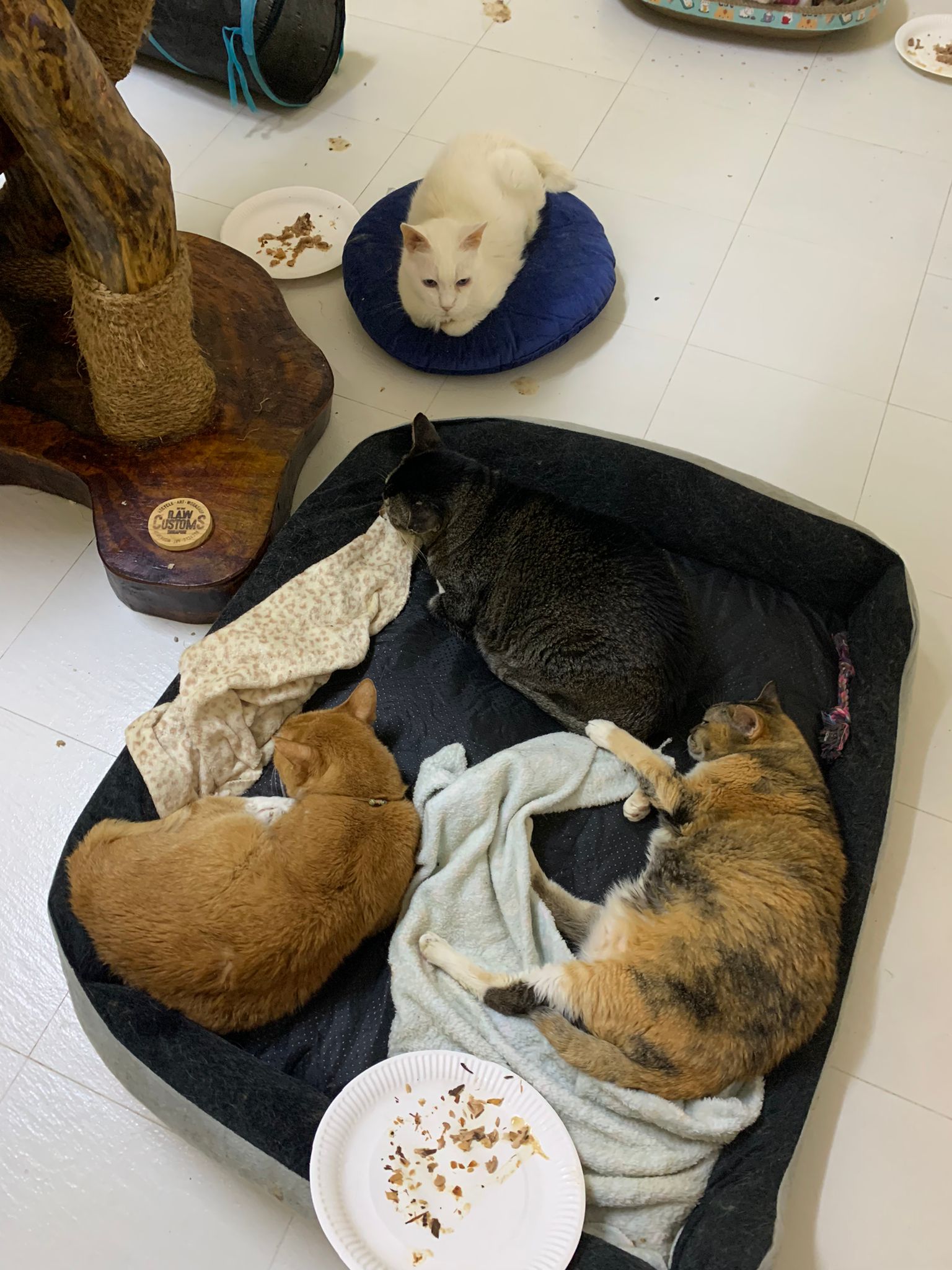 12.45pm. Go back room first time eat her salmon n indoor – oh 猫房 inside I give chicken kibble not to her liking. But I carry her to big bed she also down want. She like the old grey one that i had thrown?