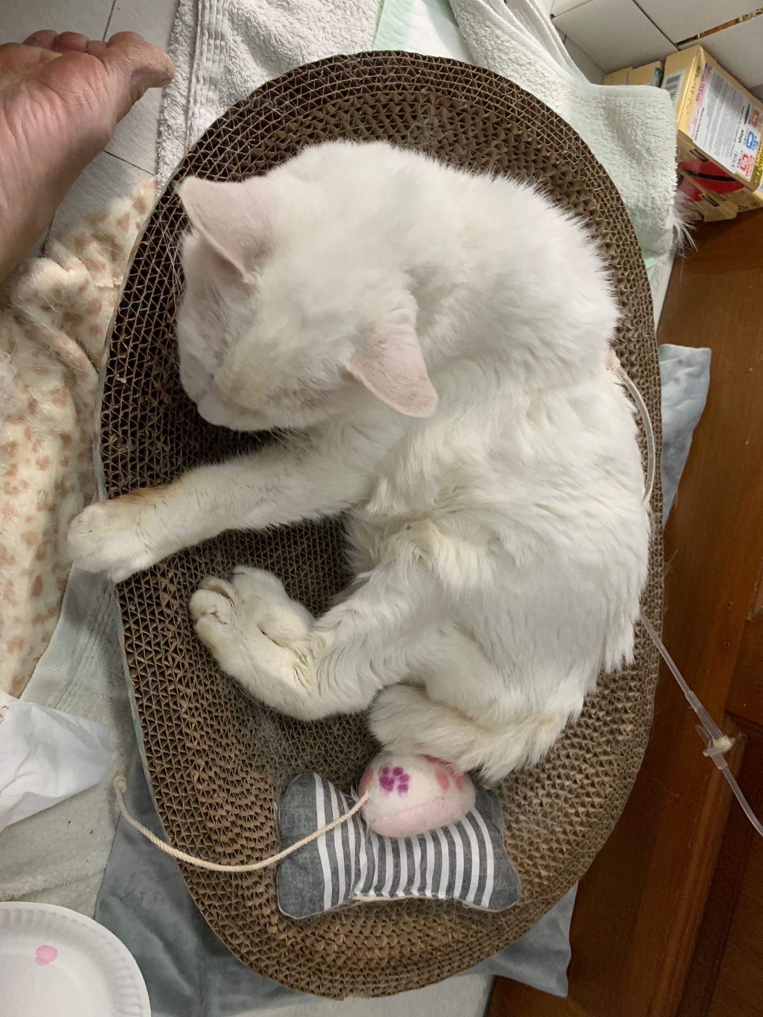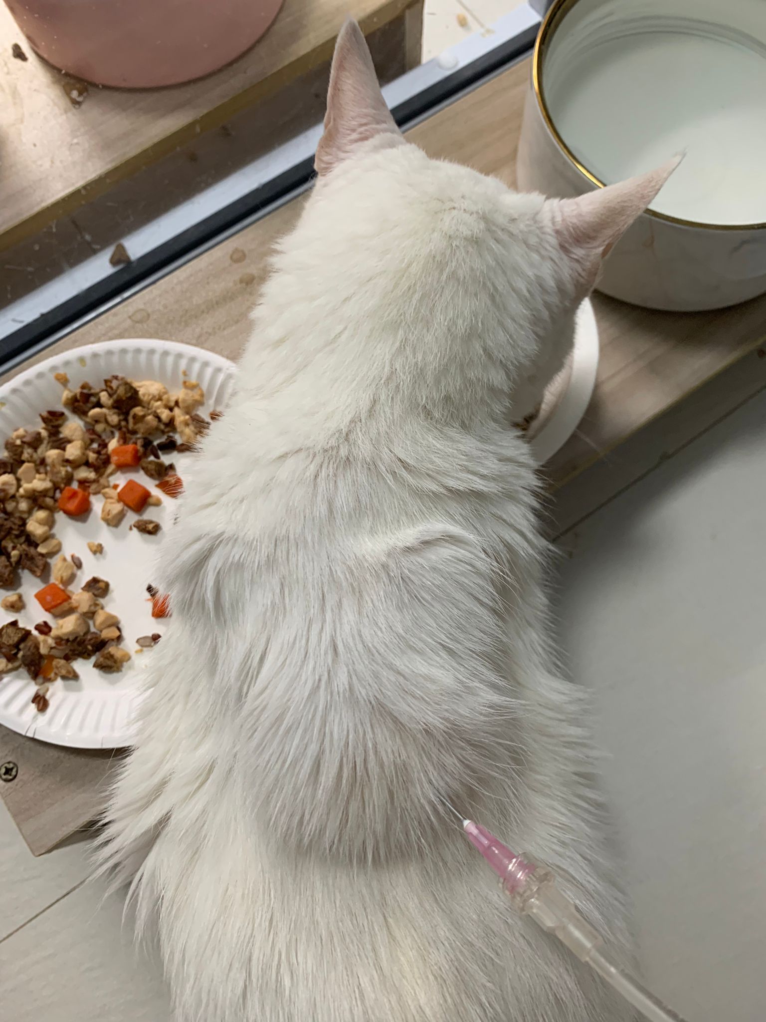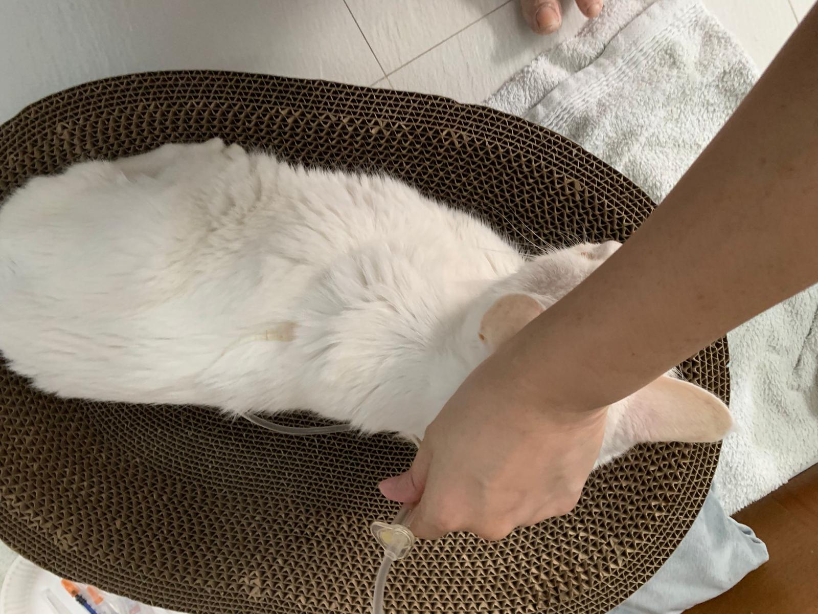 Note: Cerenia is sting. Have to give slow and after most fluid is in the body, hold snowy well don’t let her jump off when Cerenia go into dripline” – snowy should feel better after a few days of Cerenia