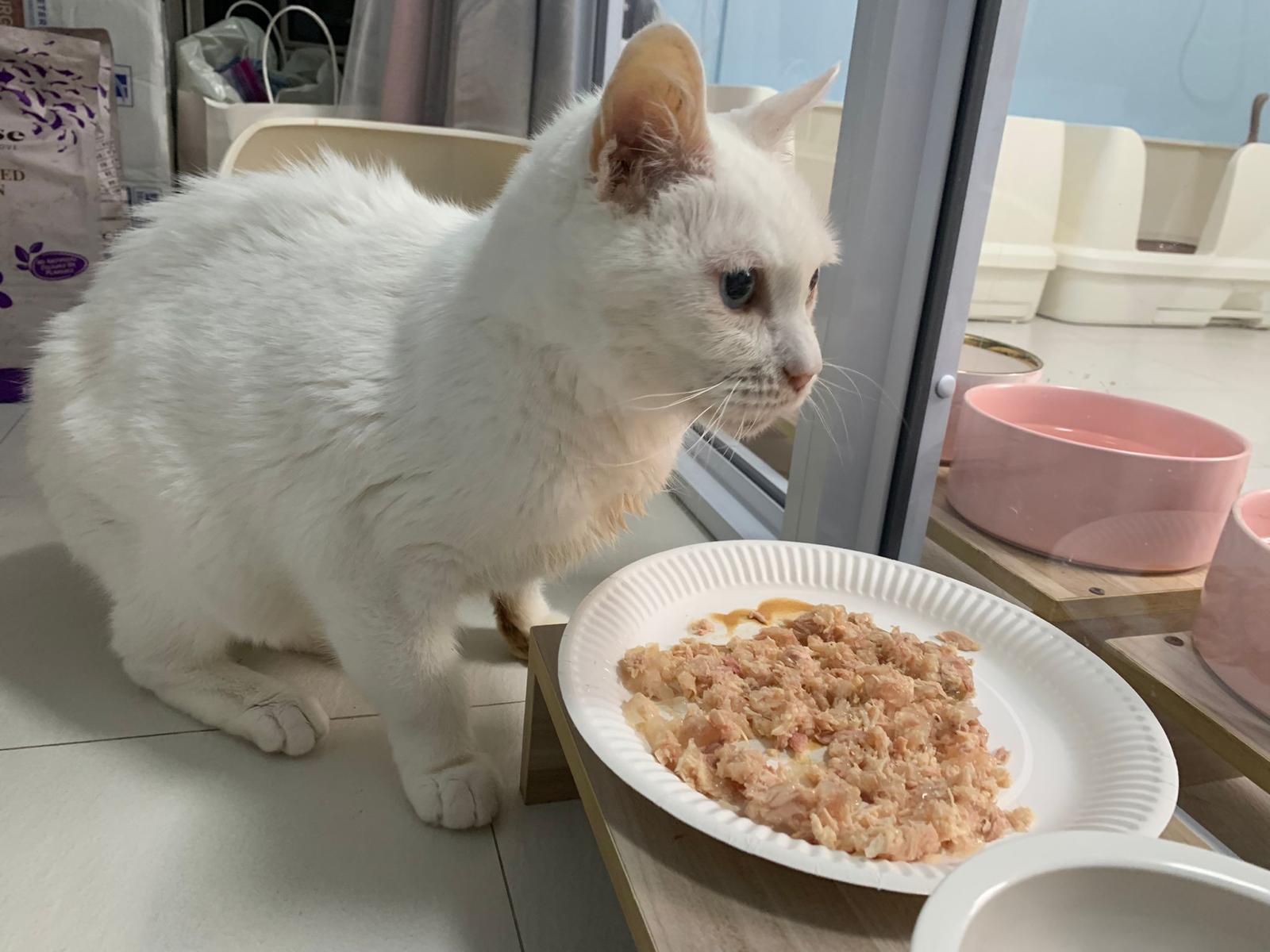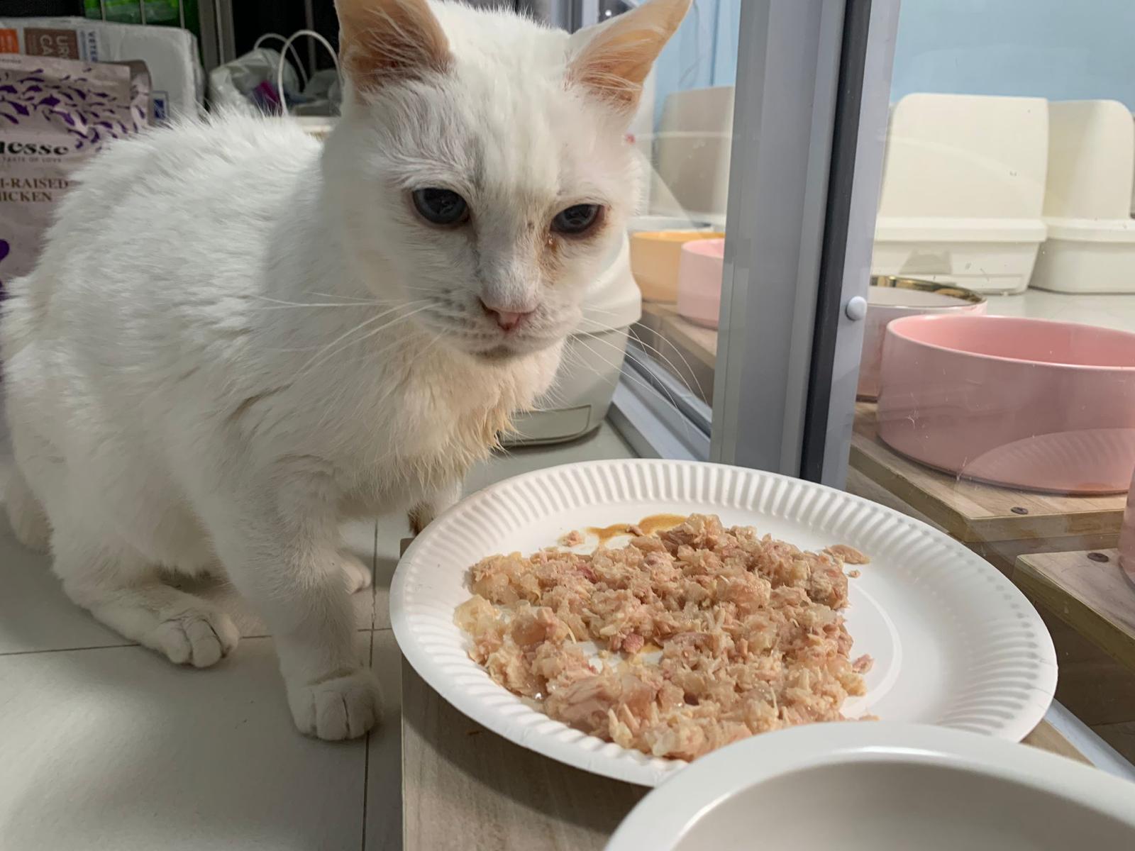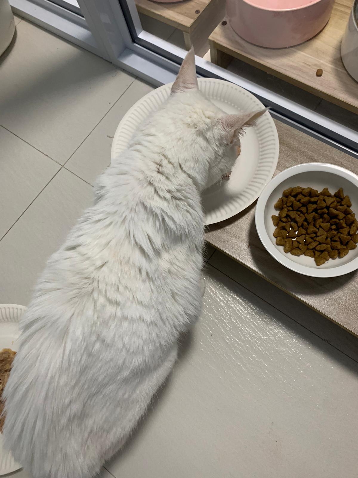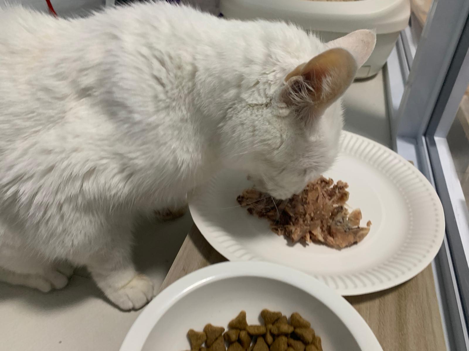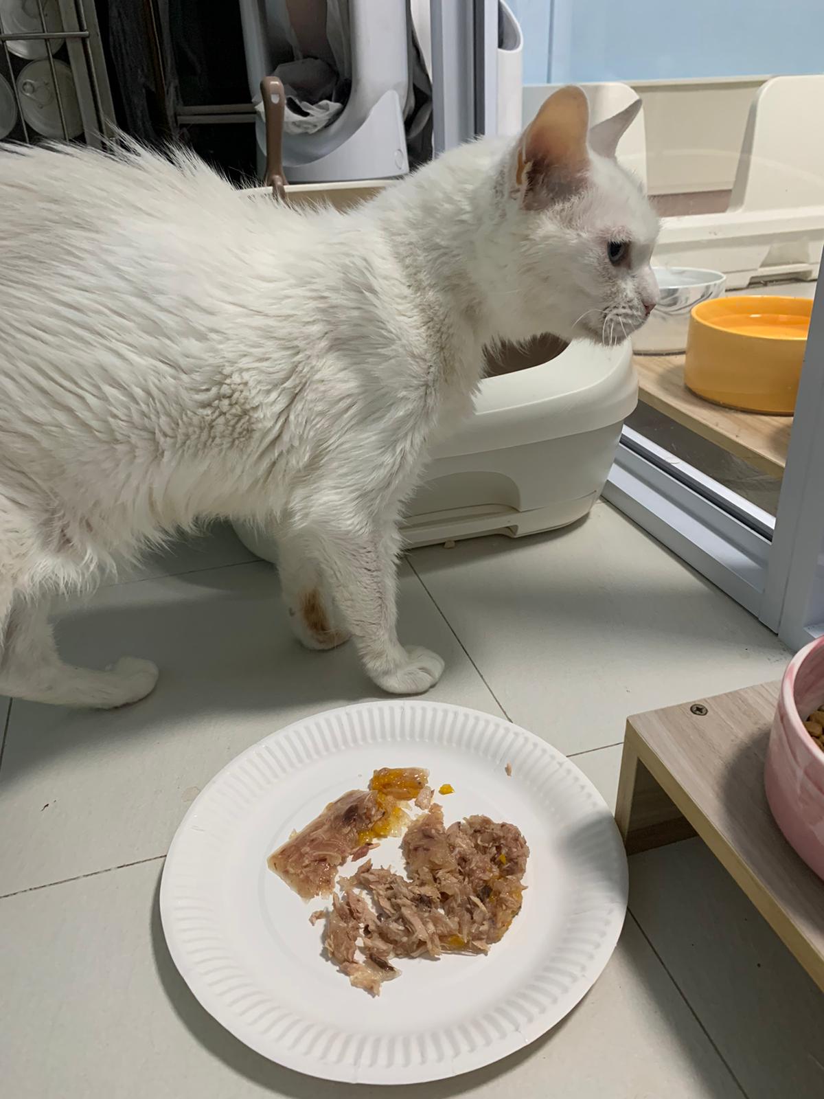 Serve another can of kakato chicken n tuna – she eat also. Totally ok w other cats. She is eating w Xiami looking at her food.