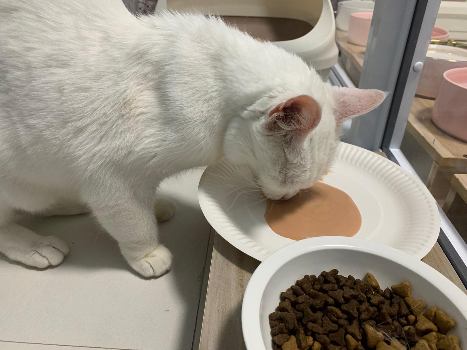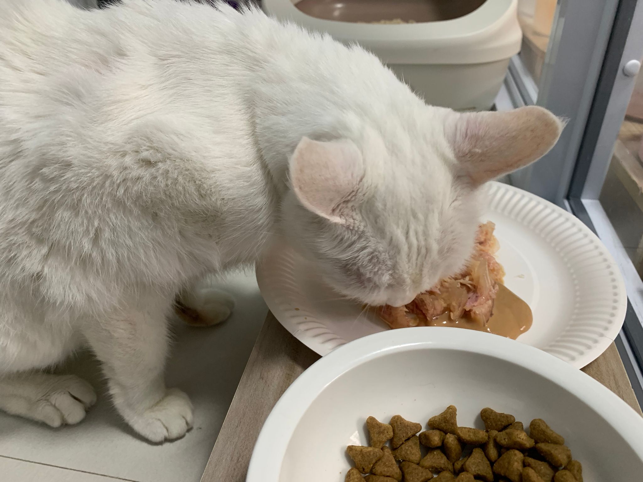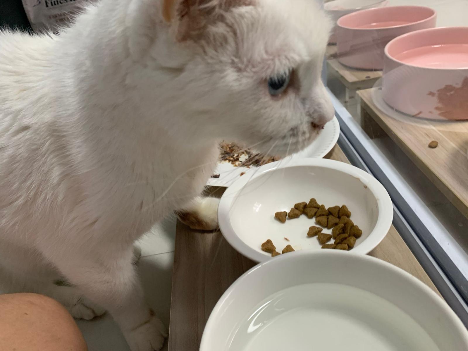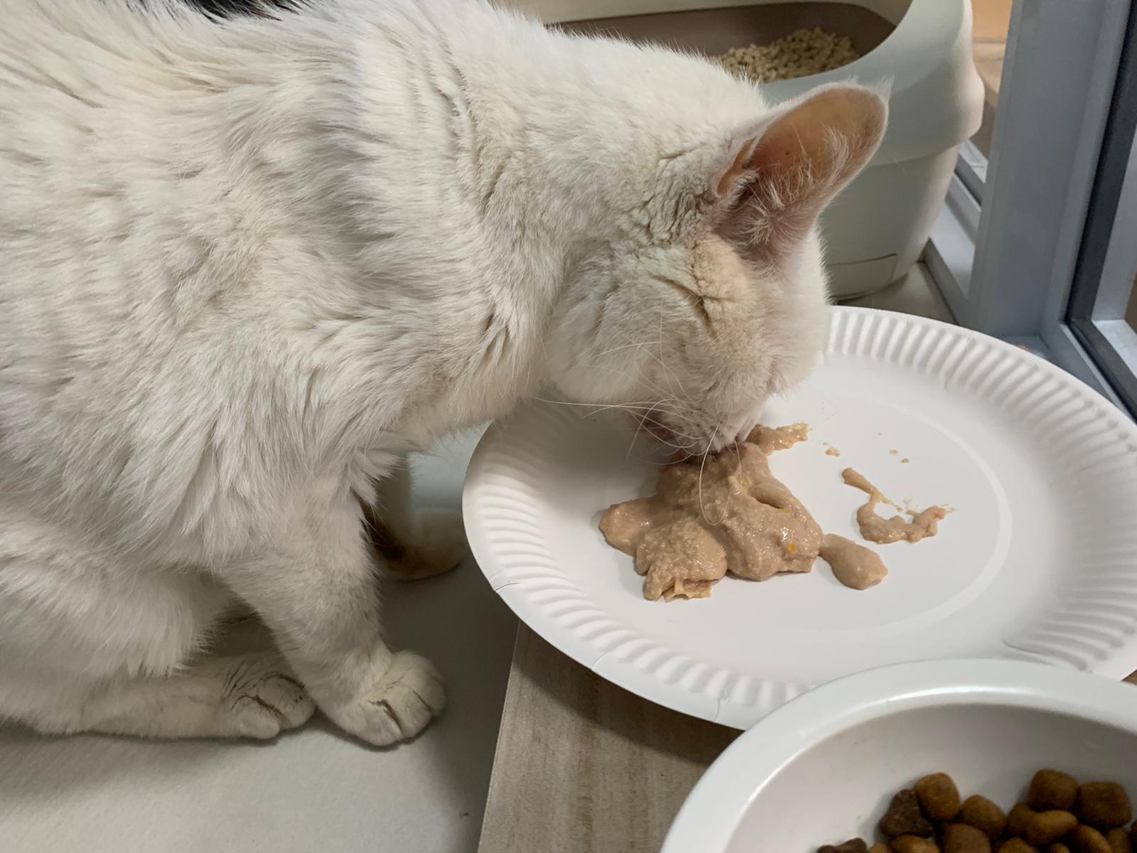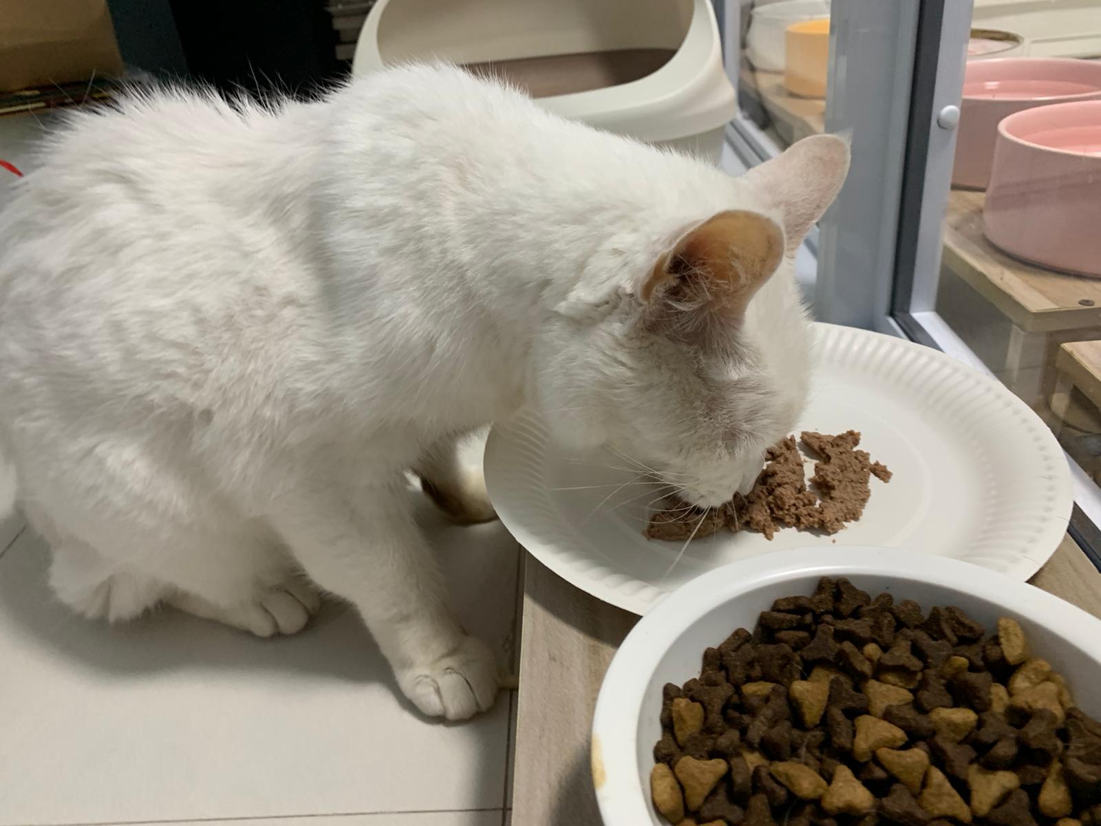 Serve another can of kakato chicken n tuna – she eat also. Totally ok w other cats. She is eating w Xiami looking at her food.