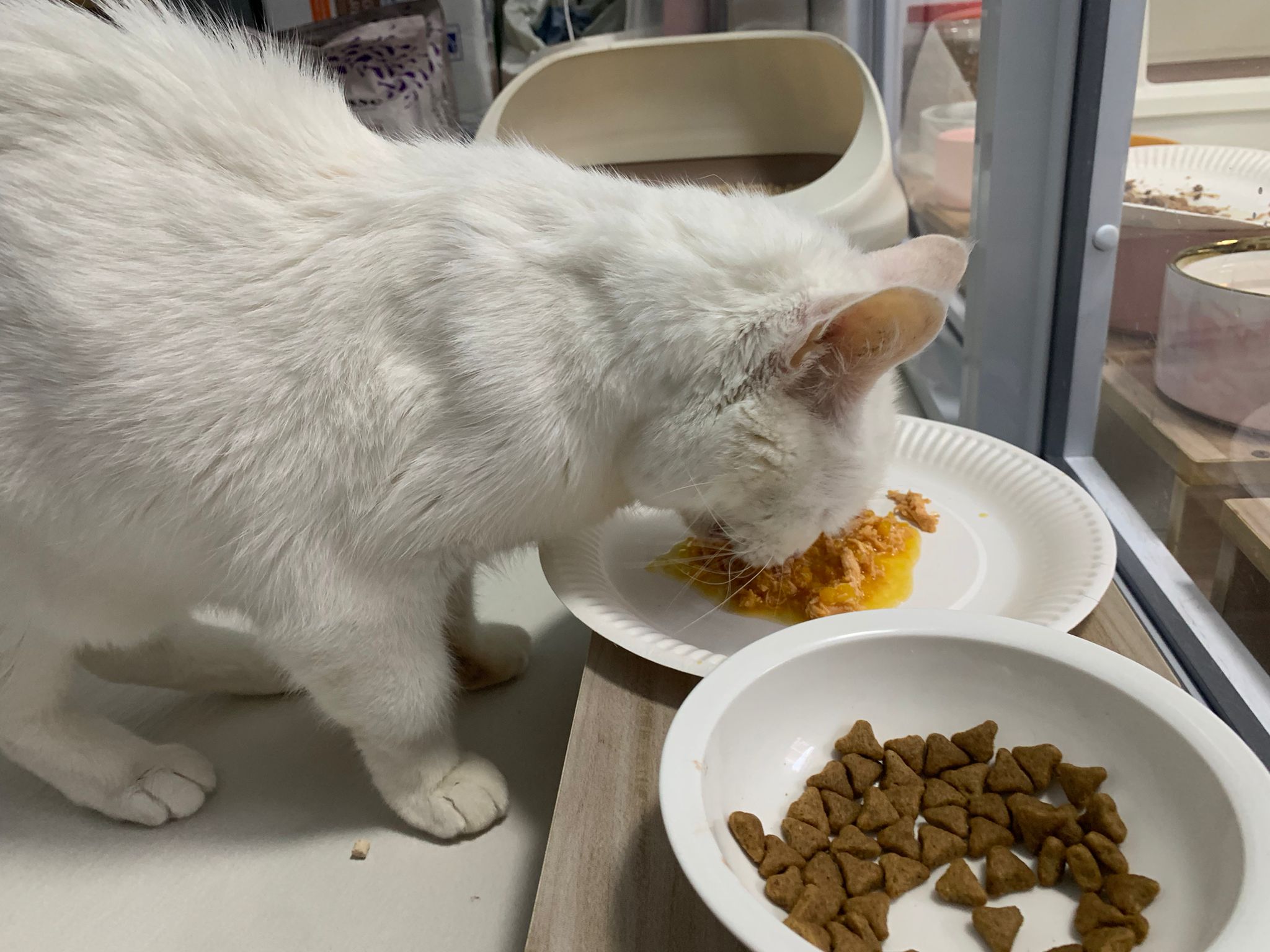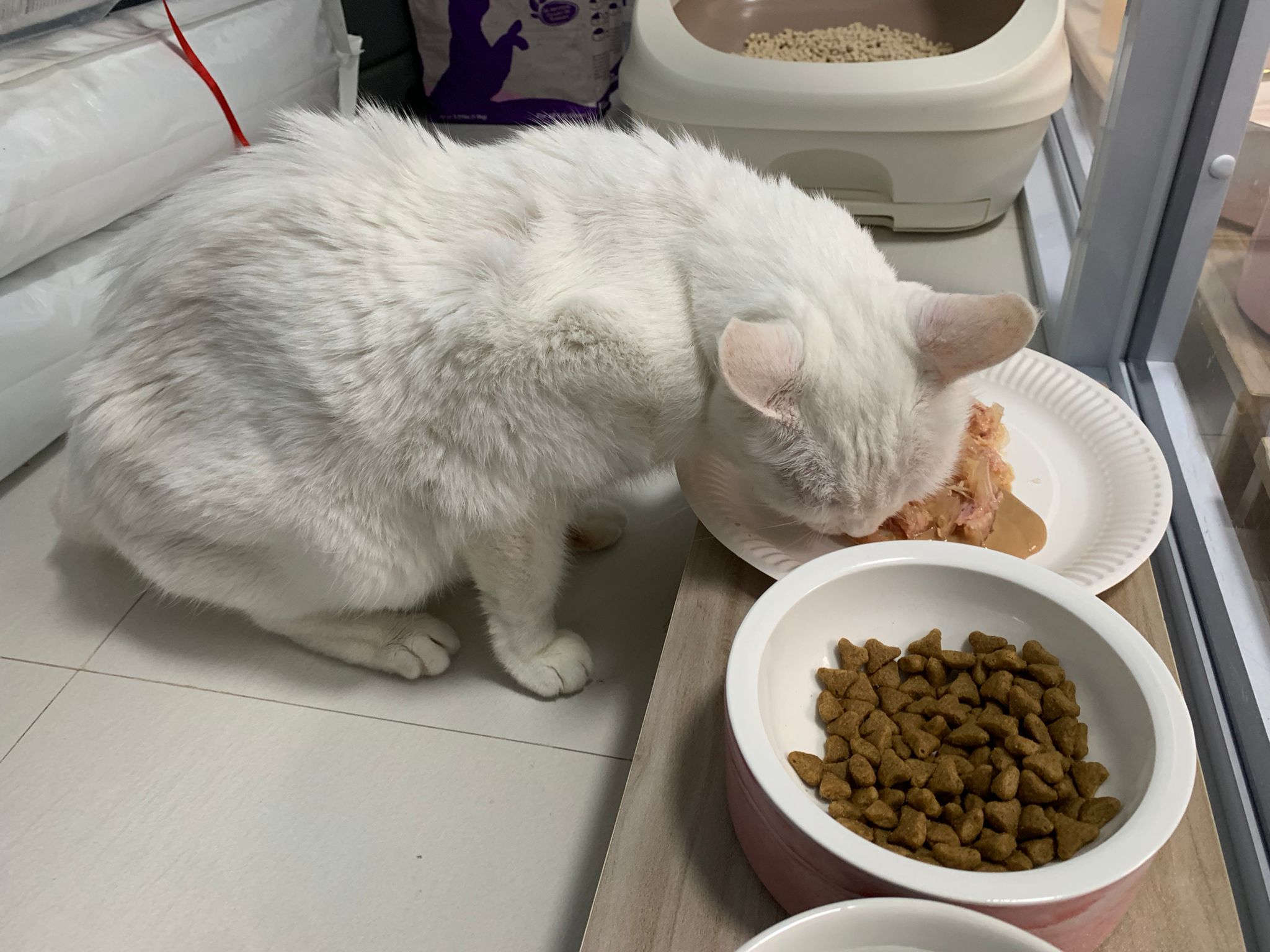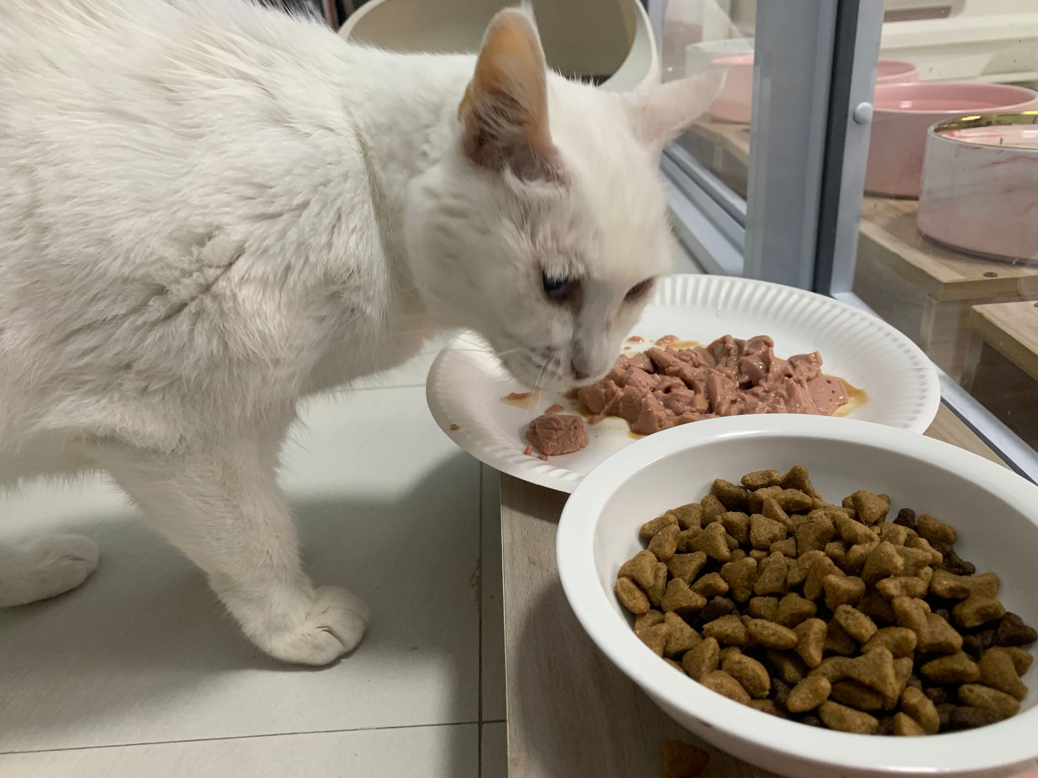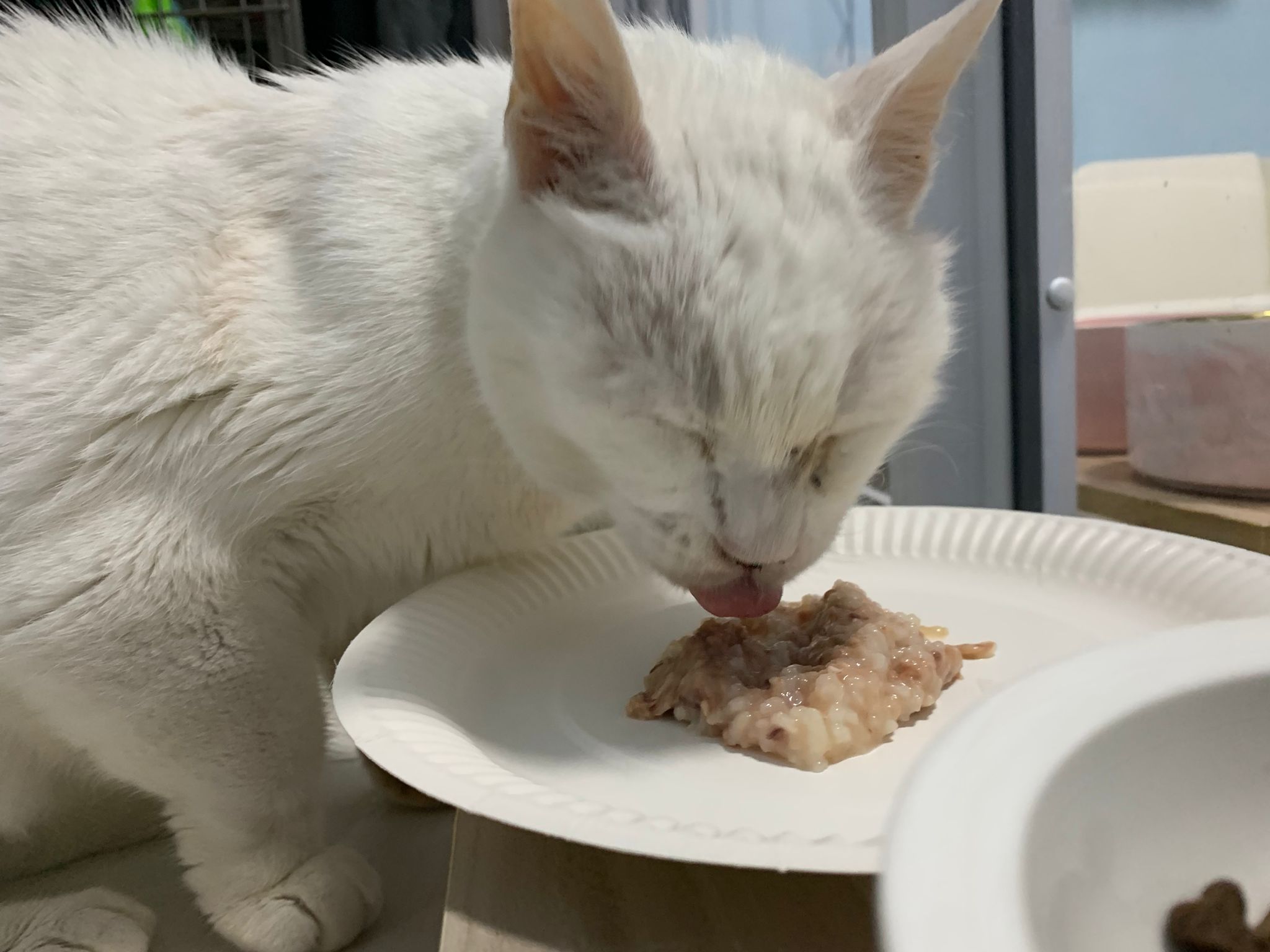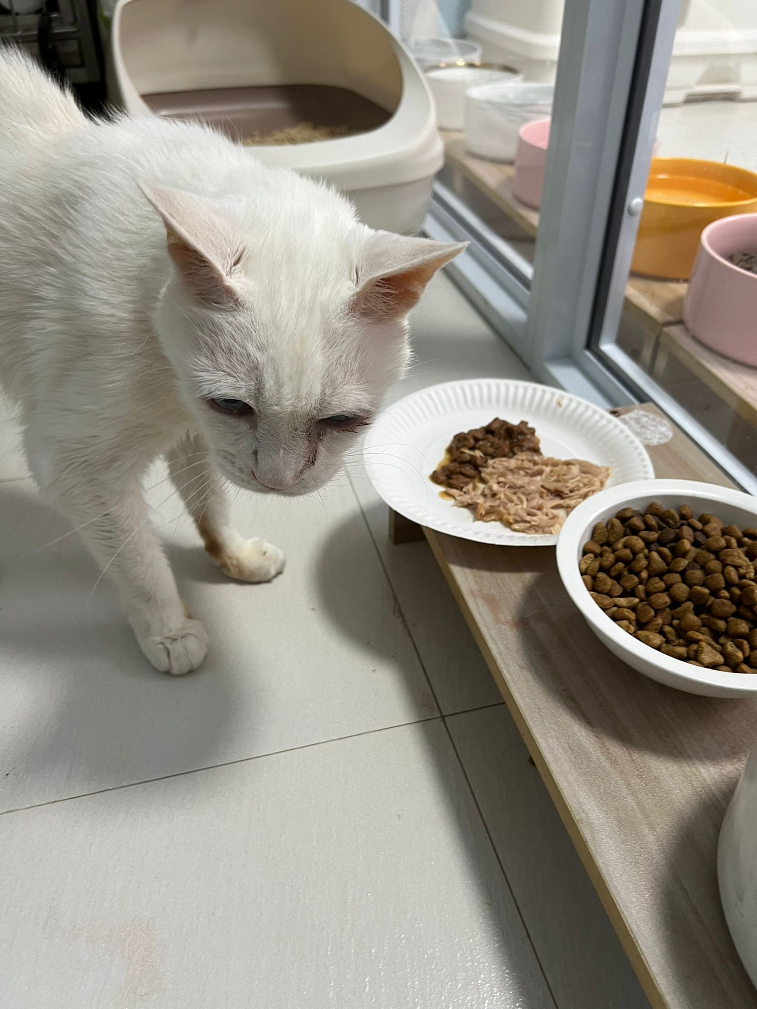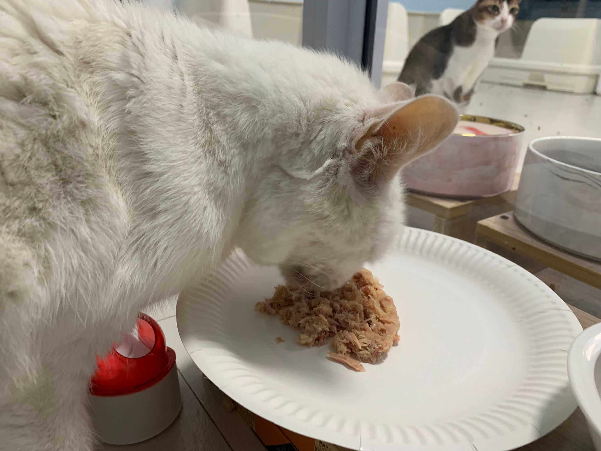 Serve another can of kakato chicken n tuna – she eat also. Totally ok w other cats. She is eating w Xiami looking at her food.