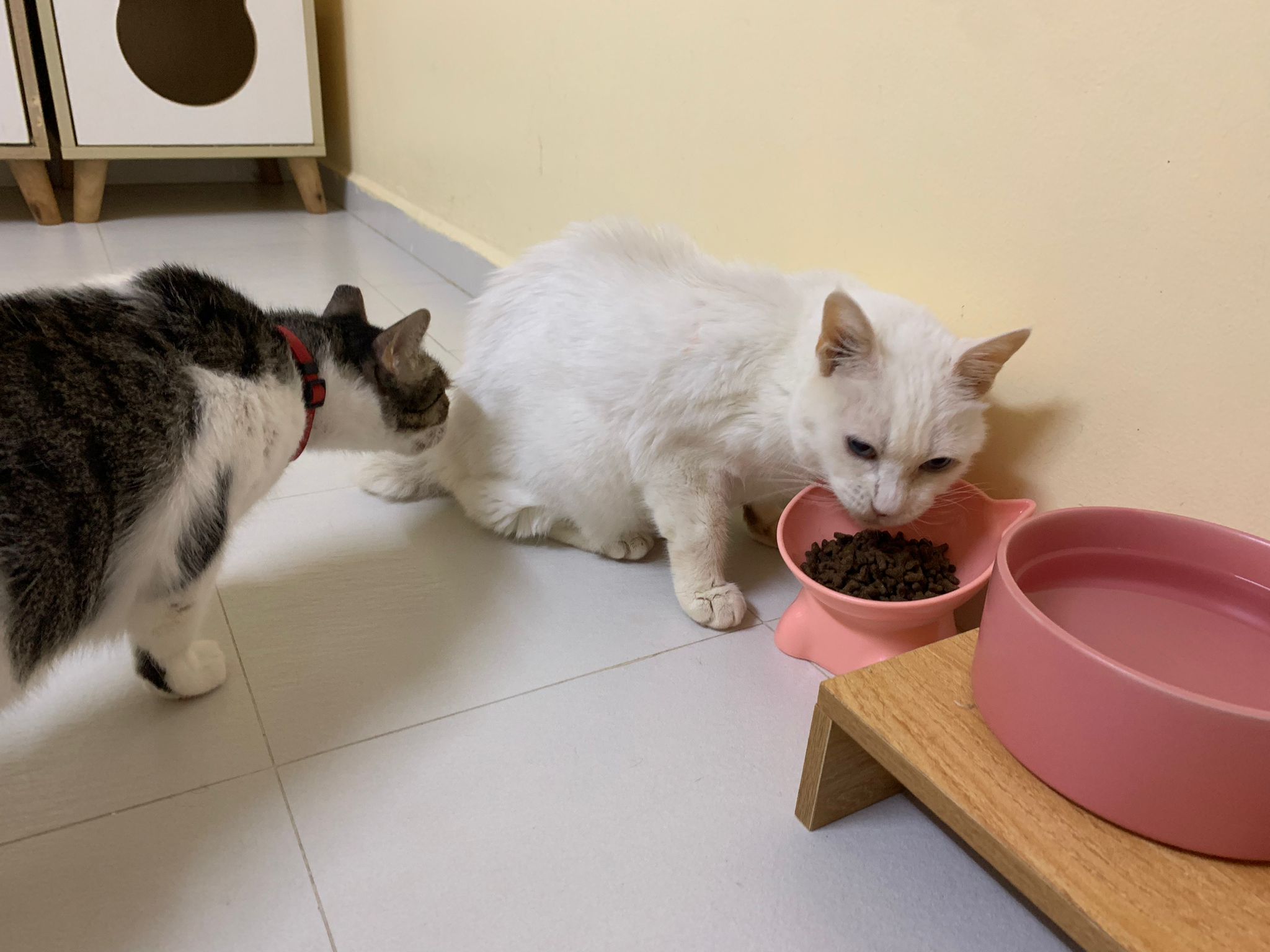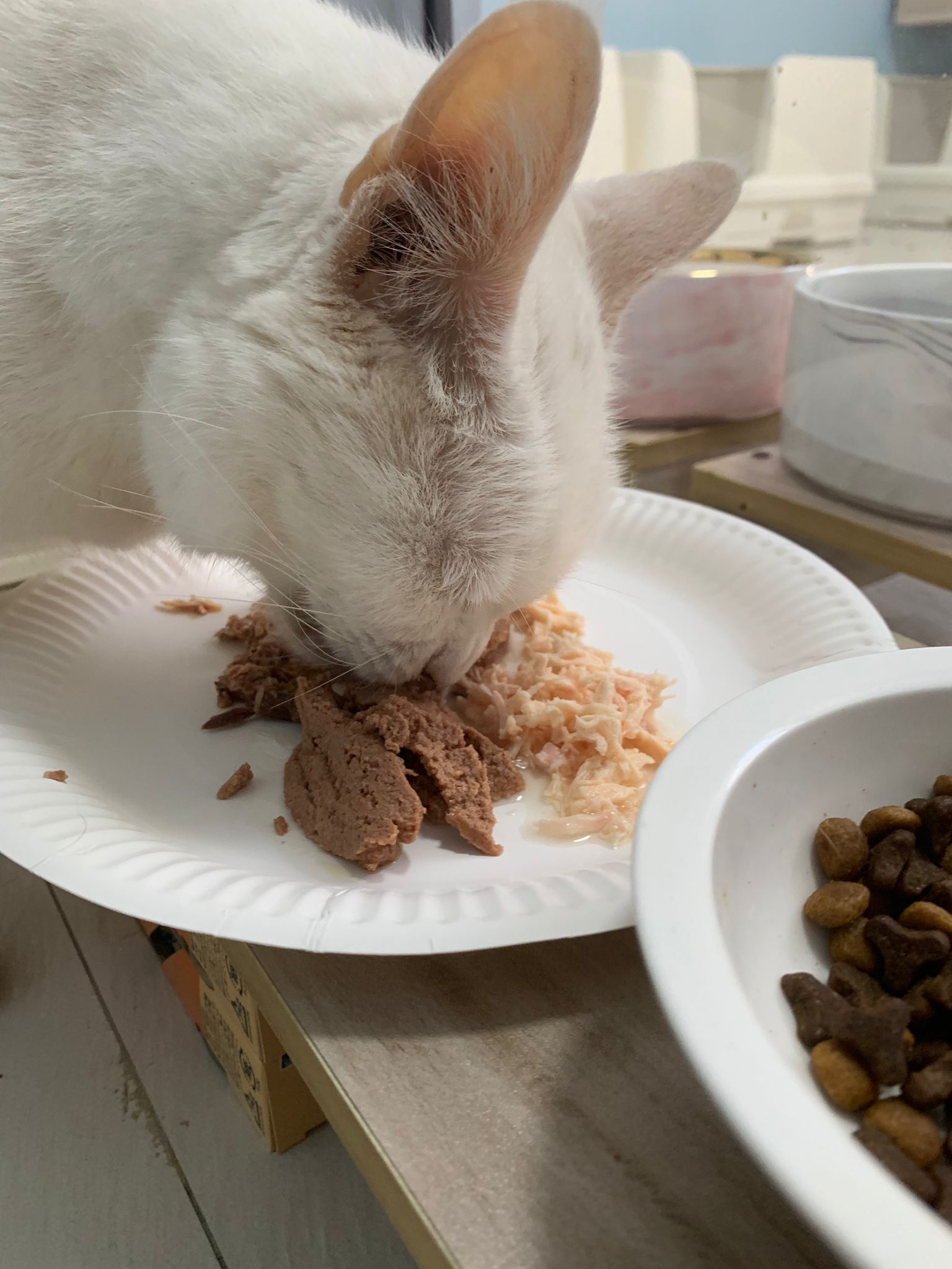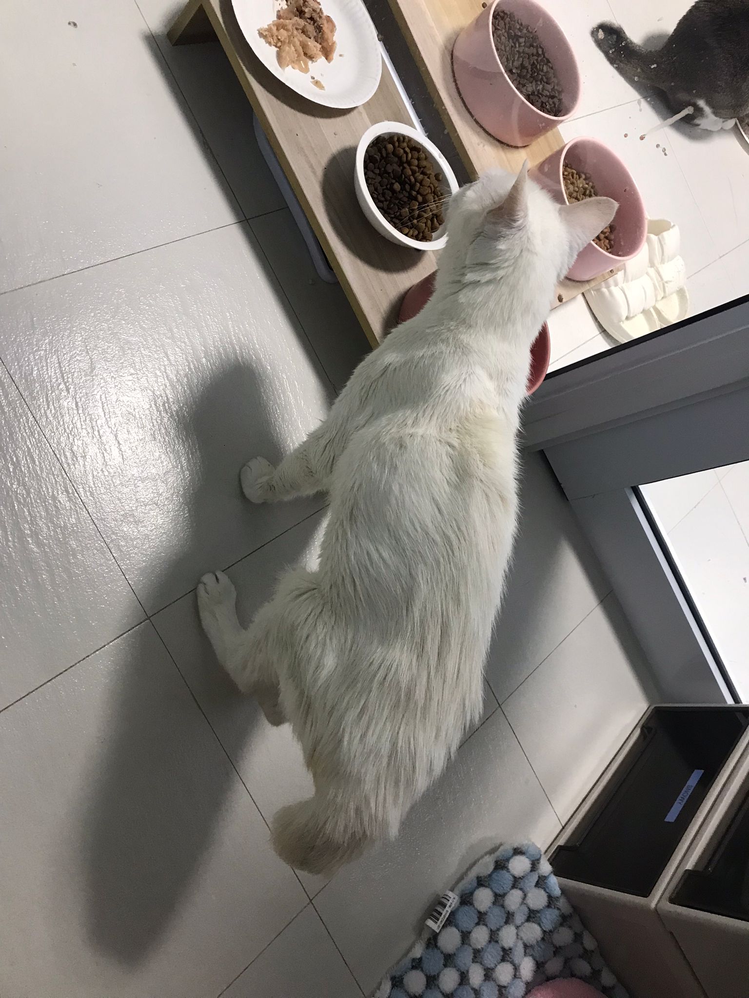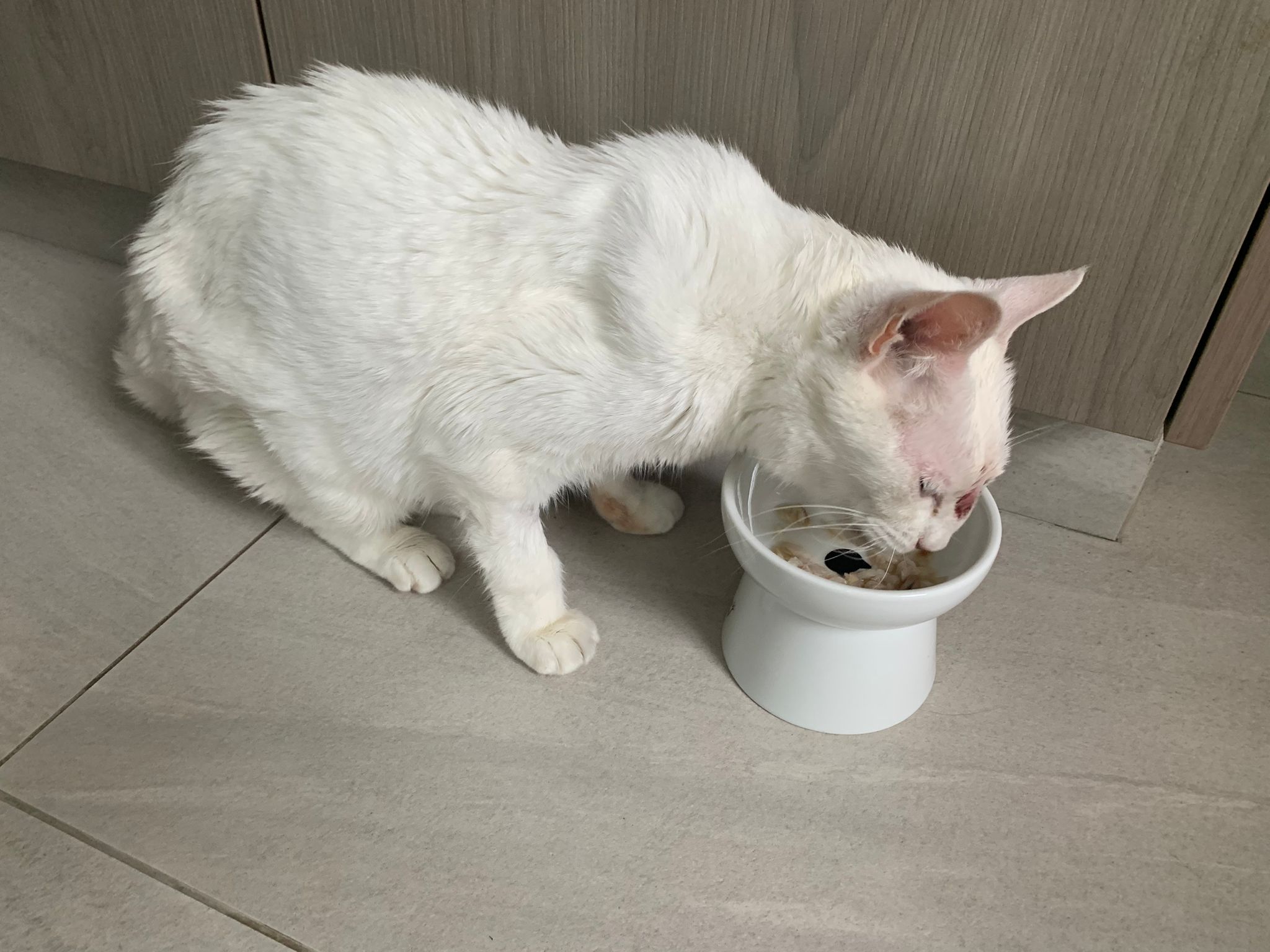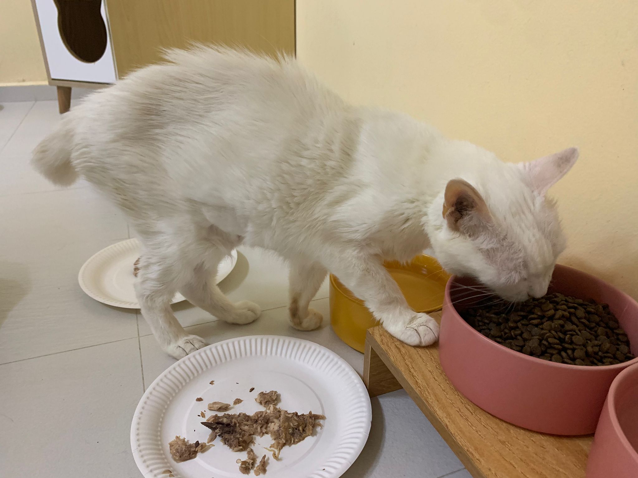 Serve another can of kakato chicken n tuna – she eat also. Totally ok w other cats. She is eating w Xiami looking at her food.