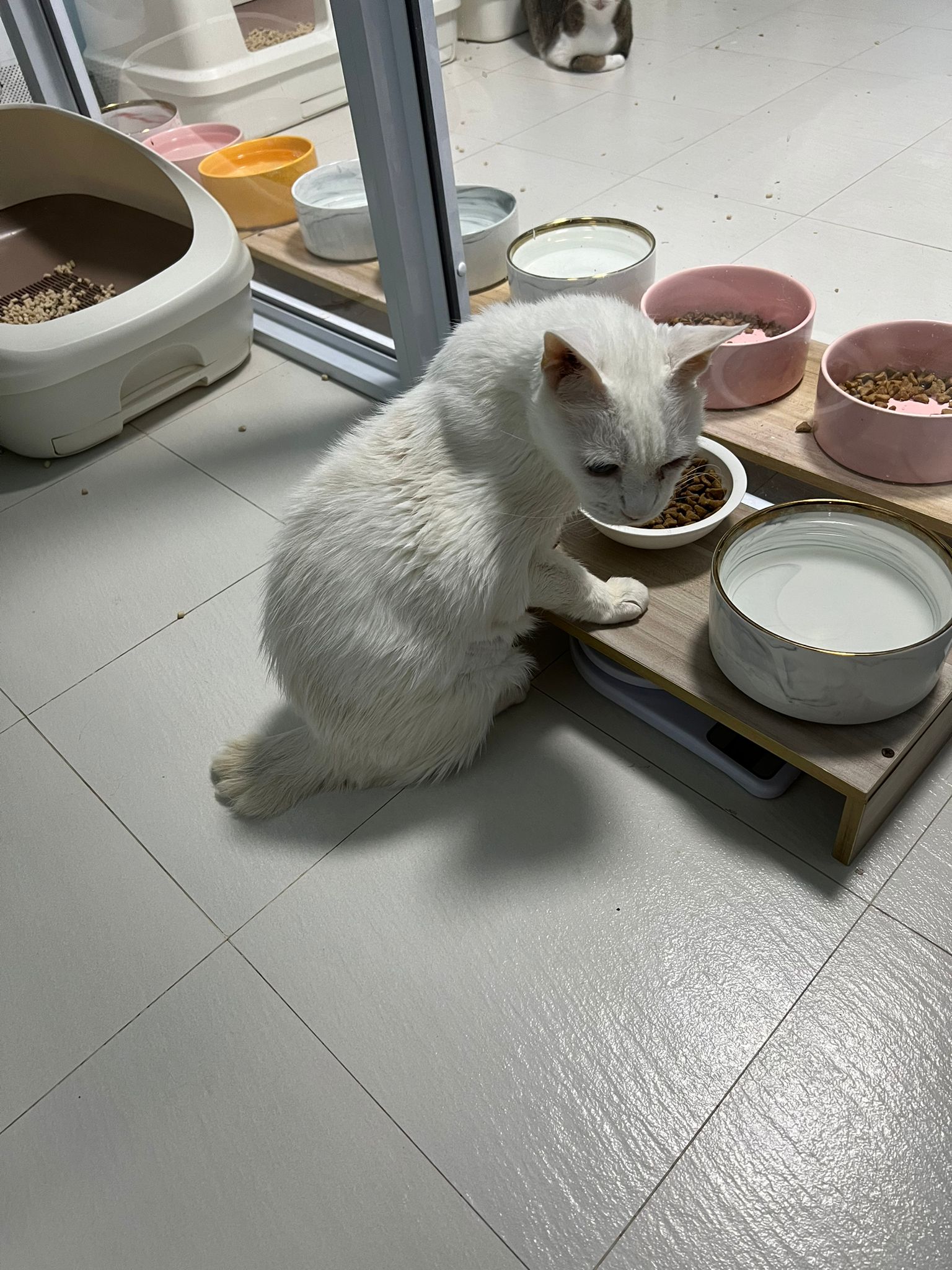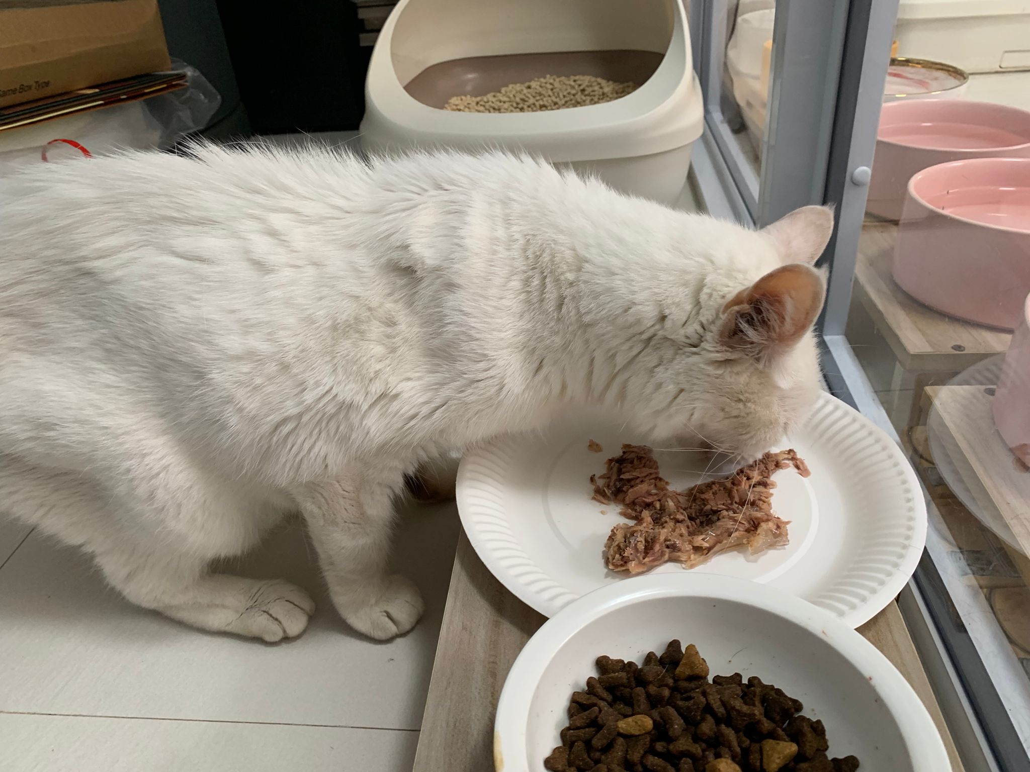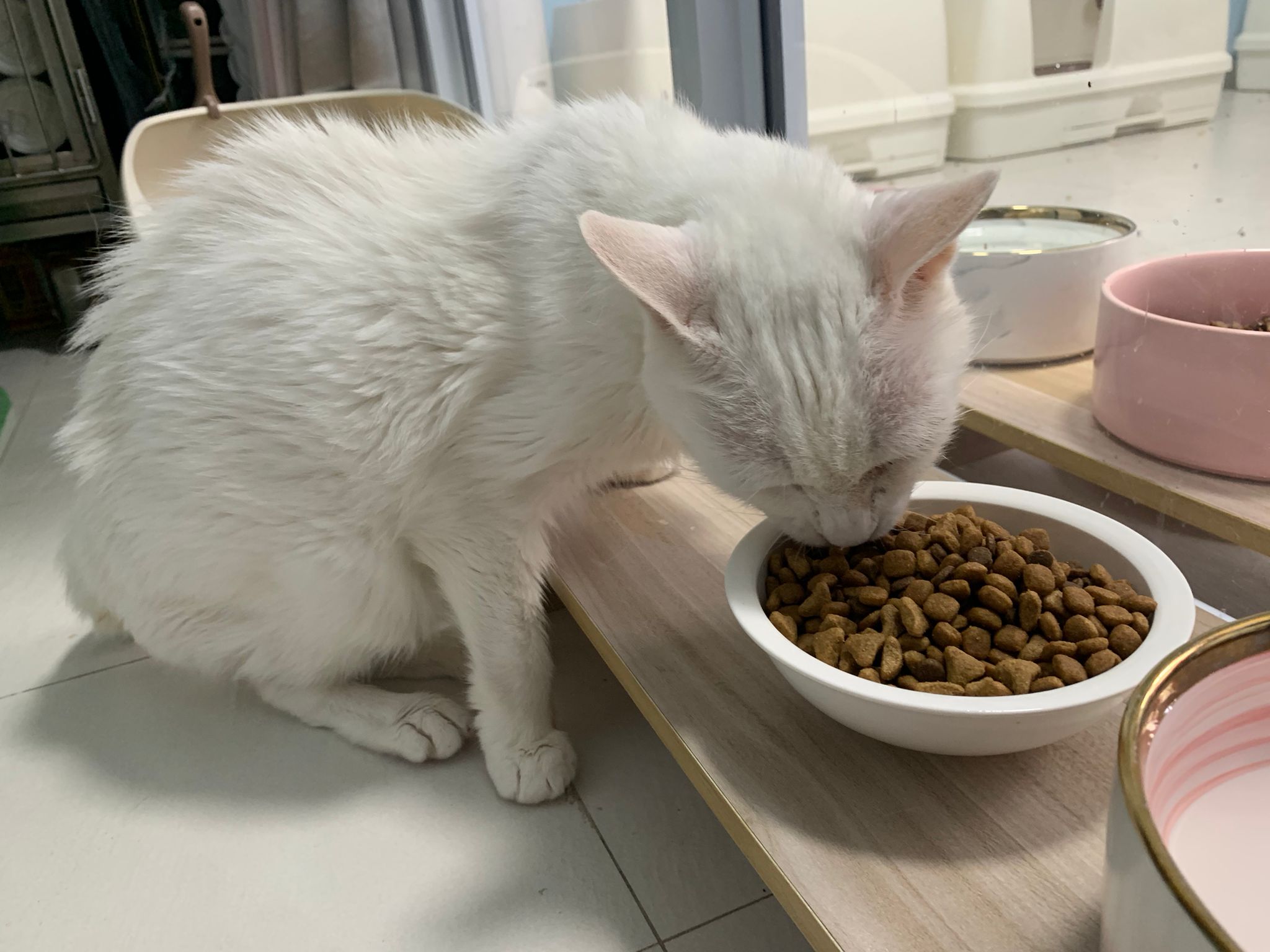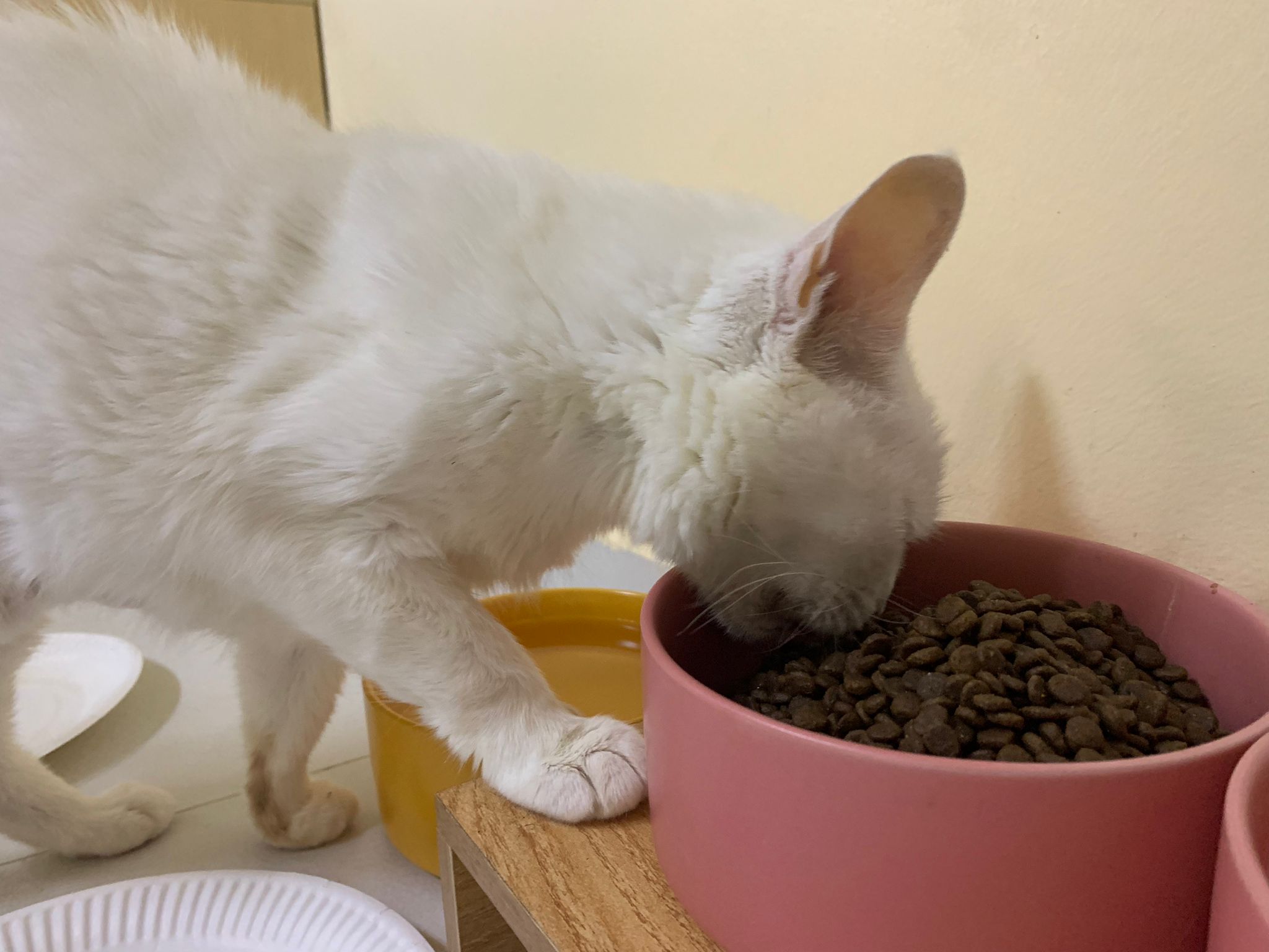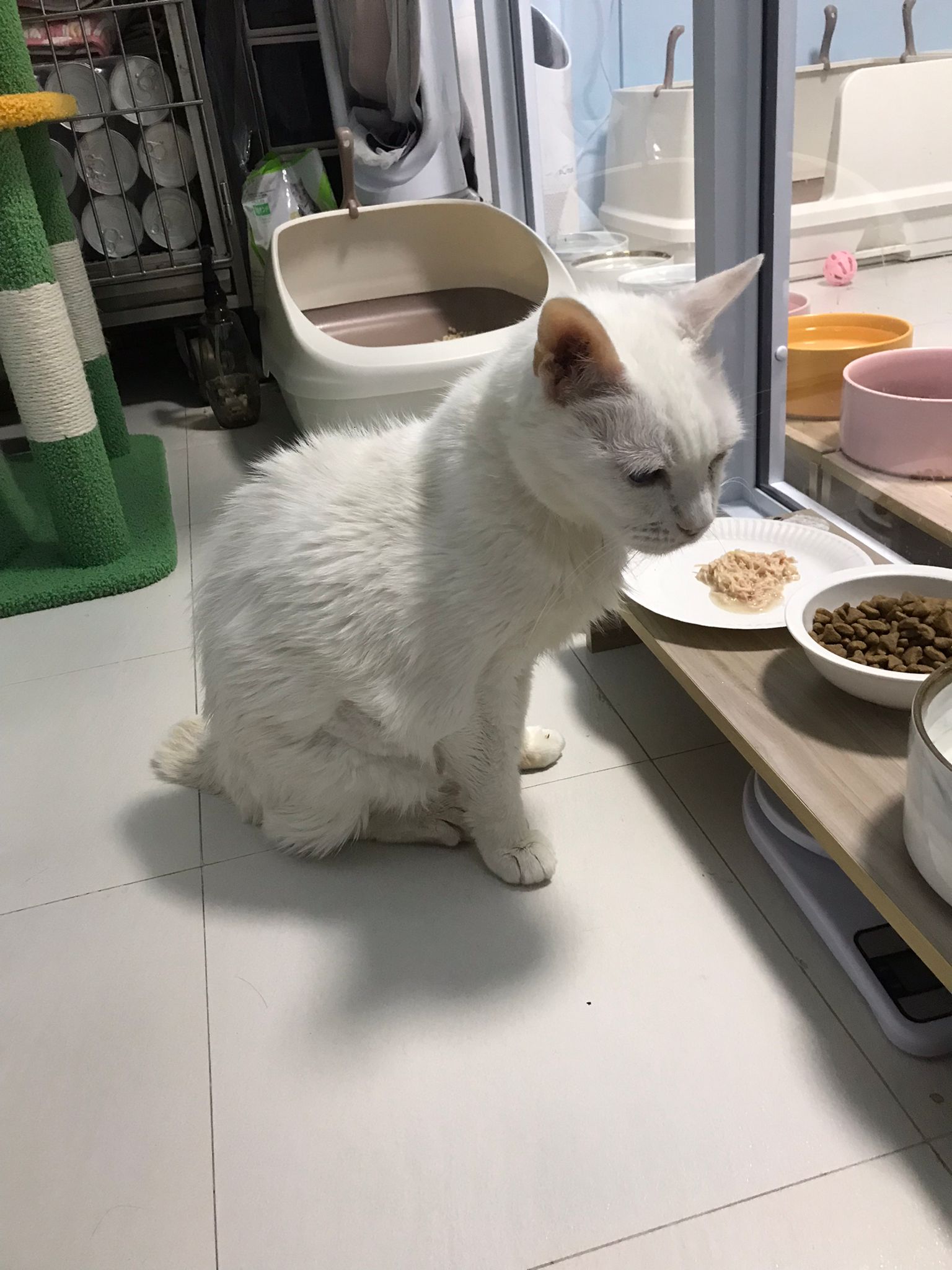 Serve another can of kakato chicken n tuna – she eat also. Totally ok w other cats. She is eating w Xiami looking at her food.