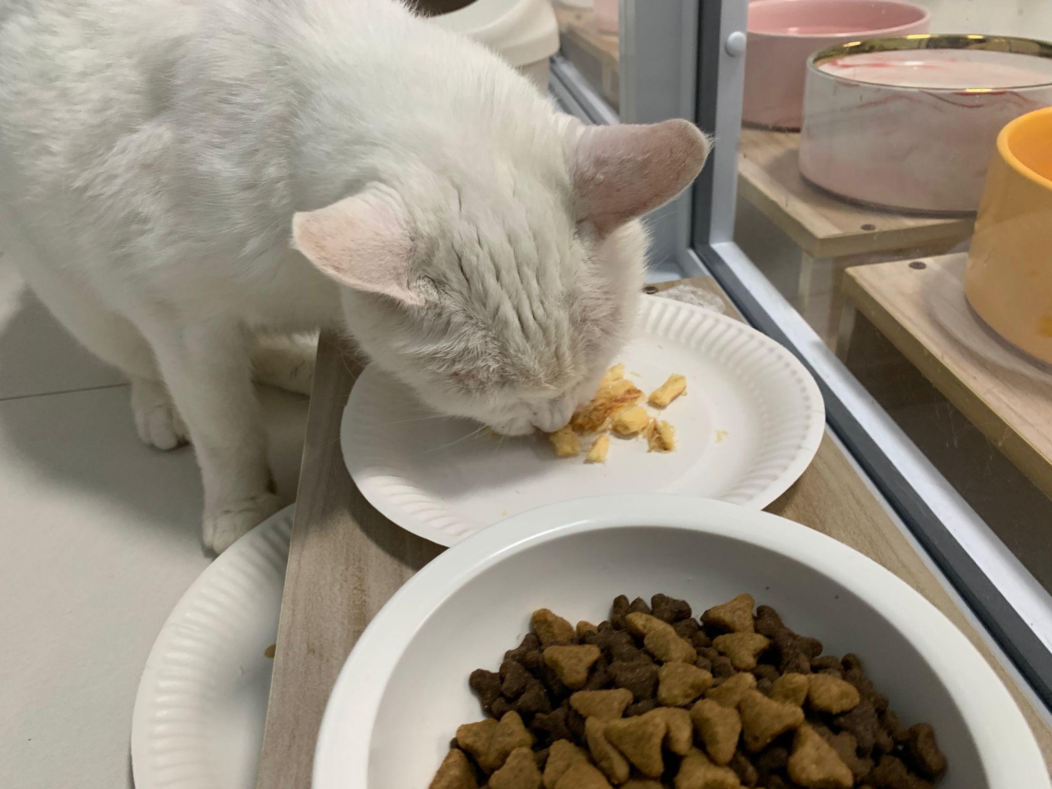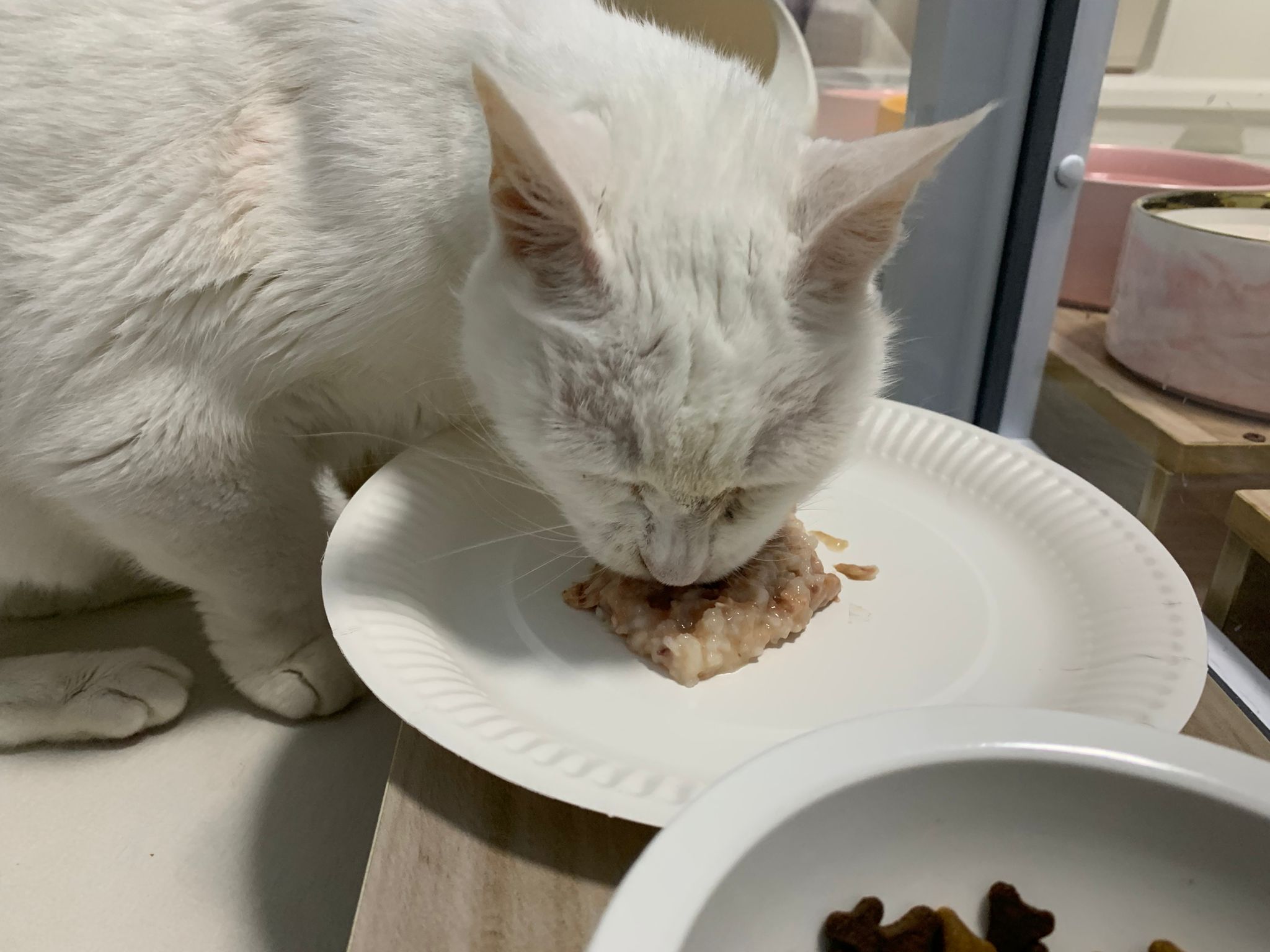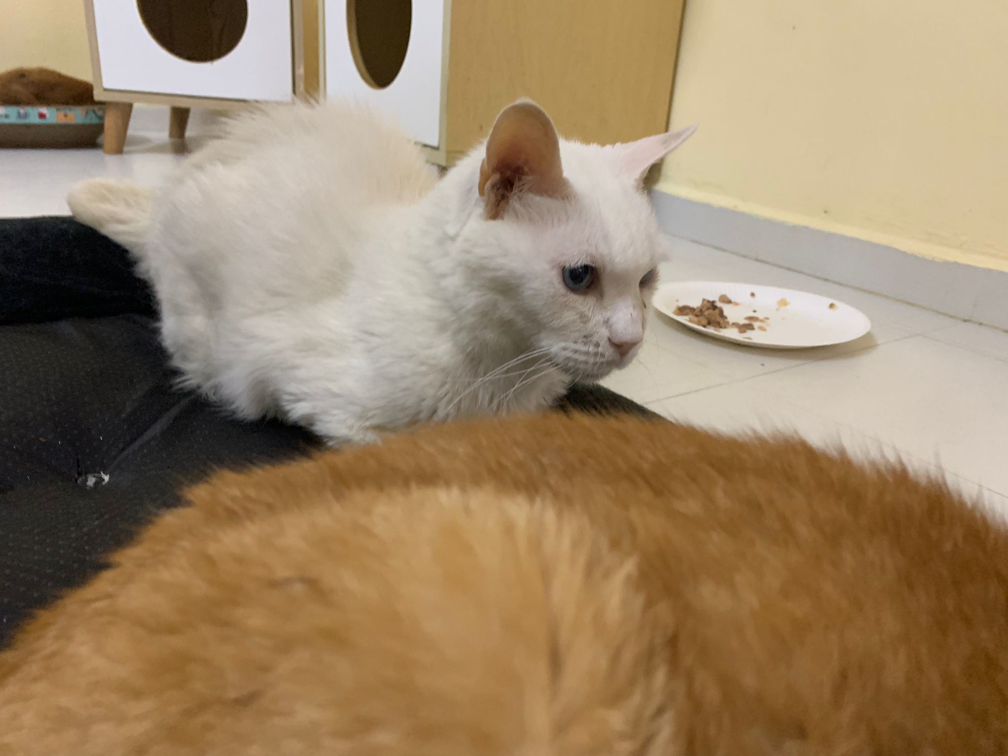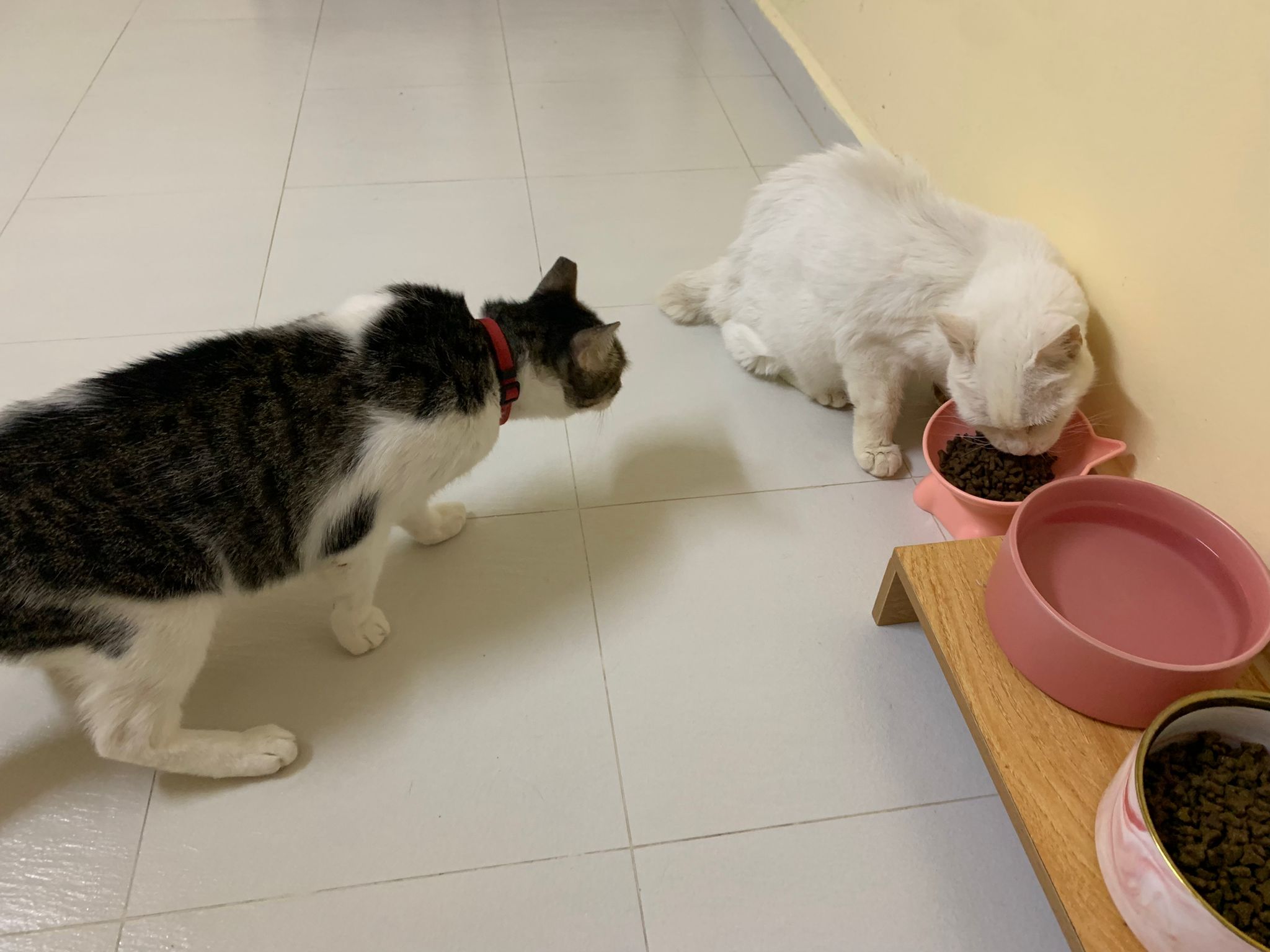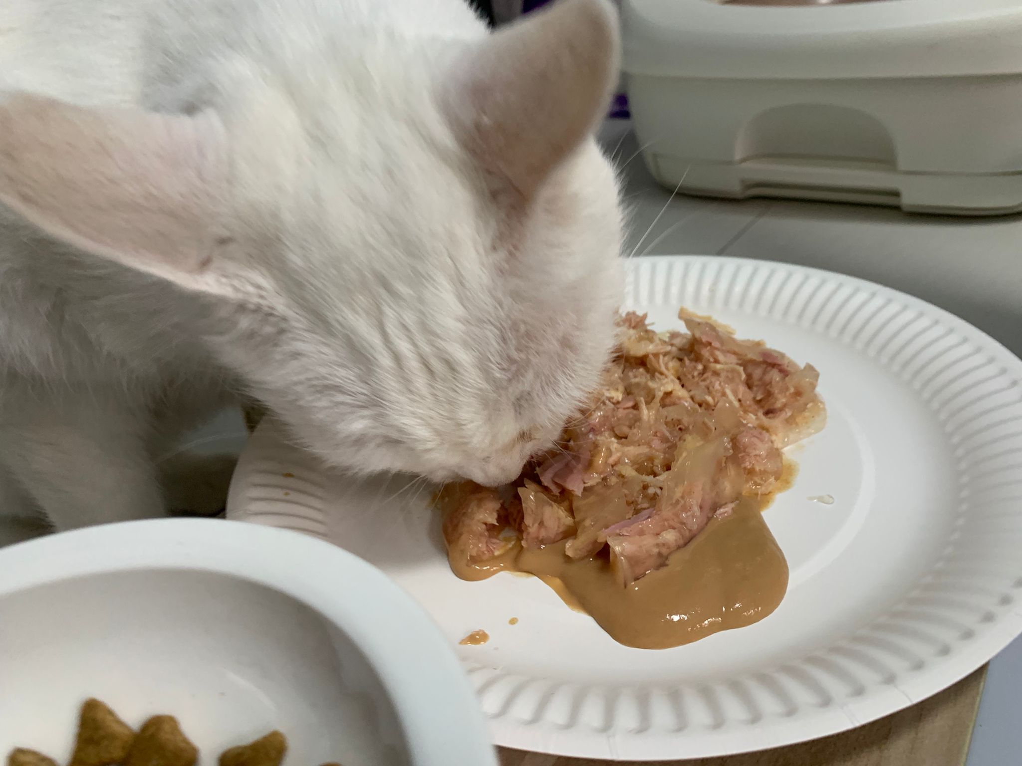 Serve another can of kakato chicken n tuna – she eat also. Totally ok w other cats. She is eating w Xiami looking at her food.