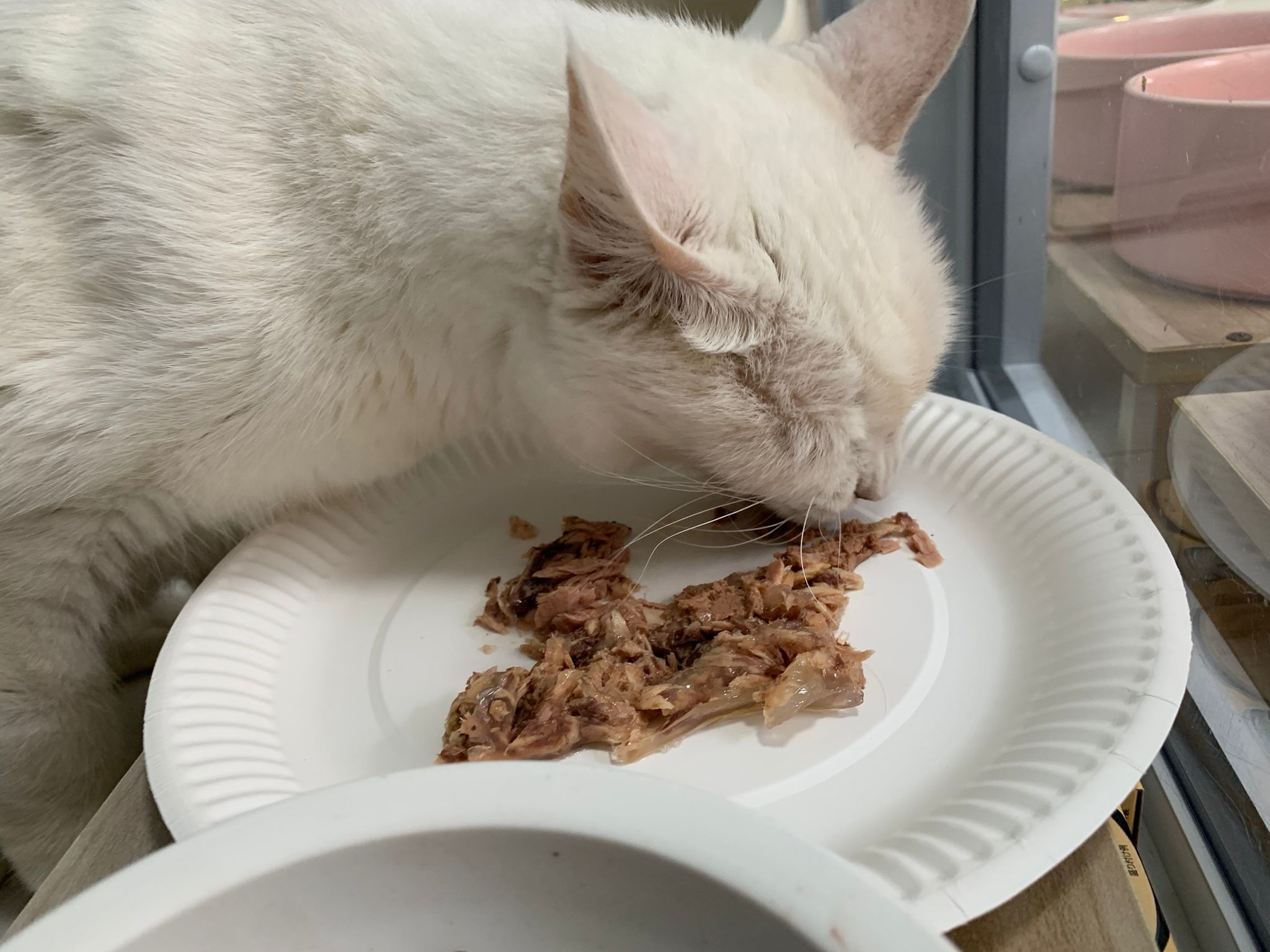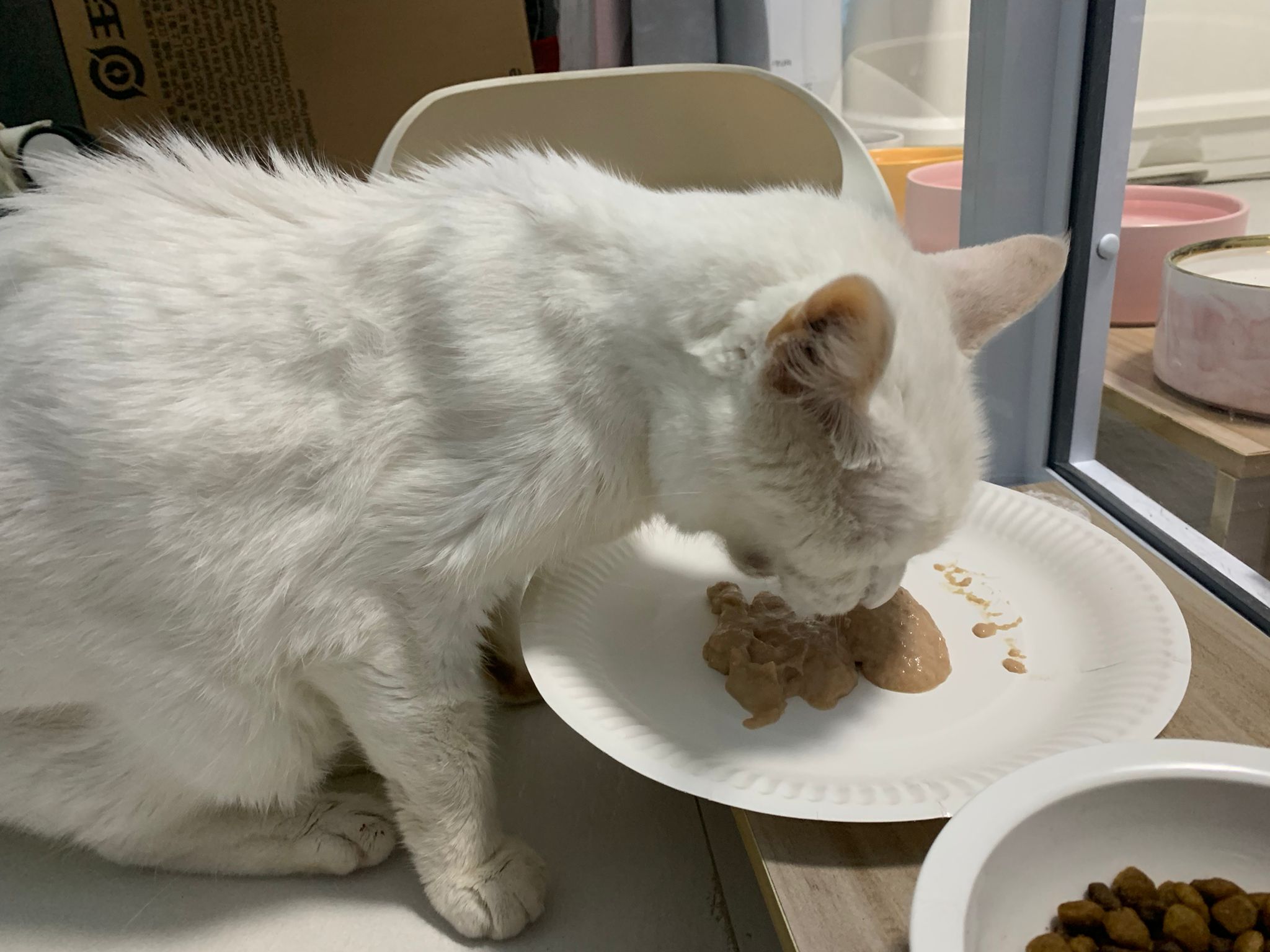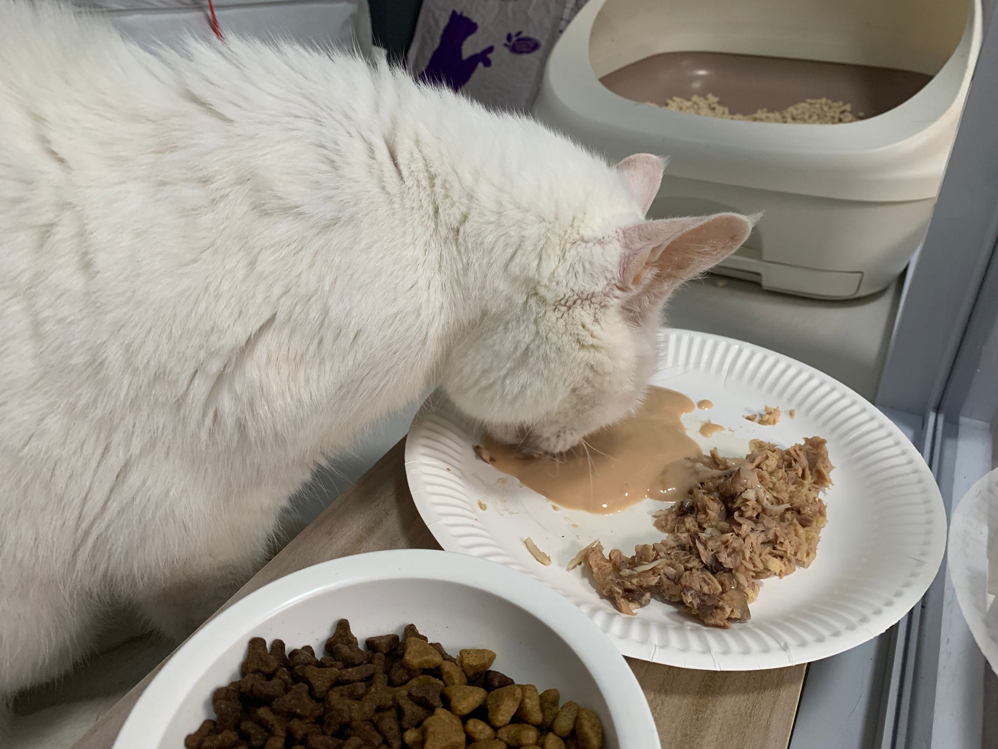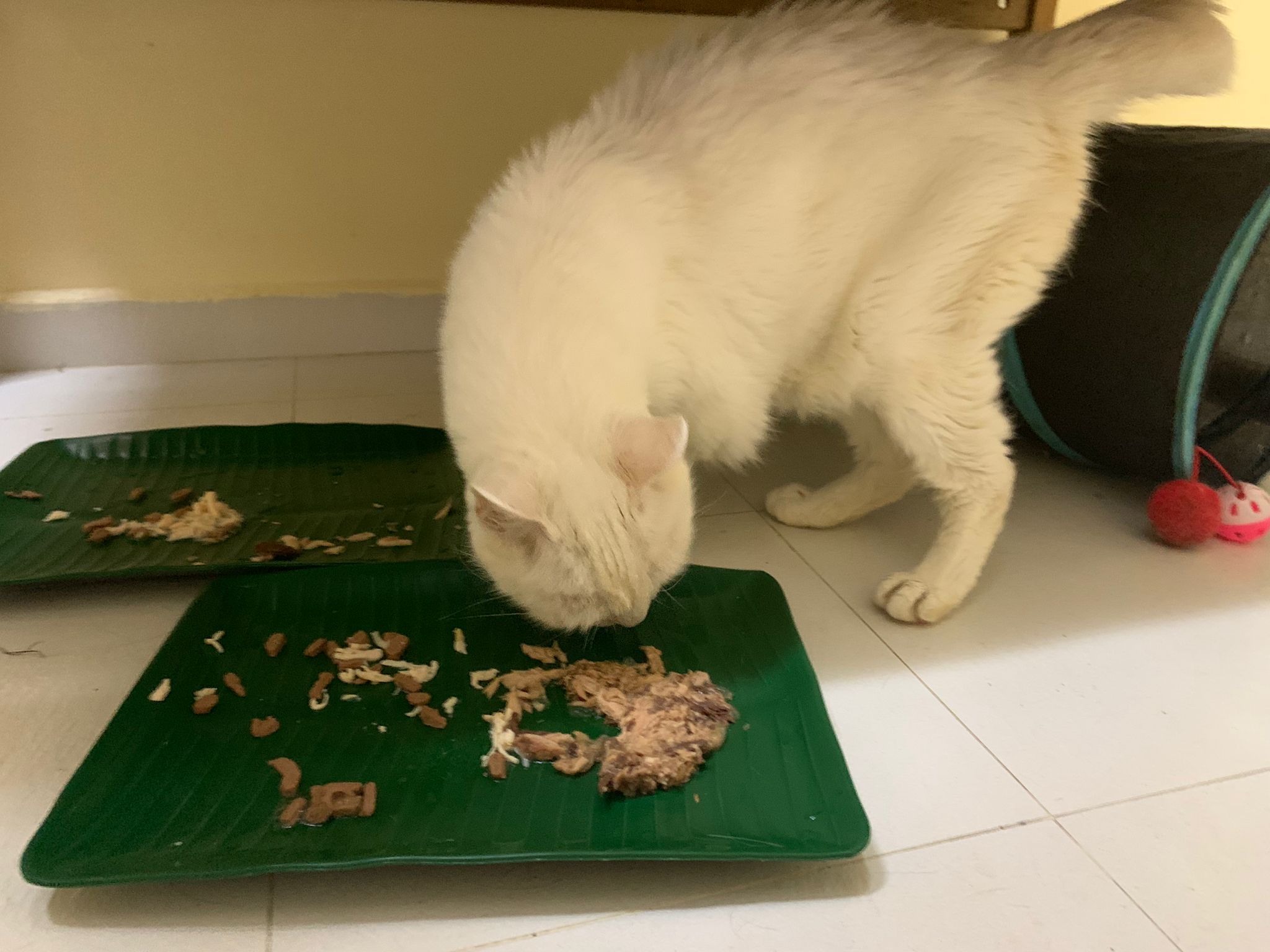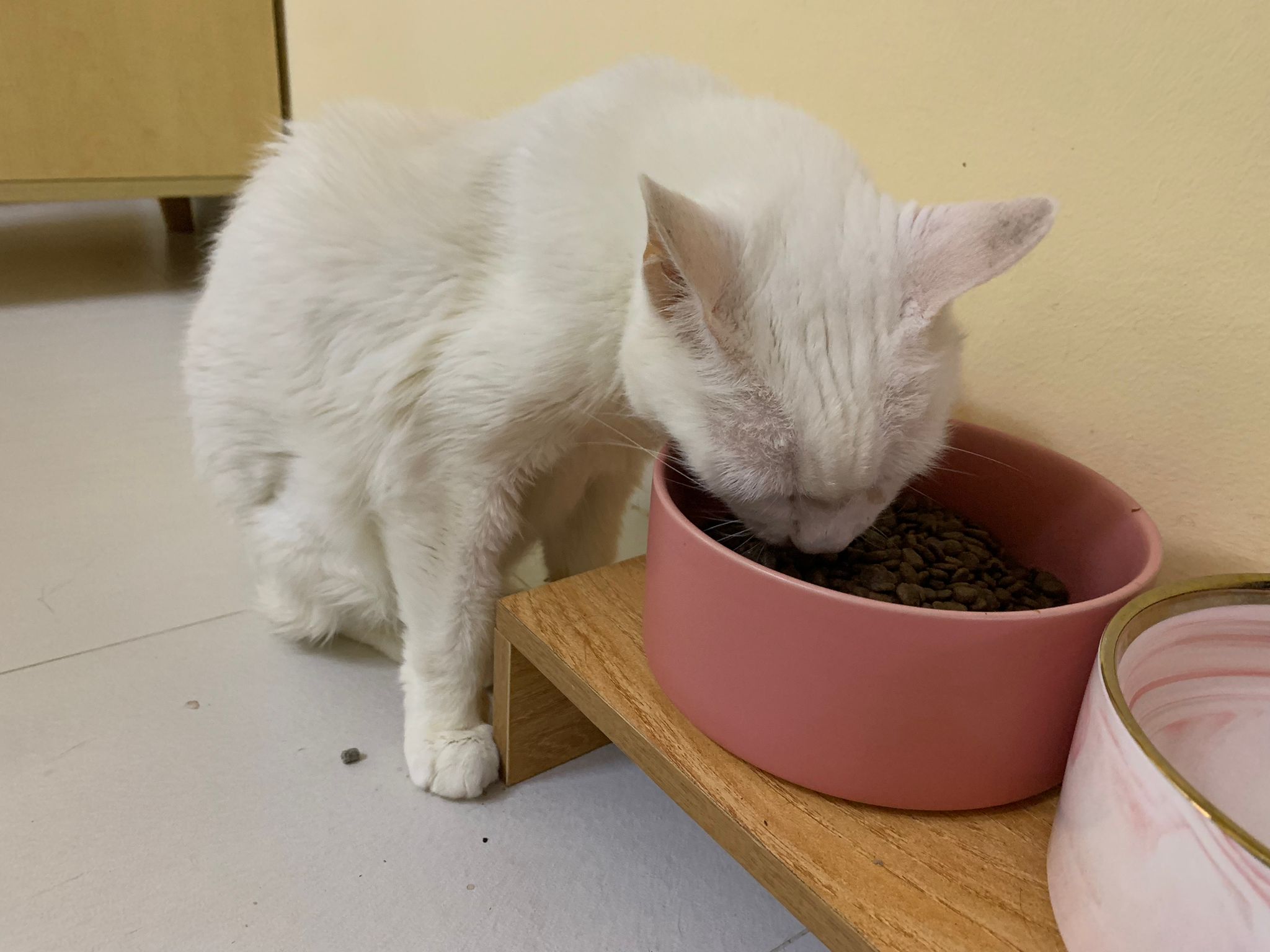 Serve another can of kakato chicken n tuna – she eat also. Totally ok w other cats. She is eating w Xiami looking at her food.