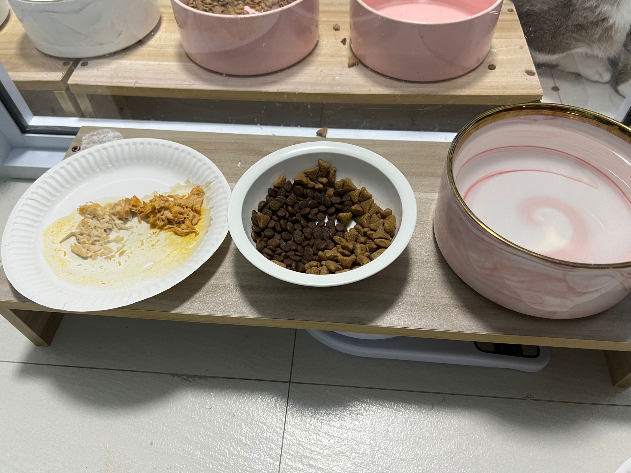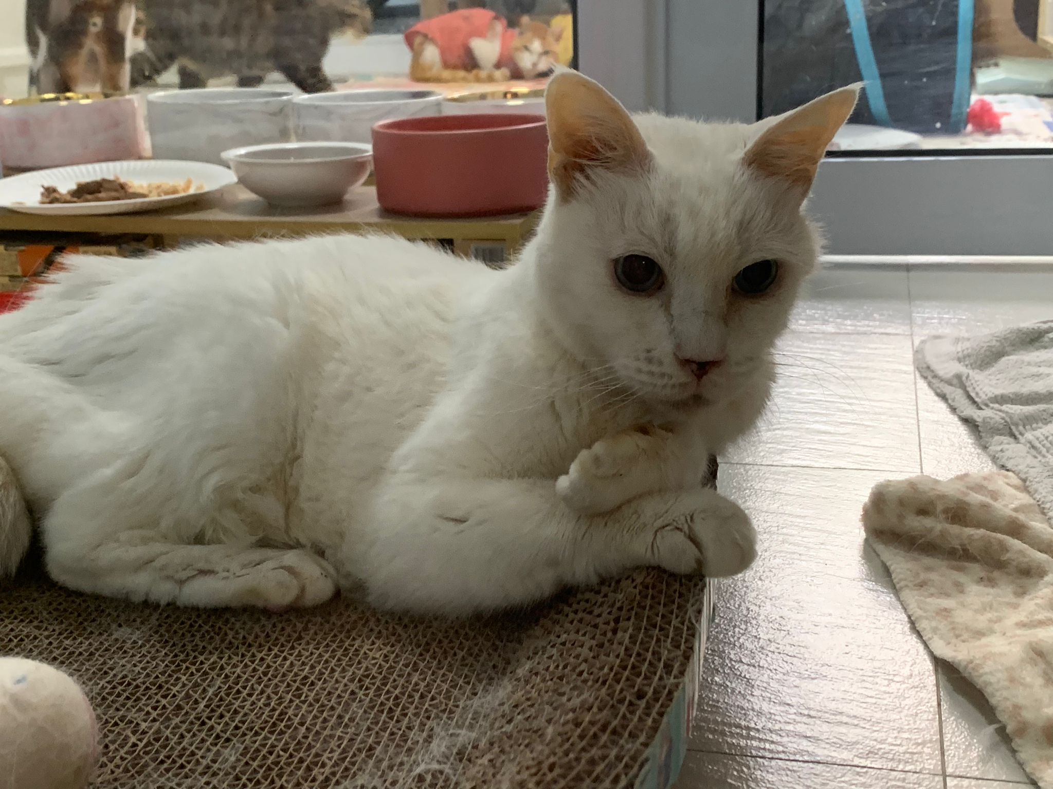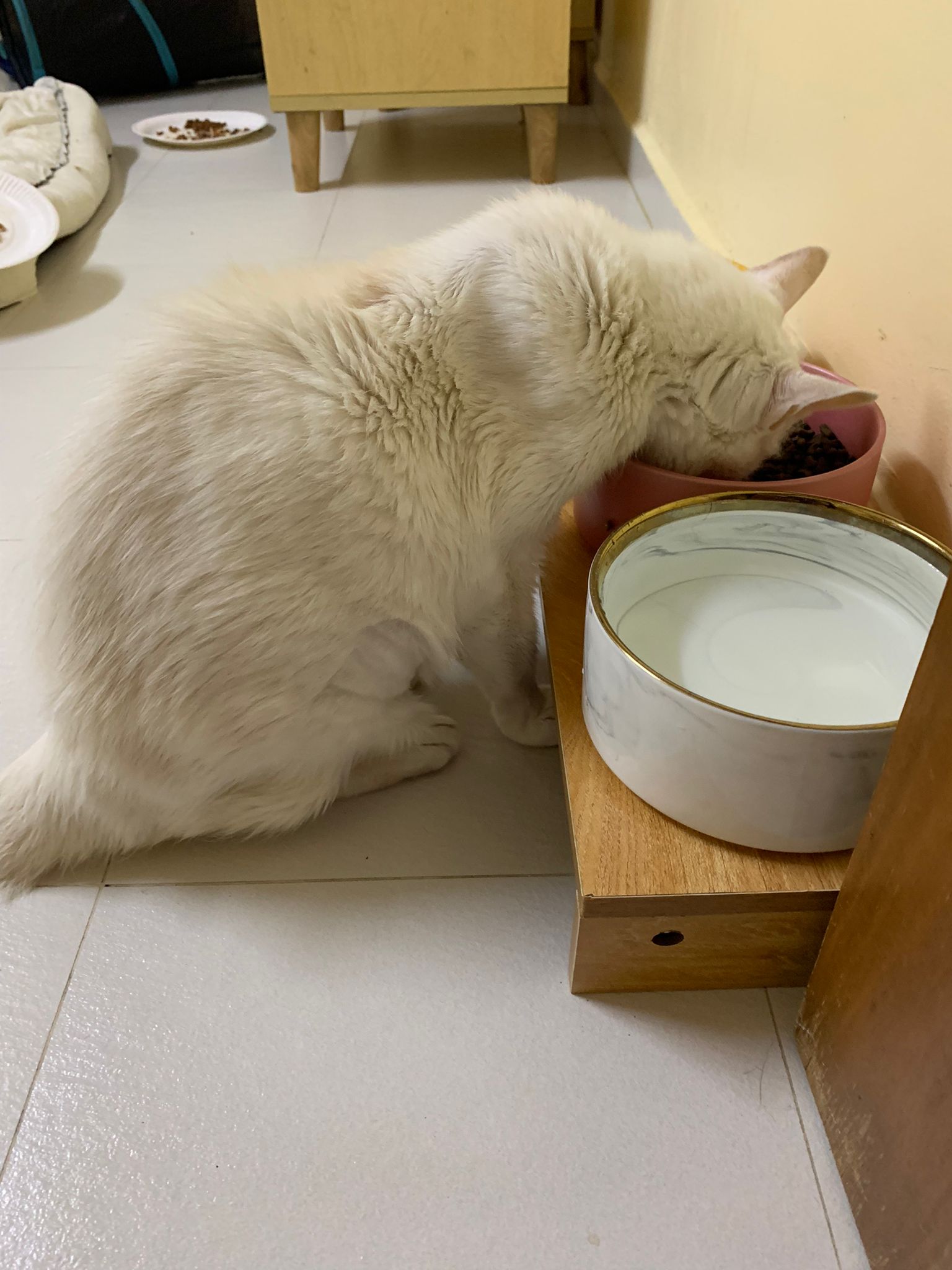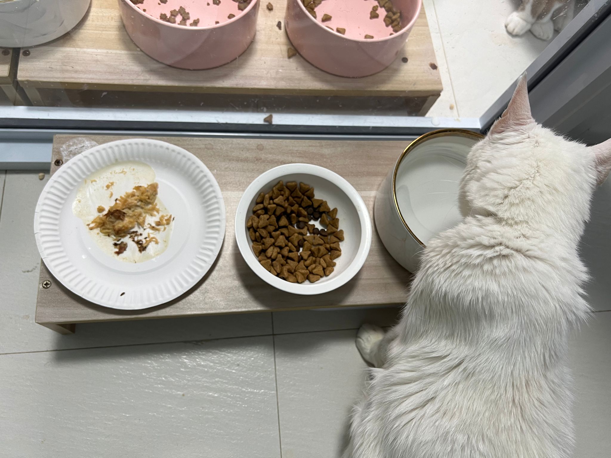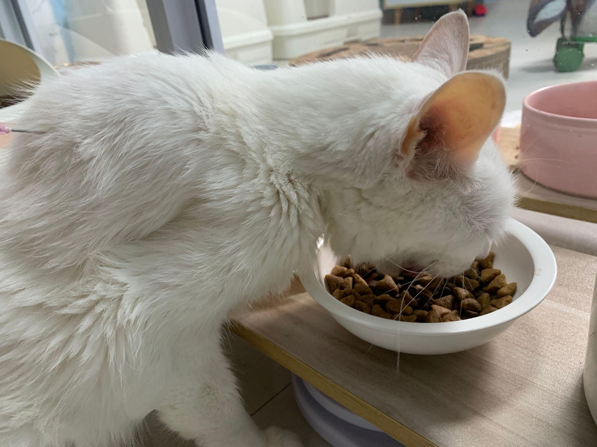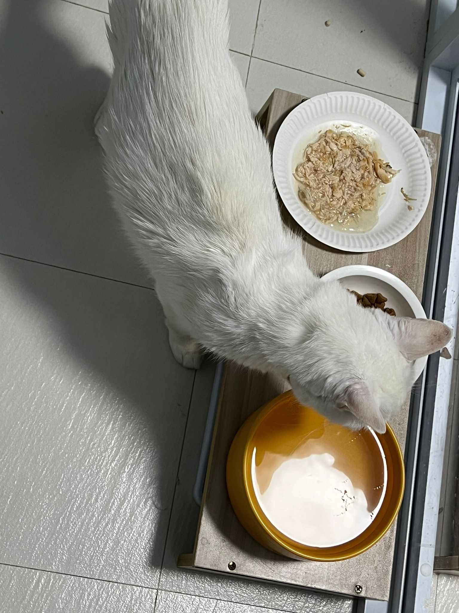 Serve another can of kakato chicken n tuna – she eat also. Totally ok w other cats. She is eating w Xiami looking at her food.