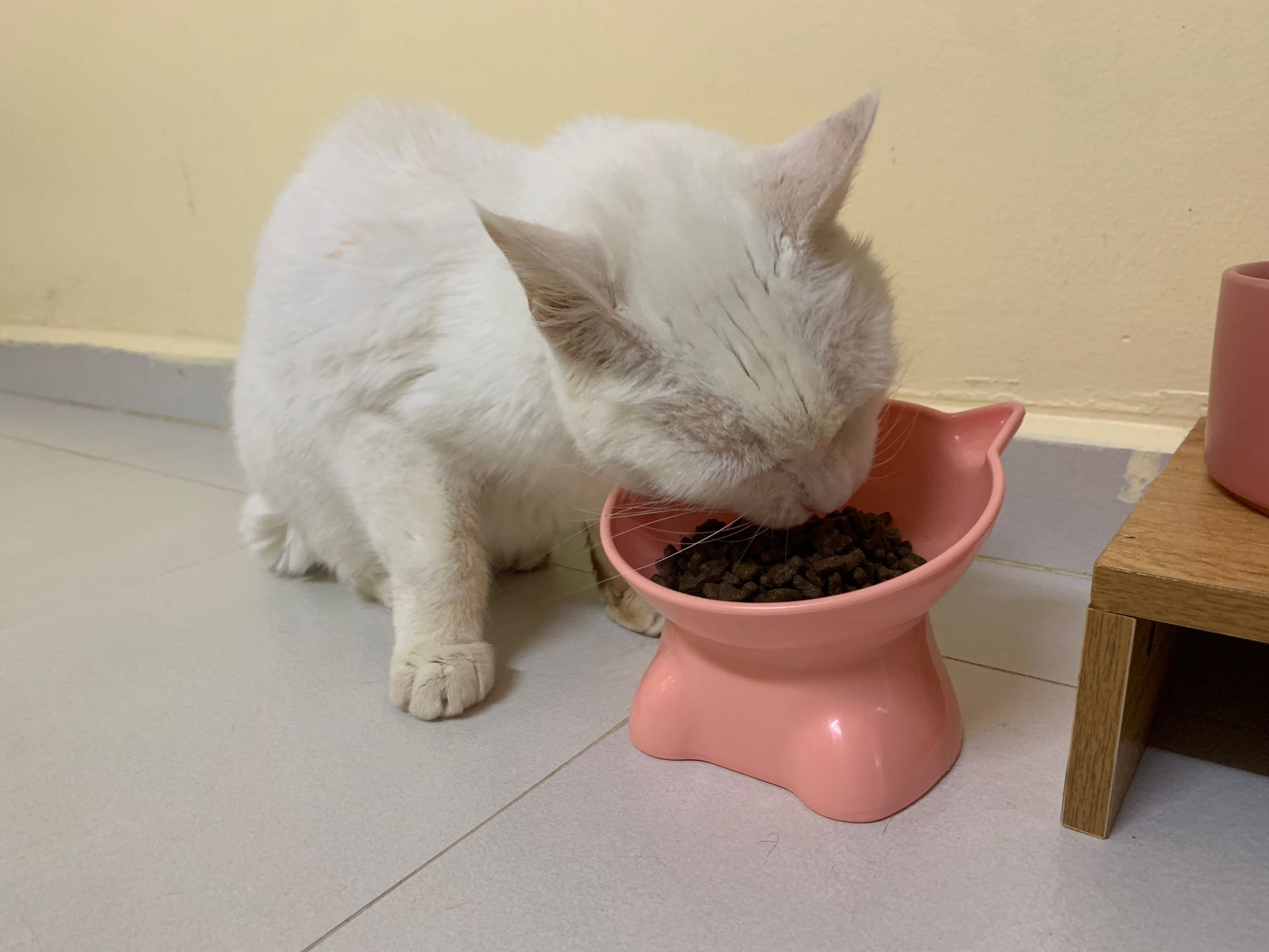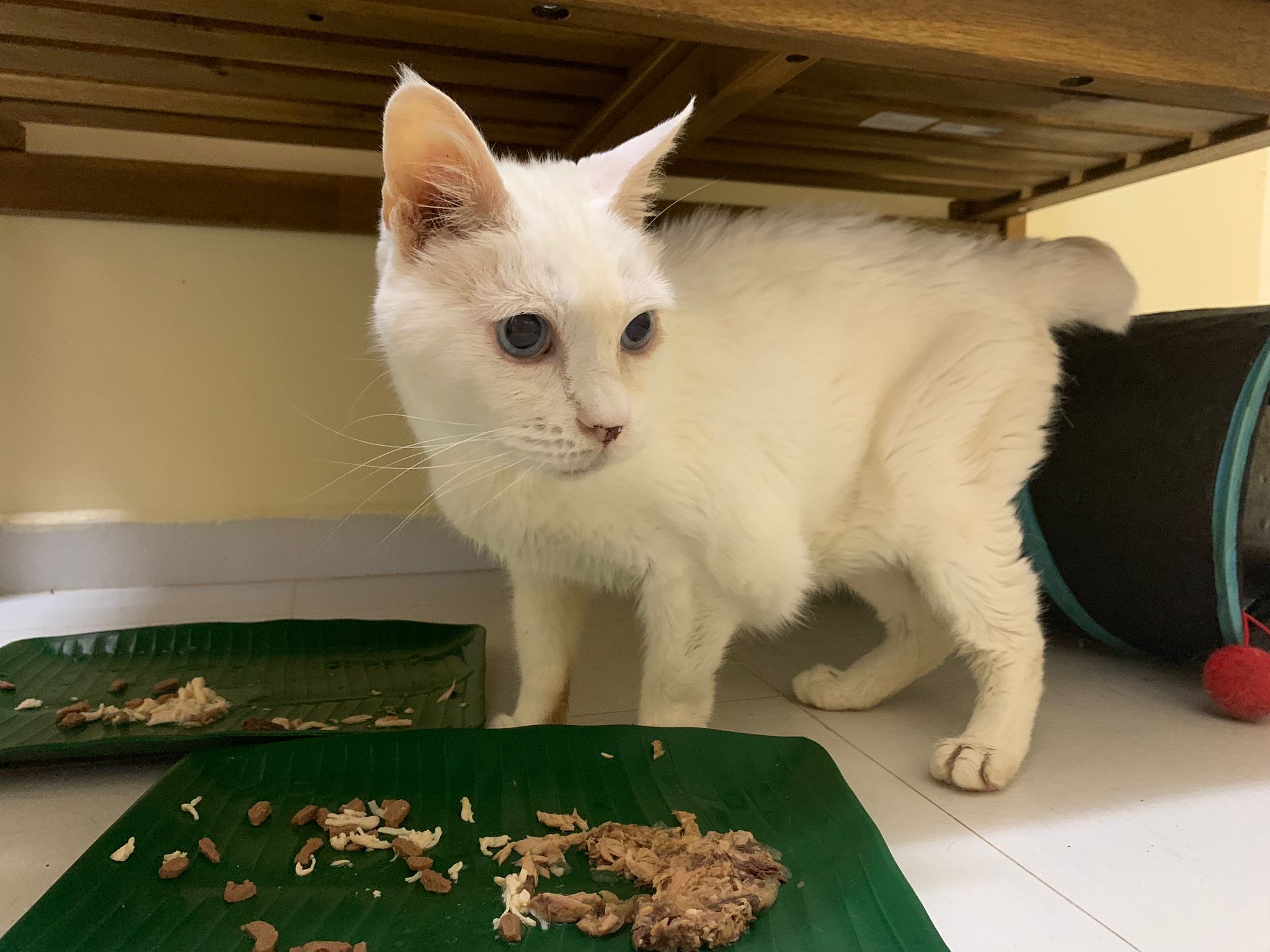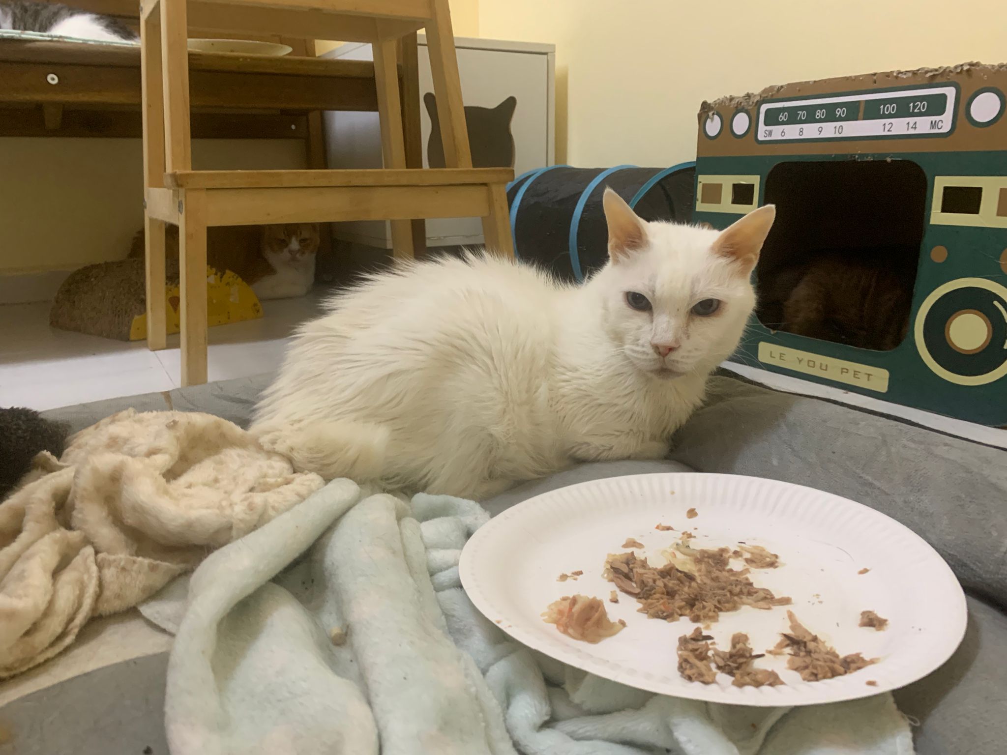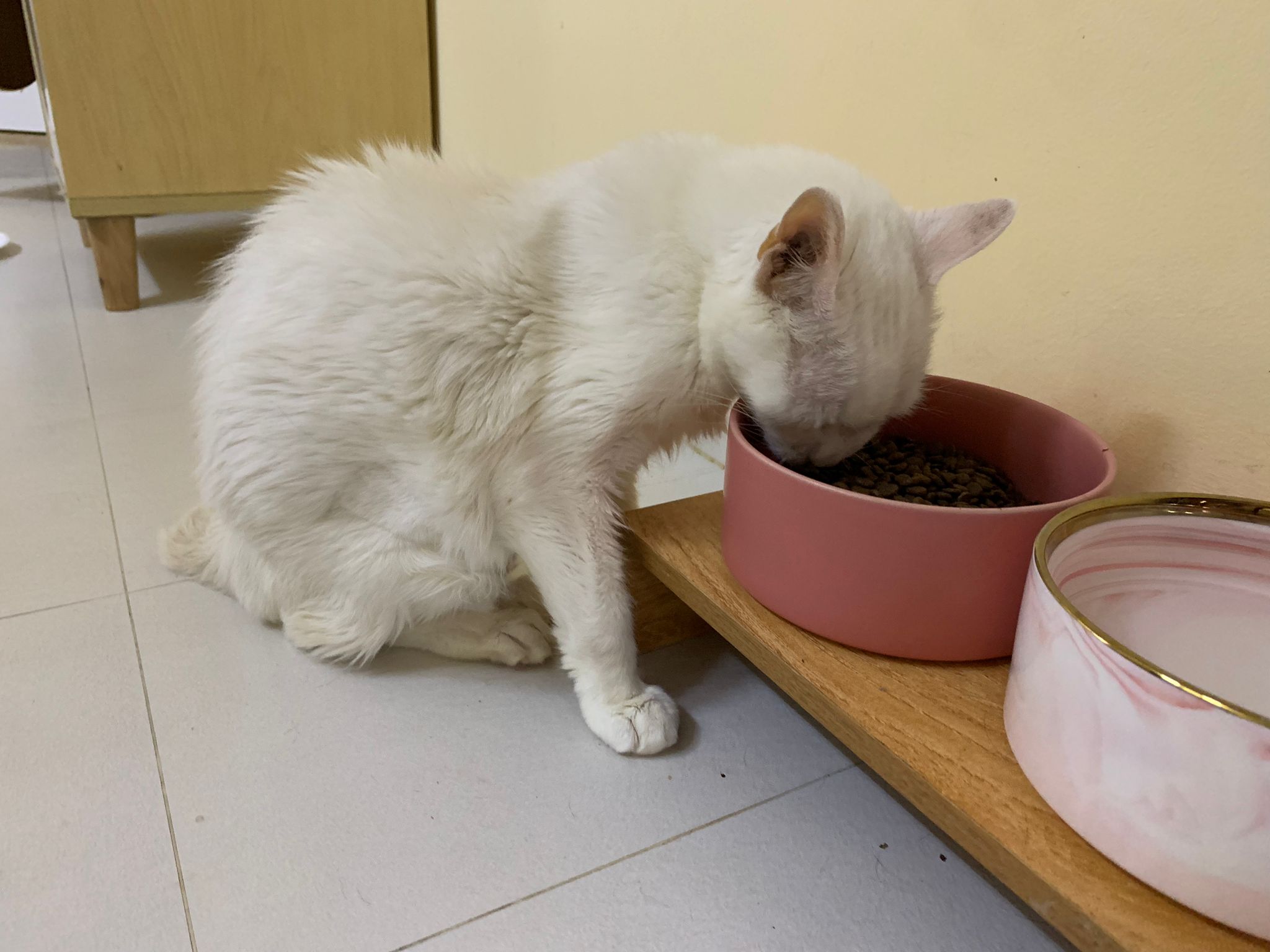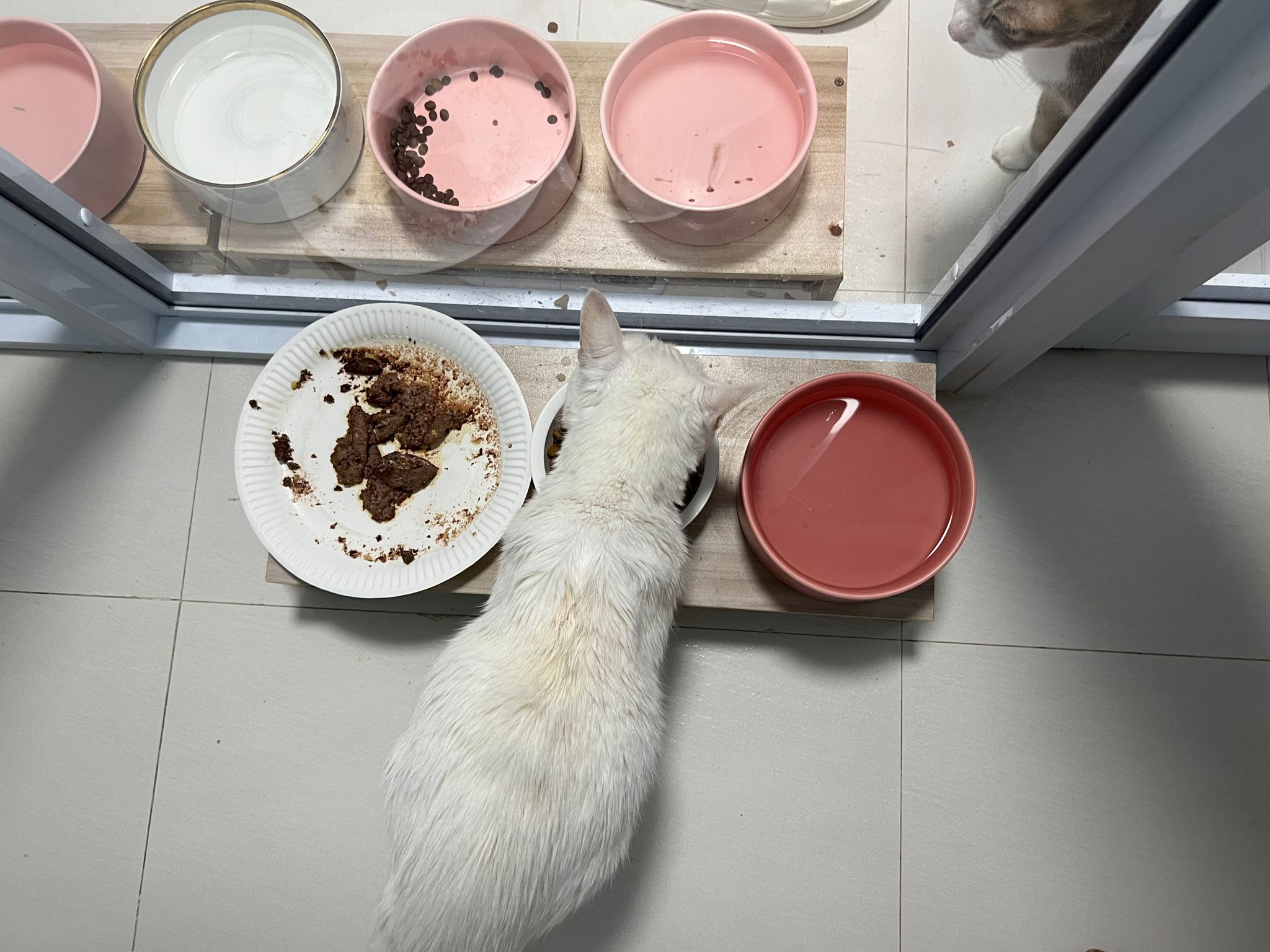 Serve another can of kakato chicken n tuna – she eat also. Totally ok w other cats. She is eating w Xiami looking at her food.