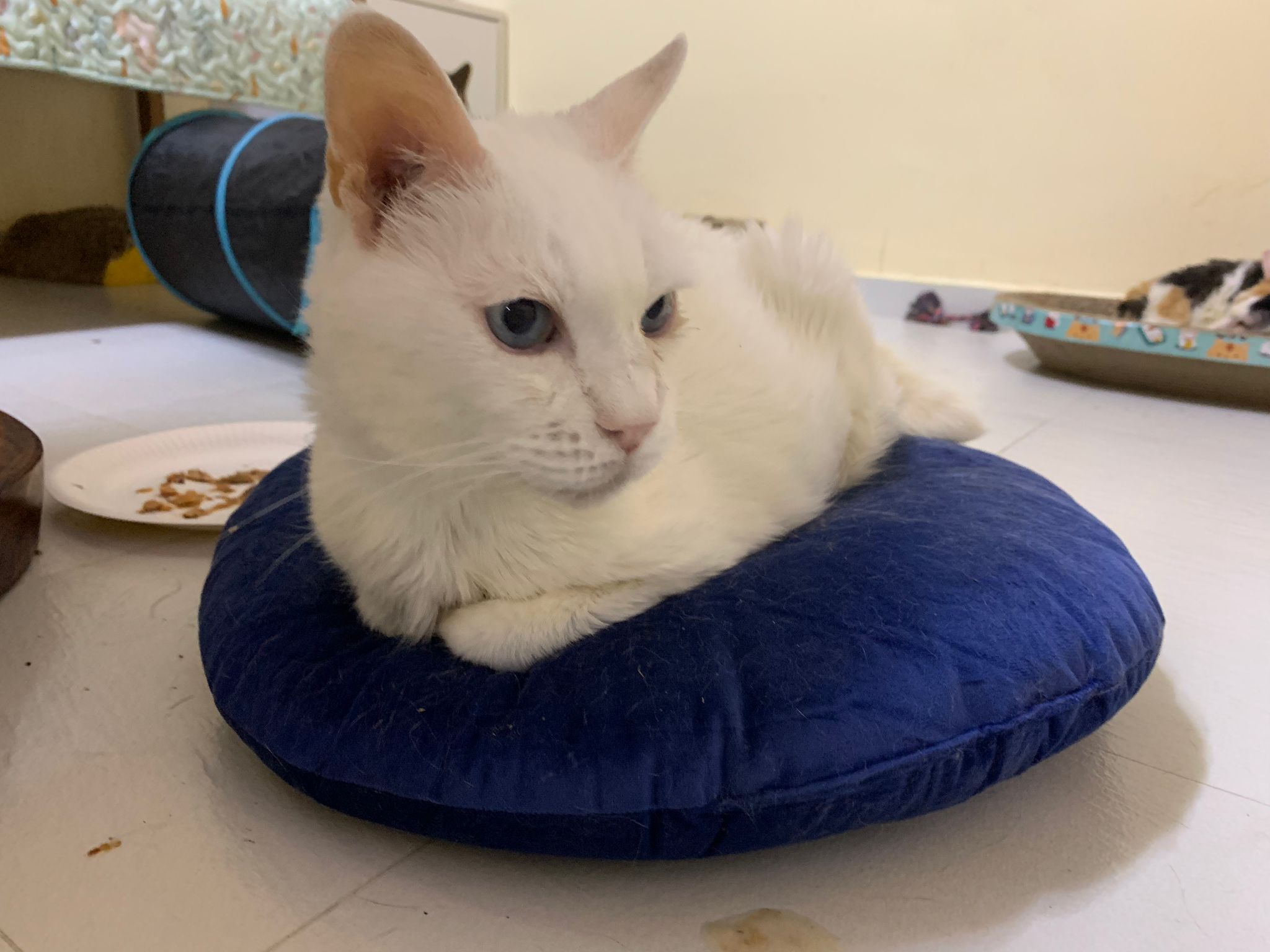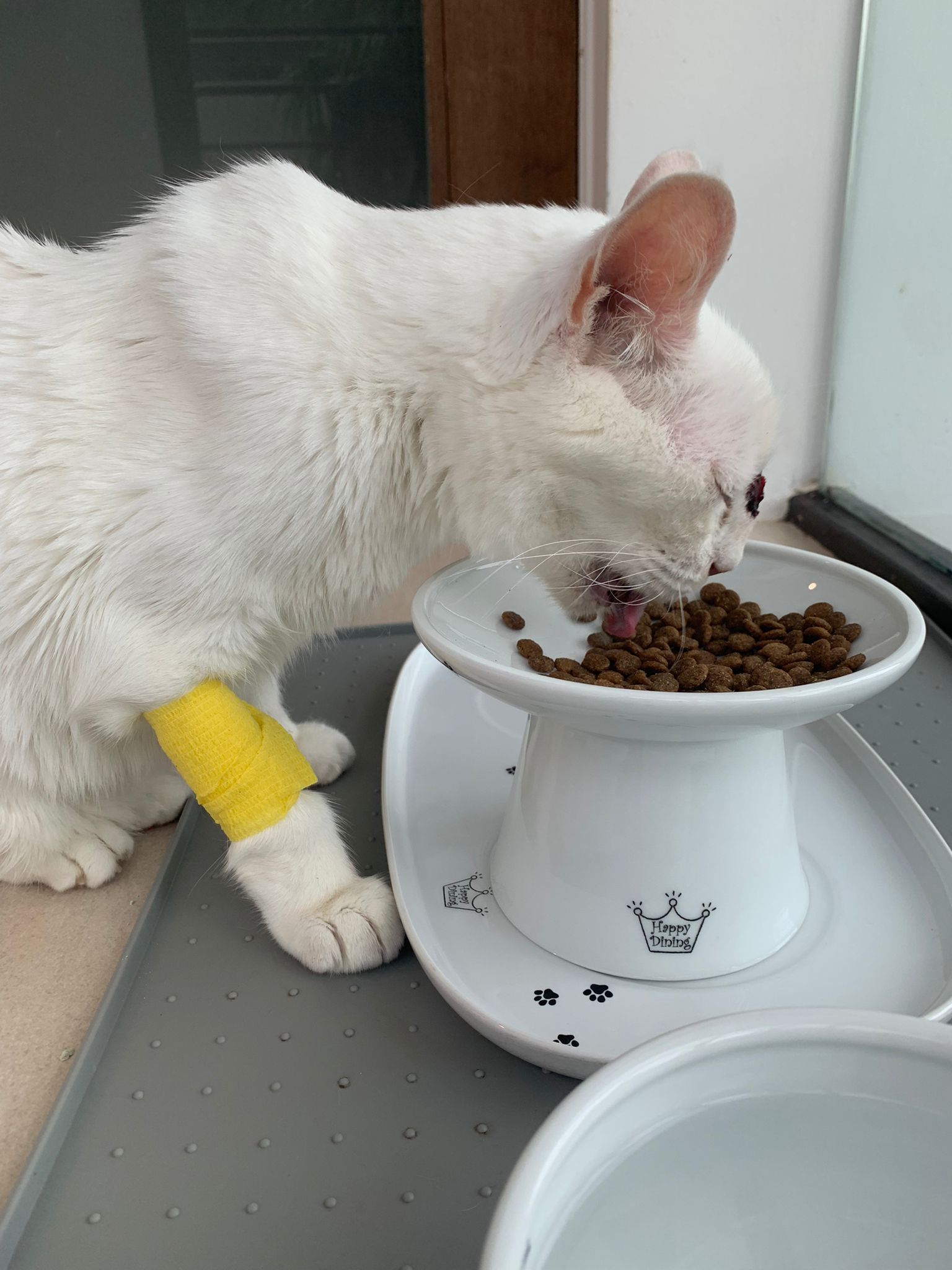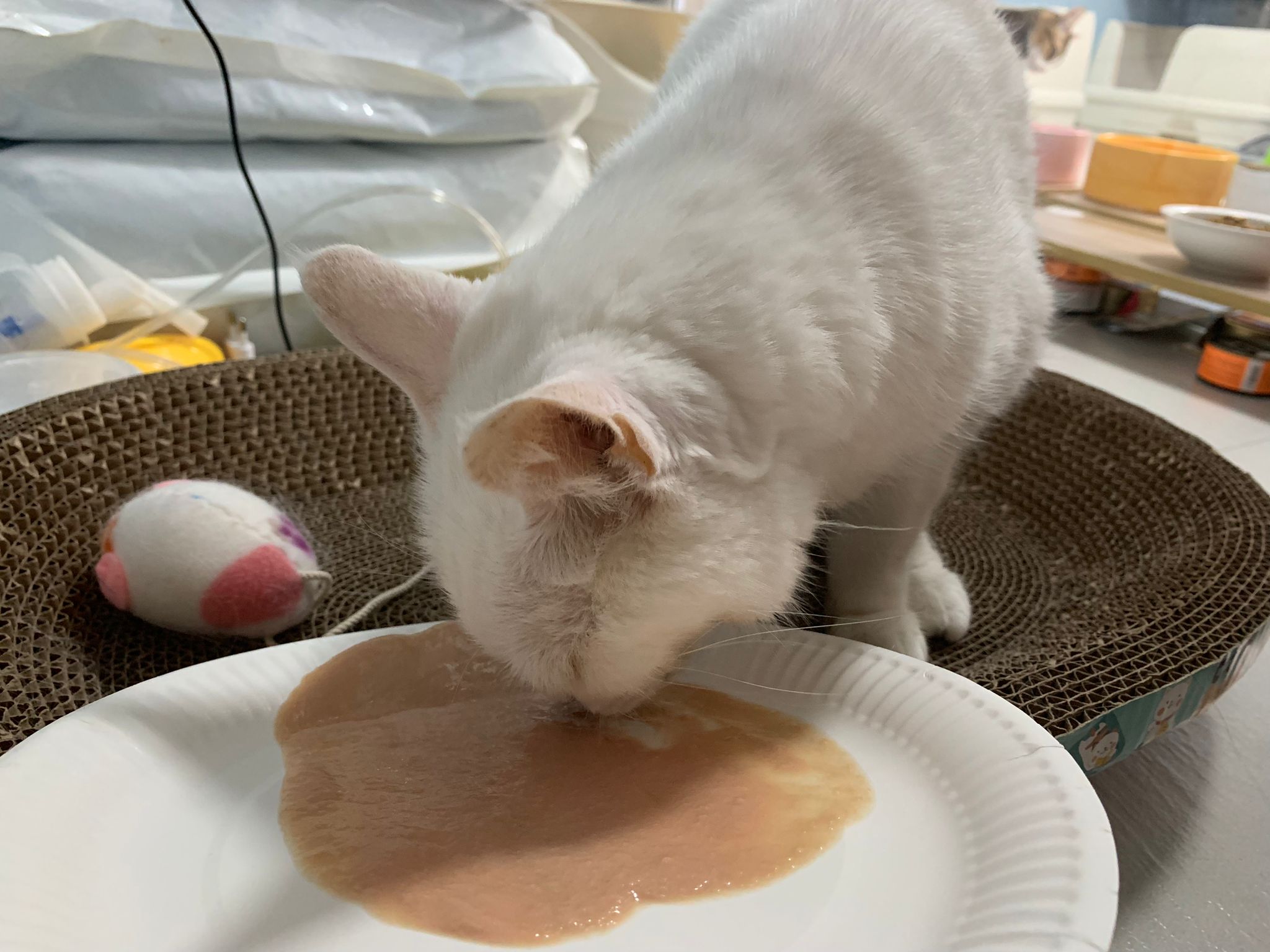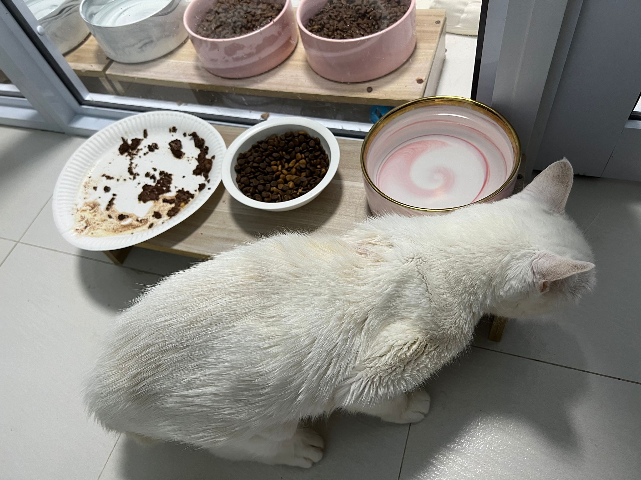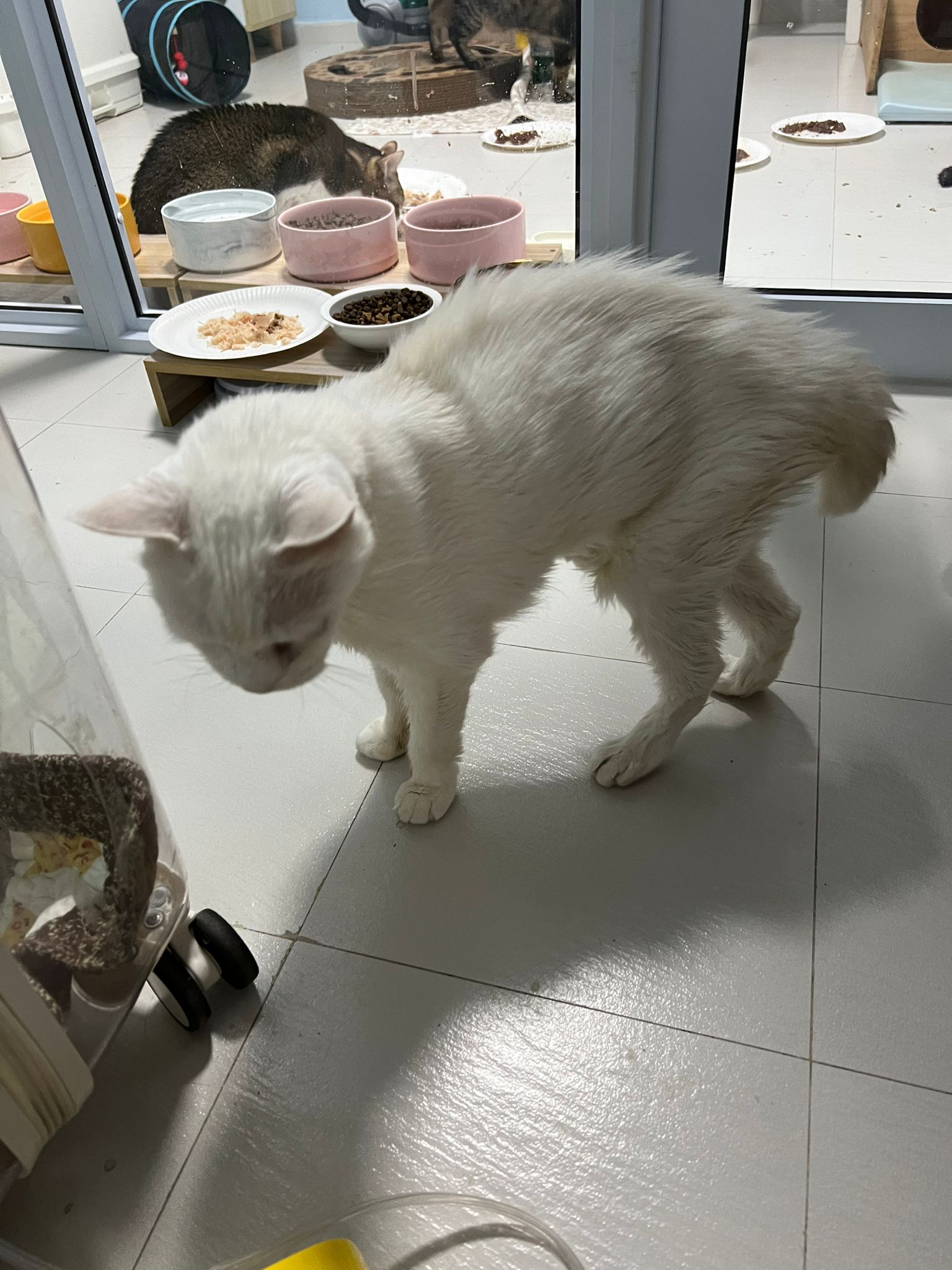 Serve another can of kakato chicken n tuna – she eat also. Totally ok w other cats. She is eating w Xiami looking at her food.