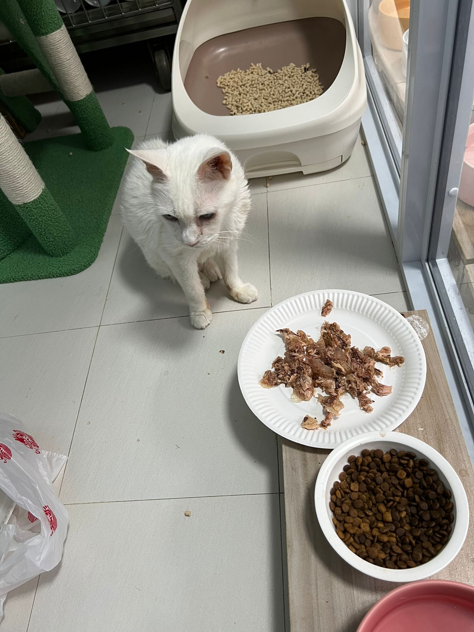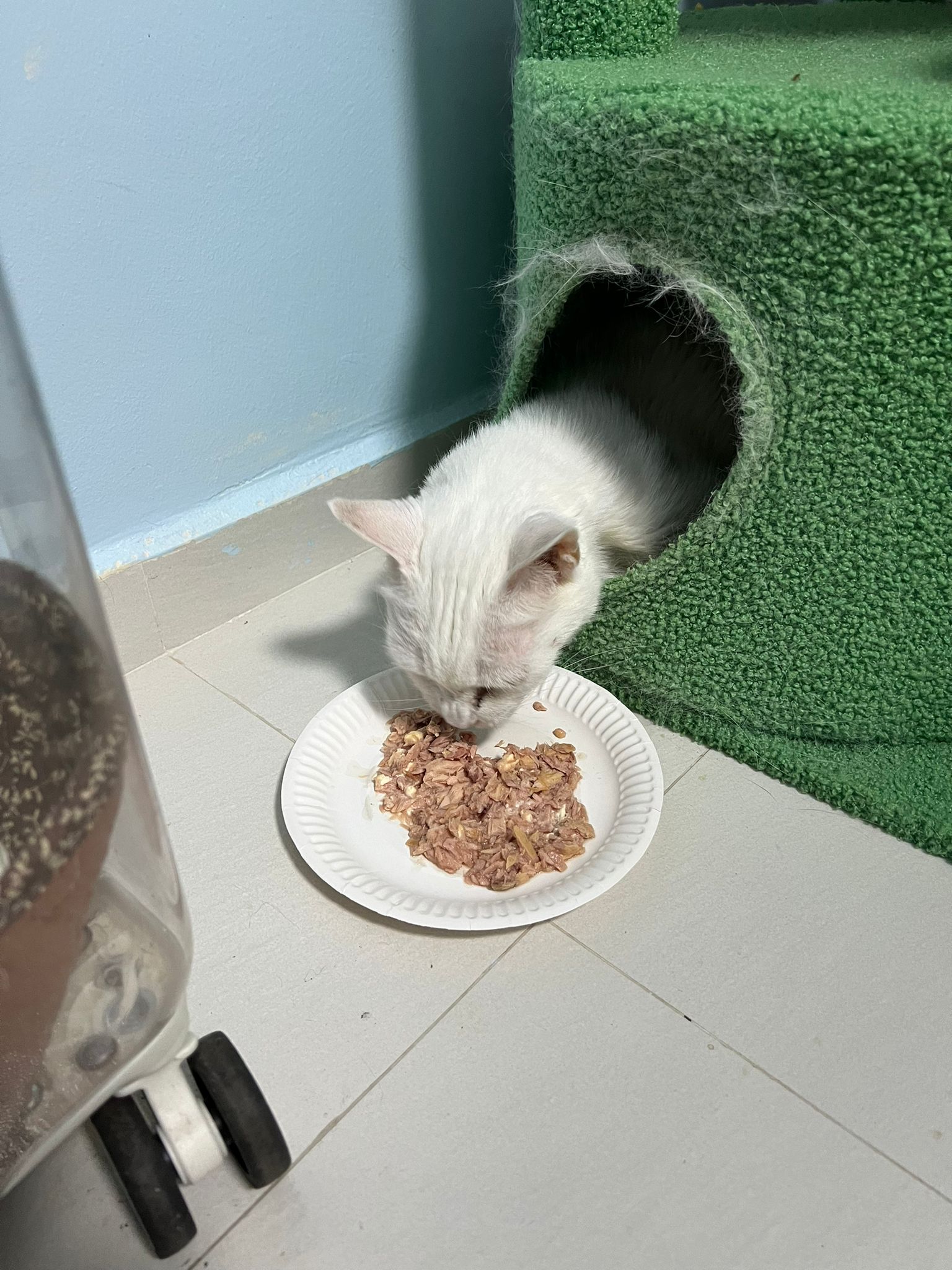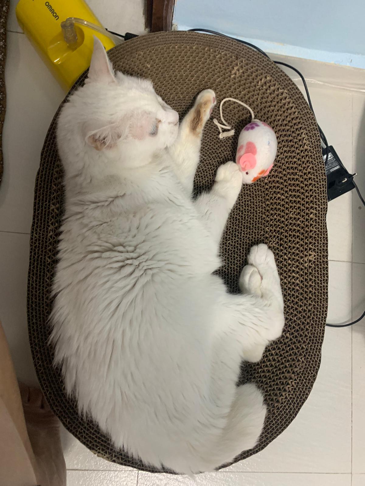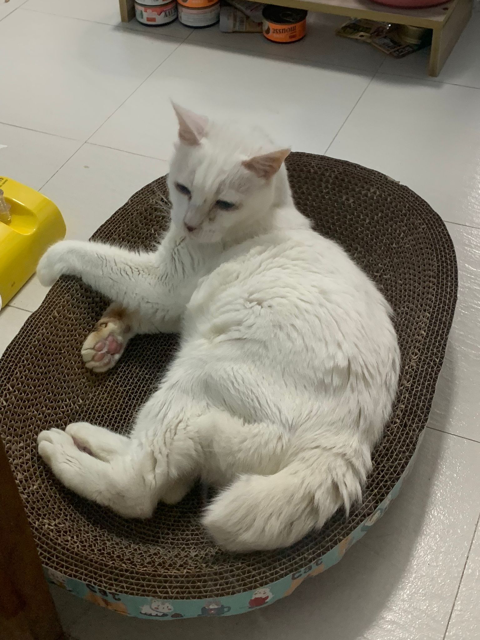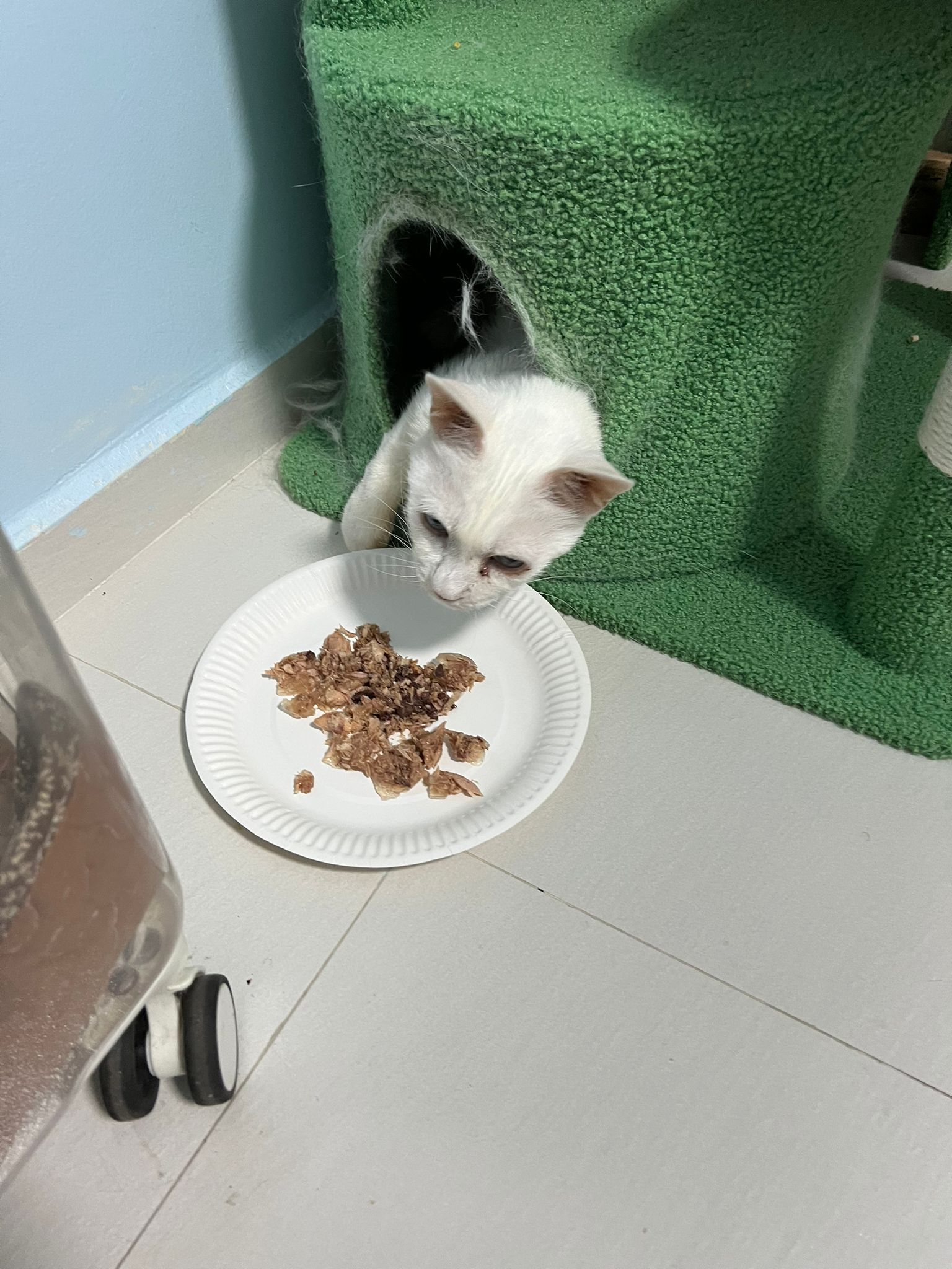 I serve aixia oldie green tuna flavour she ate 80%. She go sit on the oval sb, for scratch it. Not fierce. Laze ard. Didn’t growl not scare. Got lie down just looking at Xiami and don.