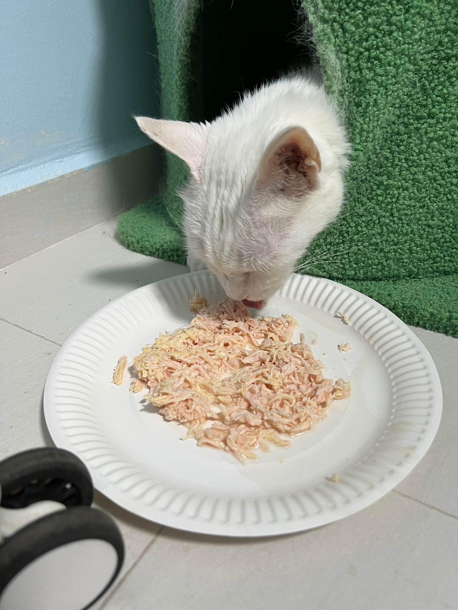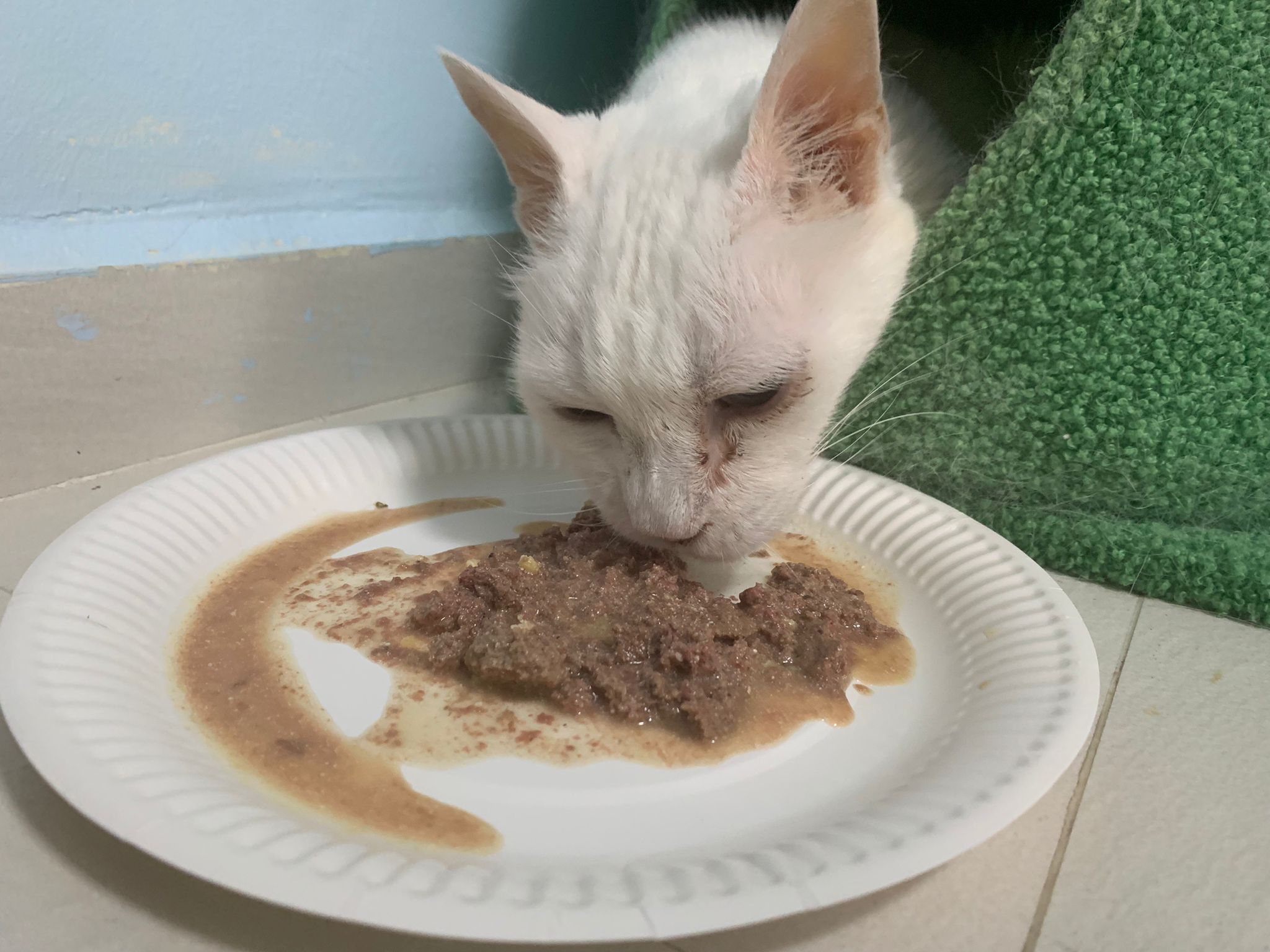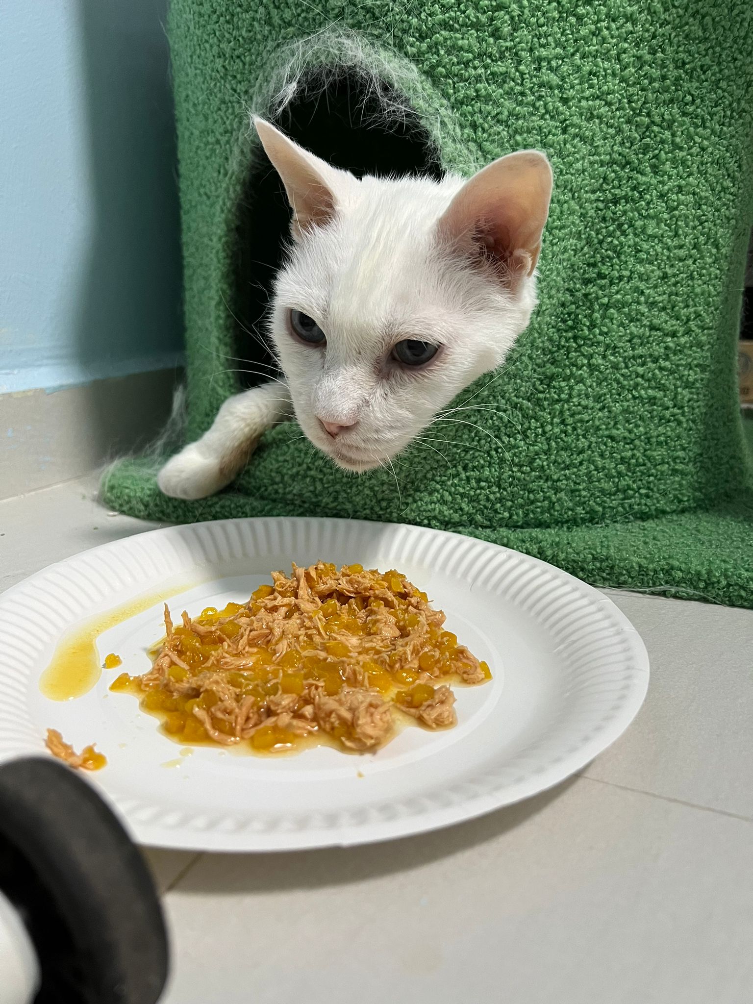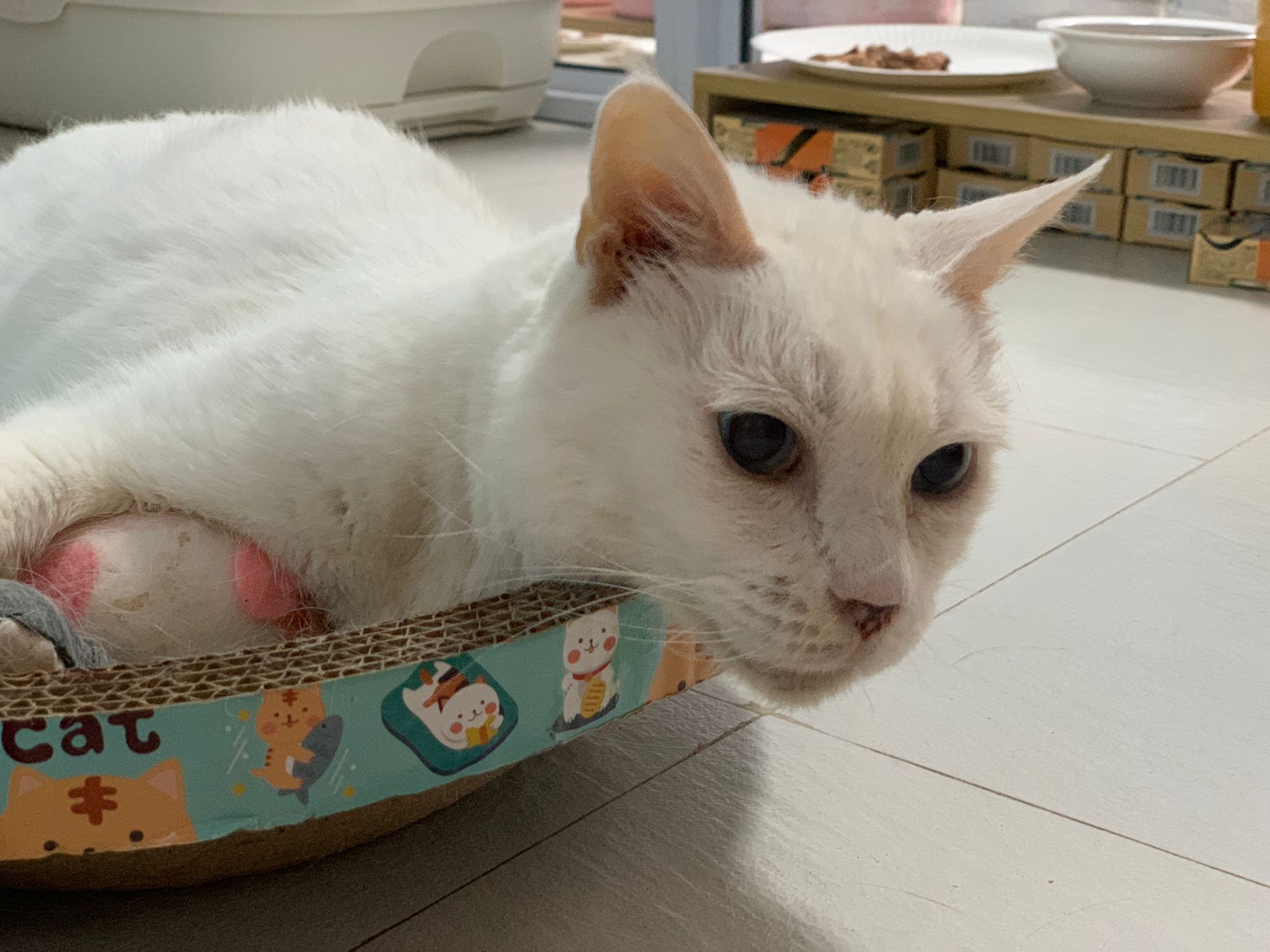 I serve aixia oldie green tuna flavour she ate 80%. She go sit on the oval sb, for scratch it. Not fierce. Laze ard. Didn’t growl not scare. Got lie down just looking at Xiami and don.