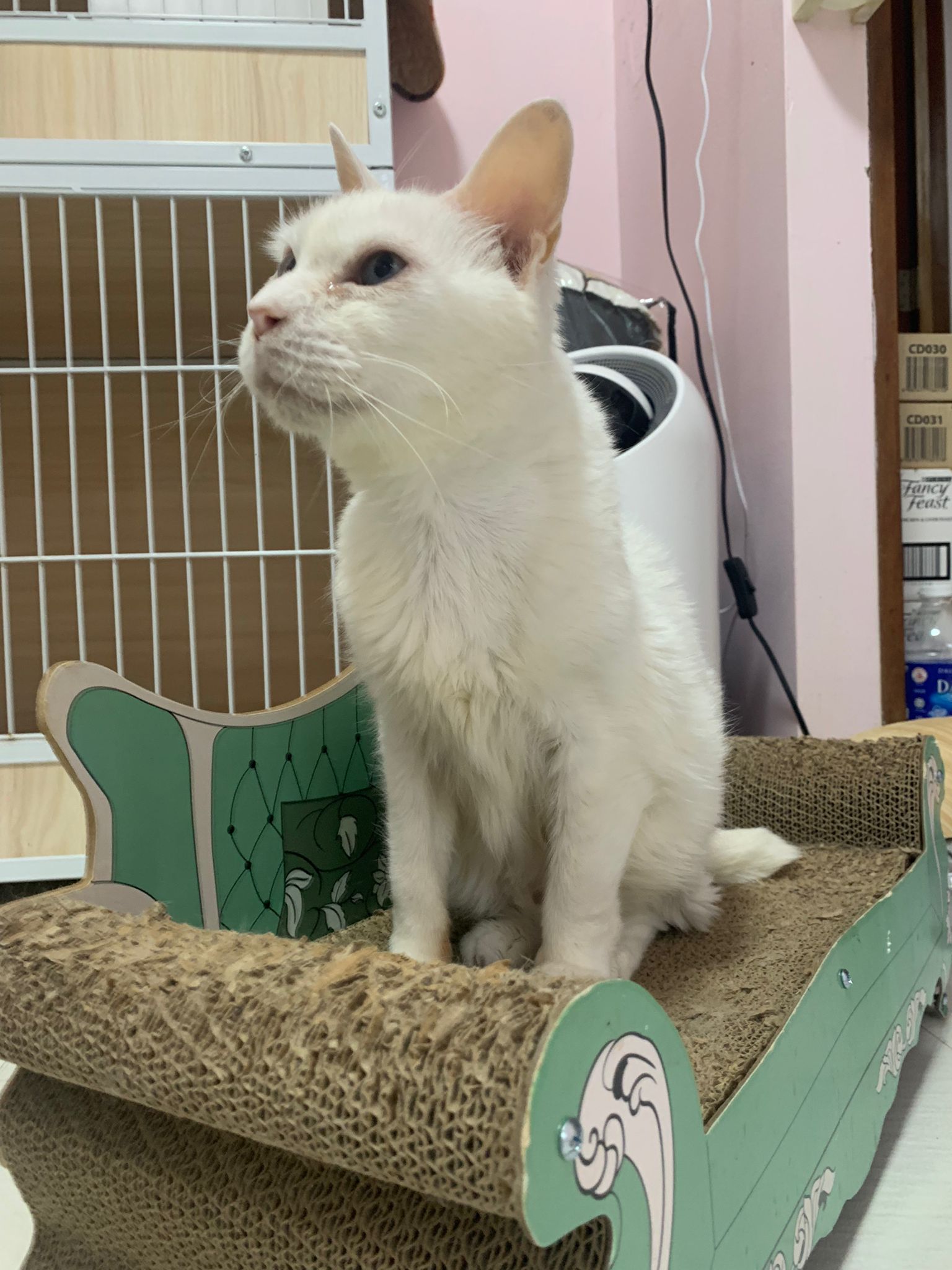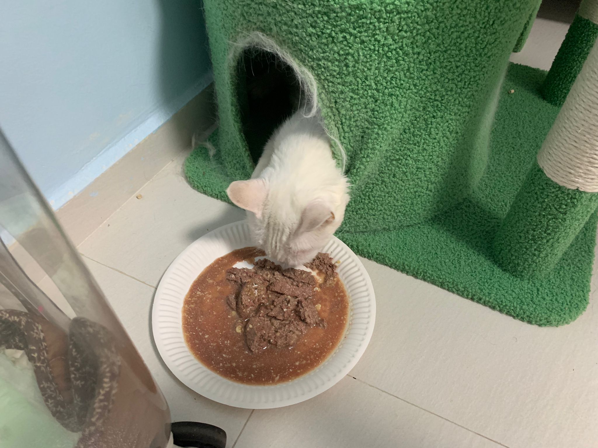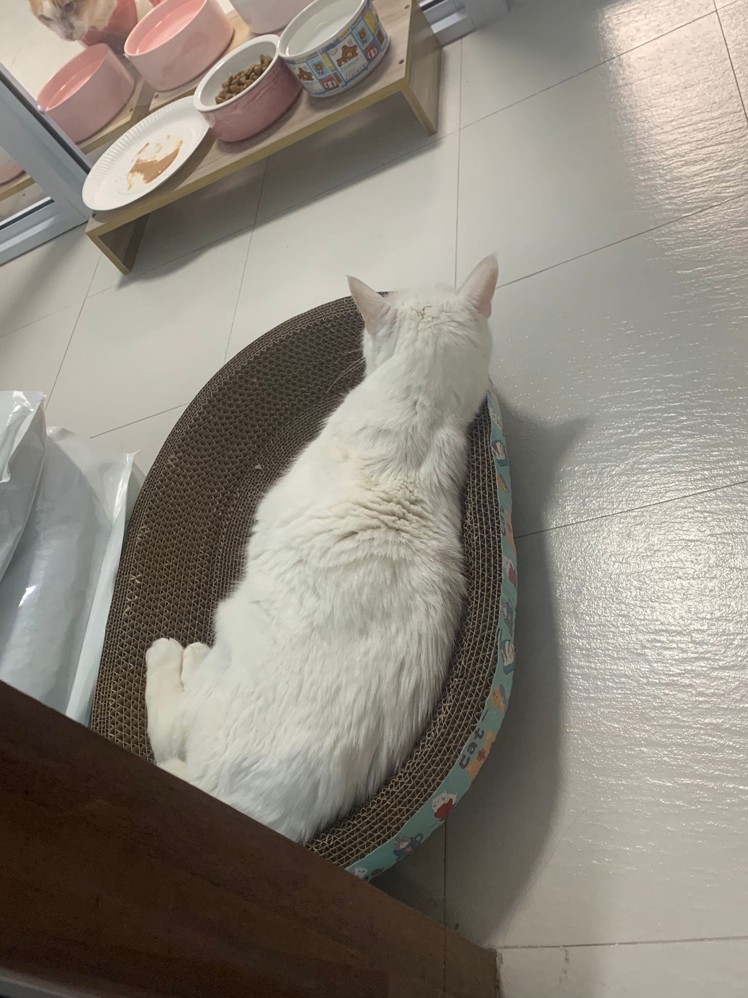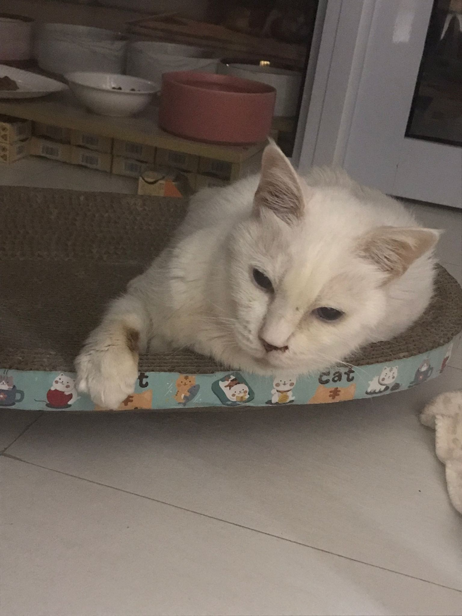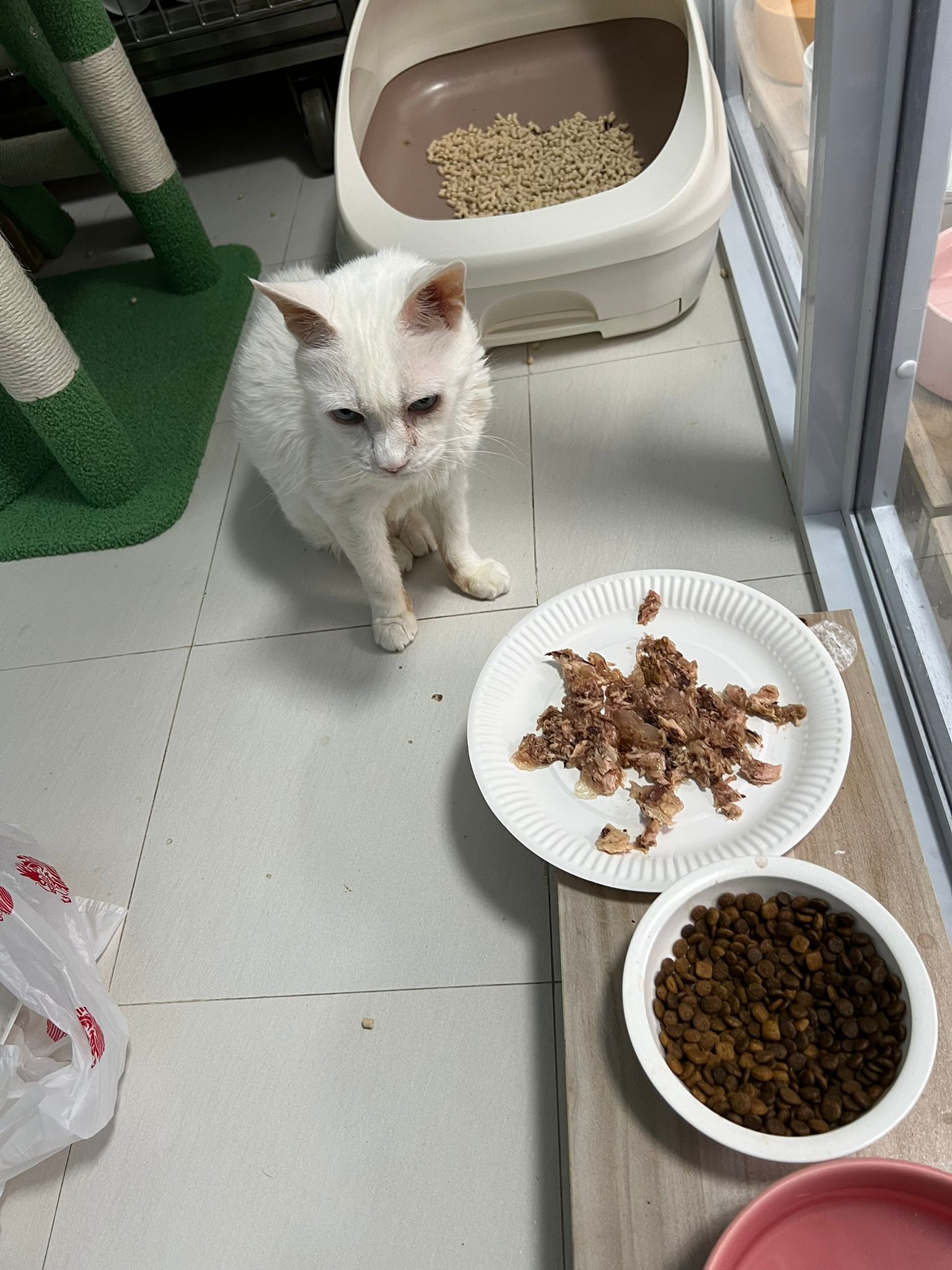 I serve aixia oldie green tuna flavour she ate 80%. She go sit on the oval sb, for scratch it. Not fierce. Laze ard. Didn’t growl not scare. Got lie down just looking at Xiami and don.