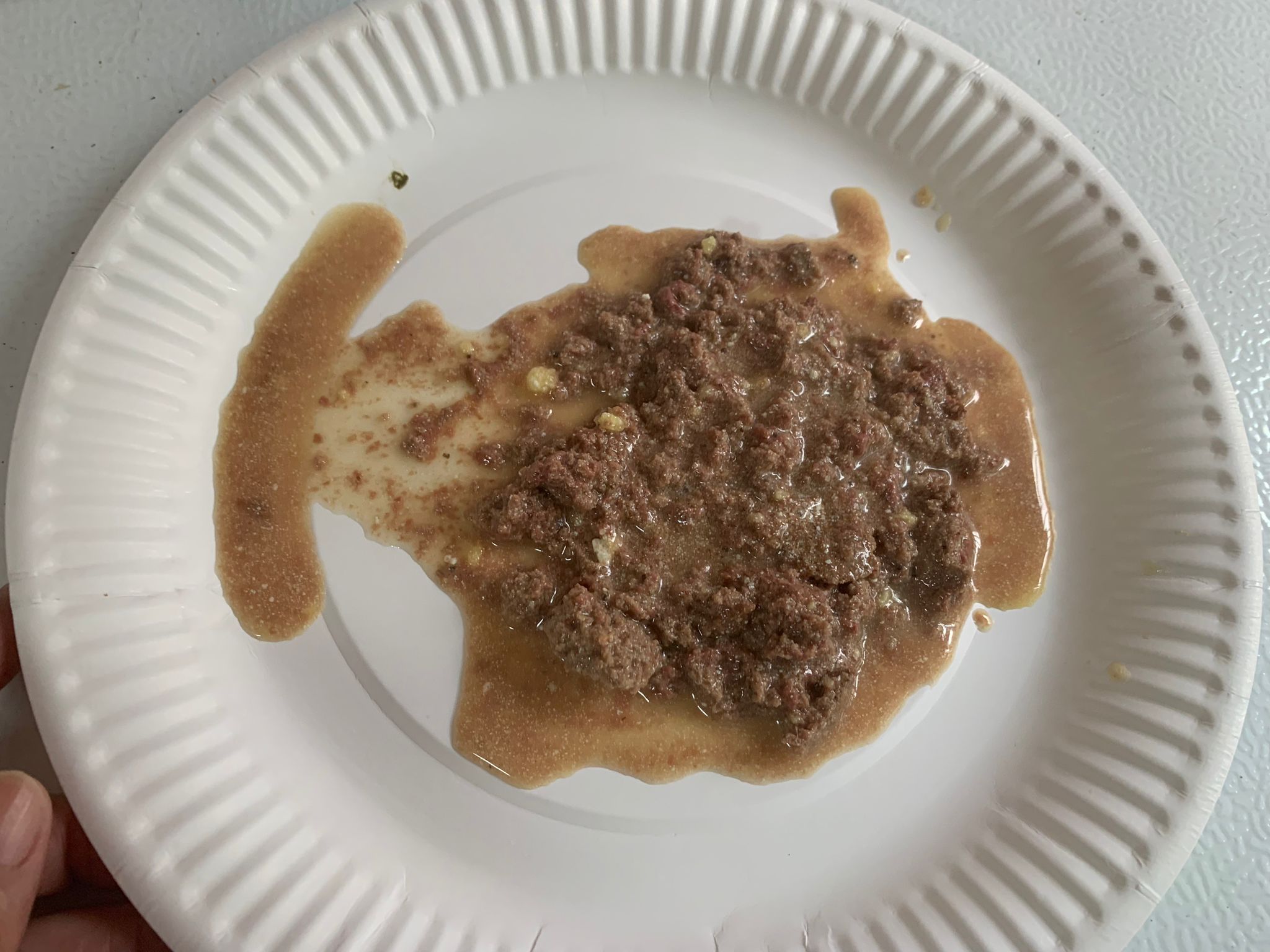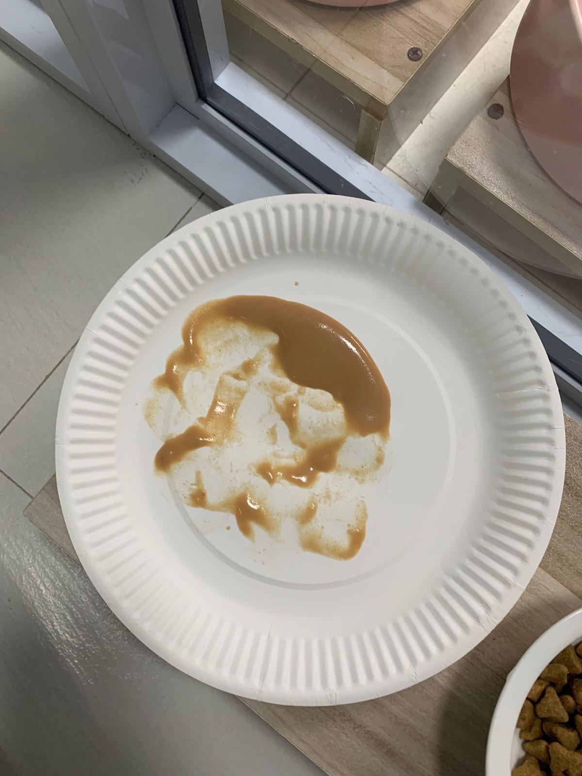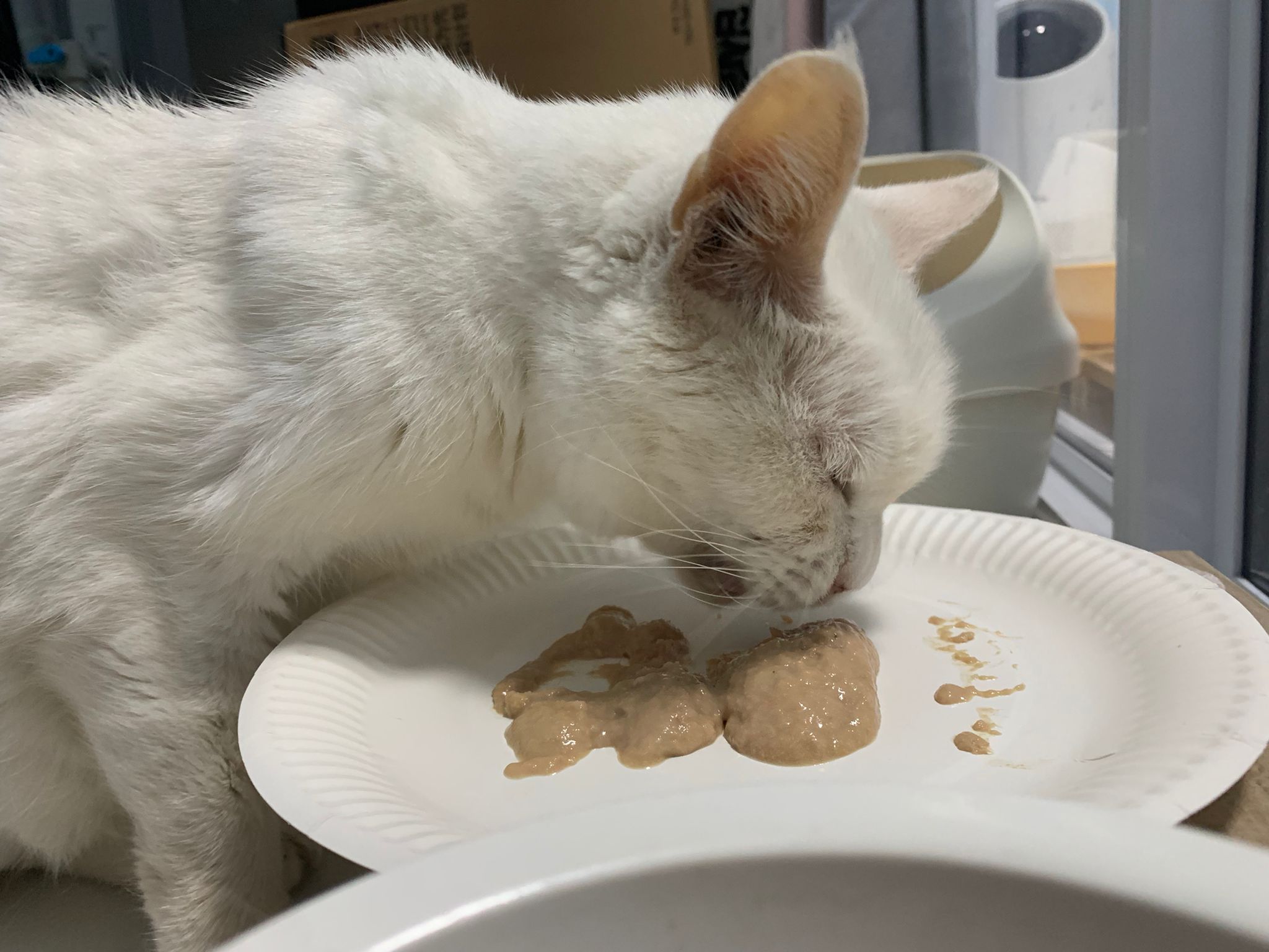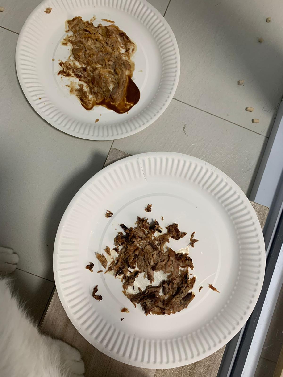 8.54pm: mmm;”I tried Rufus favourite- Fussie cat chicken with gravy. That’s all left of a full can.”- so means snowy quite like it