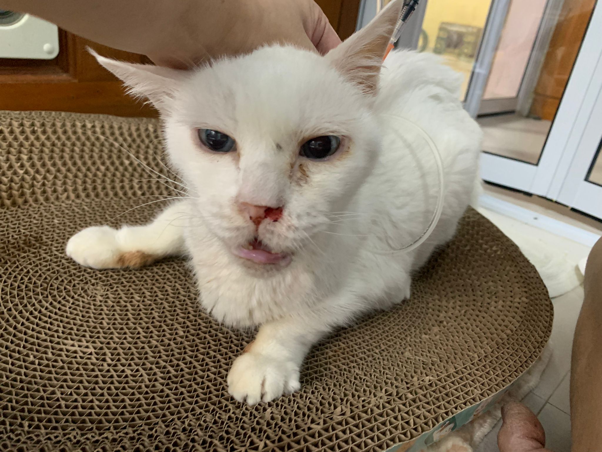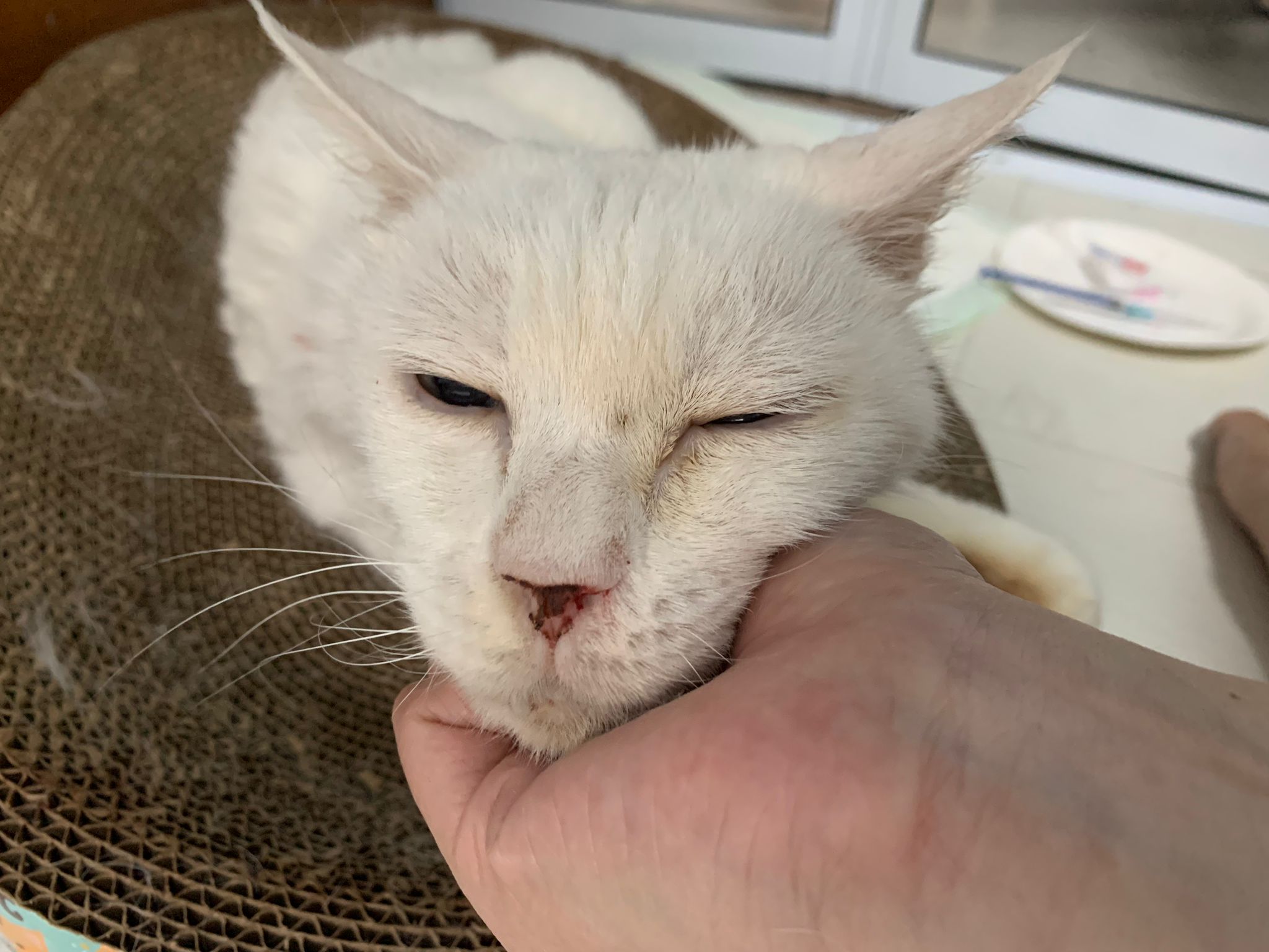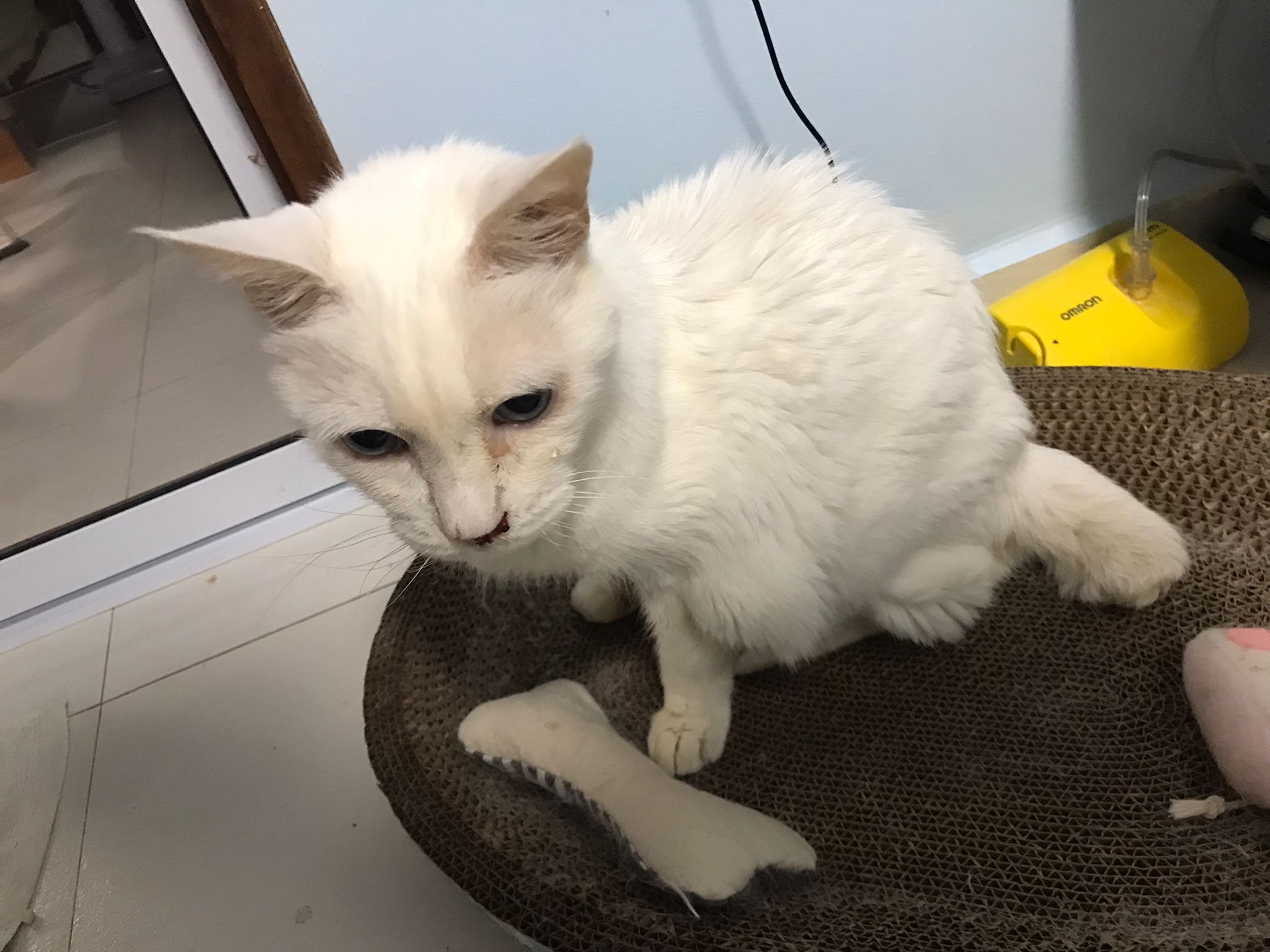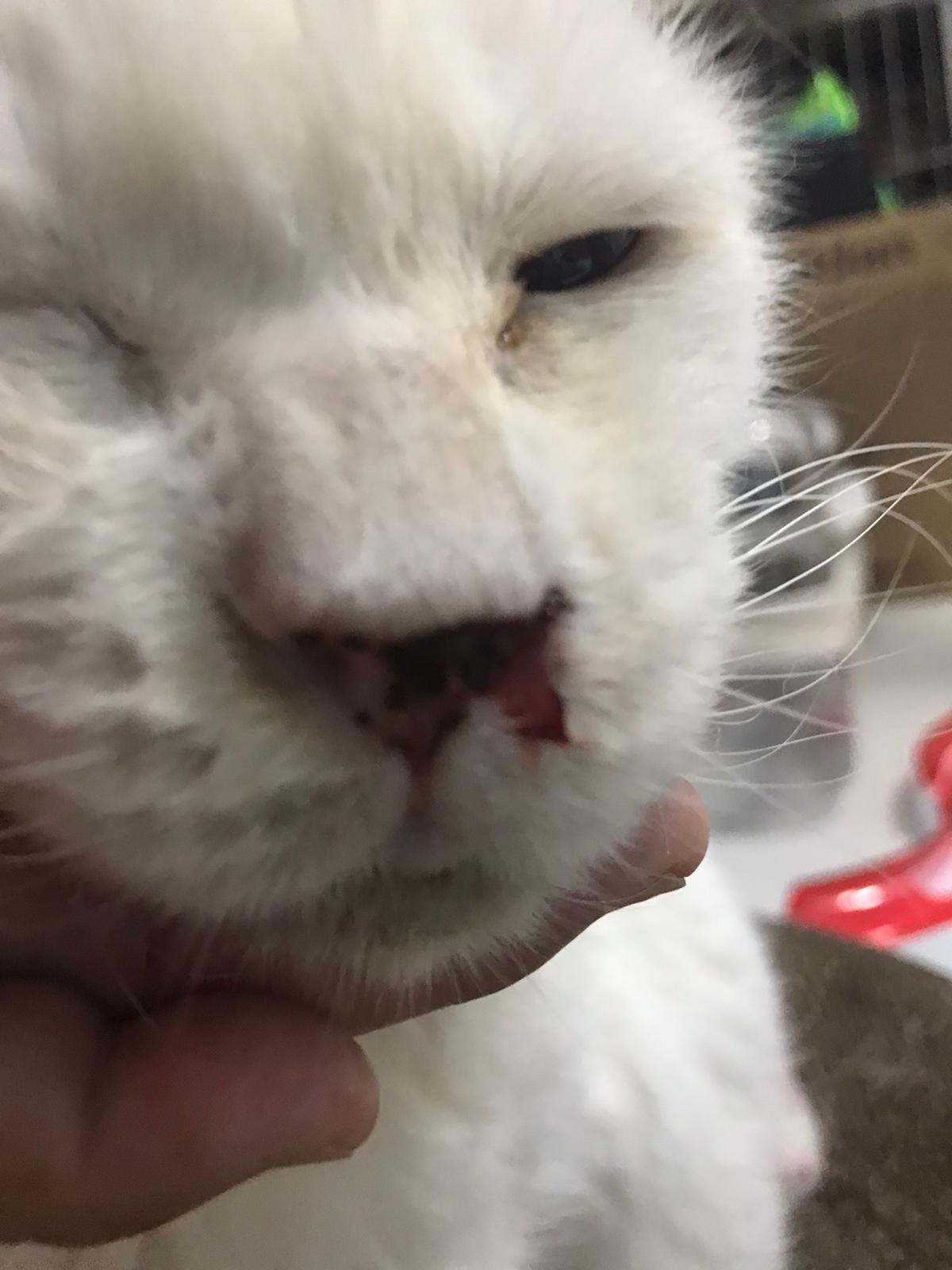 At the clinic, I look into her carrier, like red thread hanging from her left nostril. So much blood come out. Erm will monitor when she start the new treatment plan.