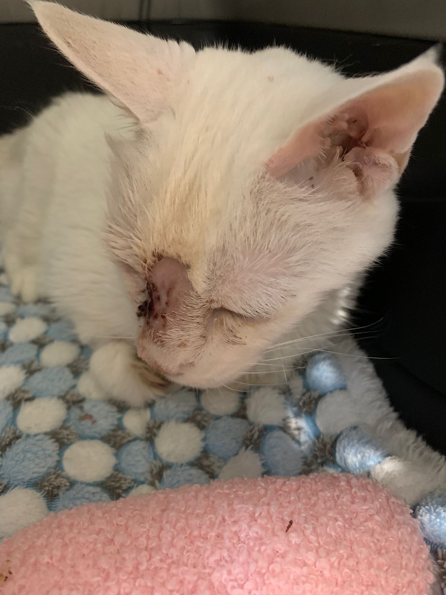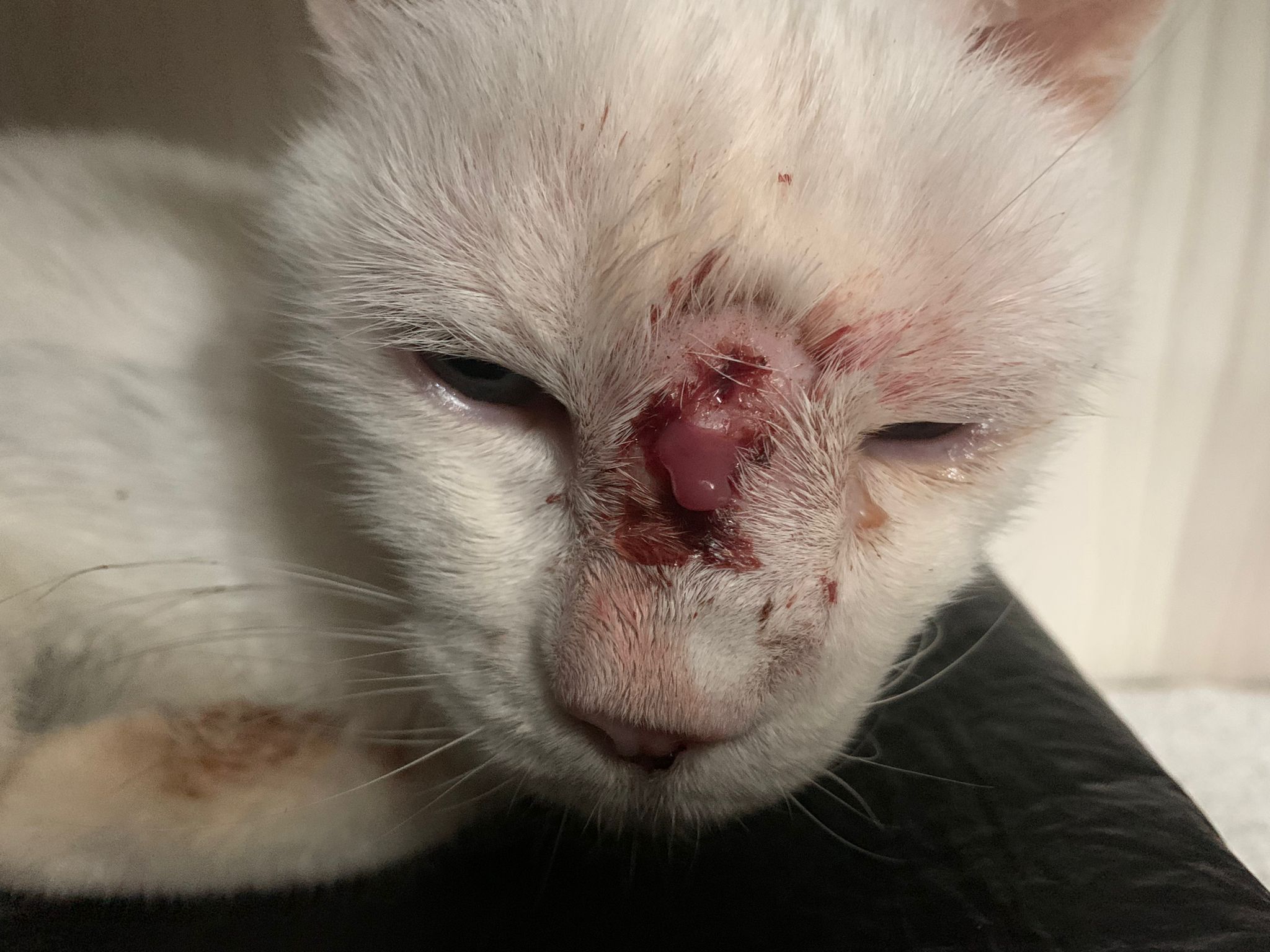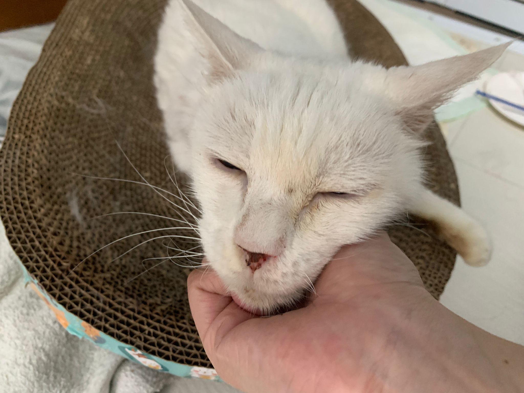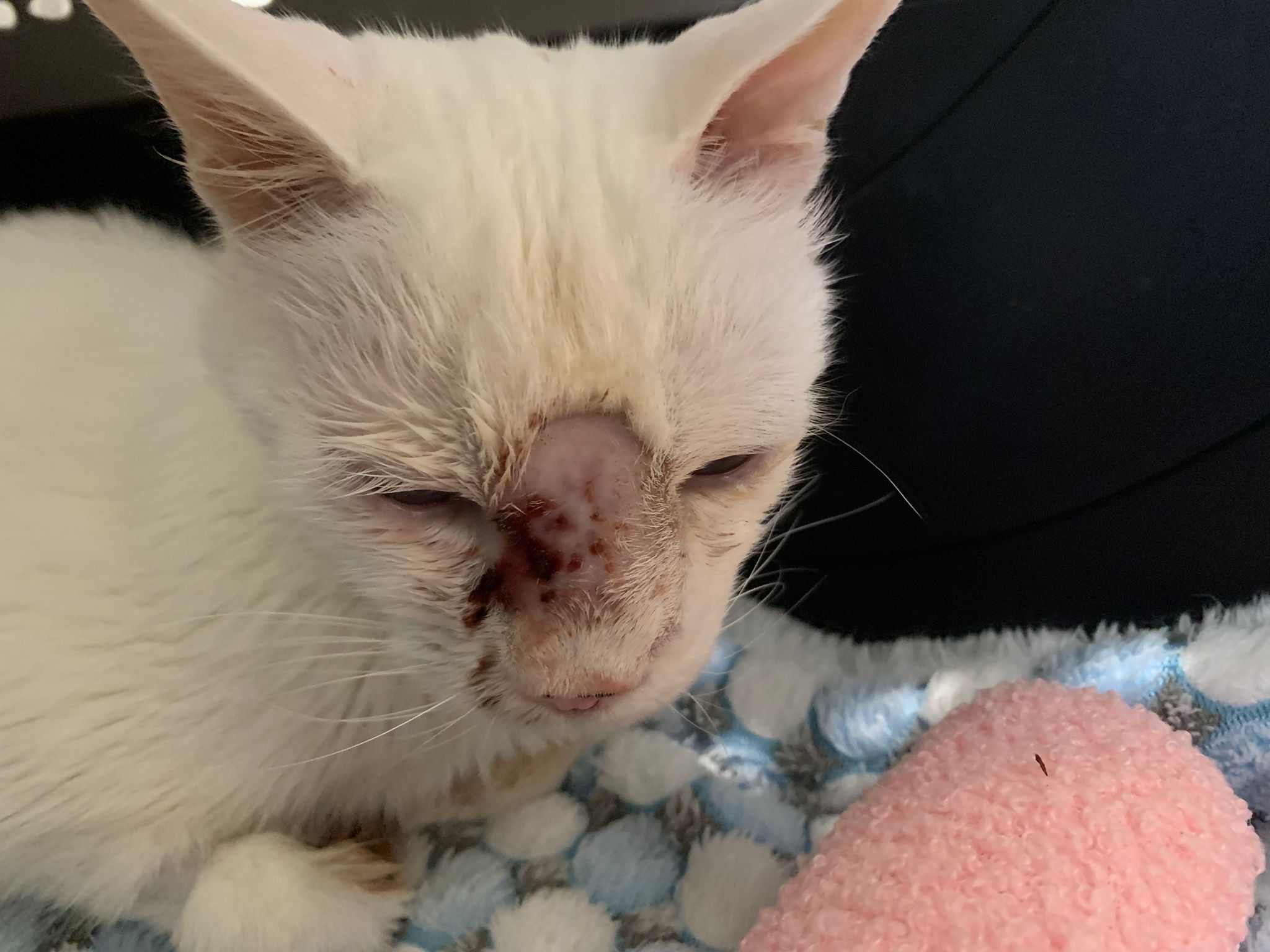At the clinic, I look into her carrier, like red thread hanging from her left nostril. So much blood come out. Erm will monitor when she start the new treatment plan.