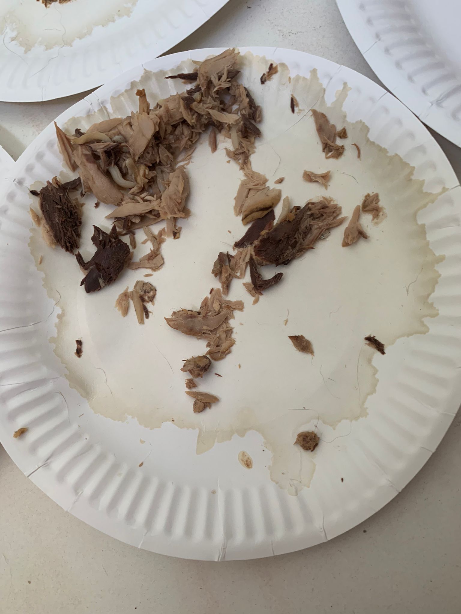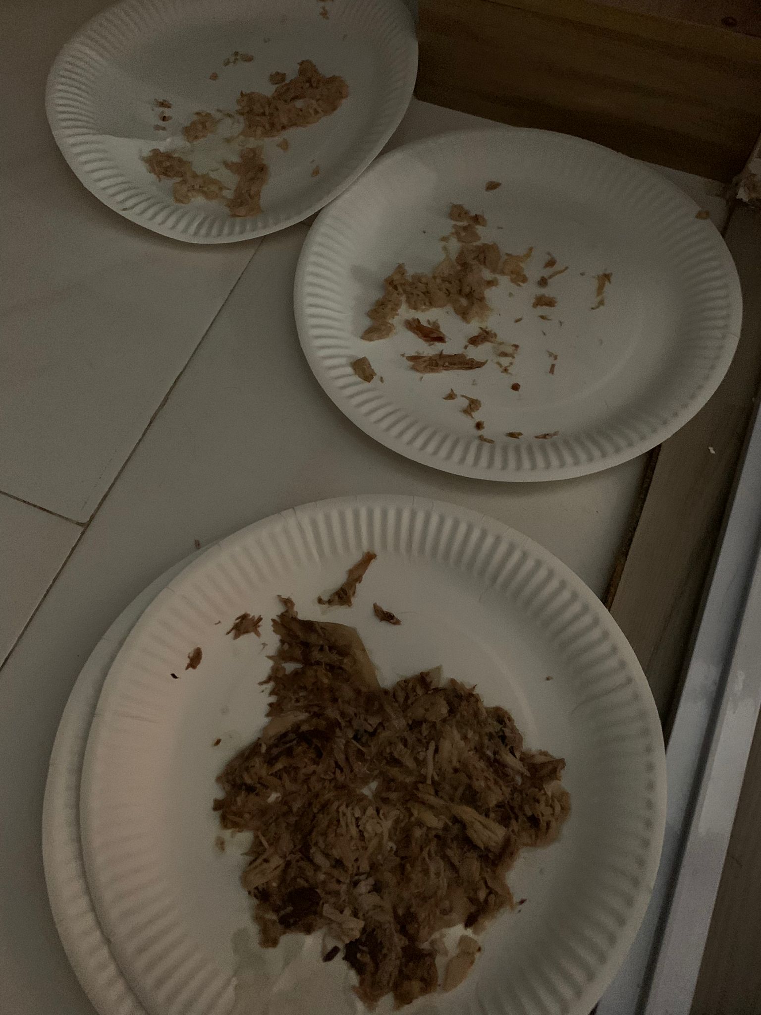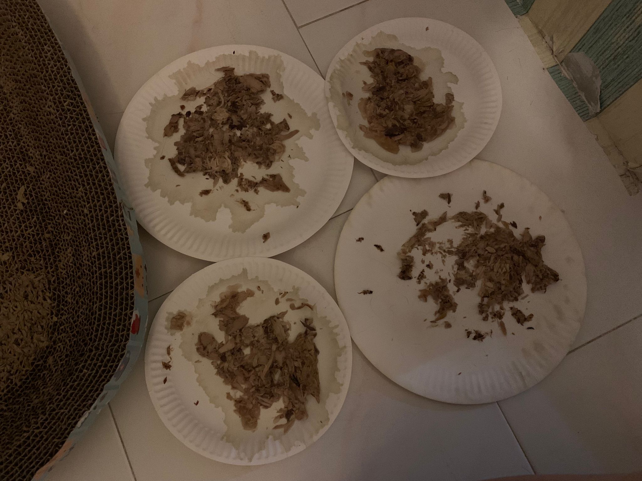 Bin: no poo, got pee, amount should be 2 cats both pee alr. Didn’t touch much food. All throw.