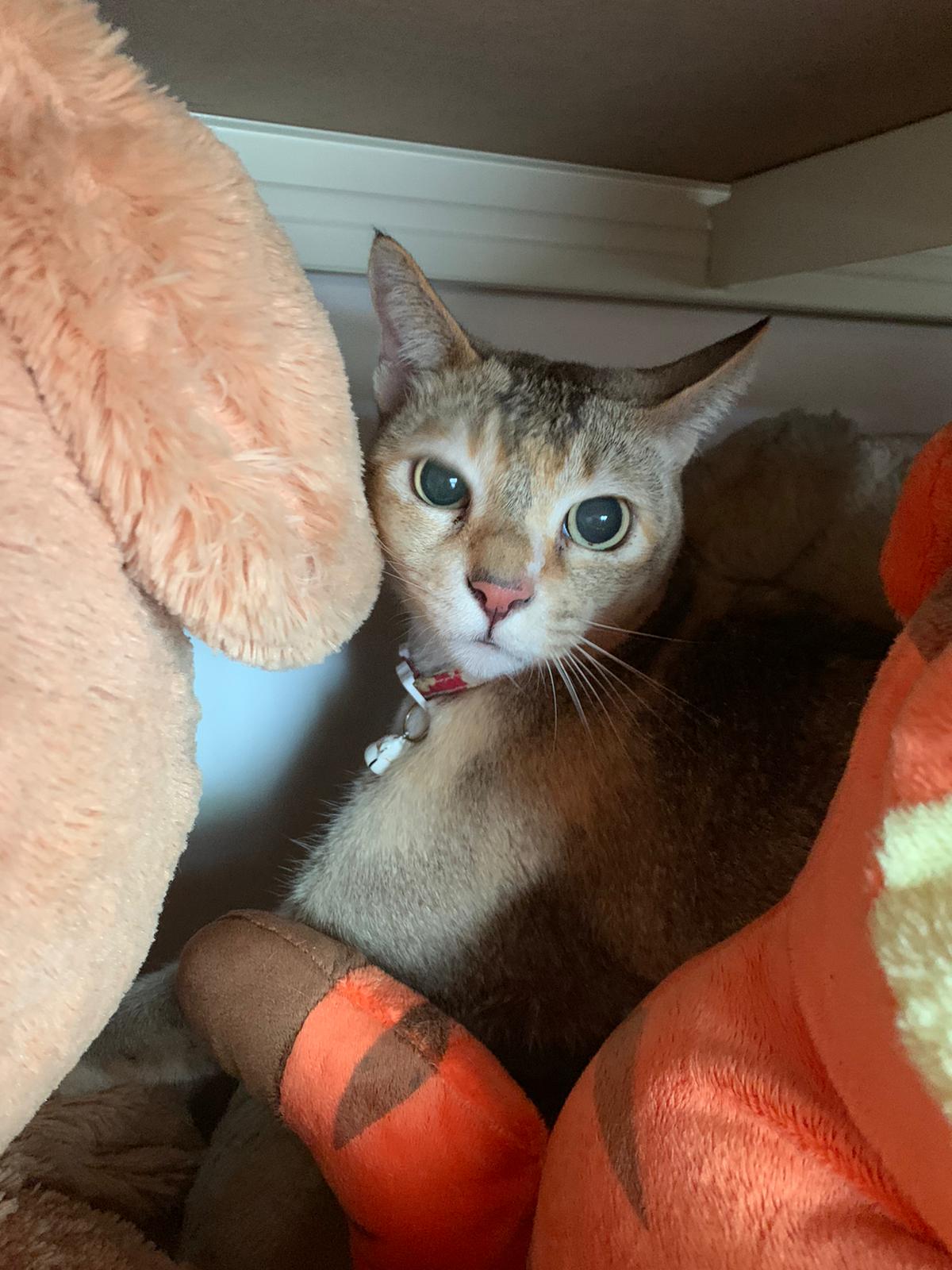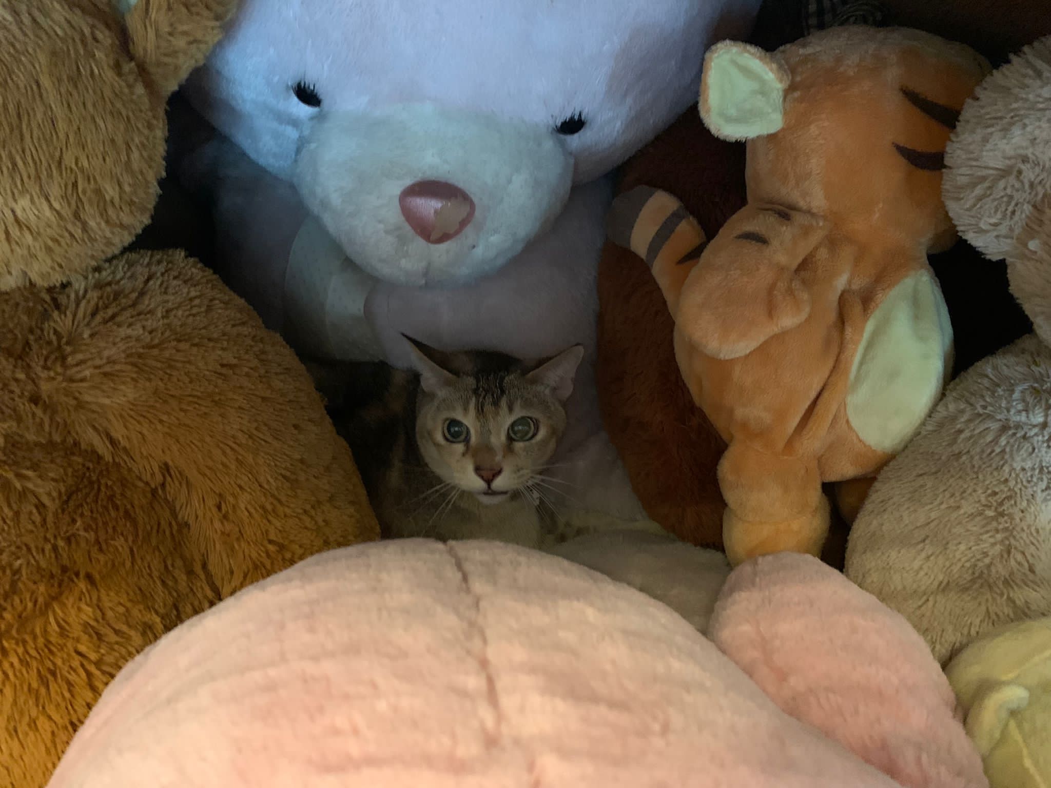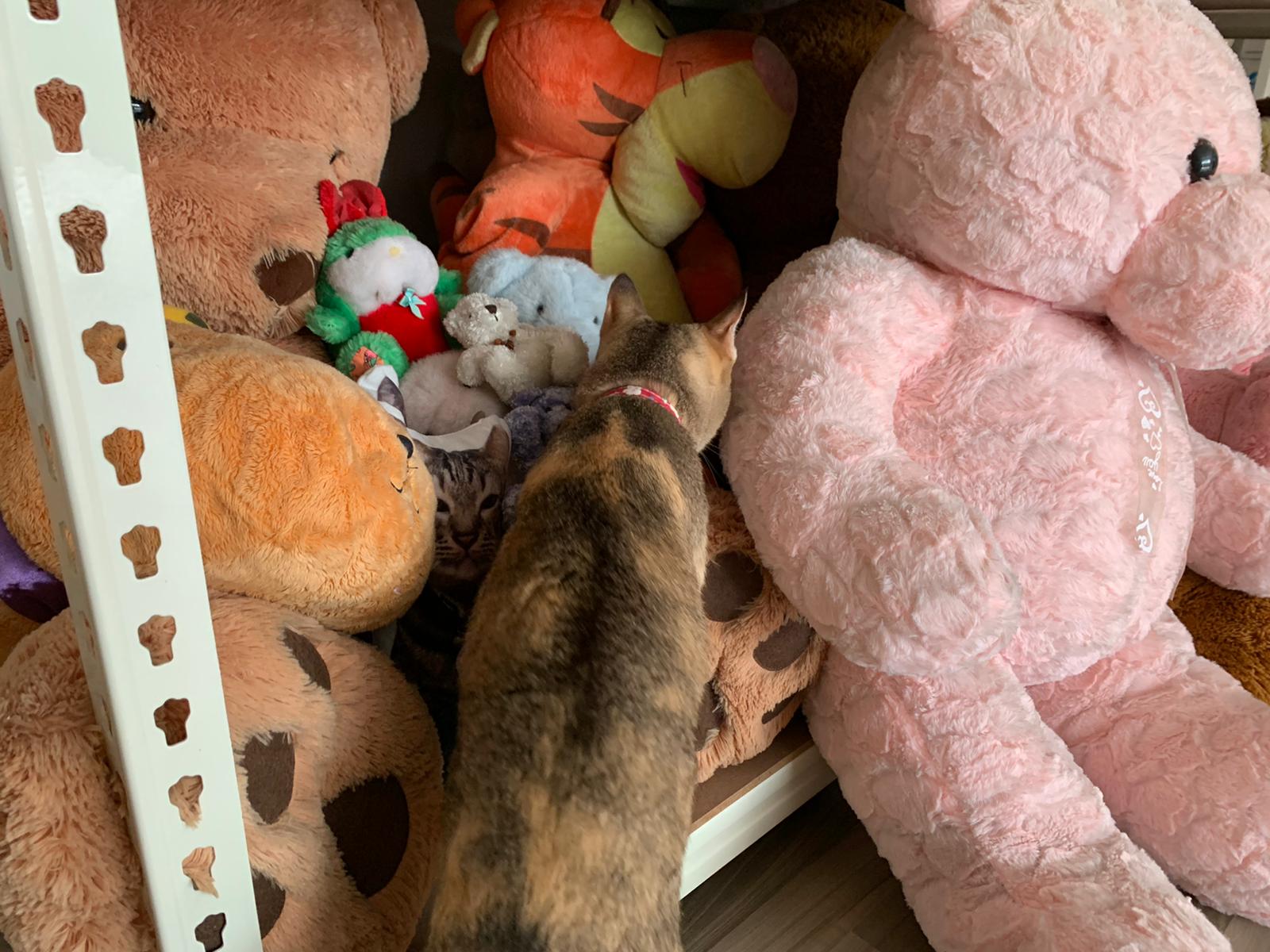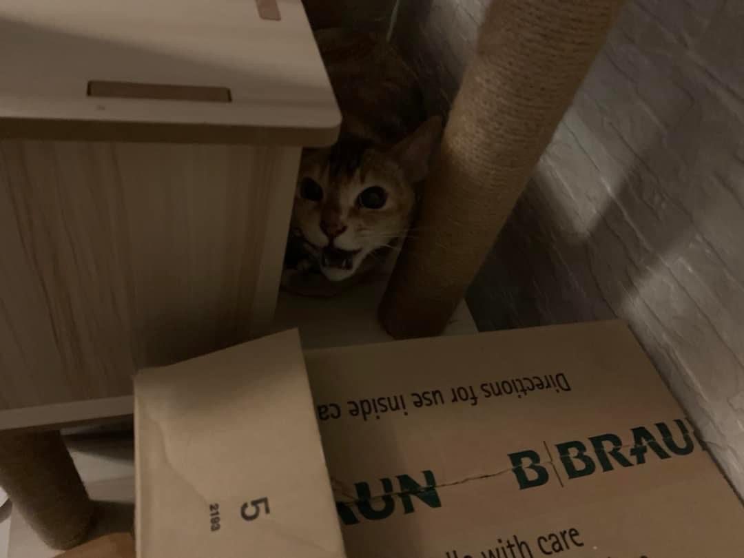 Wa they play 躲猫猫 w me. I find Tammy for v long loh then she hiss me siak. this girl can’t predict properly. She hiss mama also but didn’t attack man.