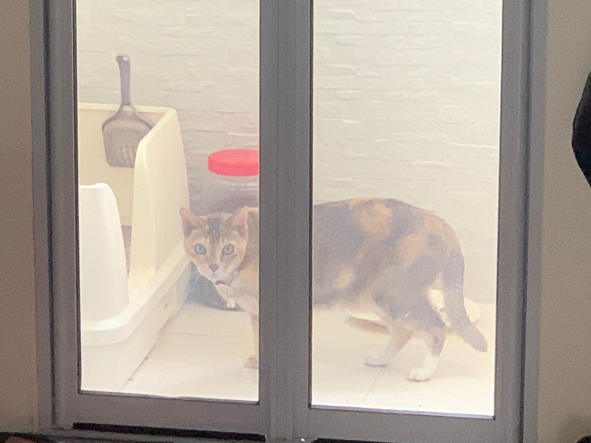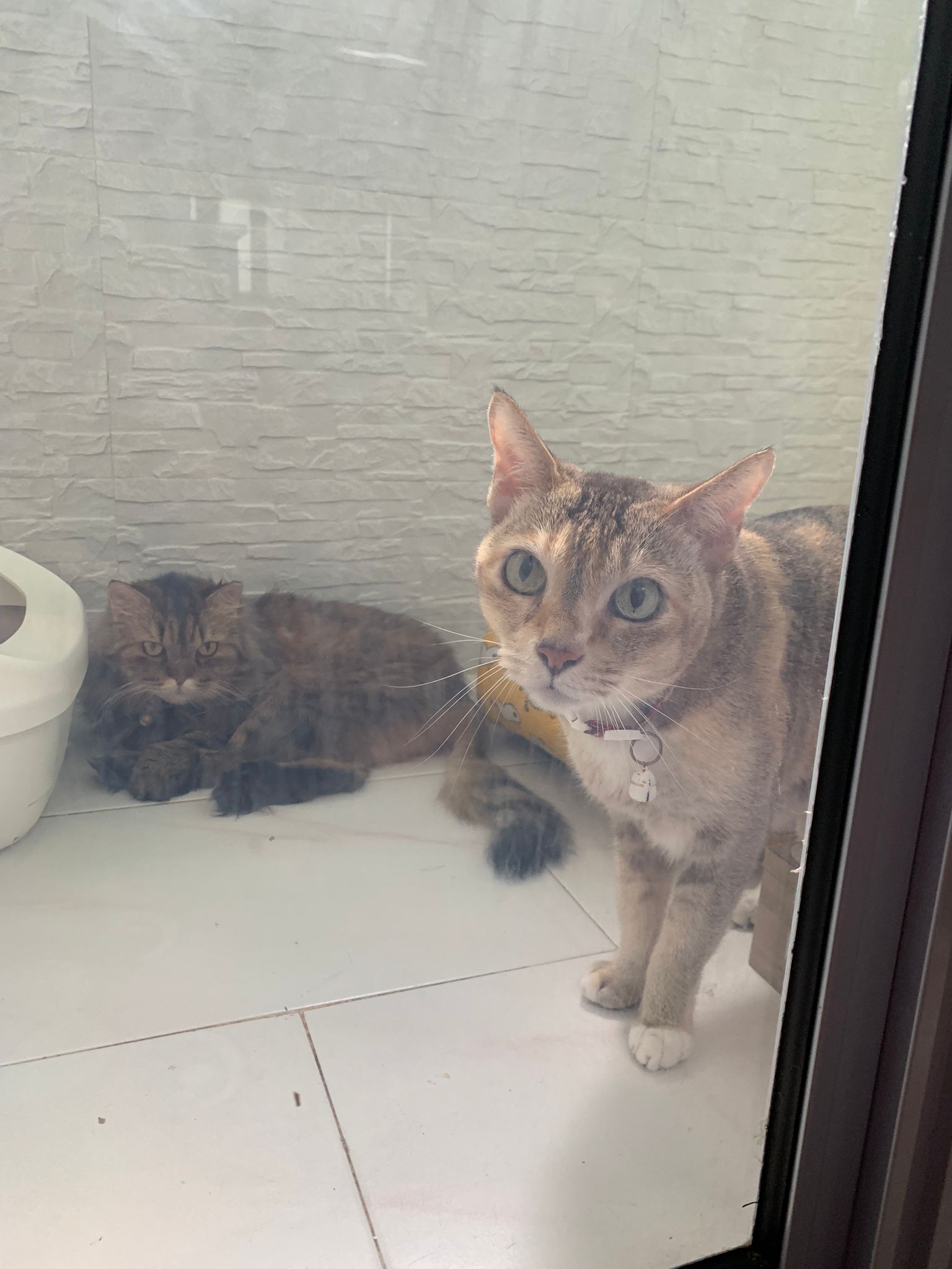 1215am: she is at the door w Bella, wa follow Bella hiss me. Hiss ok, better than Bella just shout and attack. I think she poo, cos I think bin got poo but no way I can clear w Bella sigh. Tammy jump up to window and sit on the ledge.