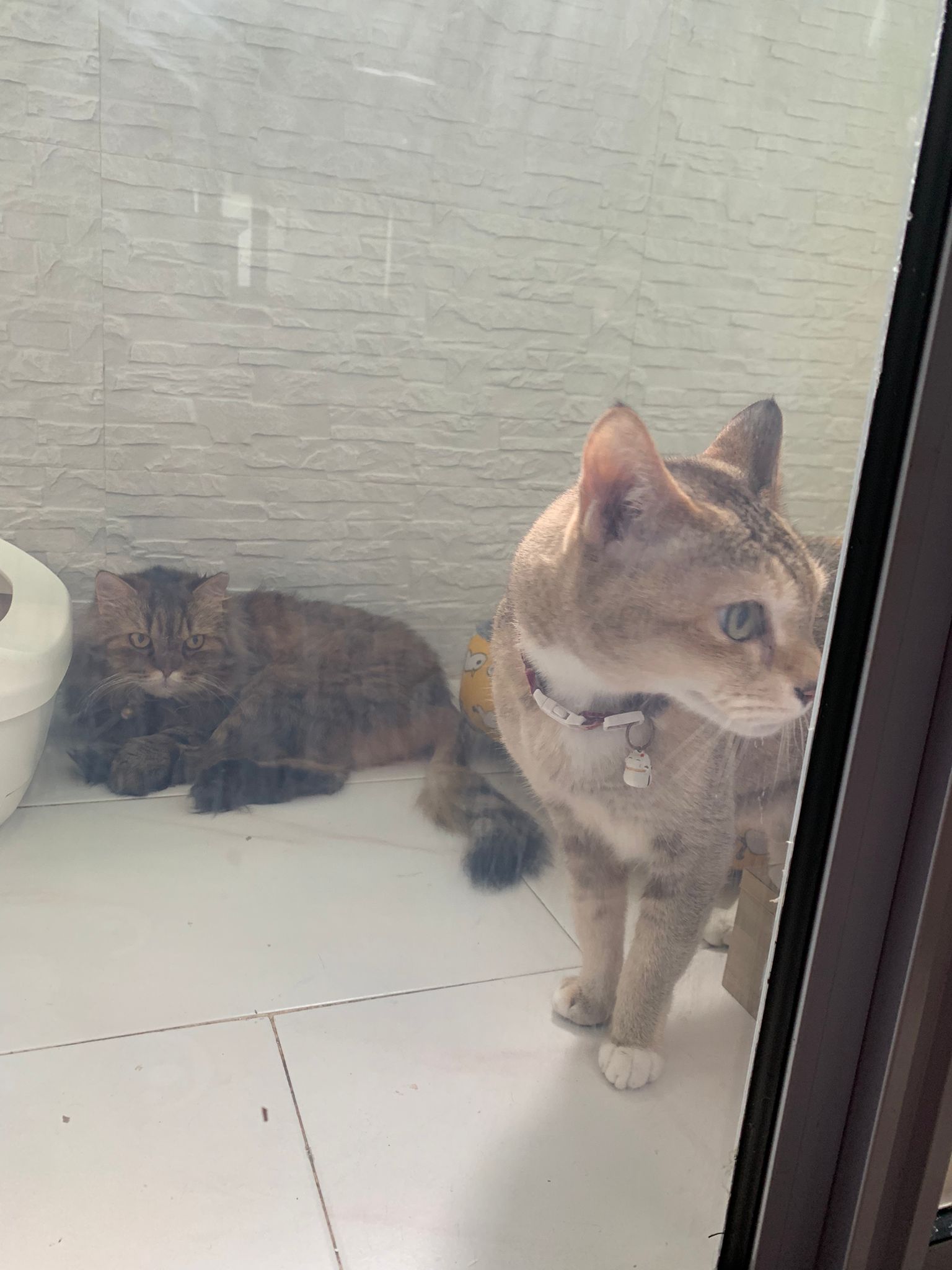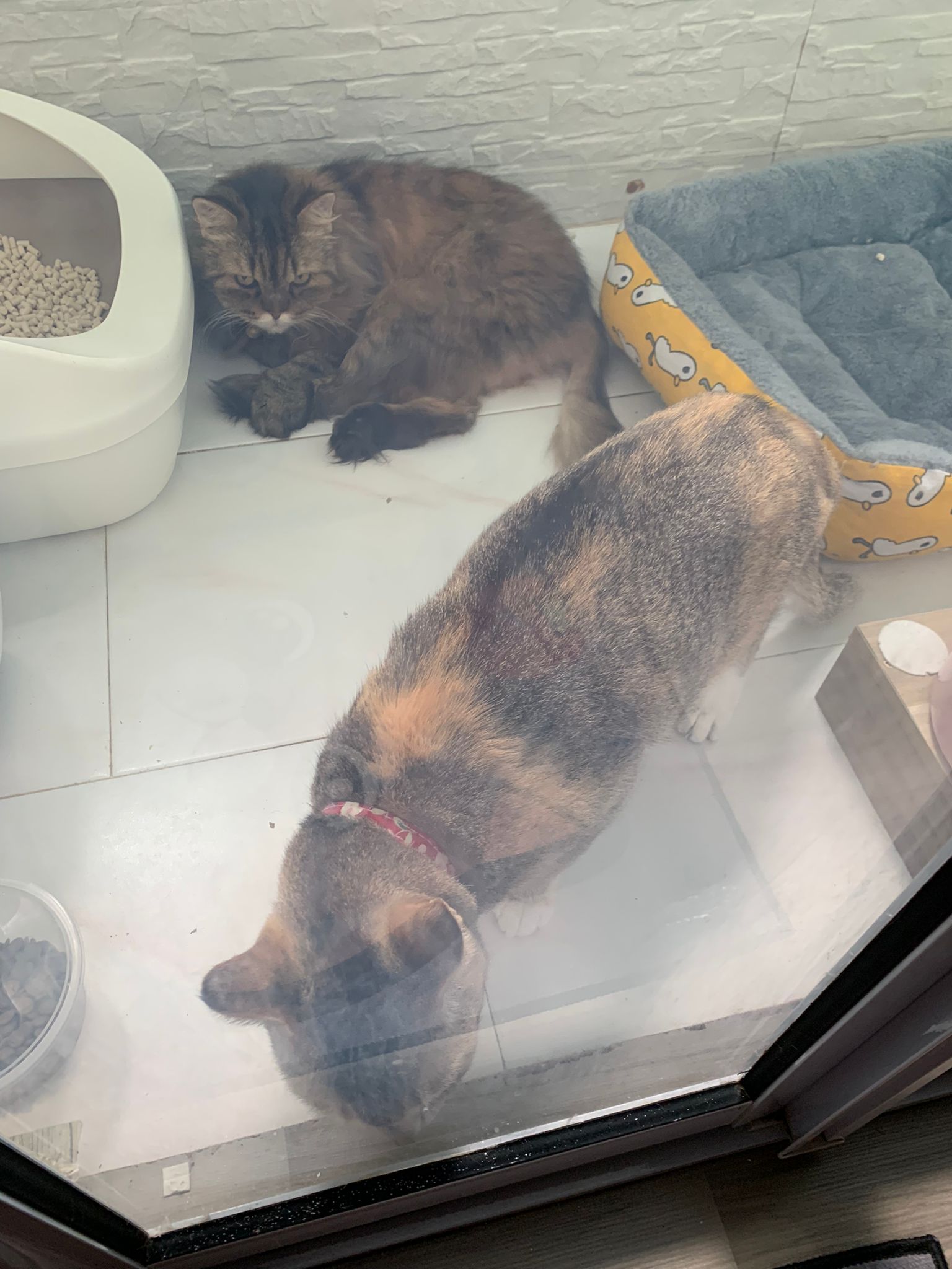 5pm+: story I heard: Tammy sitting at the door looking v curious, Bella standing right behind her. Tammy excited until her tail swipe and swipe and slap and slap Bella face and Bella growl while just standing right there let Tammy slap her w her tail. And Bella end up licking Tammy tail non stop and Tammy piss off and walk off. Bella become sad cos no tail for her to lick and she lie down to rest.