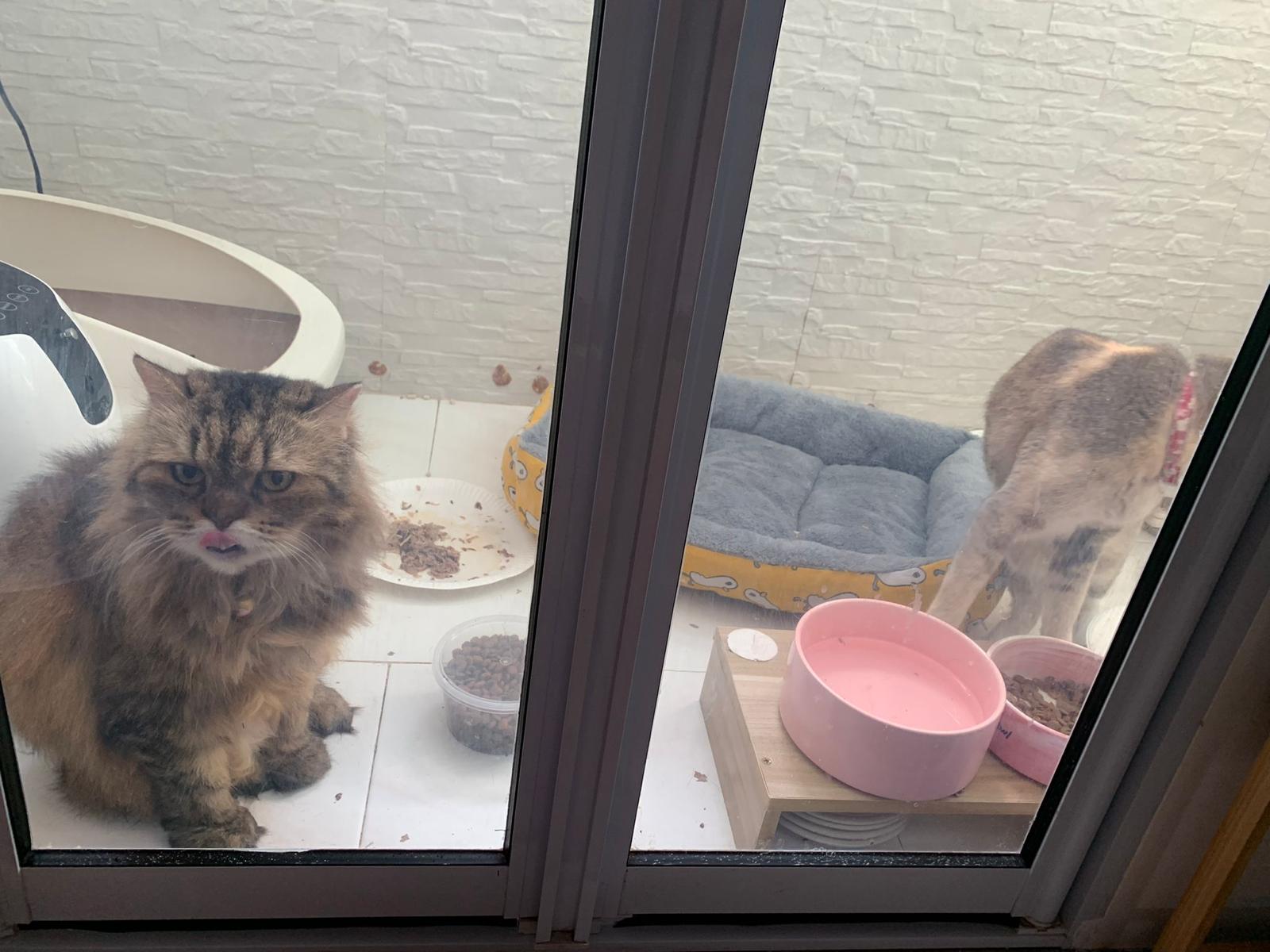 8pm+: at the same spot, Bella hiss and backwards towards the condo, her tail irritate Tammy and Tammy whack her tail, she hiss at Bella. got pple eat kibble, so I need to top up. Water also.