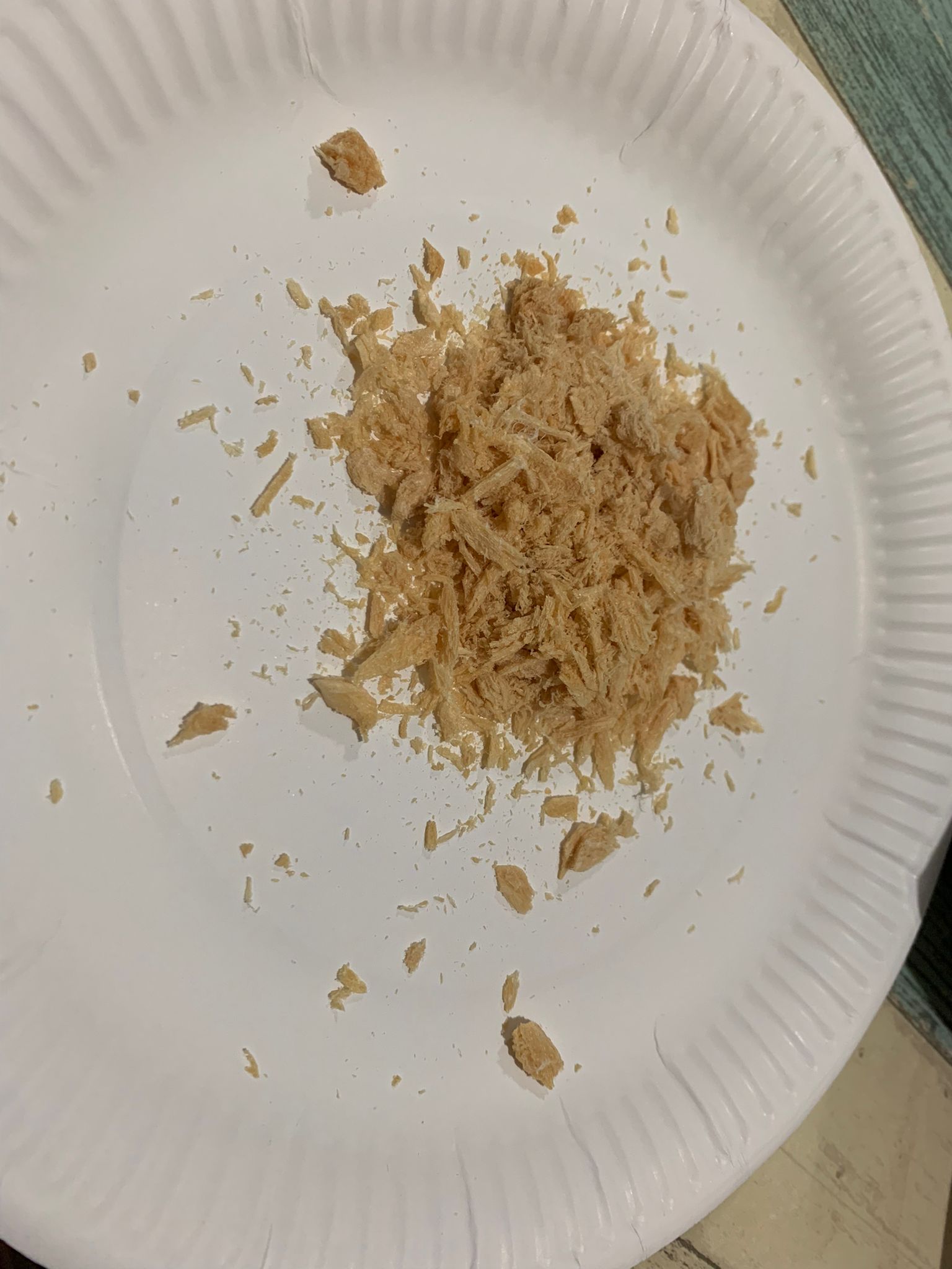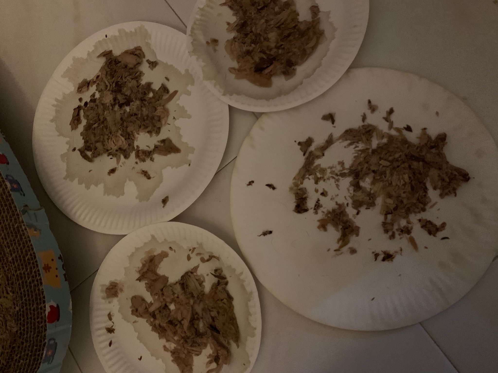 Serve her tuna w chicken, didn’t eat. Scare. Mummy says she scare of noise, just now got birds chirping only.
