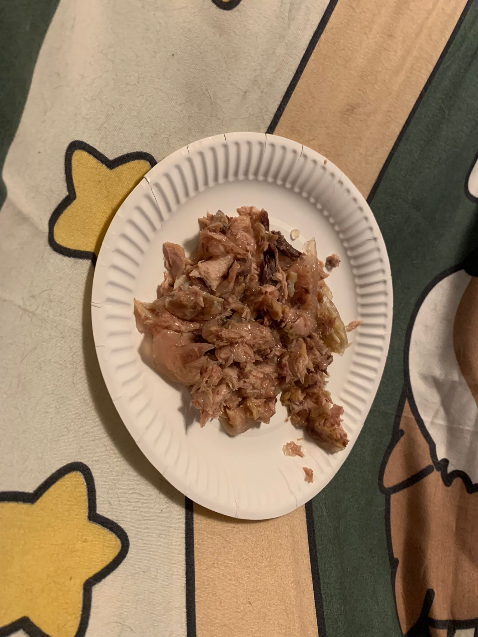 5.40pm: serve snack : tuna w chicken w light pink Japanese creamy chicken can food – she like!