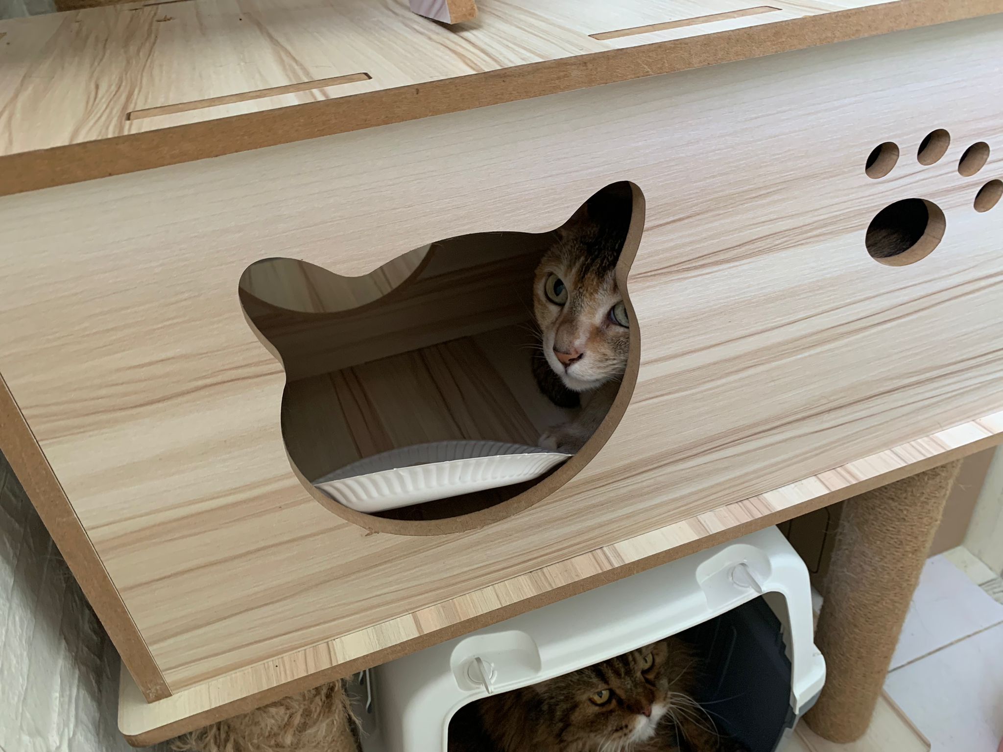 5.47pm: she is in the lower deck cat condo. No one pee yet.