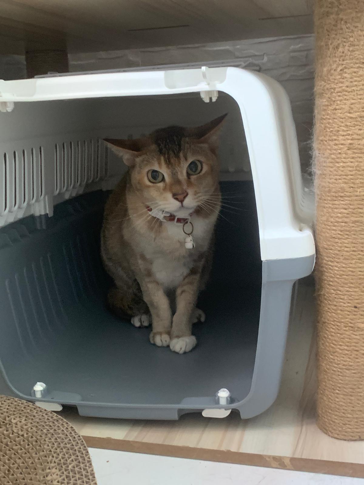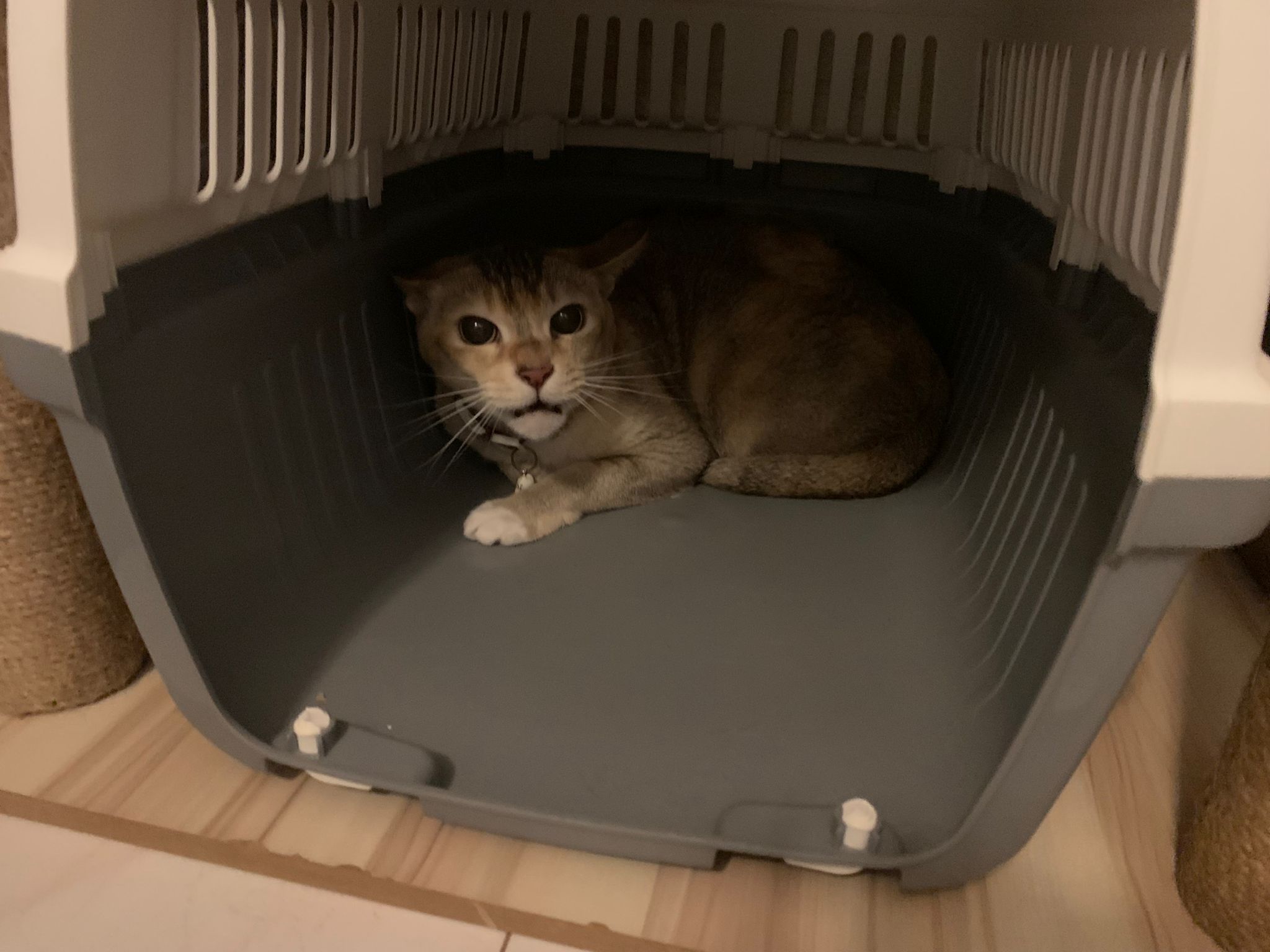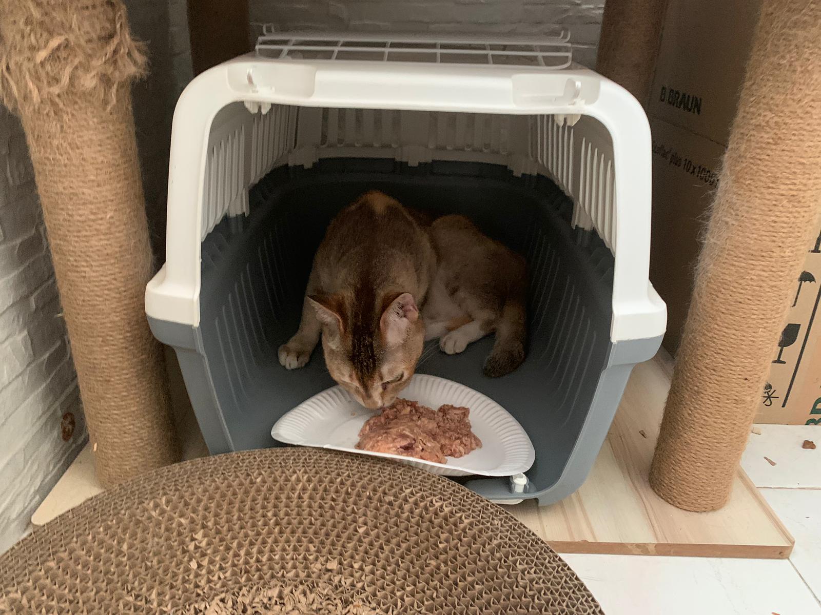 8.45pm: Still no pee in room. She got move about. Got go sb. Got go condo box. Got sit in carrier box see me open new food for her and she want to attack me while Bella still making lots of noises. Sigh serve fresh tuna w salmon.