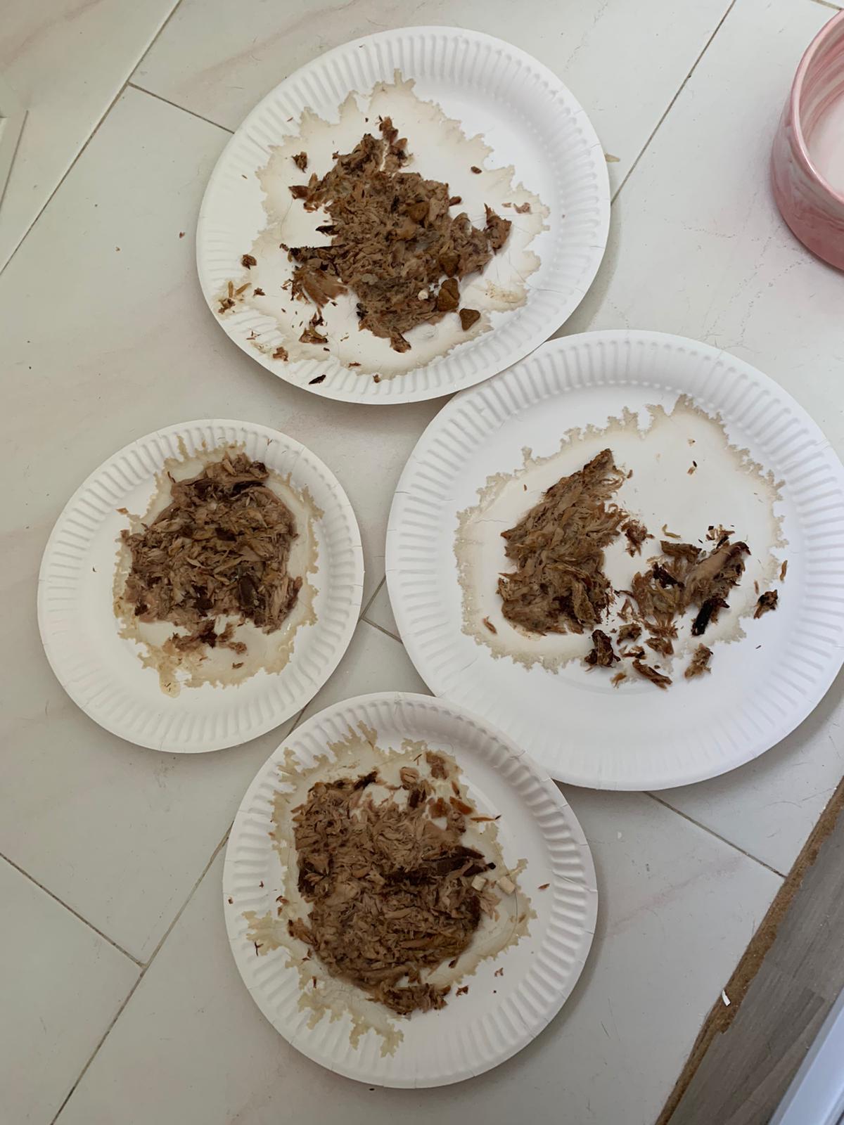 4.58pm: wanna give them snack cos their plate relatively empty. Both sleep till v soundly. Bella on floor all fours open. Tammy in sb. So nice. I waited but they got no intention of waking up, no choice but to wake them up and serve kakato chicken w pumpkin, both of them got lick a little. N stop. Tammy go back to condo sleep