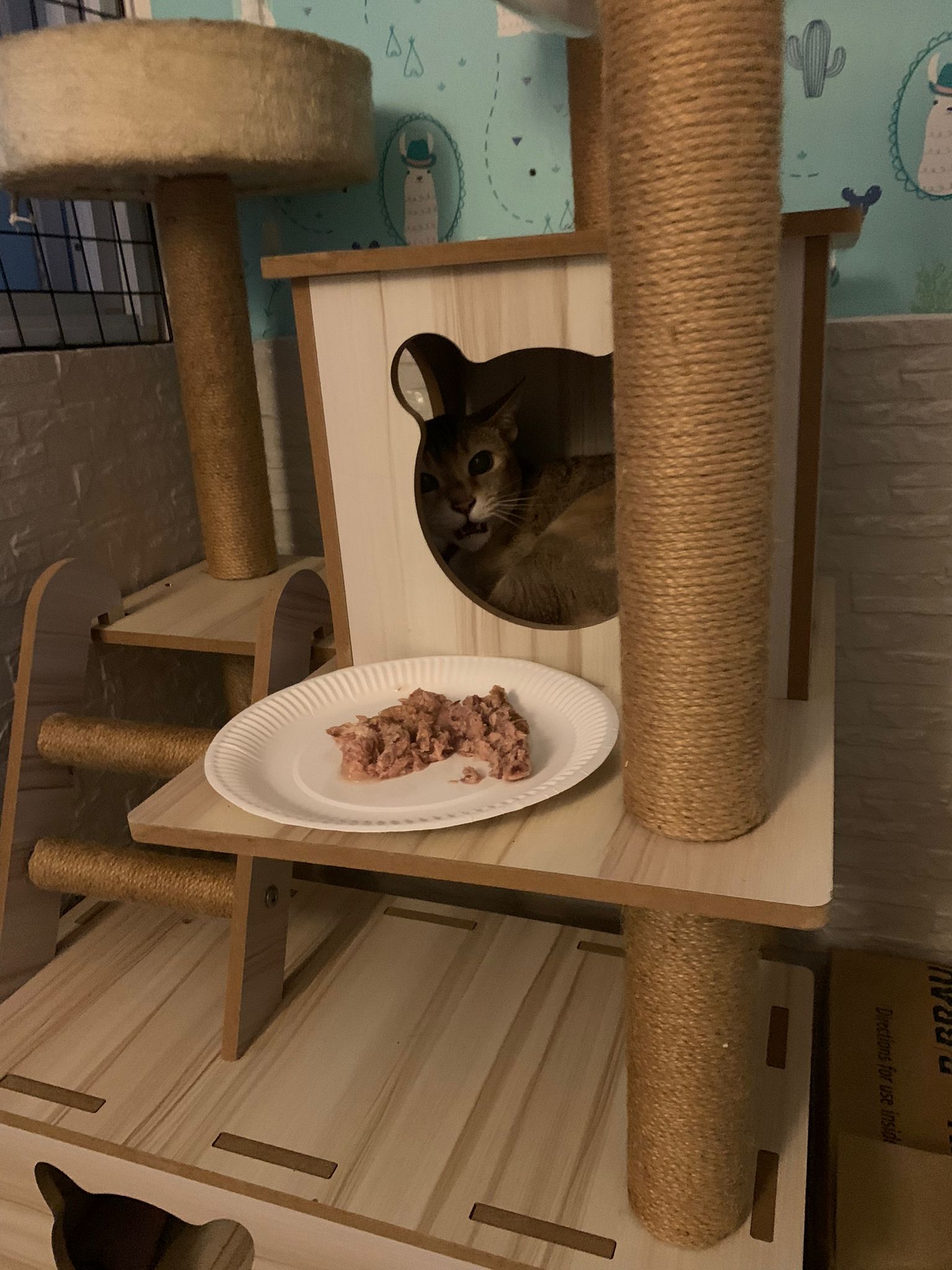 9am: serve tuna w chicken ham. And I clear the bins and floor and when I wann take water bowl she scream and wanna charge out, get scolding from me so no logic at all. Think she know she also siao siao no logic, look a little guilty.