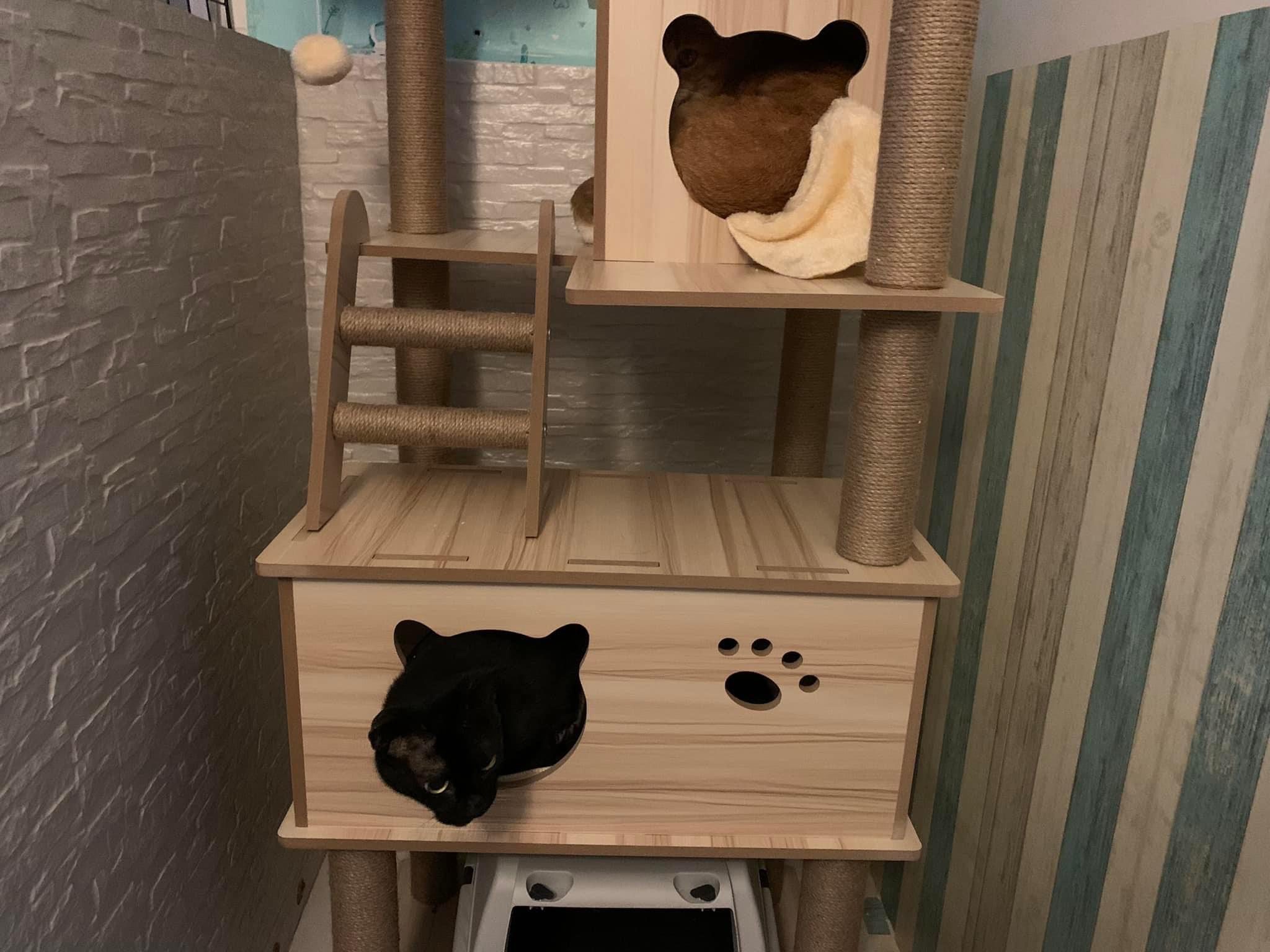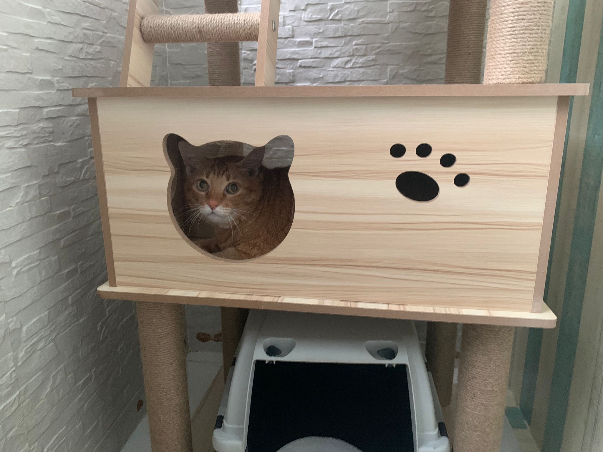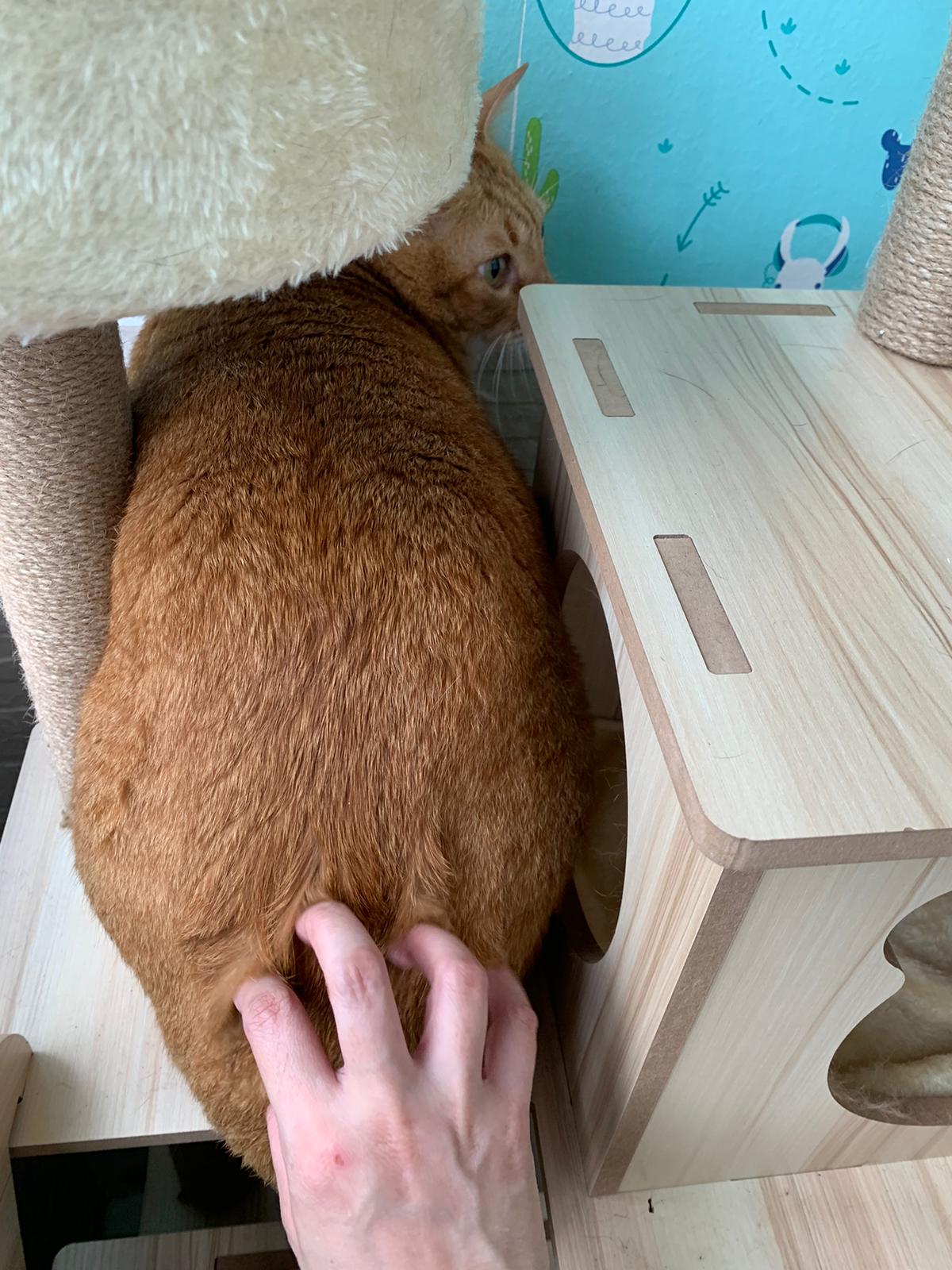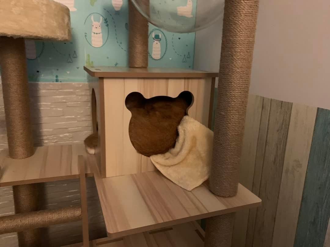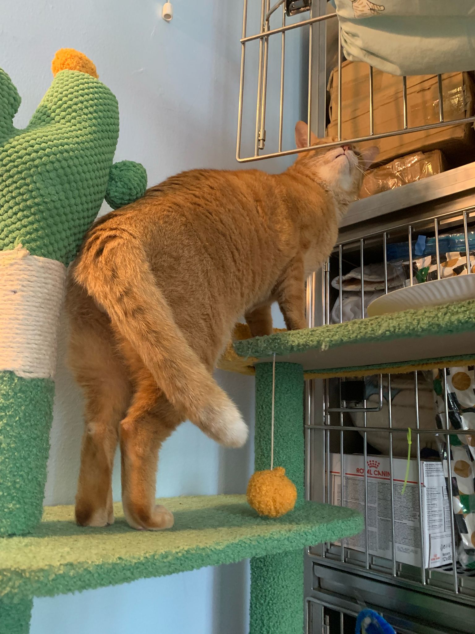 He is out and up on cat tree. Sayang her. Told him be good boy but I can’t give them more snack today the poo so bad