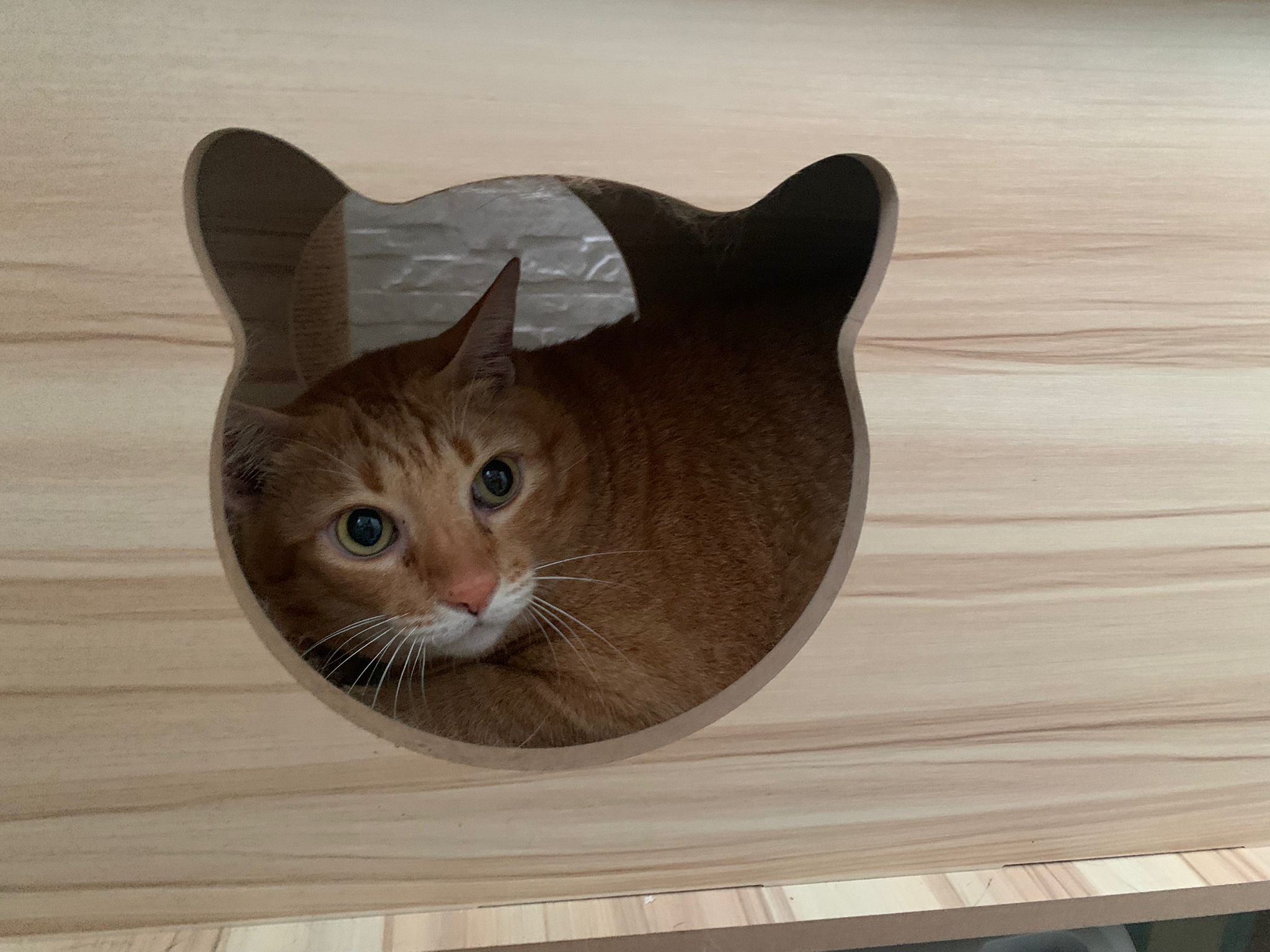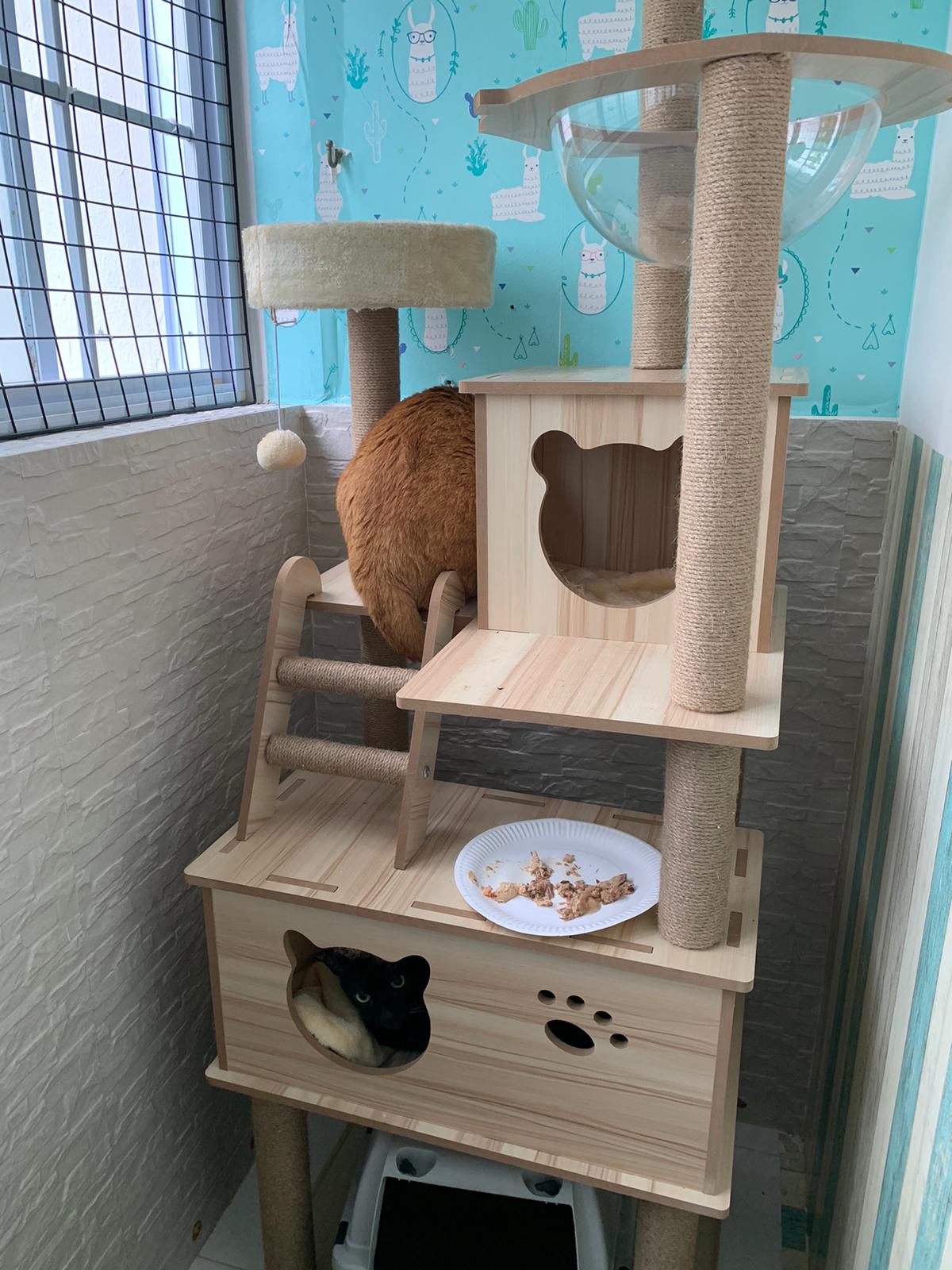 He sit in the cat condo hole and I can sayang his face his hand his paw his neck his head. Ha. But don’t come out leh. need to take their weight Tmr le.