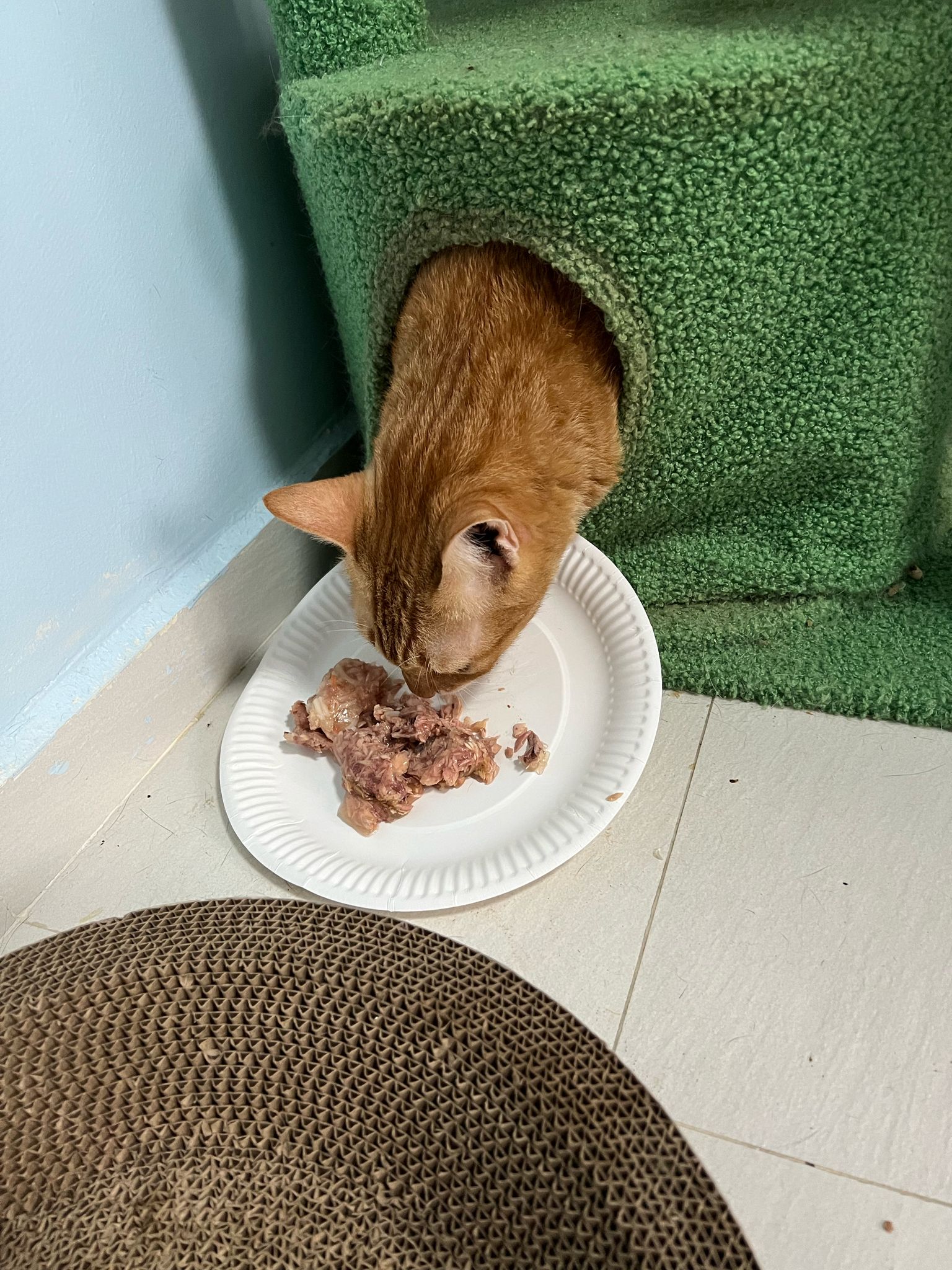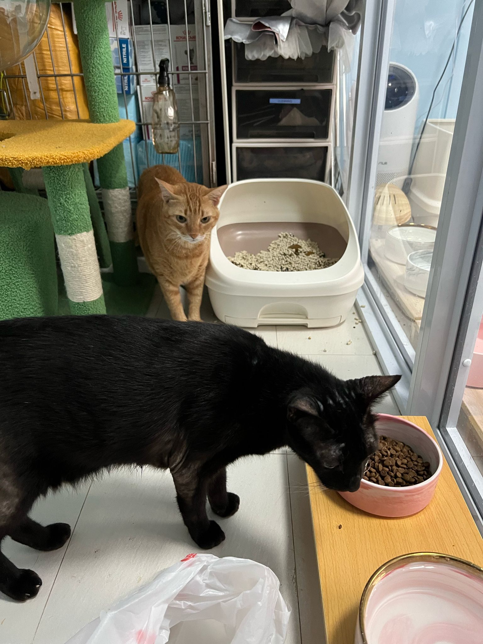7am+: food motivated type. Every food cleared in room. Serve food and tomoya eat some kibble first then he and kuro eat wet food tgt.