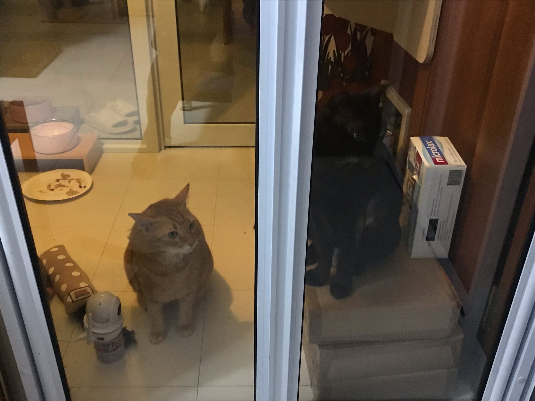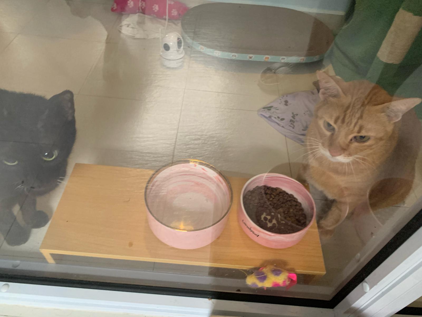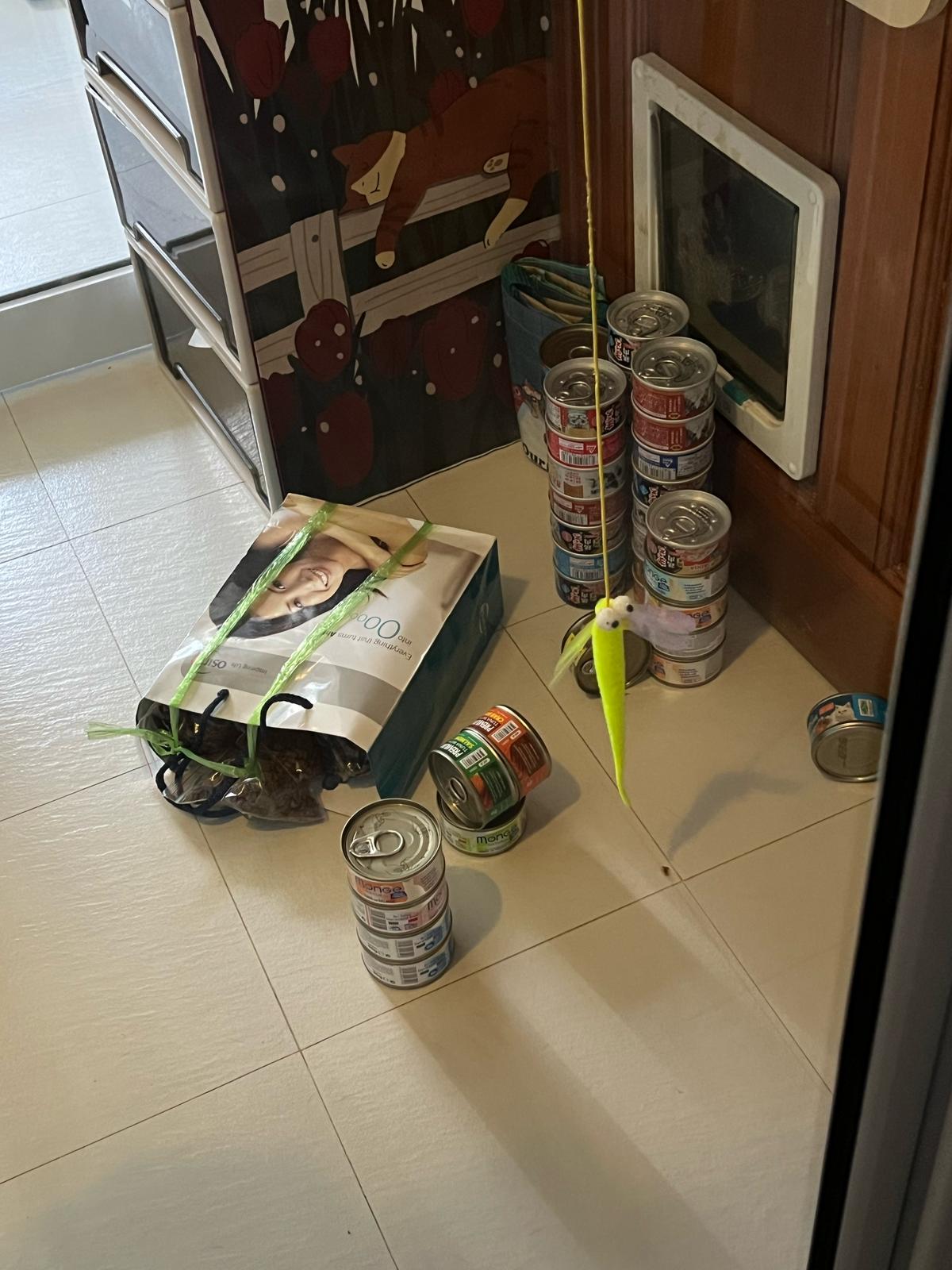 9am: hungry ah both, topple all their can food and I feel the floor at the door is sticky and wet.