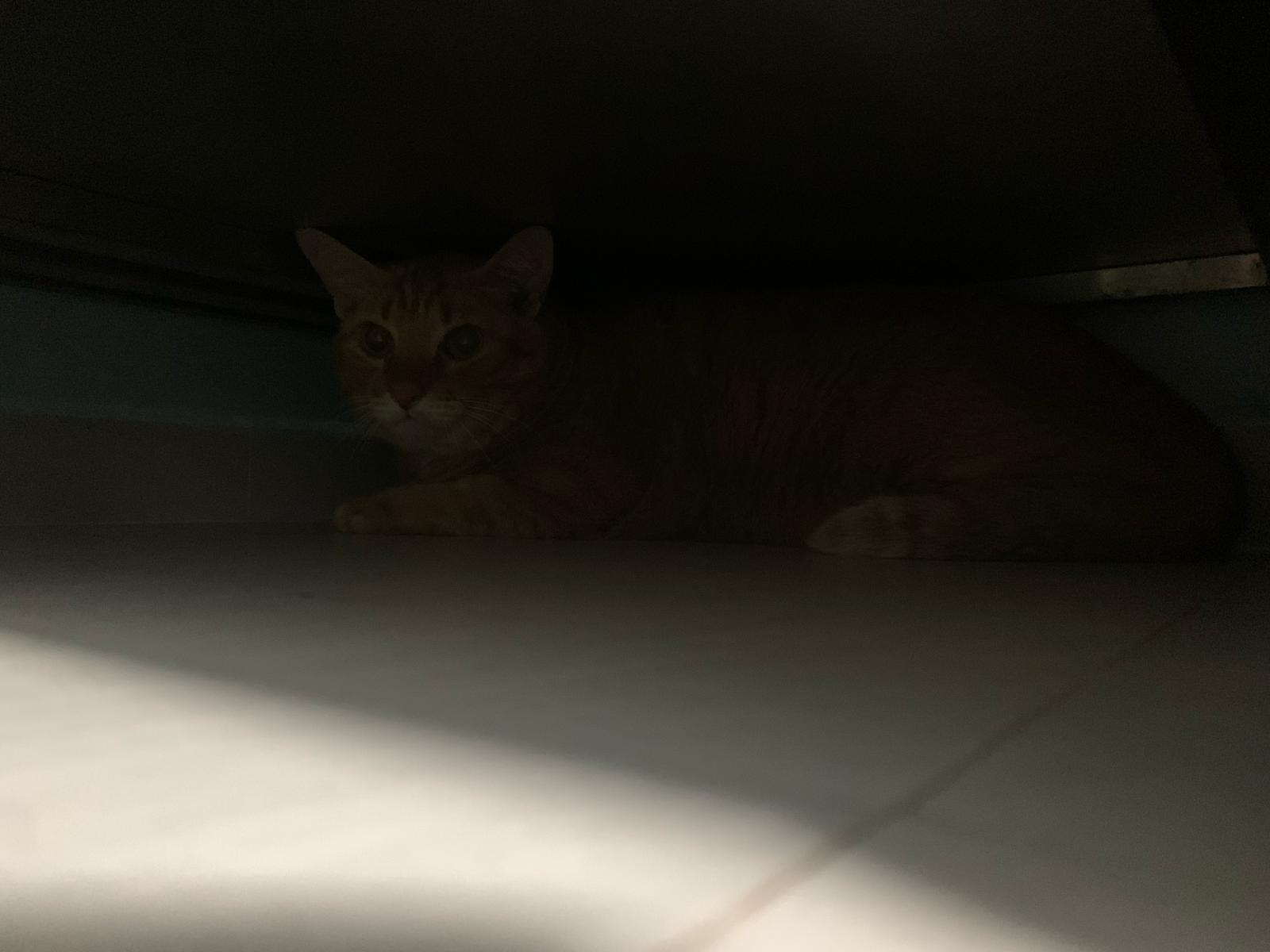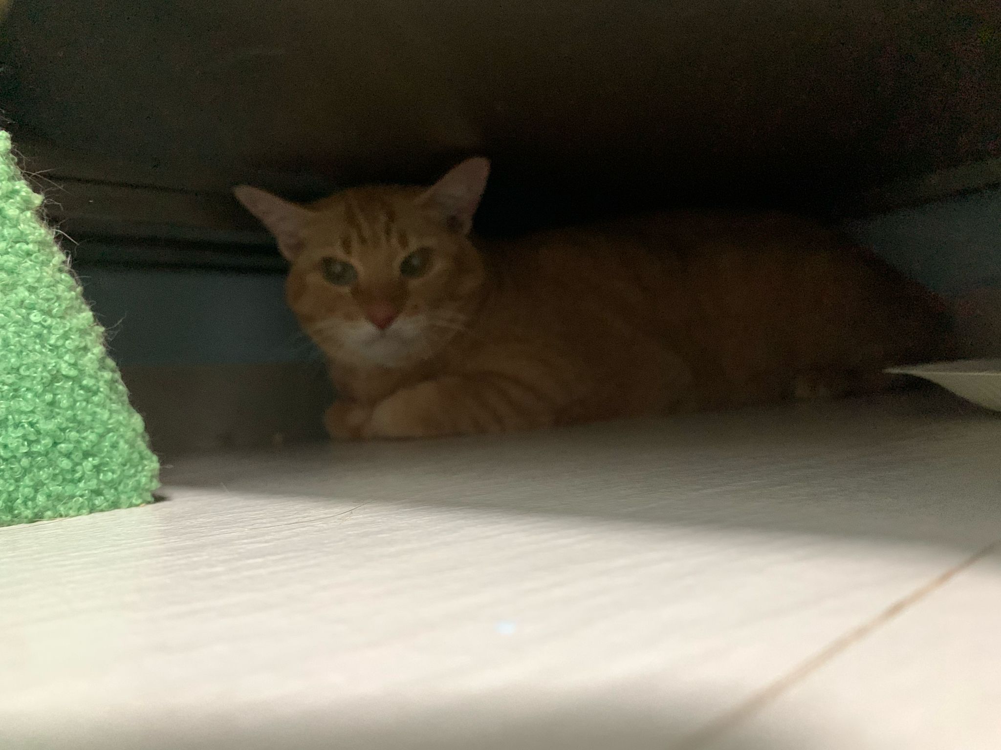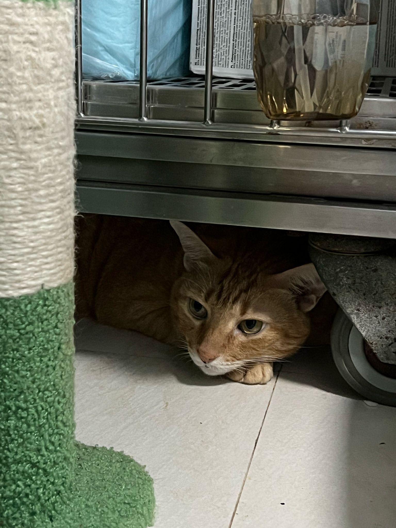 11.00am: enter 猫房. First to weigh. 7.33kg. Lose 990g from feb 2023. go straight to under cage, can’t even take any pic of him.