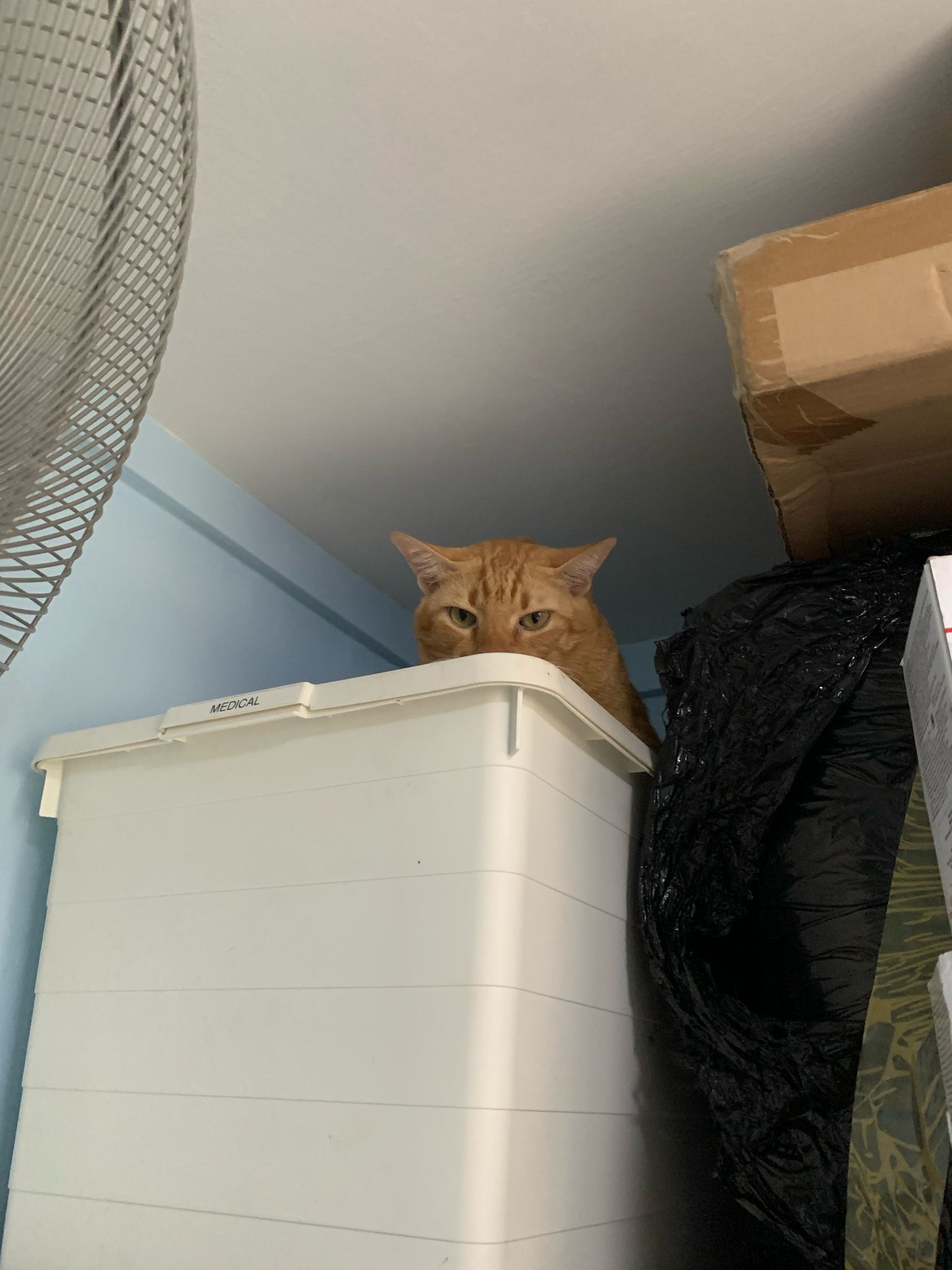 9Am: ha – he had successfully jump into the bigger box – saw he try yesterday can’t, that’s why go into smaller box at the top easier – Keke can send mummy this reply alr