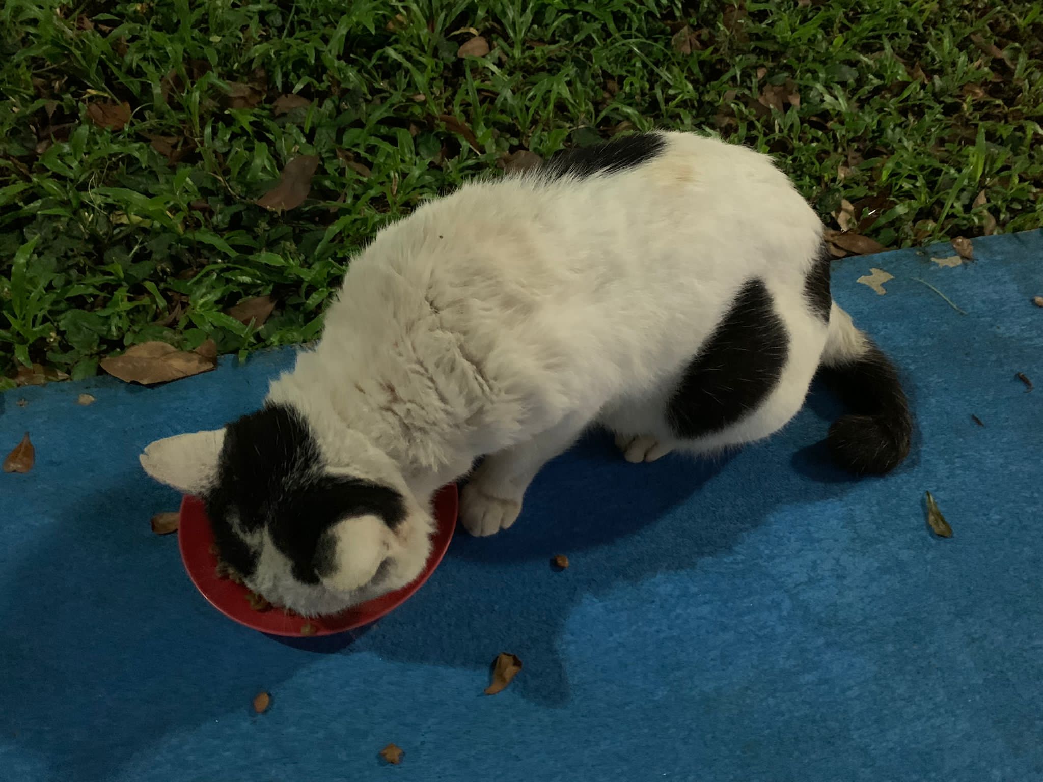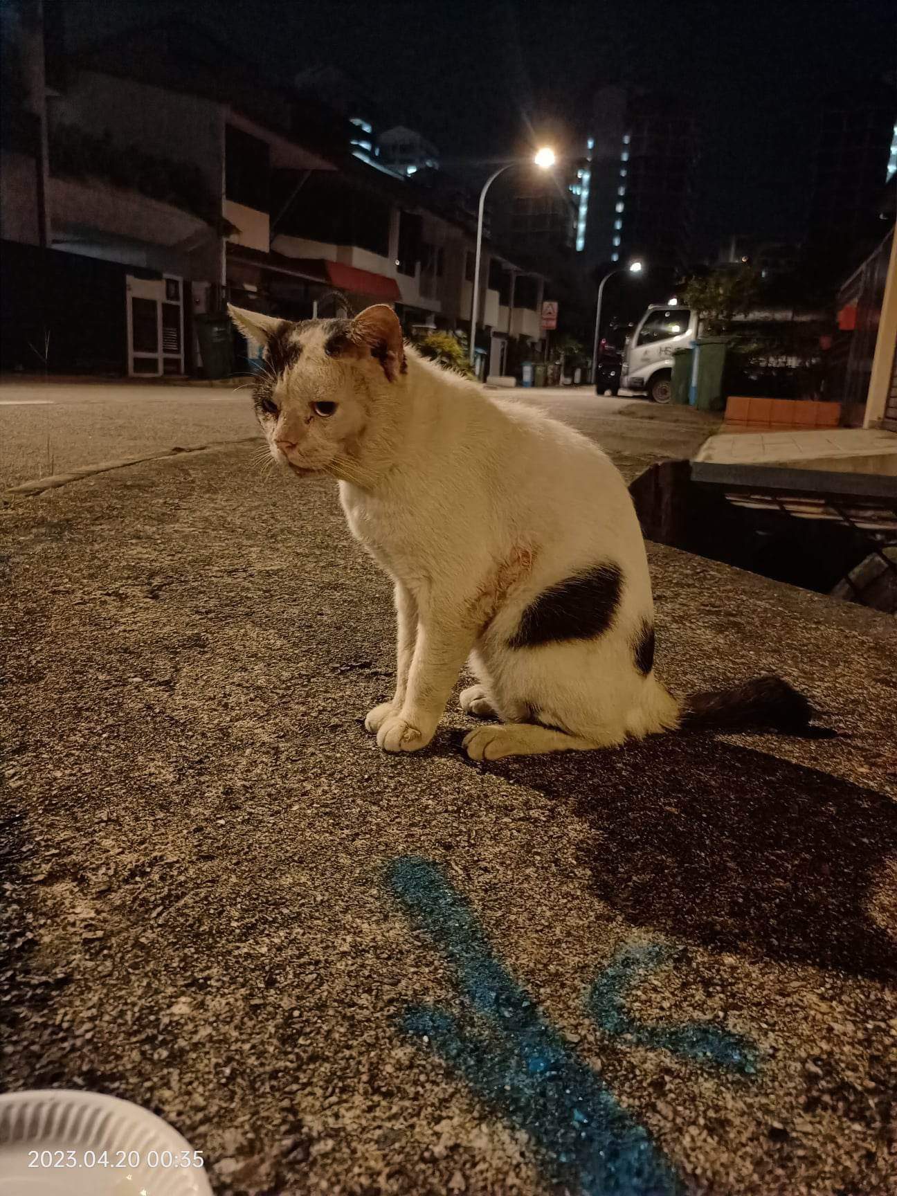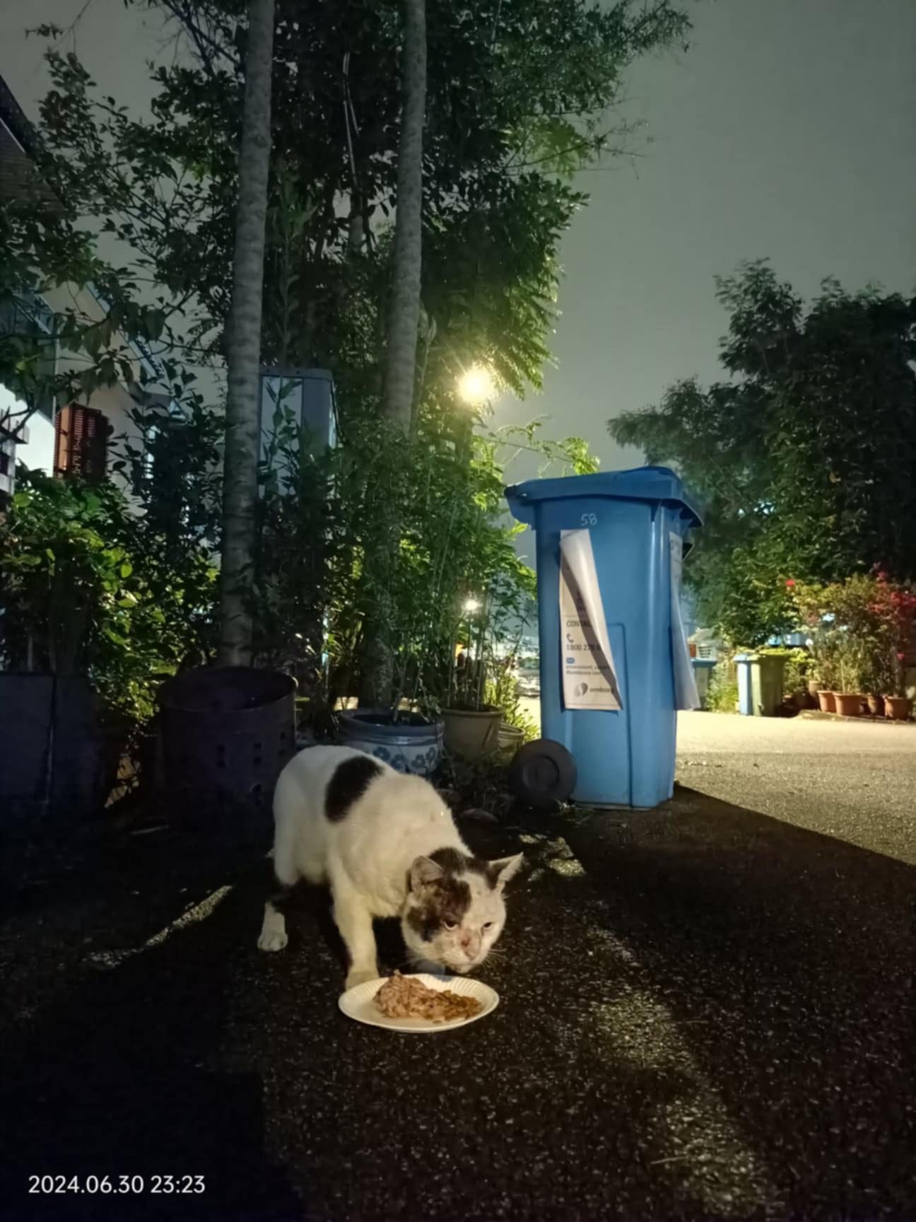 1145pm: finished supper round w 猫房 cats Come out omg 小白 came too- give him the bistro. Given cute cute fc and “meow meow” fc also. I believe cute cute n meow meow r girls – when they r 80% done, 小白 run towards them to chase them away to finish up their fc (he don’t like bistro ah).
