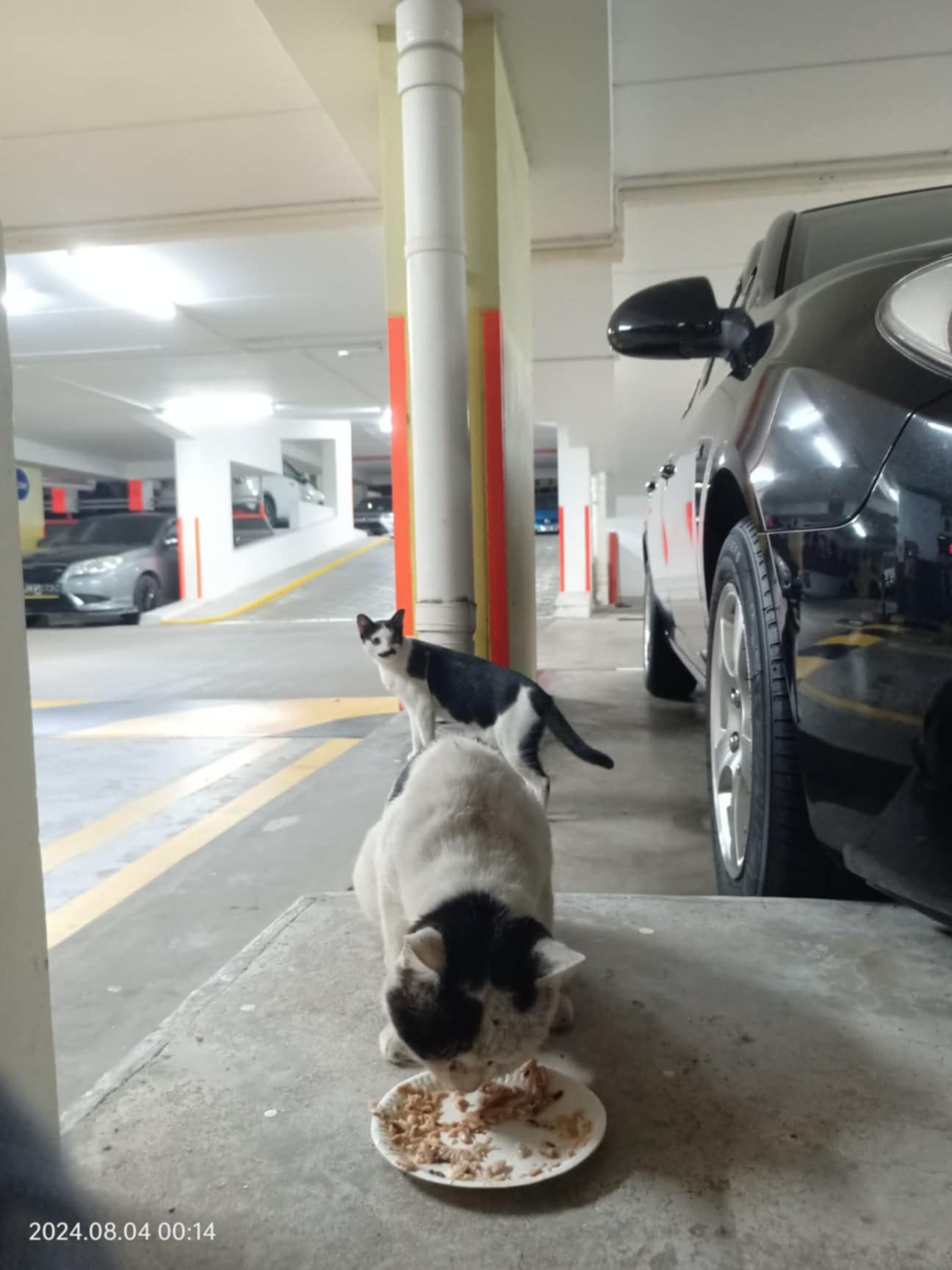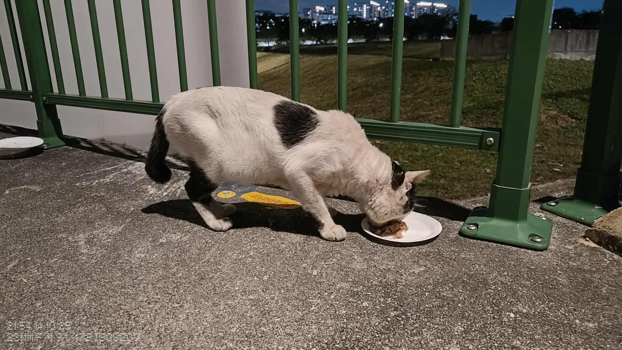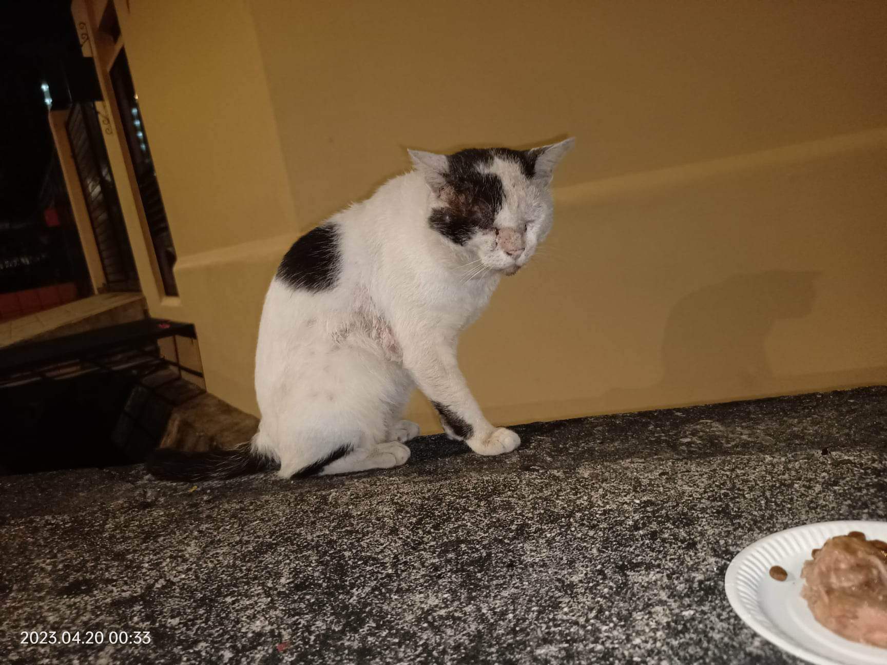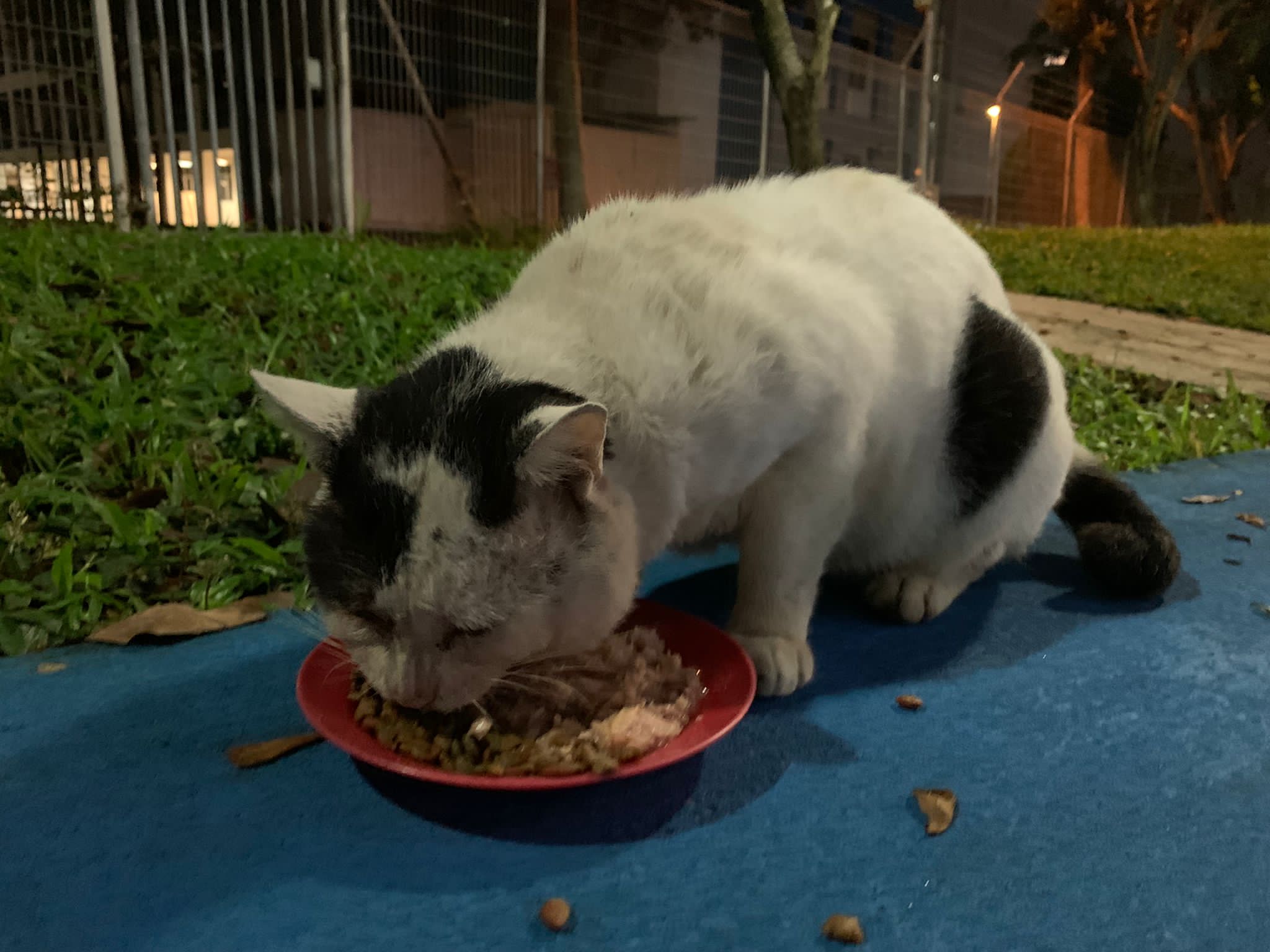 1145pm: finished supper round w 猫房 cats Come out omg 小白 came too- give him the bistro. Given cute cute fc and “meow meow” fc also. I believe cute cute n meow meow r girls – when they r 80% done, 小白 run towards them to chase them away to finish up their fc (he don’t like bistro ah).