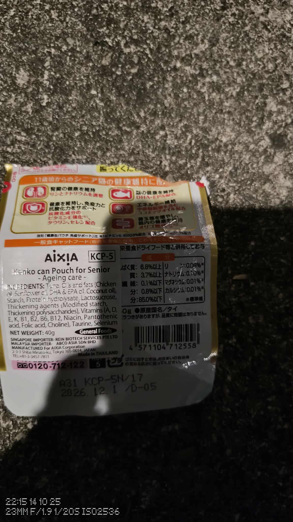 10pm+: lf:” Two cans, one aixia pouch, some kibbles. He LOVES aixia pouch. But cannot give him liao . Wait lao sai
