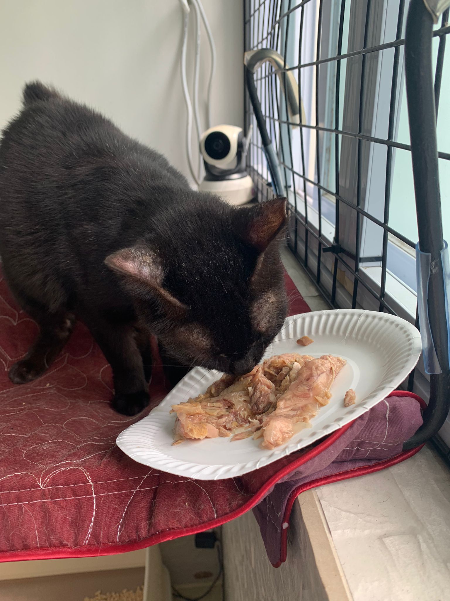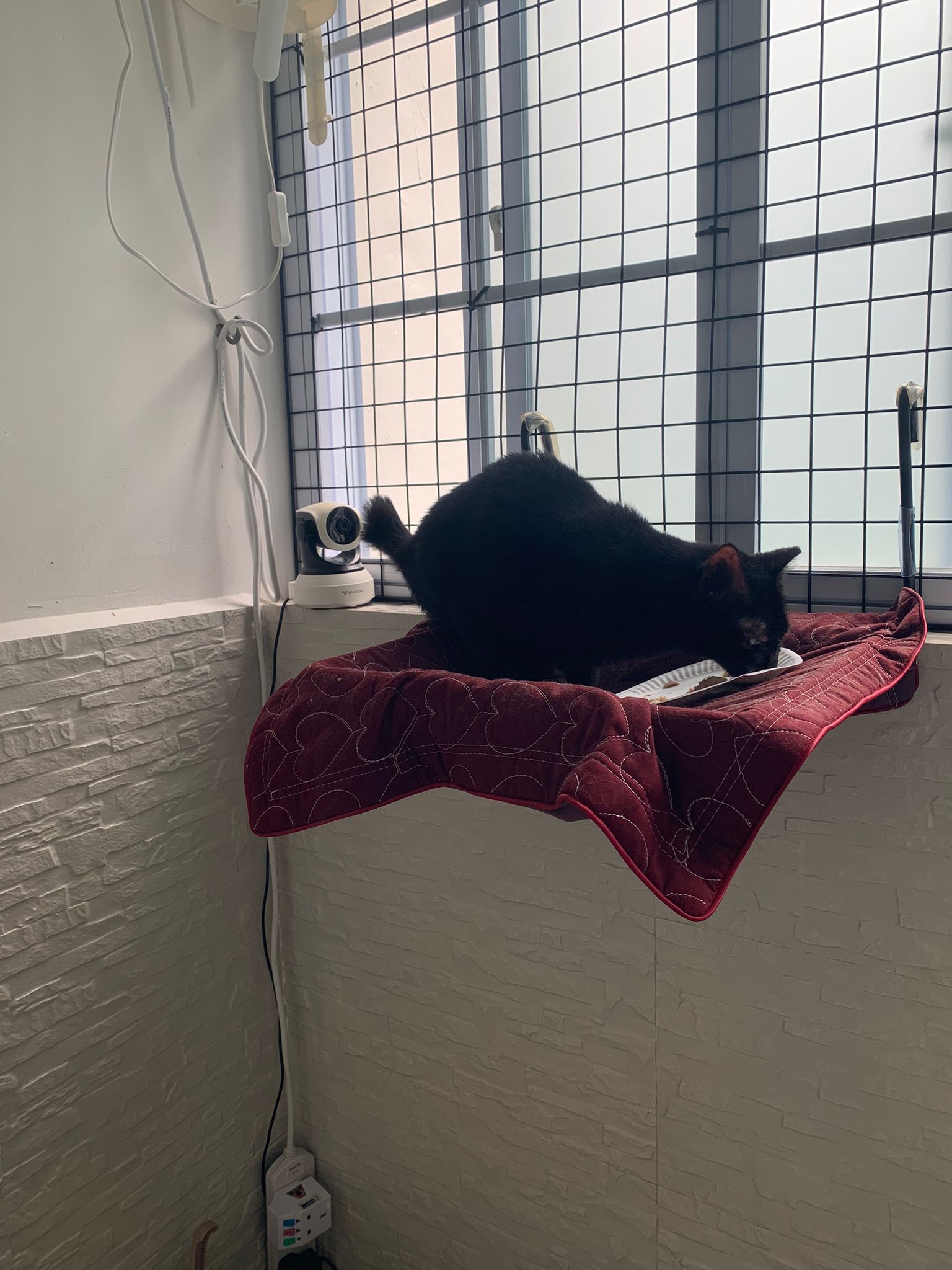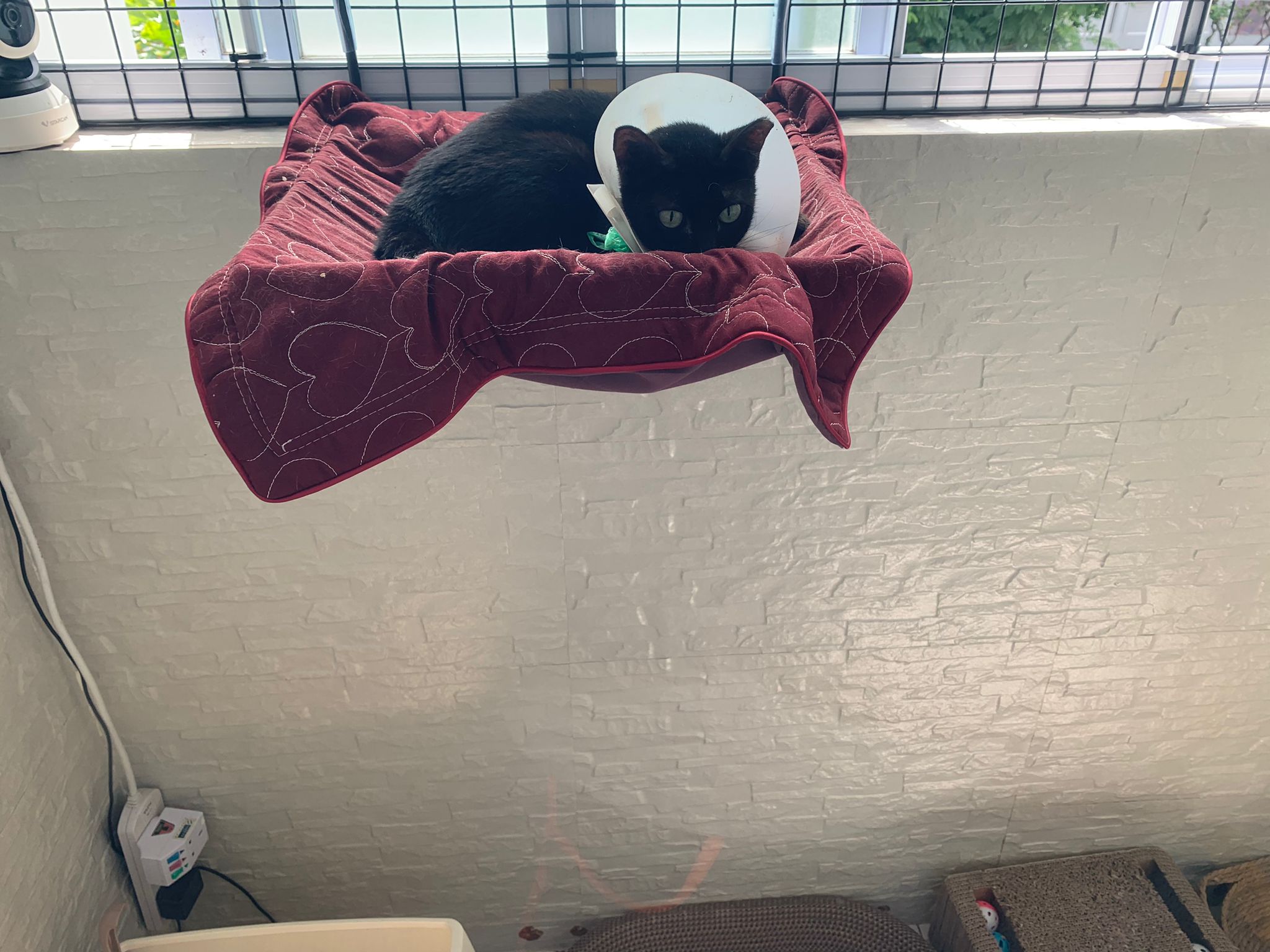 Day: first to sleep on the hanging bed. All food almost clear so they quite ok la. I think all did eat. She is the one w the growling sound. Want eat but irritated I told her i trust her not to irritate her own skin further and take off that weird super xs collar for her and told her to eat. She clear 1 plate in front of me and I serve her a second plate. Then she continue to sleep on bed zzzz – can sayang