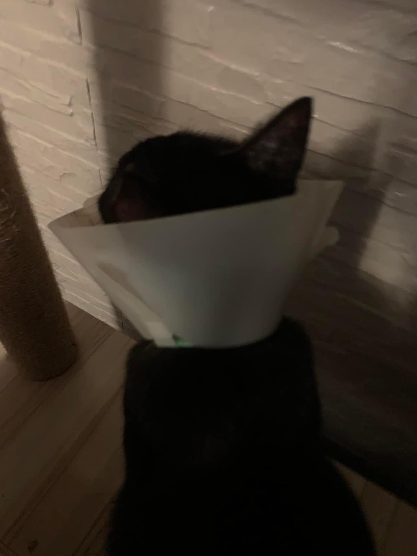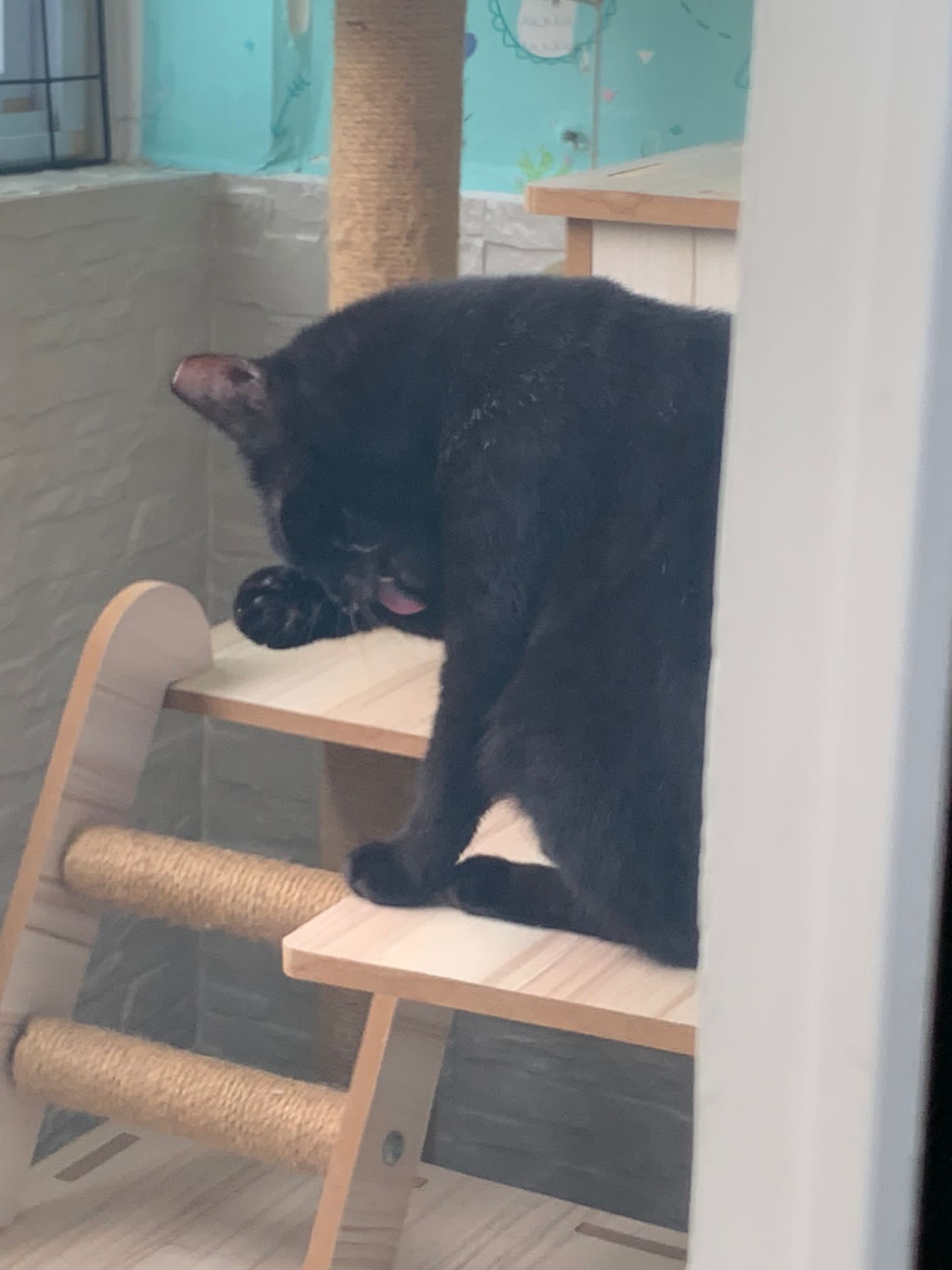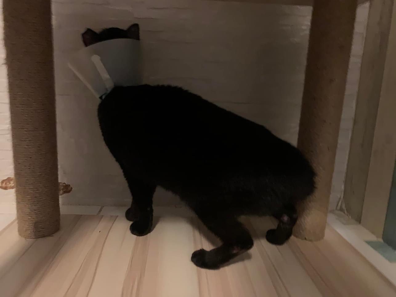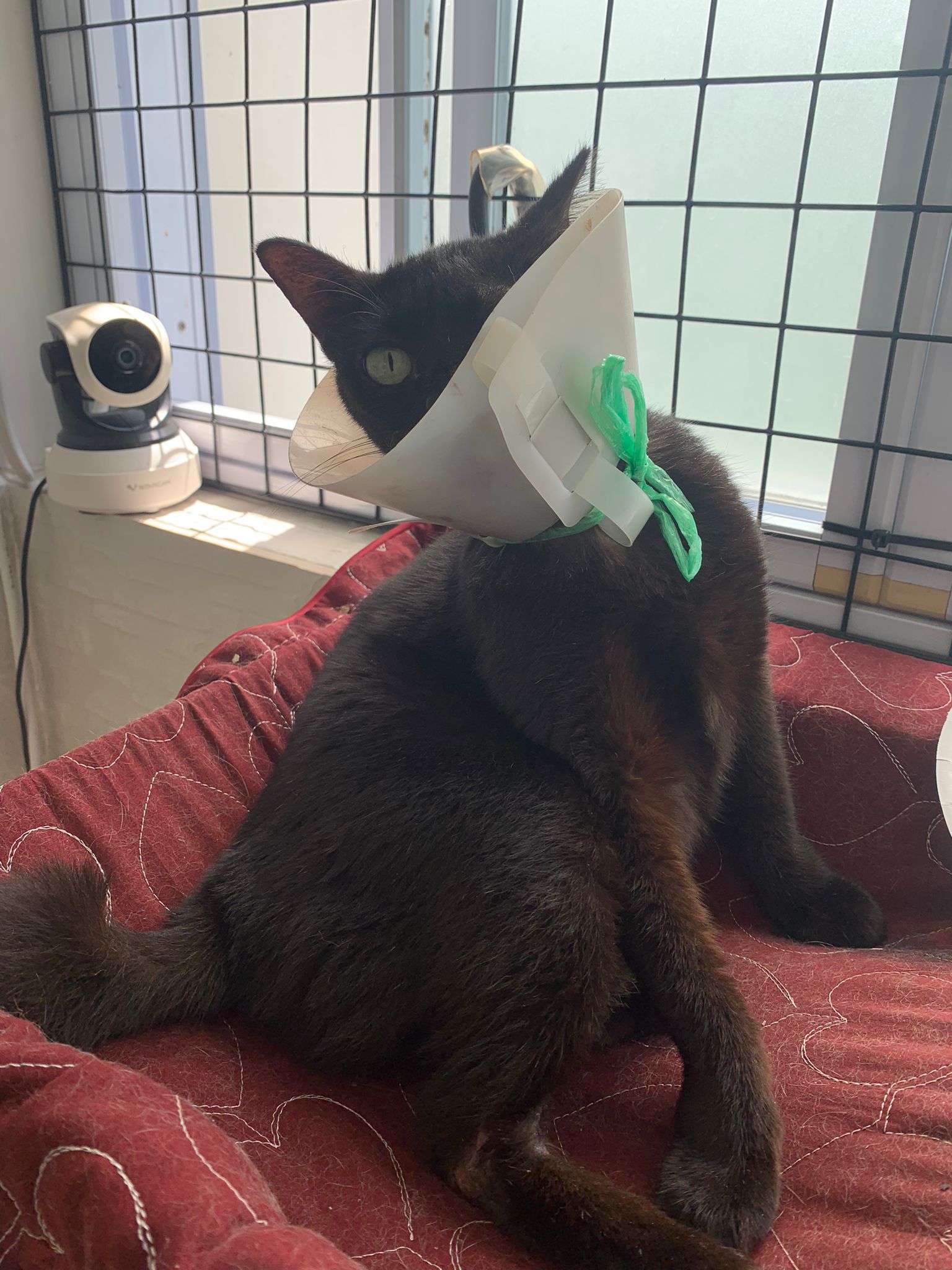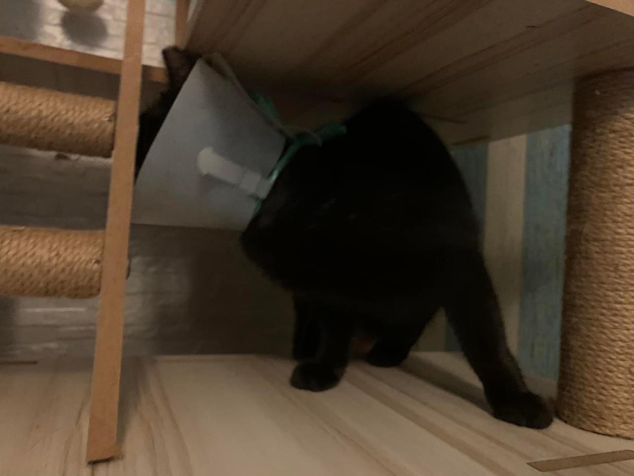 I weigh her, 2.91kg. “my sister managed to bring two of my mom’s cats less active cats to the vet as we wanted to be sure the cats are ok. Both are negative for FIV/felv. Xiaohei needs to wear a soft cone as she has some skin allergies and always lick herself. One of them dunno blackie or xiaohei has a white lump on the lips. That is not a teeth. Its a wart. But doctor say no medical required as it’s not life threatening. This is for Xiao Hei, not sure Cat can help to shower her during her stay there?  She has to apply Baneocin on the affected area which is near her private area. Instructions given on the box but once the sore is gone don’t need to apply anymore even it says for 10days.” – the e collar she is wearing don’t make sense at all. Don’t think is of much usefulness but shouldn’t affect her food intake. I haven’t check the “wart” yet, wait till day time. She is ok. Less active. walk into the room, will jump up second deck.
