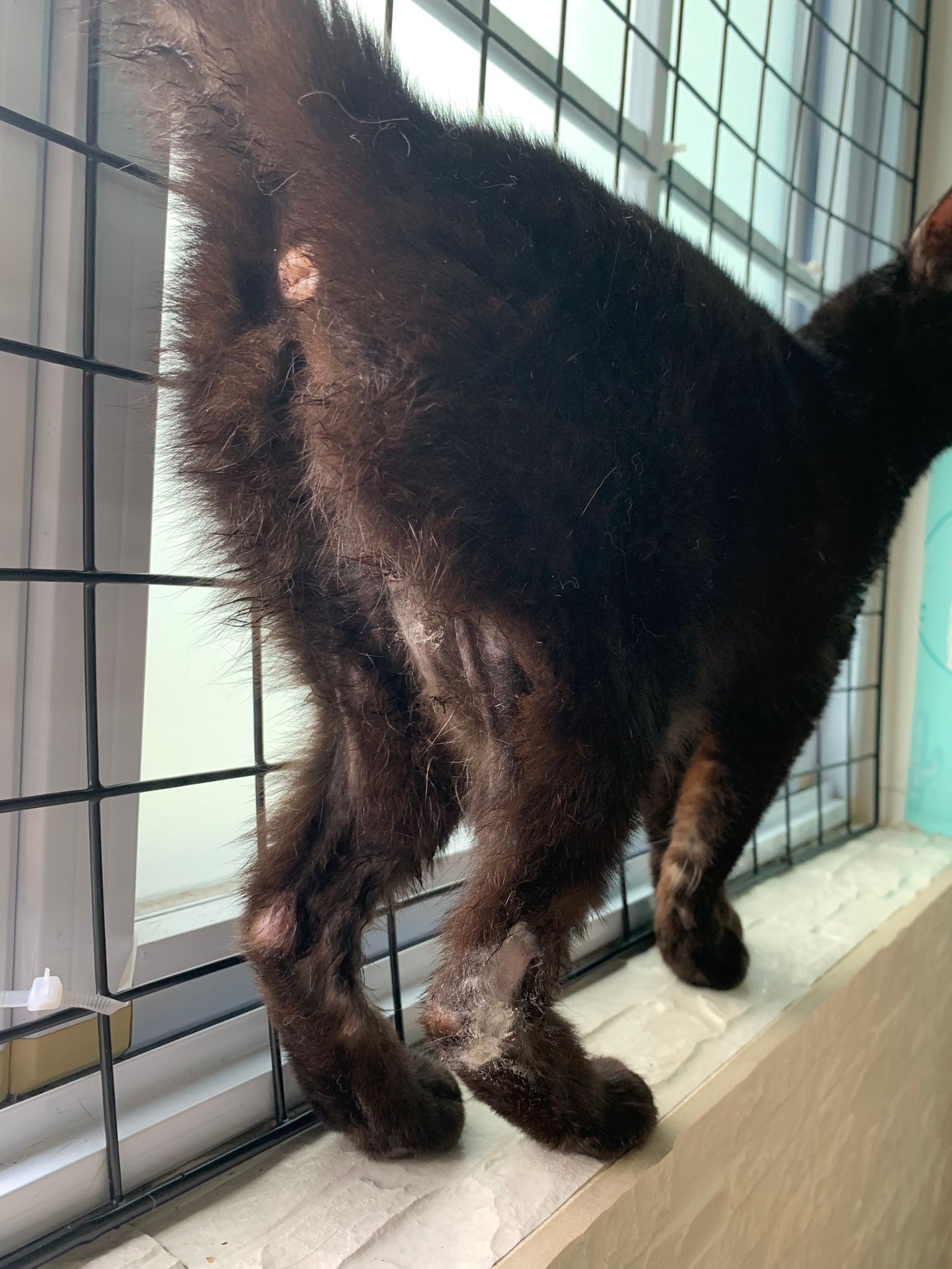 I handle xiao hei longer today cos I hug her to take more close up photos of her current issues. Initial “issue” area near privates really nothing, her issues r more of the hind leg and area above eye/ ears (close up photos). I don’t think banocin help much for these, today I use Argasol silver gel on her and told her this better for you, she ok w it. Brush her a little.